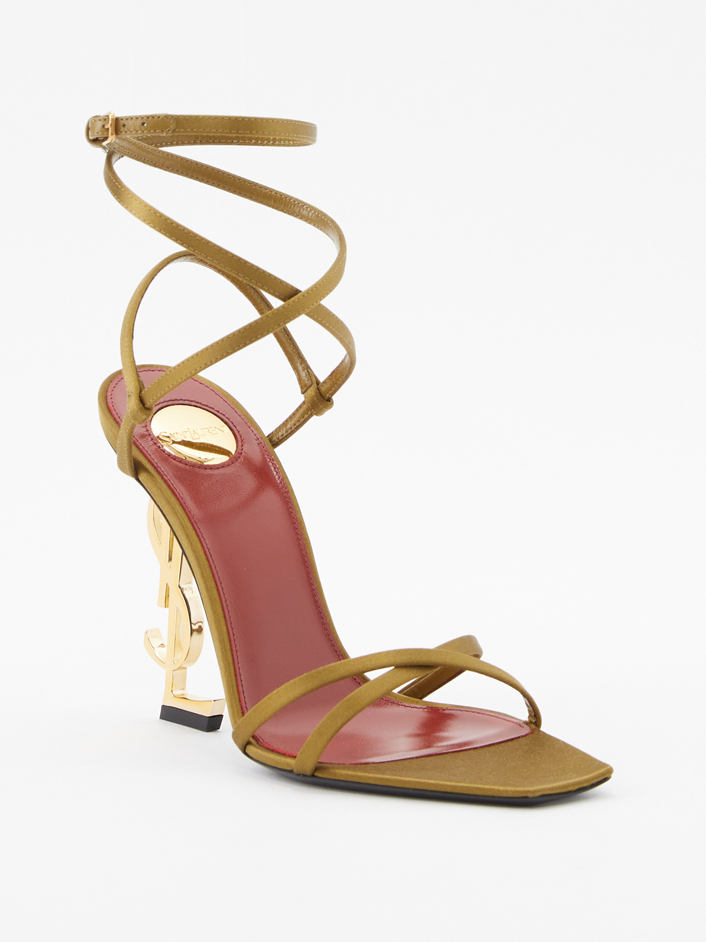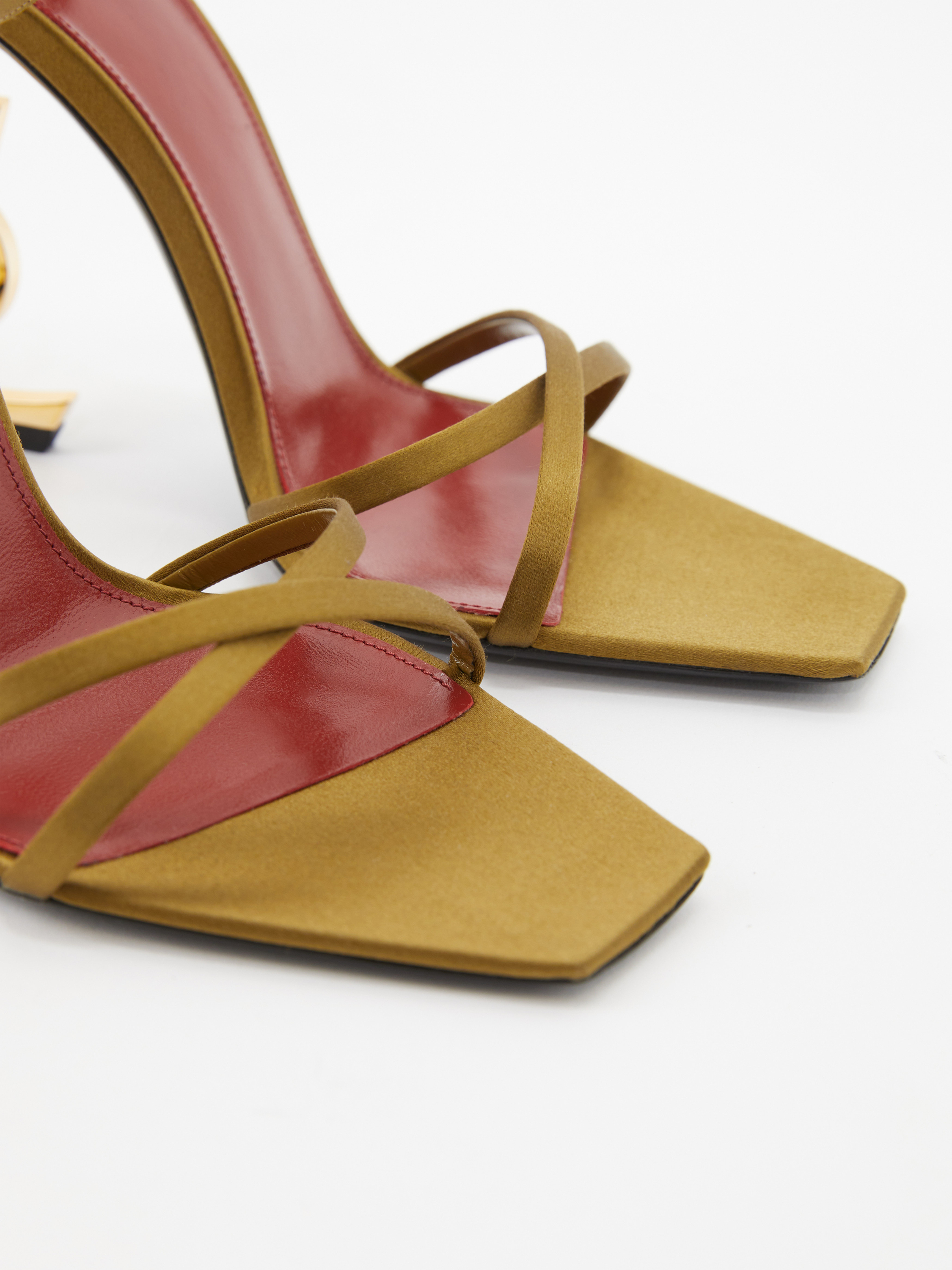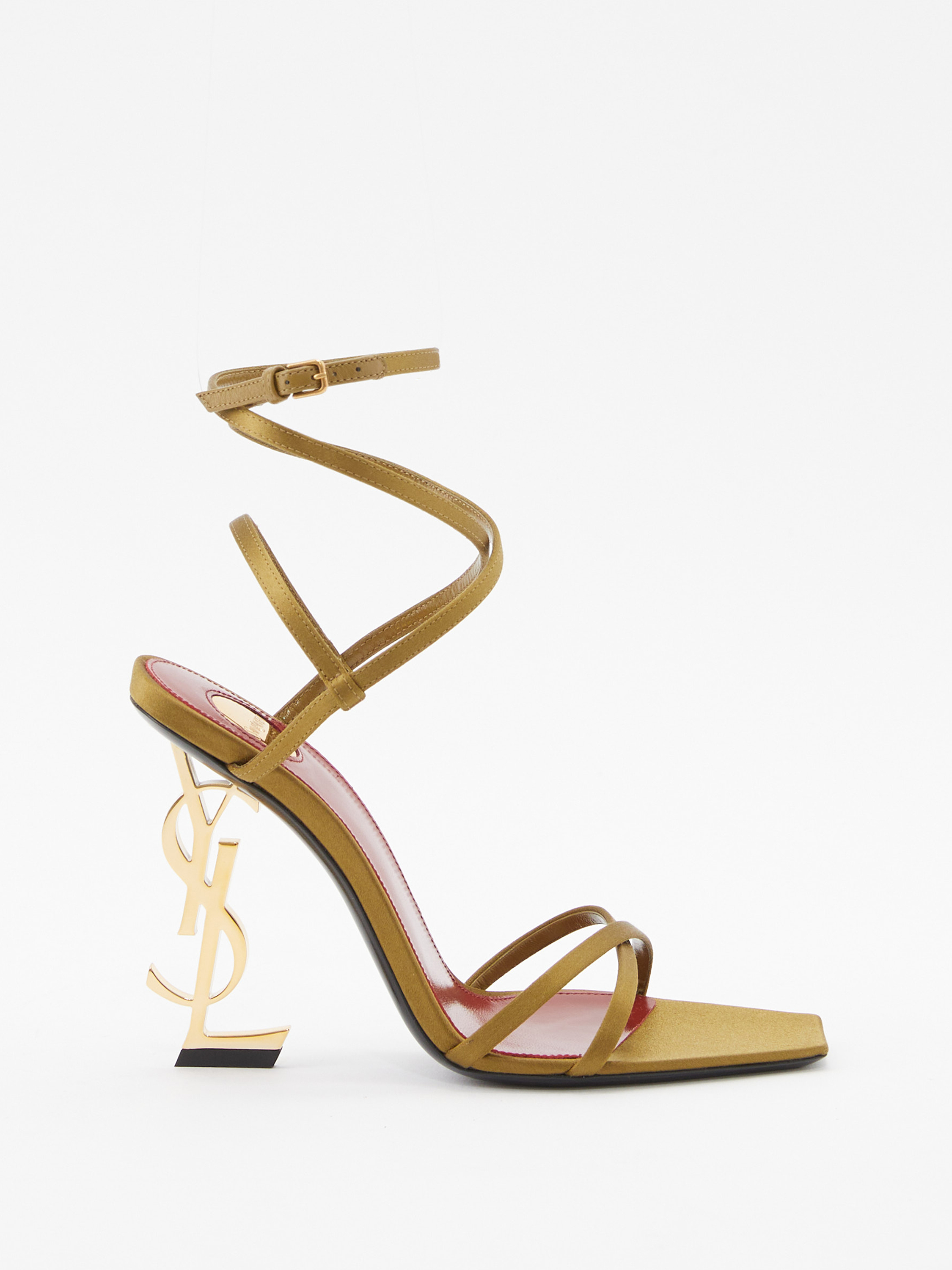 Die Sandalen 'Opyum' in Cuba Gold von Saint Laurent wurden aus hochwertiger zertifizierter Viskose und Seide gefertigt und begeistern durch einen strukturierten Cassandre-Absatz. Die quadratische Zehenpartie und die überkreuzten Riemchen runden das Design stilvoll ab.