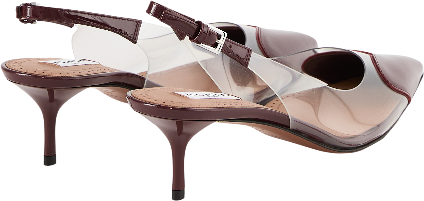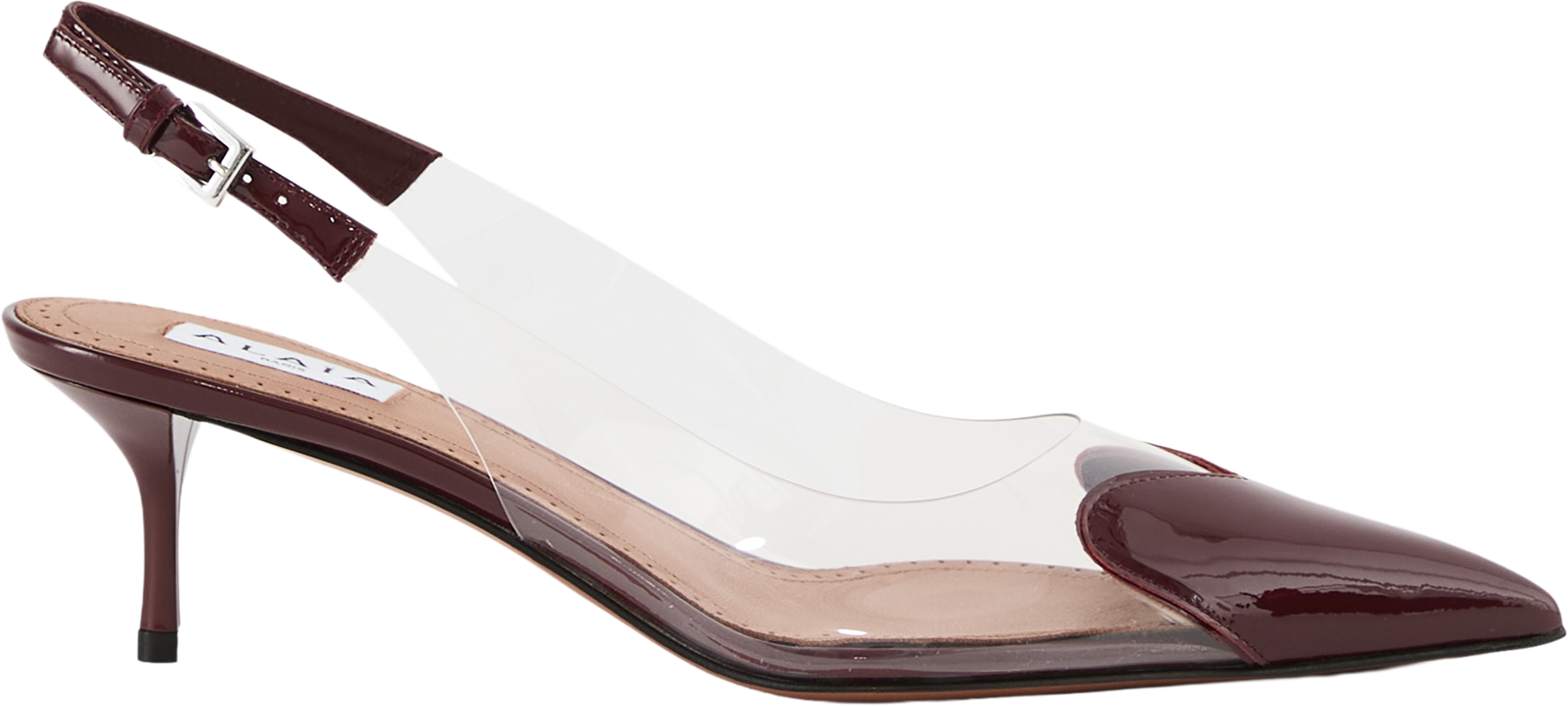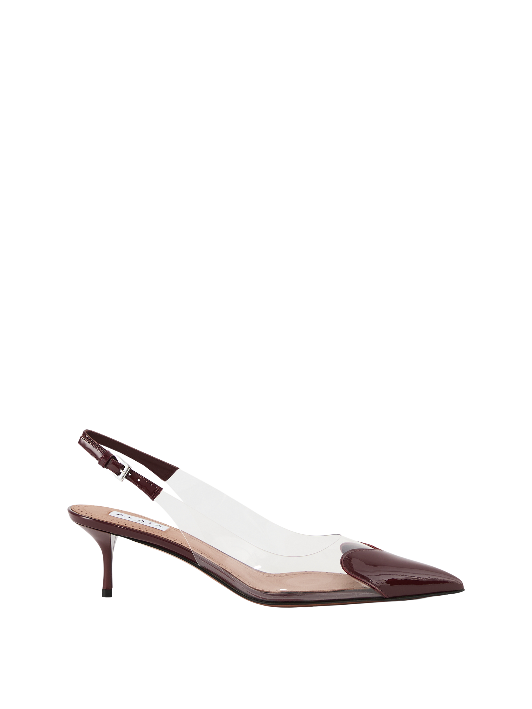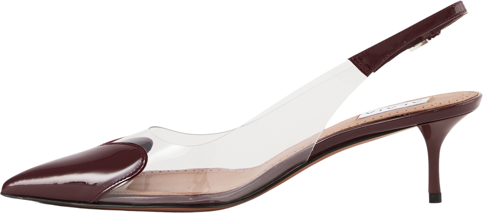 Die Slingback-Pumps '55' in Bordeaux von Alaïa wurden aus Kalbsleder gefertigt und bestechen durch ein ausgeschnittenes Herz an der Schuhspitze. Die spitze Zehenkappe und der transparente Part perfektionieren dieses zeitlose Modell.