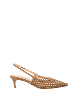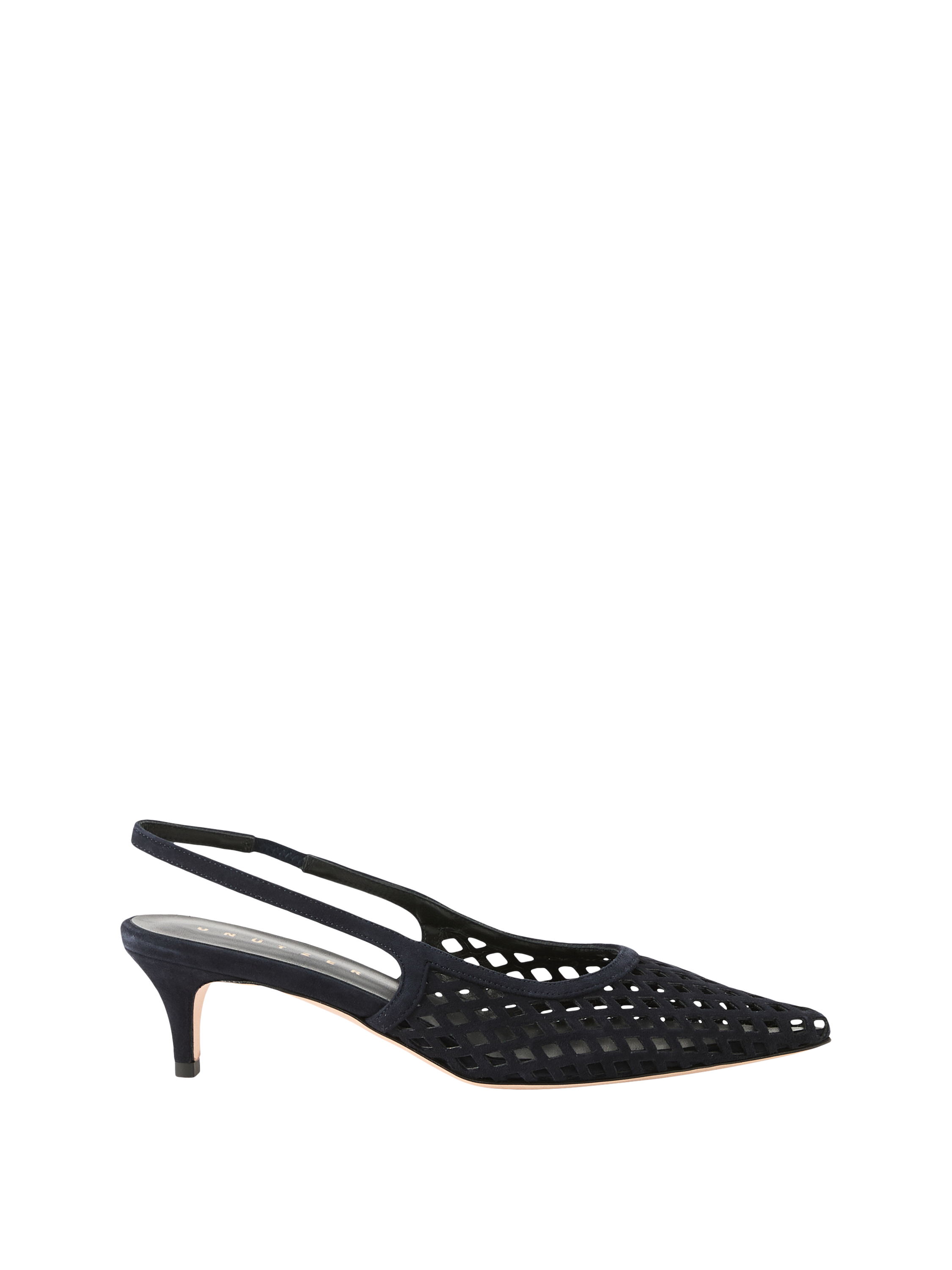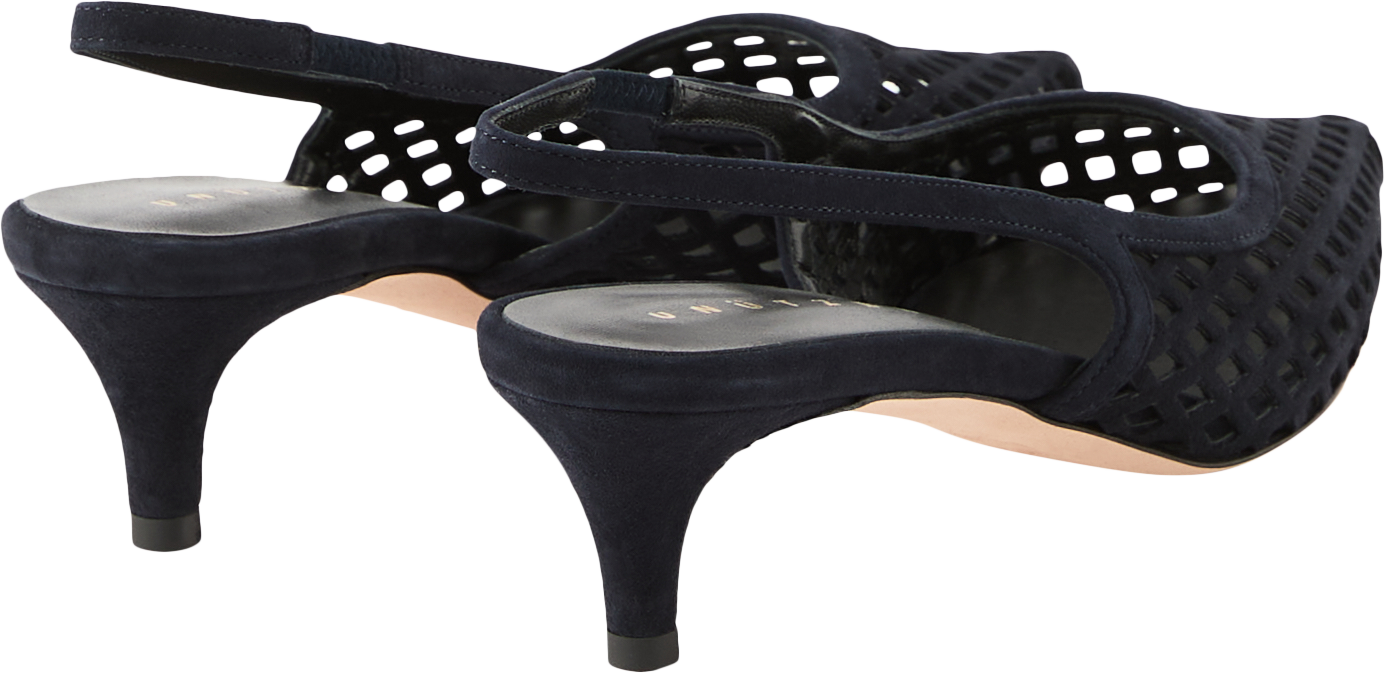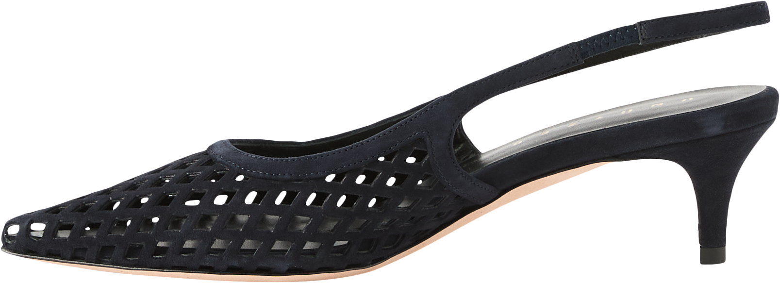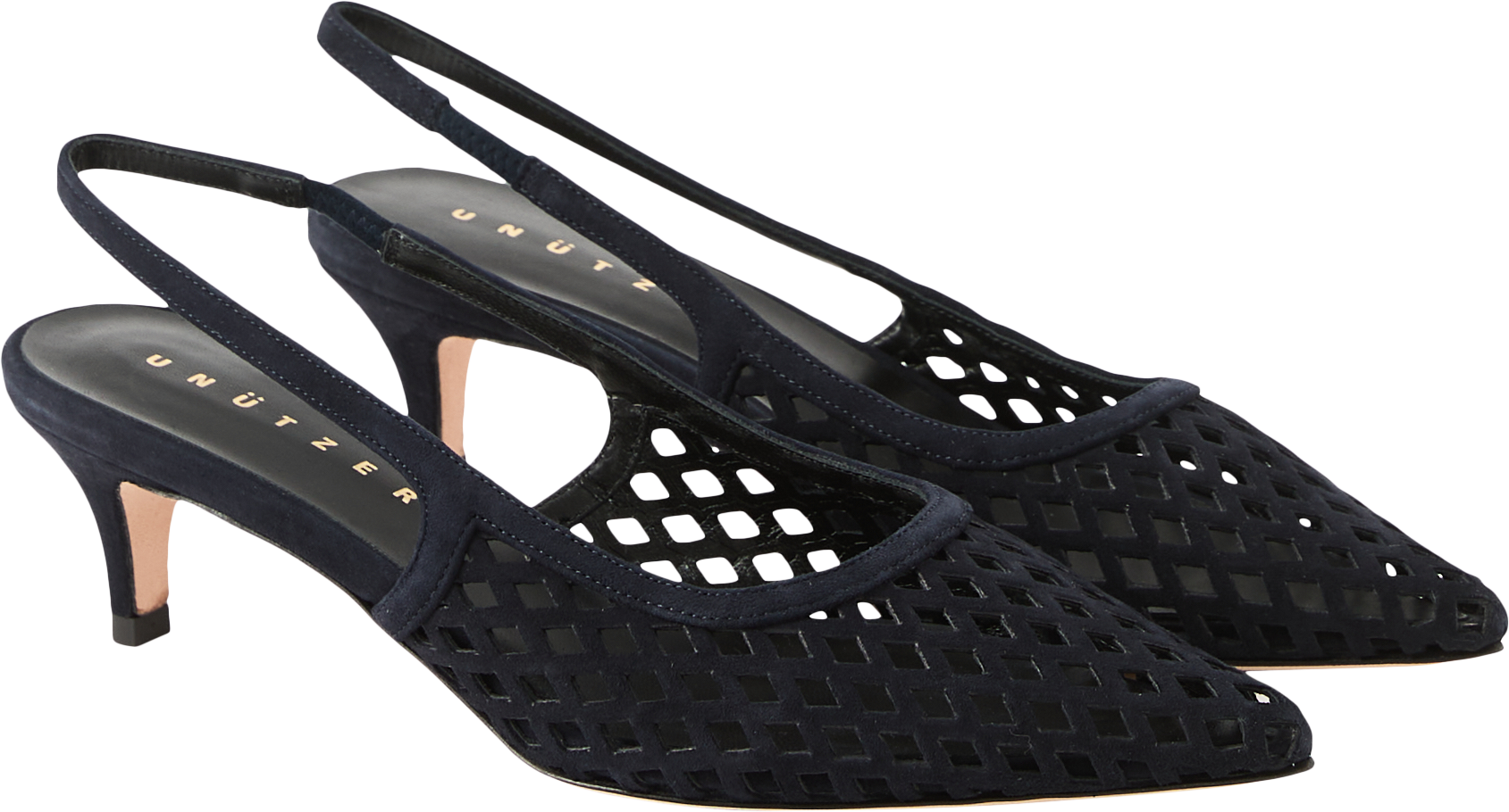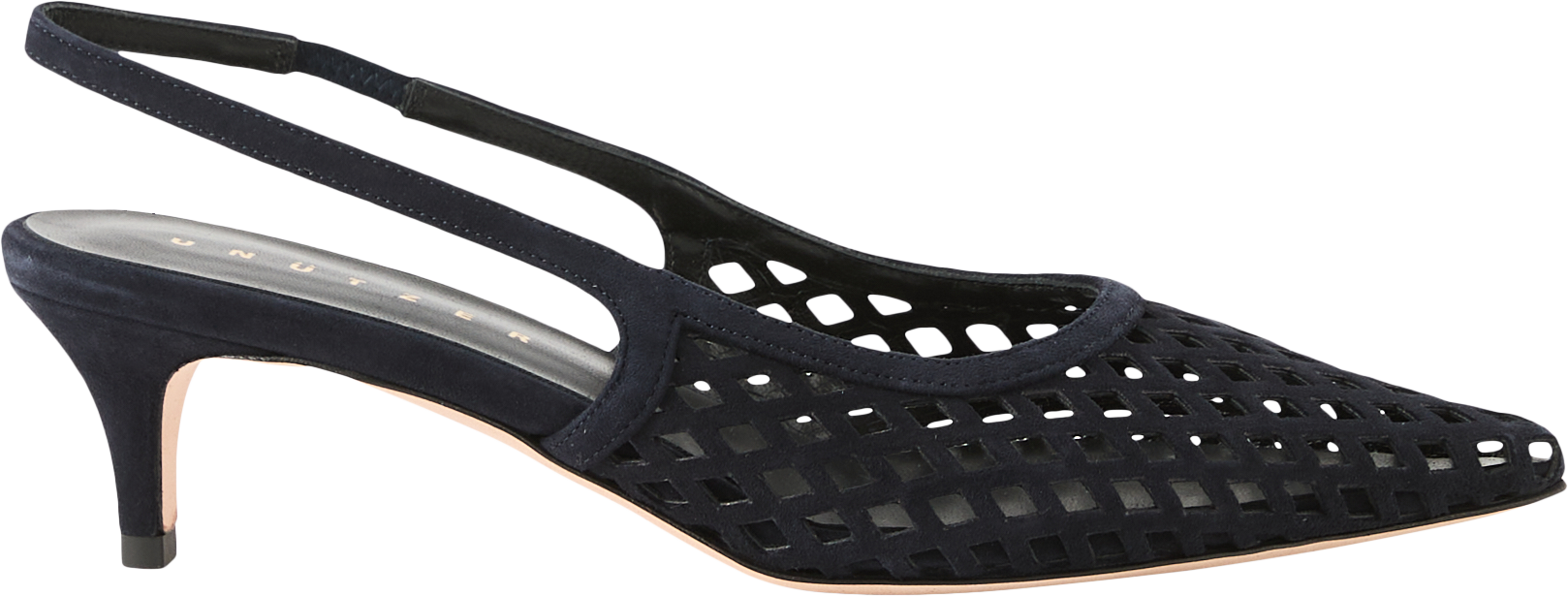 Die Slingback-Pumps in Marineblau von Unützer wurden aus hochwertigem perforiertem Veloursleder gefertigt und bestechen durch die raffinierte Eleganz. Die spitze Zehenform, der elastische Slingback-Riemen sowie der filigrane Kitten-Heel verleihen dem Modell eine zeitlose und feminine Note.