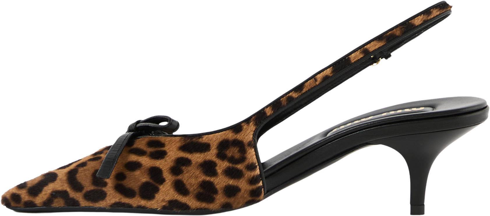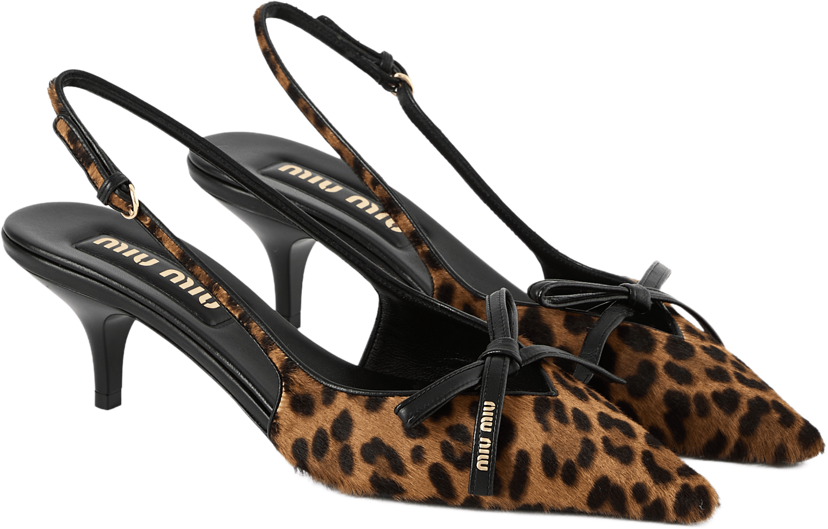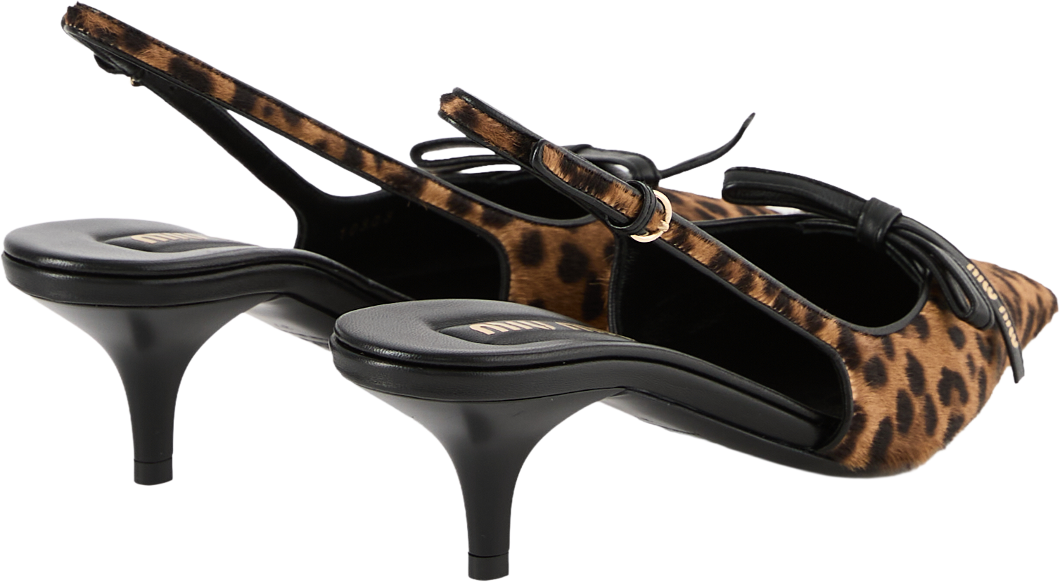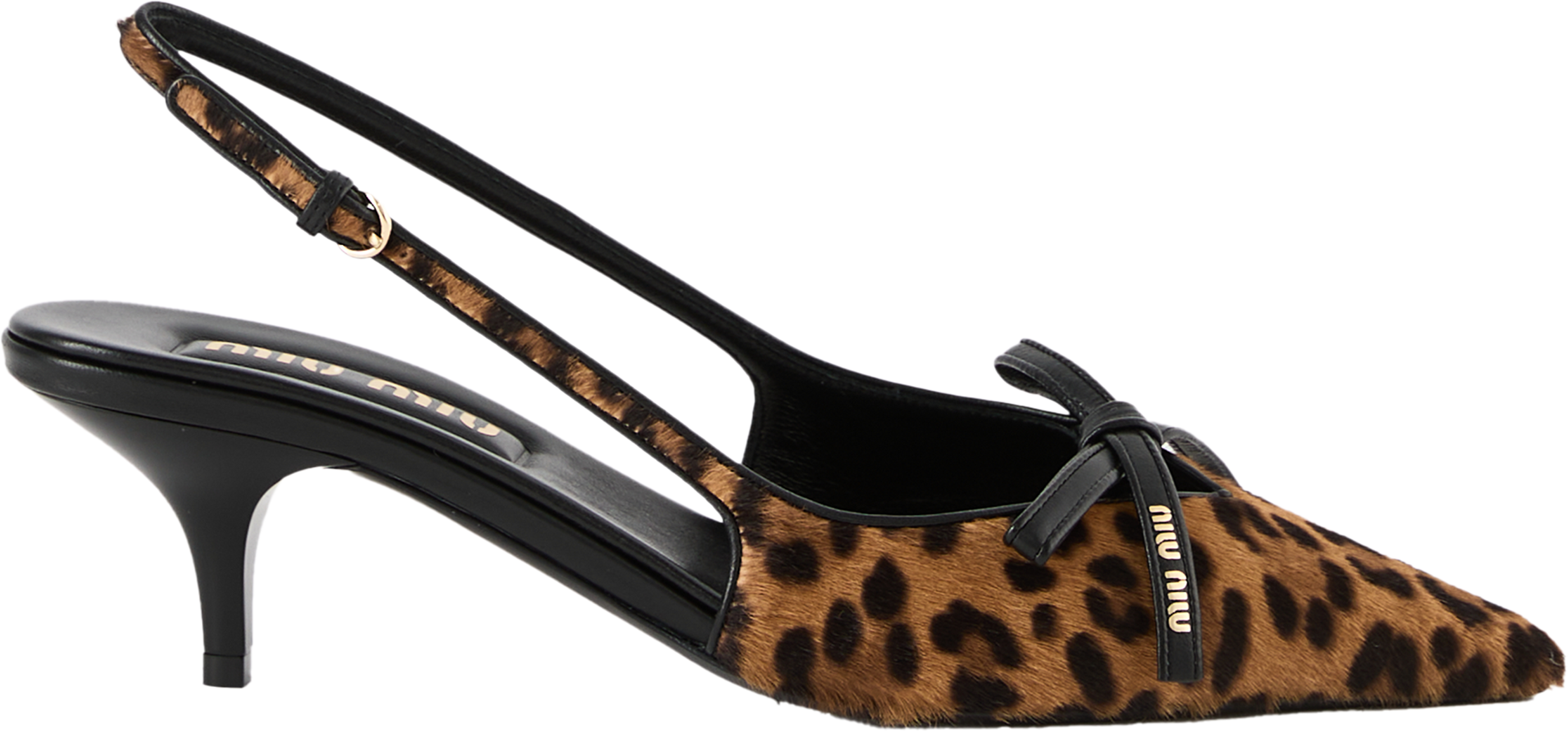 Die Slingback-Pumps in Beige von miu miu wurden aus Kalbsleder gefertigt und bestechen durch den Animal-Print. Die Schleife mit Logo, der lackierte Absatz und die spitze Zehenpartie runden das Modell ab.