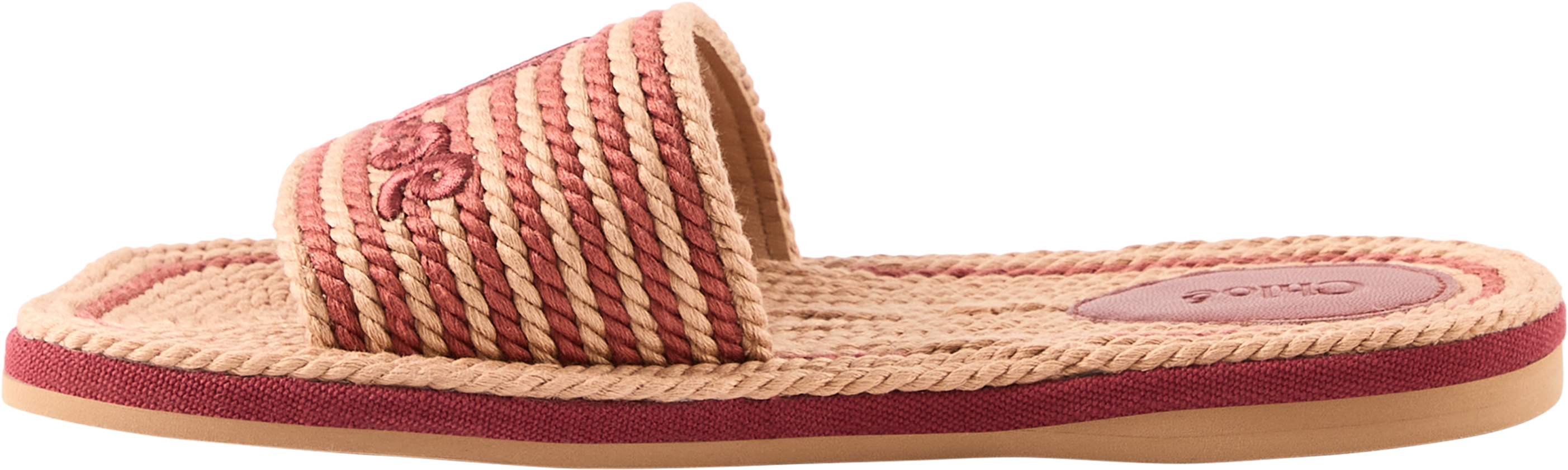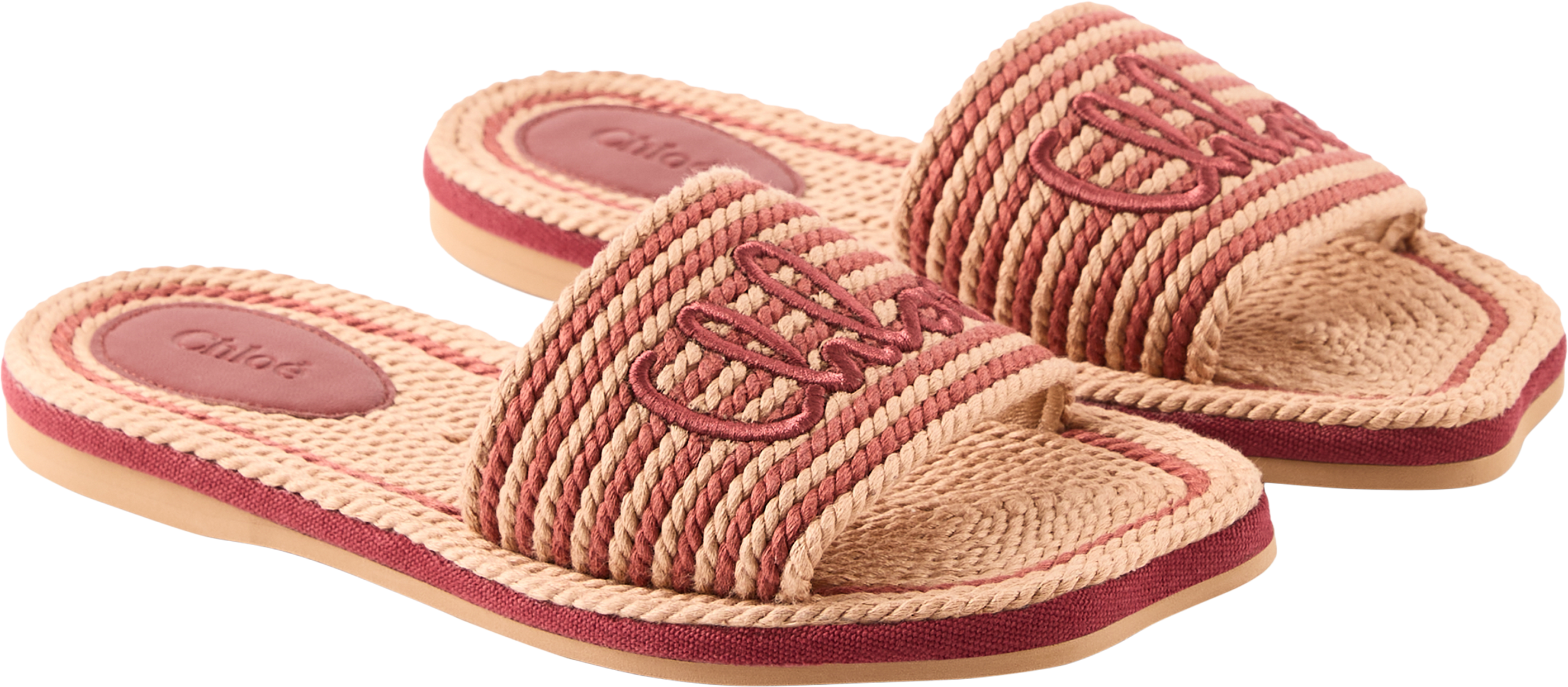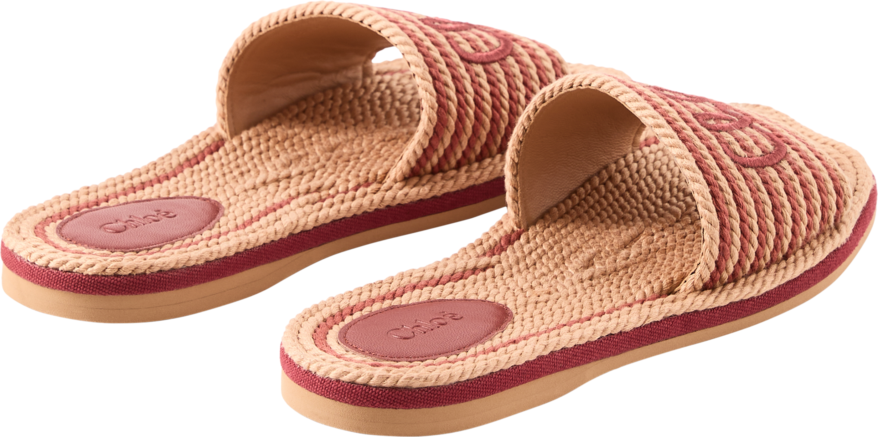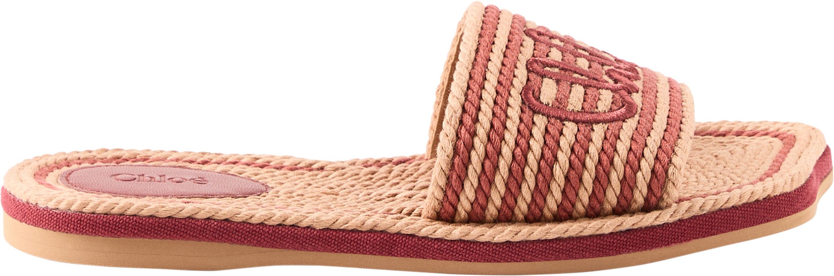 Diese Sandalen in Woodrose von Chloé wurden aus recycelter, handgeflochtener Kordel gefertigt und bestechen durch die zweifarbige Optik. Die gewellte Sohle sowie die auf der Vorderseite mit einer handschriftlichen Chloé-Signatur bestickten Details runden das elegante Design ab.