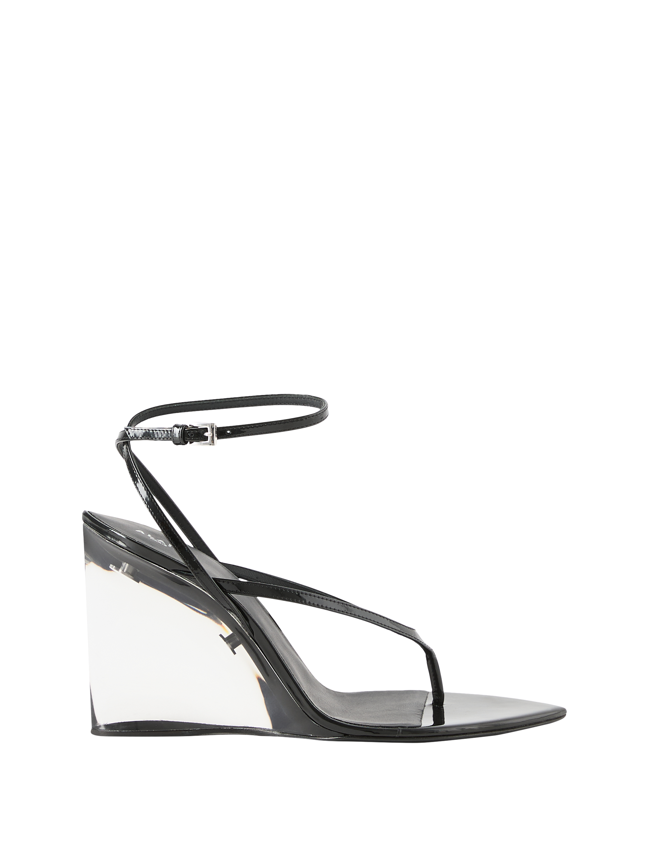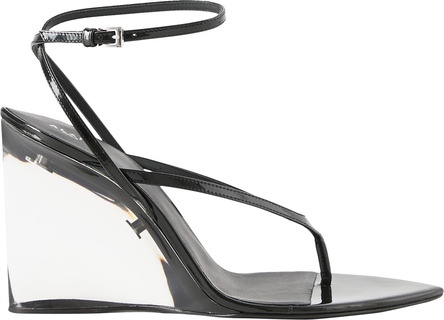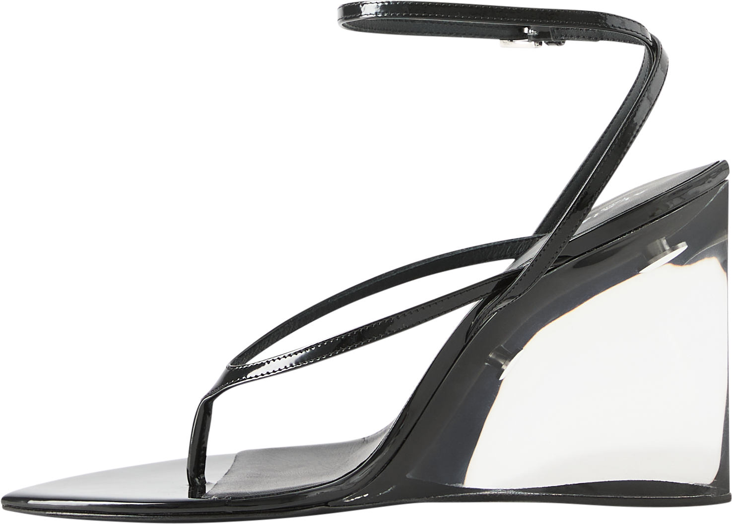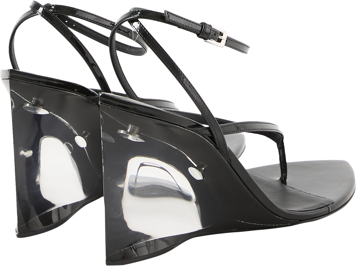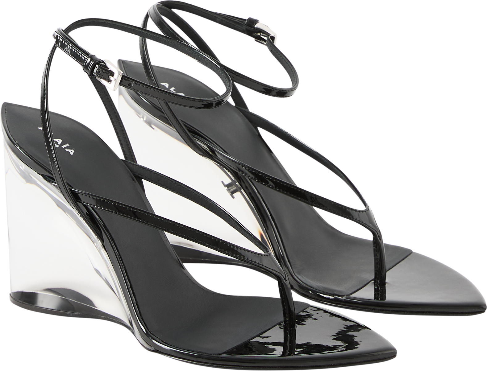 Die Sandalen 'Tongs 90' in Schwarz von Alaïa wurden aus Kalbsleder gefertigt und bestechen durch den Keilabsatz aus Plexiglas. Die Zehenpartie und die Ferse laufen spitz zu, während die überkreuz verlaufenden Knöchelriemen sowie die Nieten mit Alaïa-Signatur dem Modell eine moderne und elegante Note verleihen.