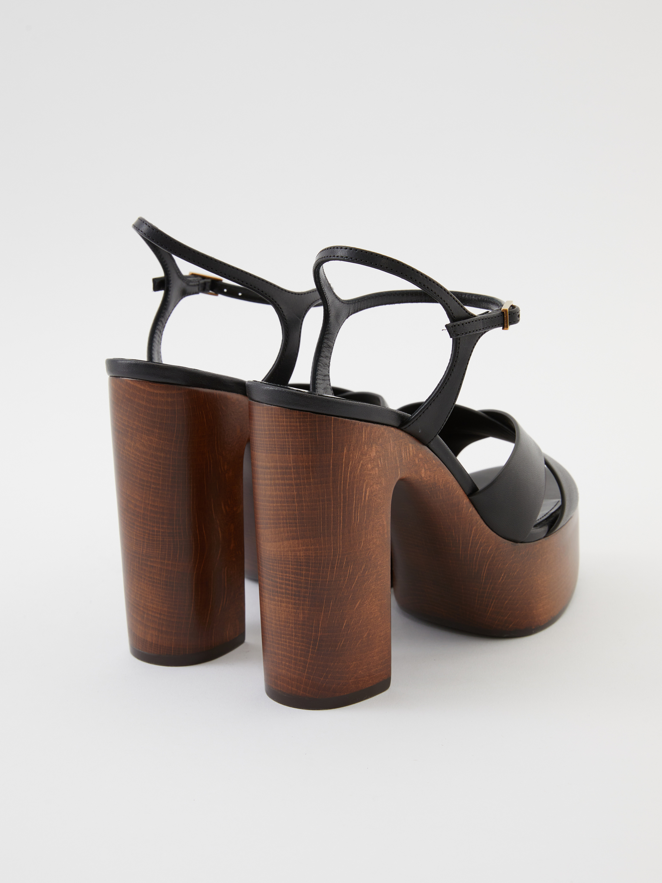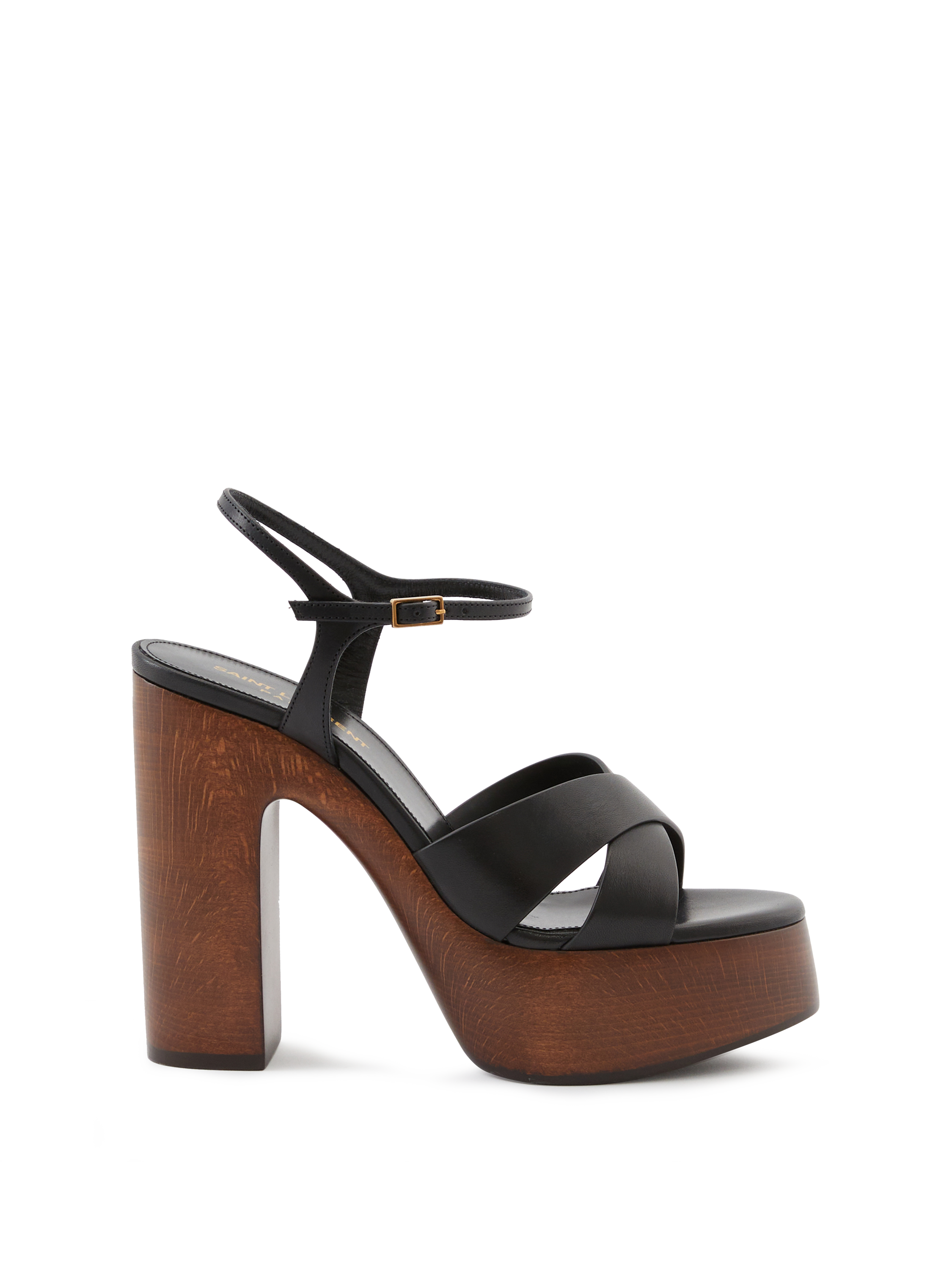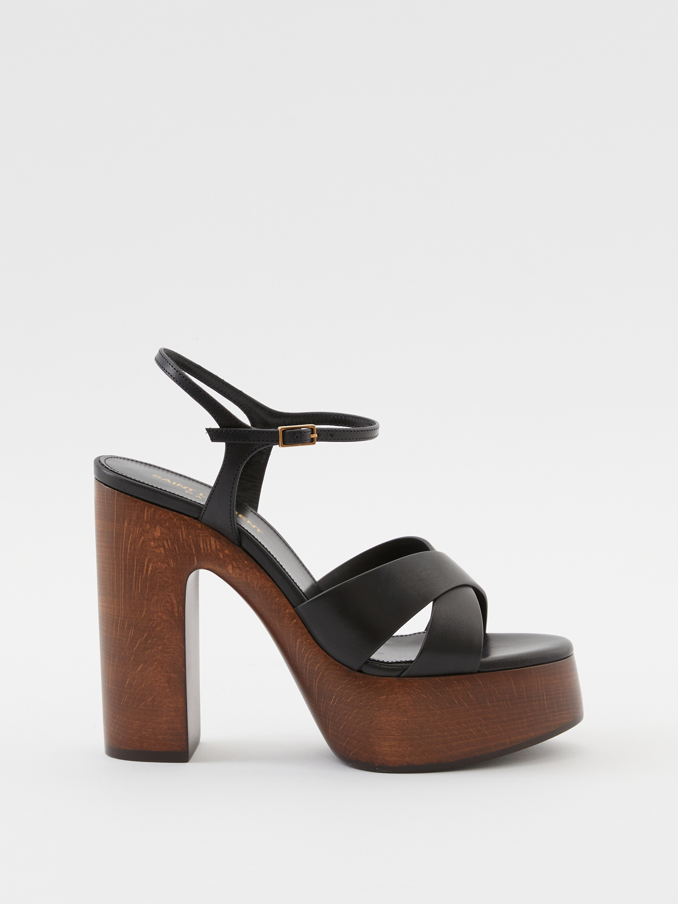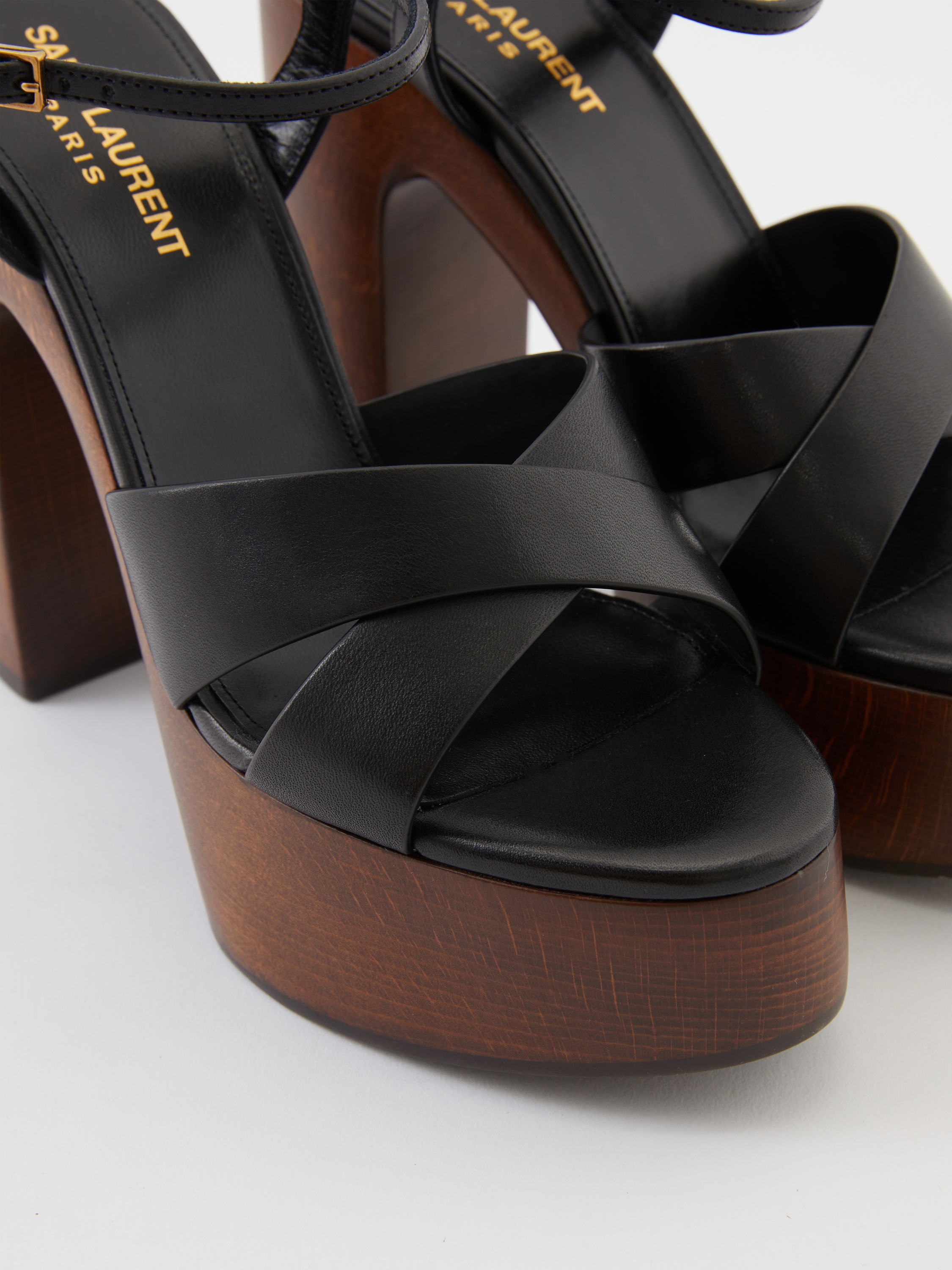 Die Plateausandalen 'Bianca' in Schwarz von Saint Laurent wurden aus Kalbsleder gefertigt. Das moderne Design zeichnet sich durch die runde Zehenpartie und den Blockabsatz aus Holz aus. Die gekreuzte Vorderseite, sowie der verstellbare Knöchelriemen verleihen dem Look einen modernen Abschluss.