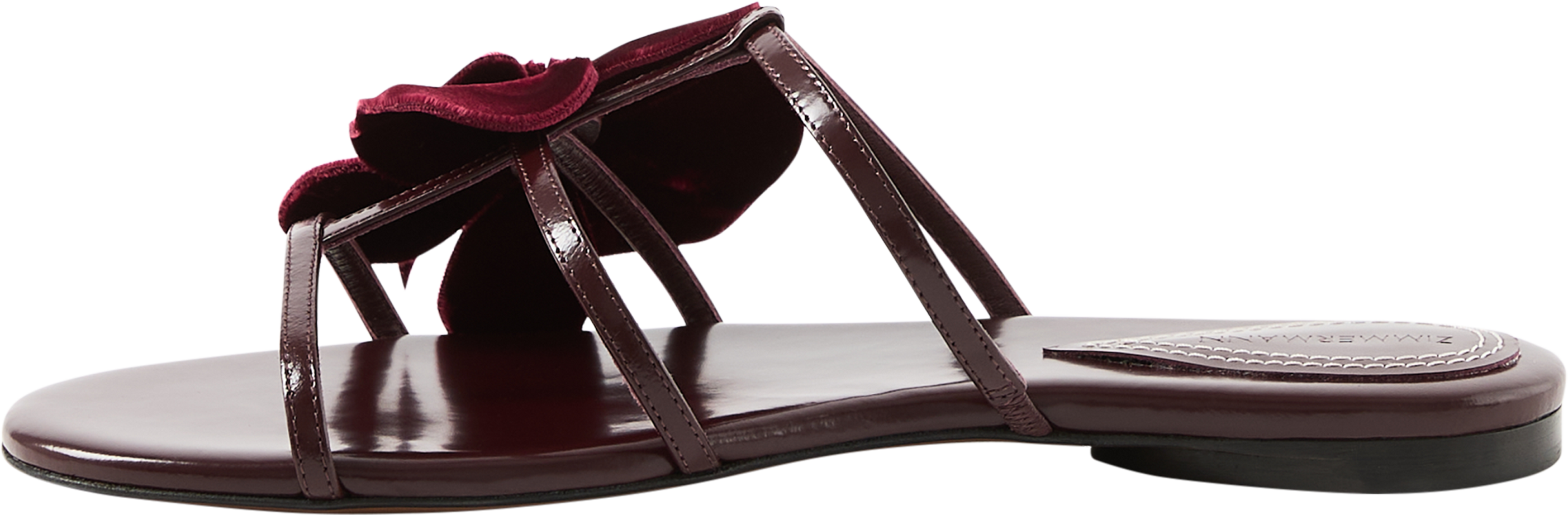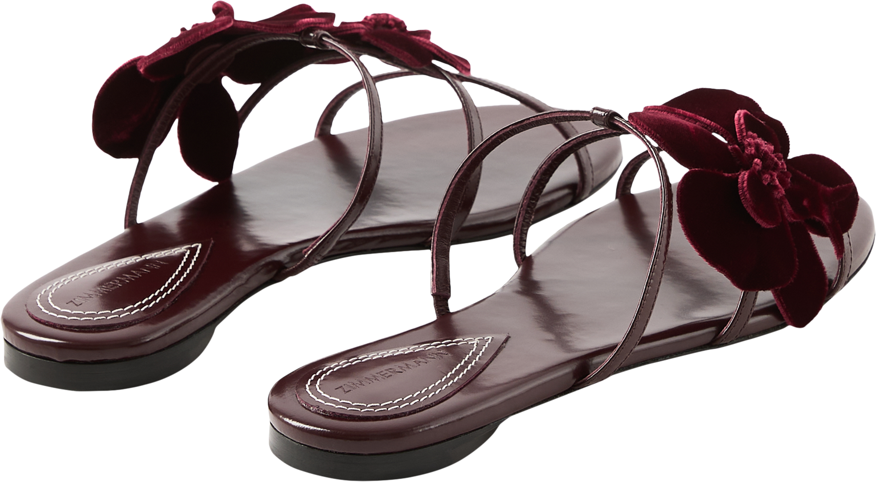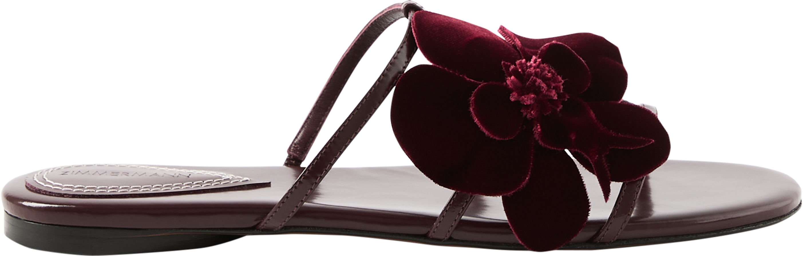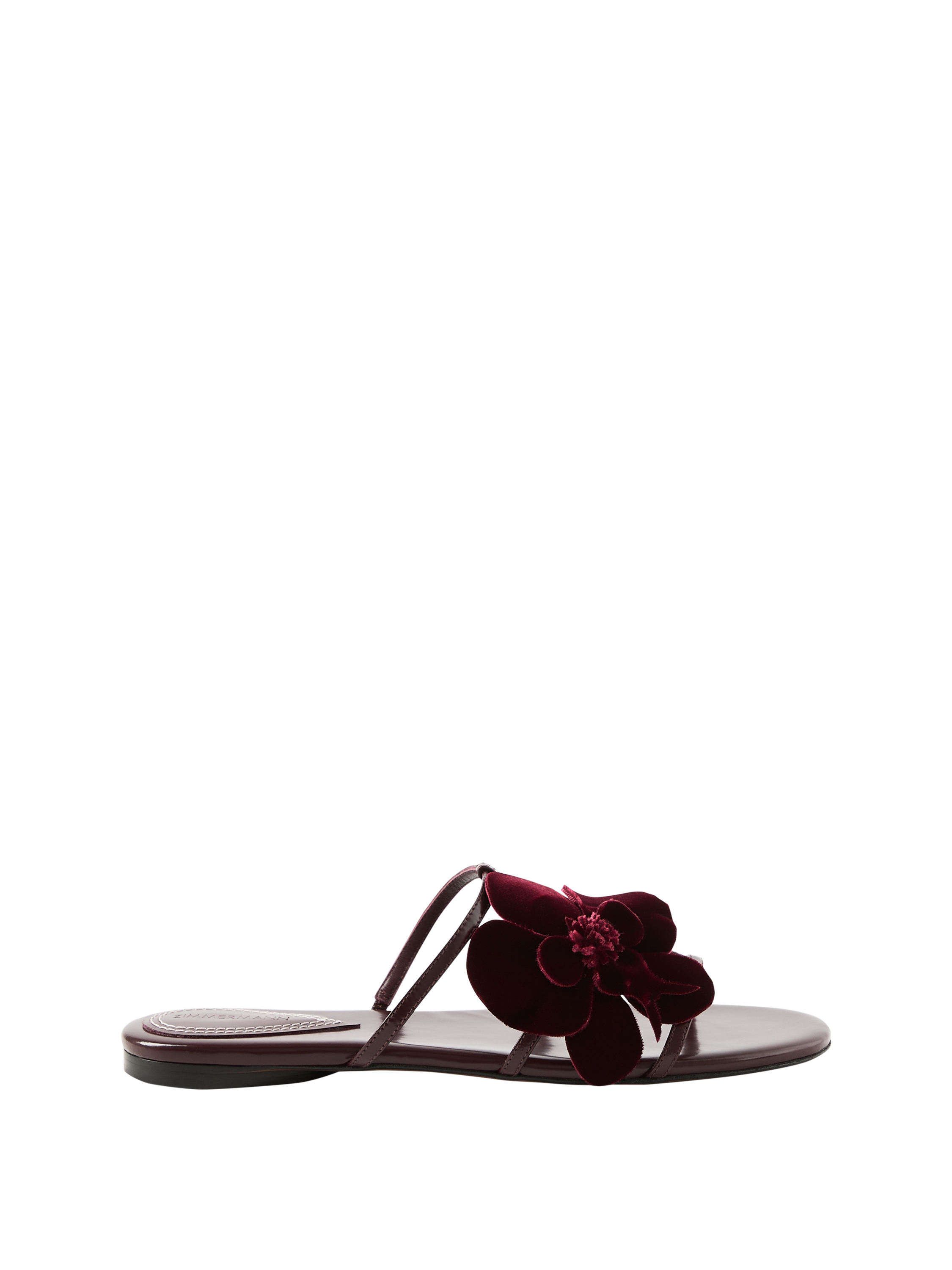 Die Sandalen 'Orchid' in Bordeaux von Zimmermann wurden aus Kalbsleder gefertigt und bestechen durch die Lederinnensohle, die runde Zehenpartie sowie das asymmetrische, feste Orchideen-Design.