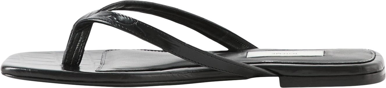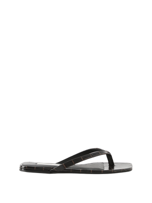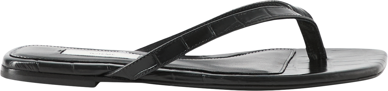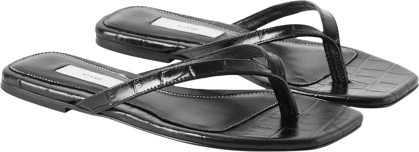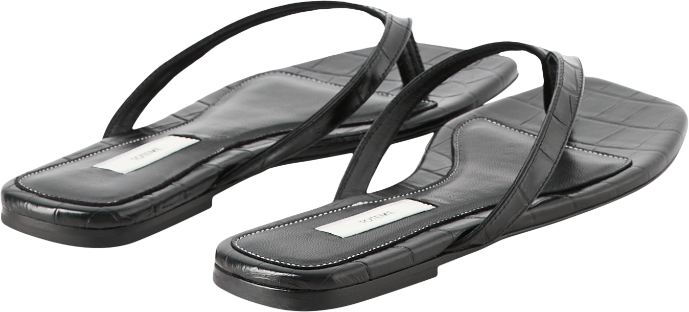 Diese Sandalen in Schwarz von TOTEME wurden aus hochwertigem Kalbsleder gefertigt und bestechen durch die edle Kroko-Prägung. Die eckige Zehenpartie und der dezente Zehentrenner prägen das stillvolle Design.