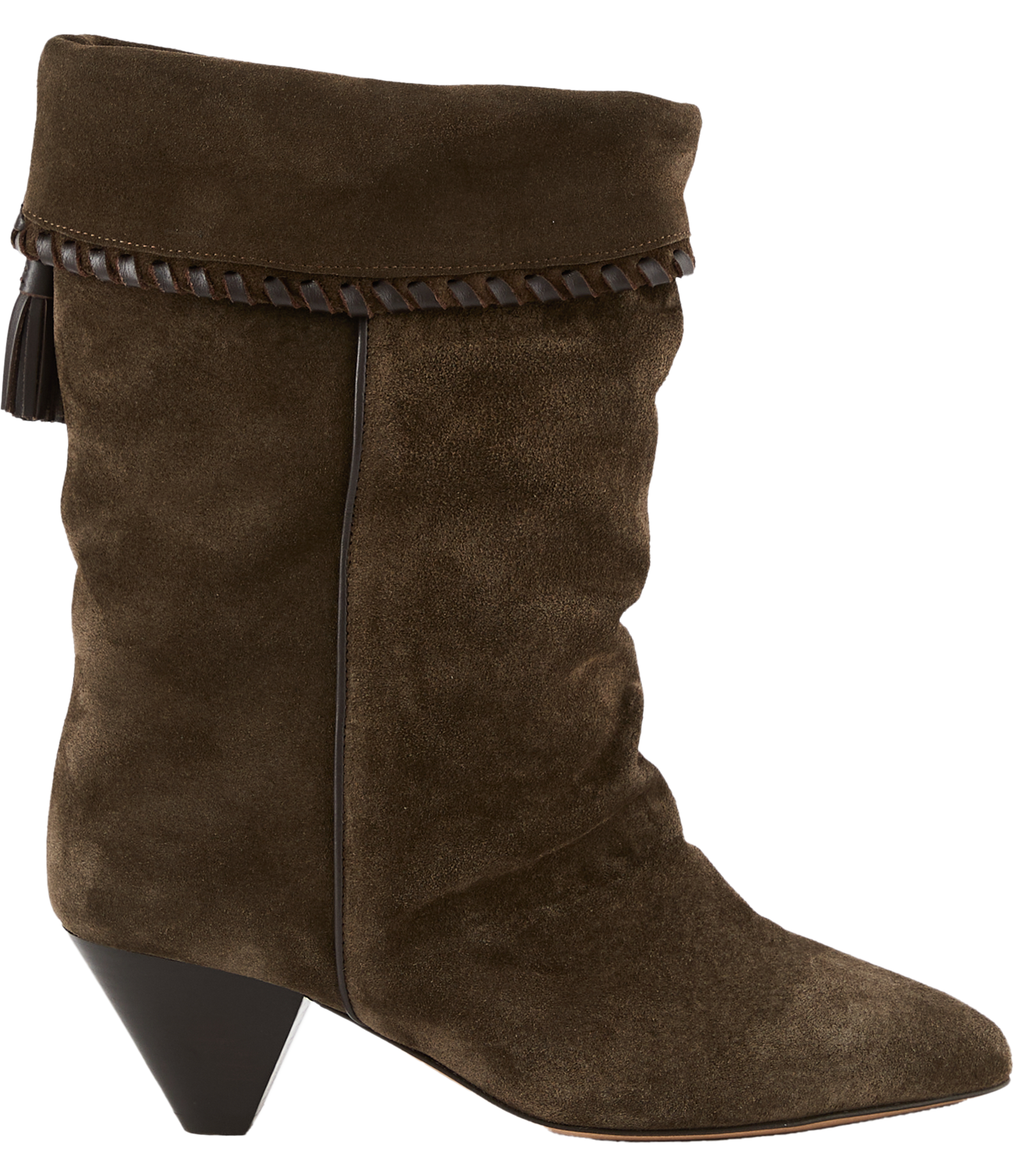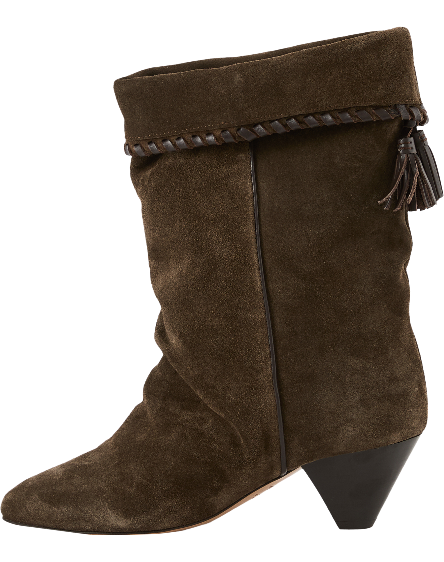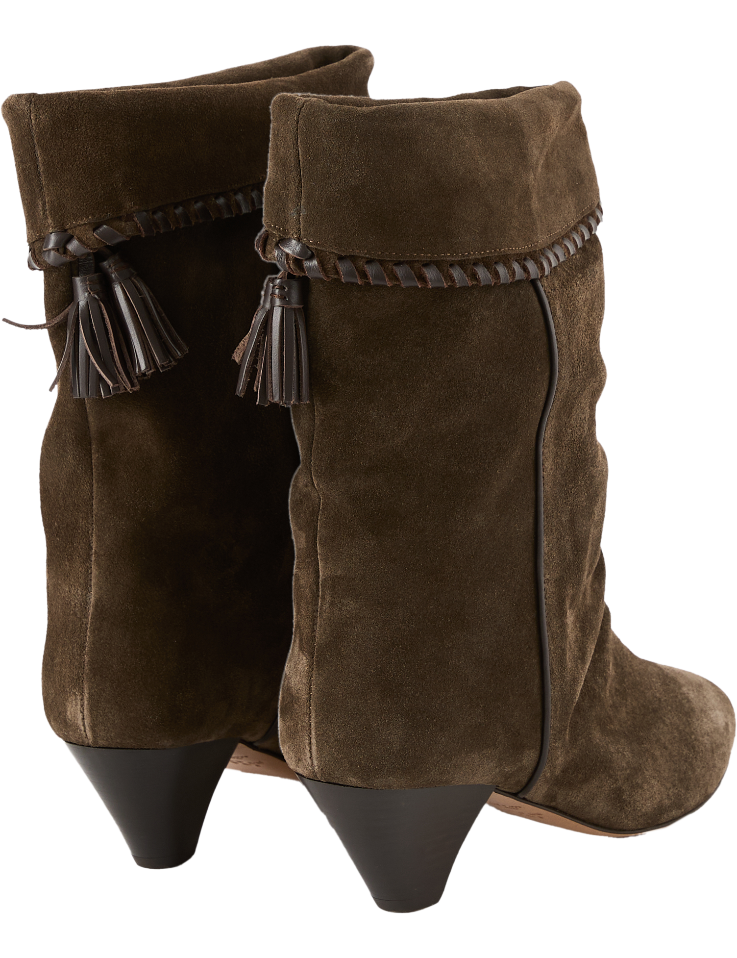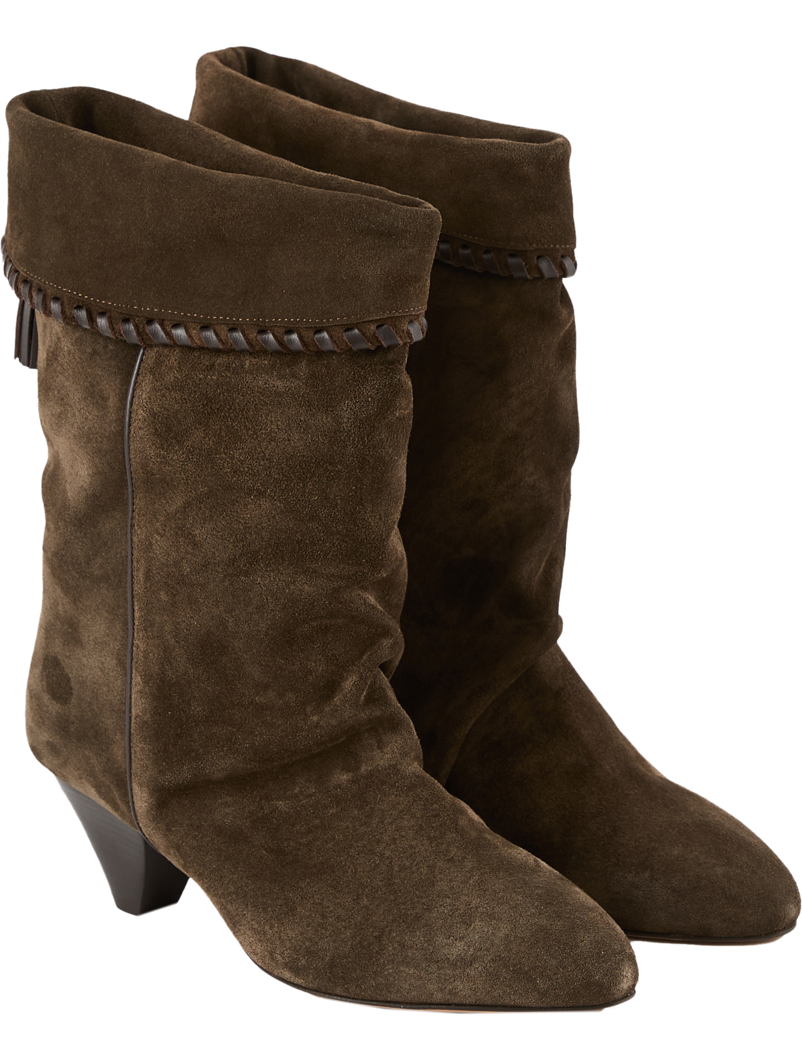 Die Cowboy-Stiefel 'Dalby' in Dunkelbraun von Isabel Marant wurden aus Veloursleder gefertigt und bestechen durch den Umschlag am Schaft. Die Ziernähte am Umschlag sowie die dekorativen Quasten am Schaft, die spitz zulaufende Vorderkappe und der kubanische Absatz runden das Modell gekonnt ab.