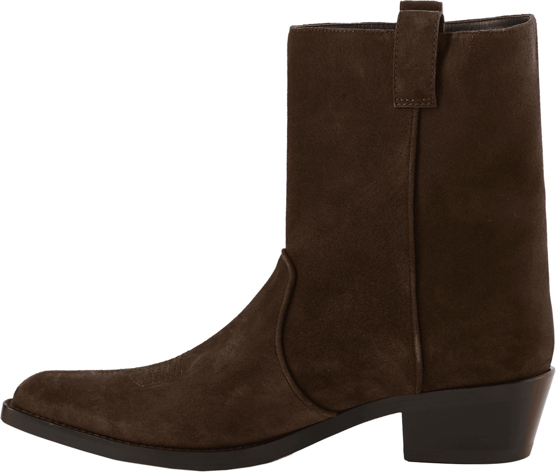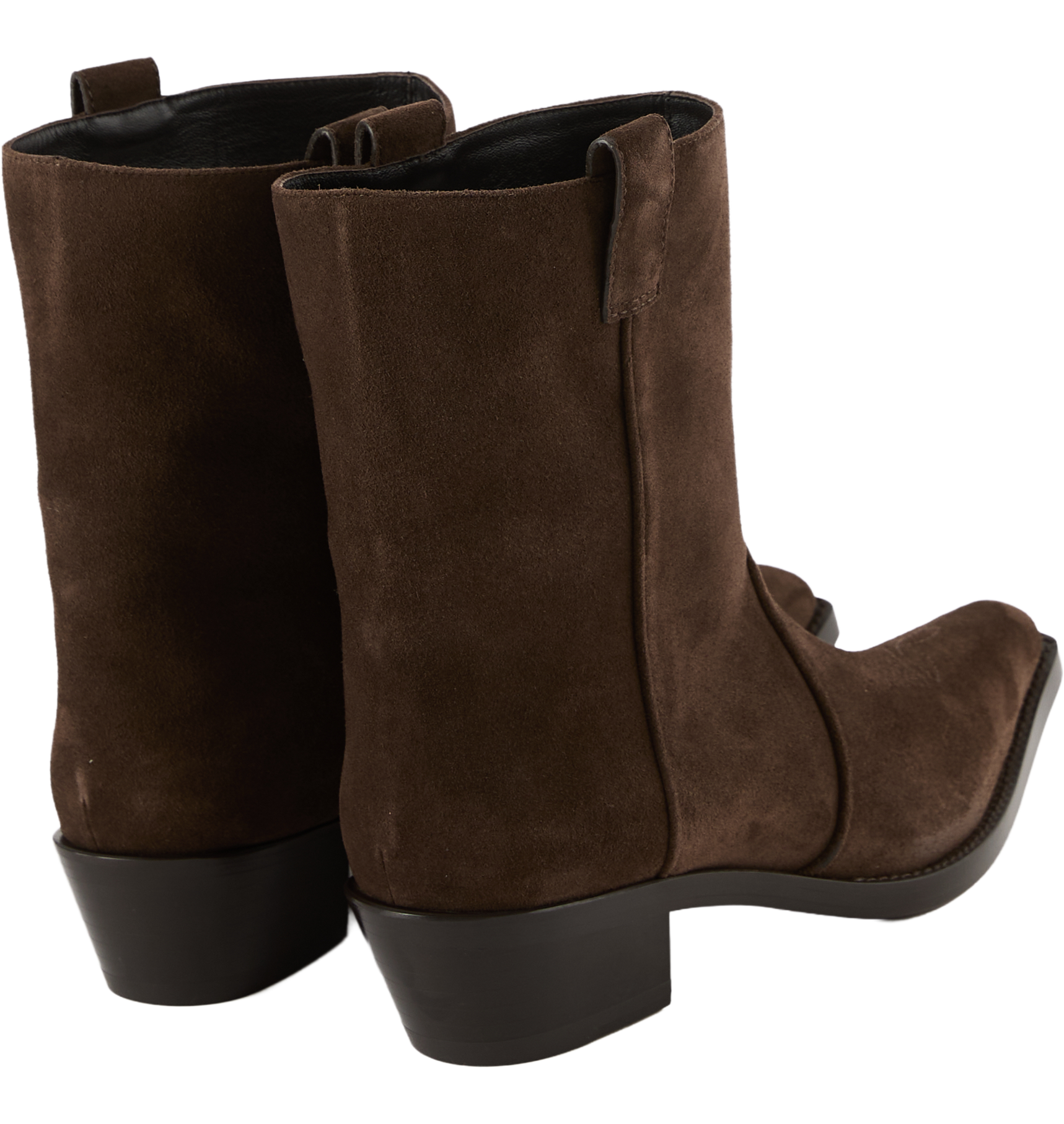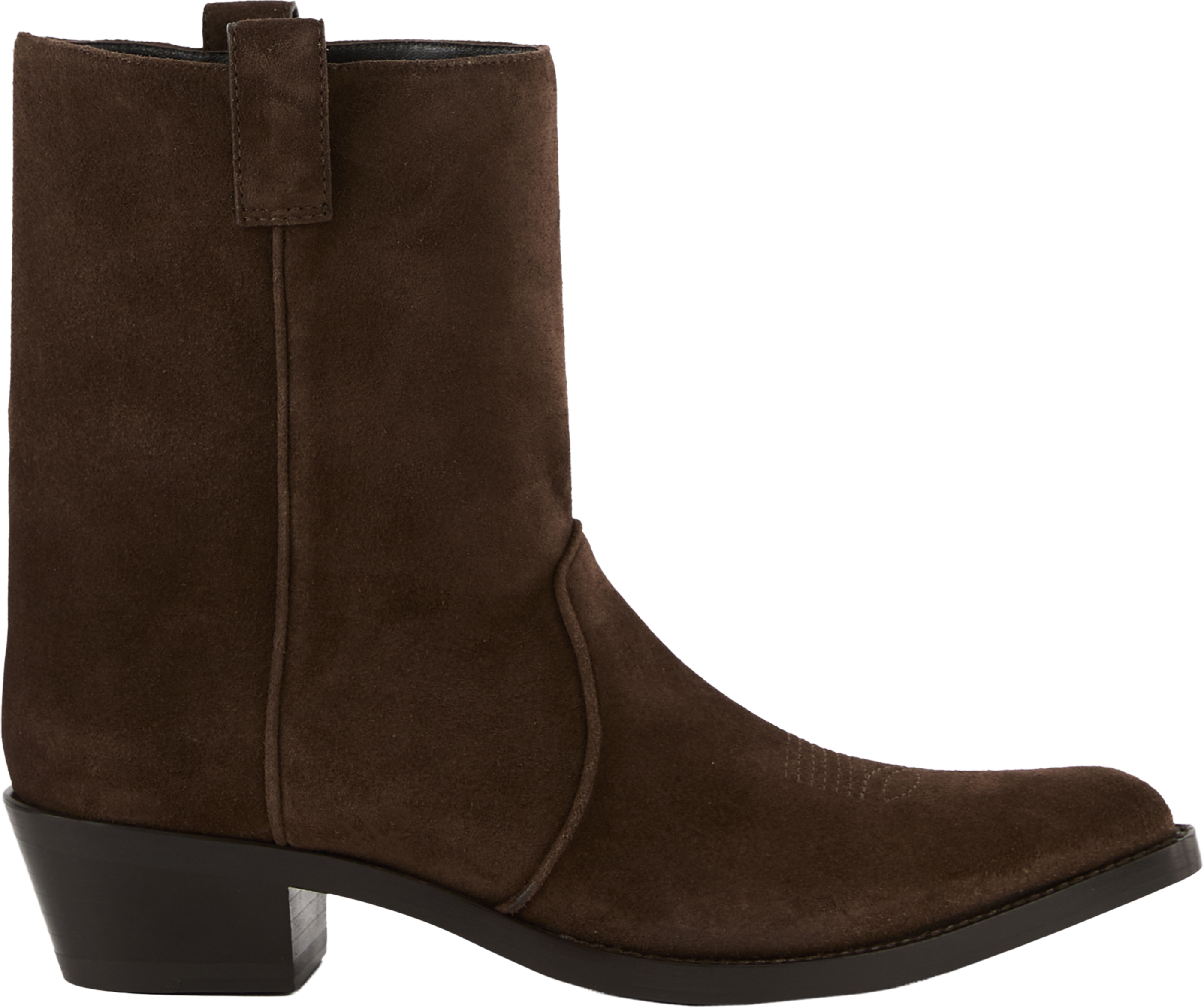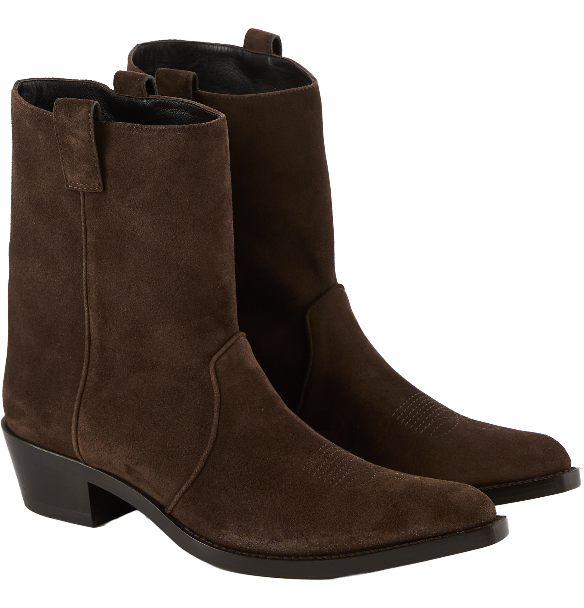Die Stiefeletten 'Clive' in Dunkelbraun von Khaite wurden aus hochwertigem Kalbsleder gefertigt und bestechen durch die rustikale Optik. Der halbhohe Schaft, die spitz zulaufende Silhouette, der schräge Schaft aus samtweichem Wildleder sowie die Rahmennaht verleihen dem Modell eine elegante Silhouette.