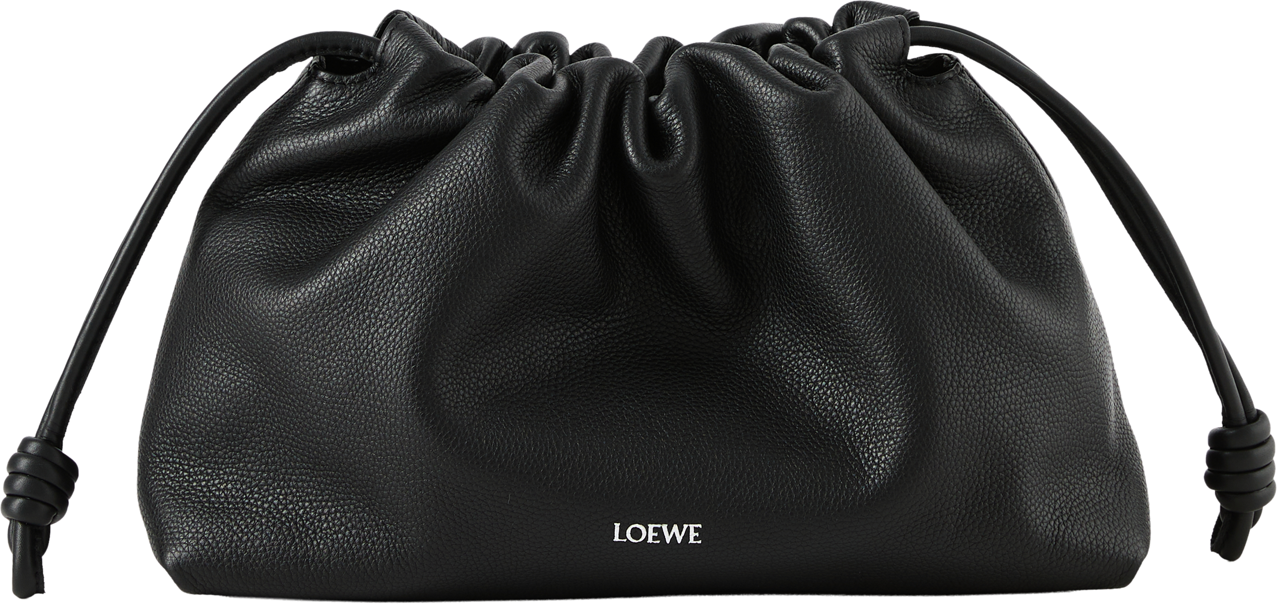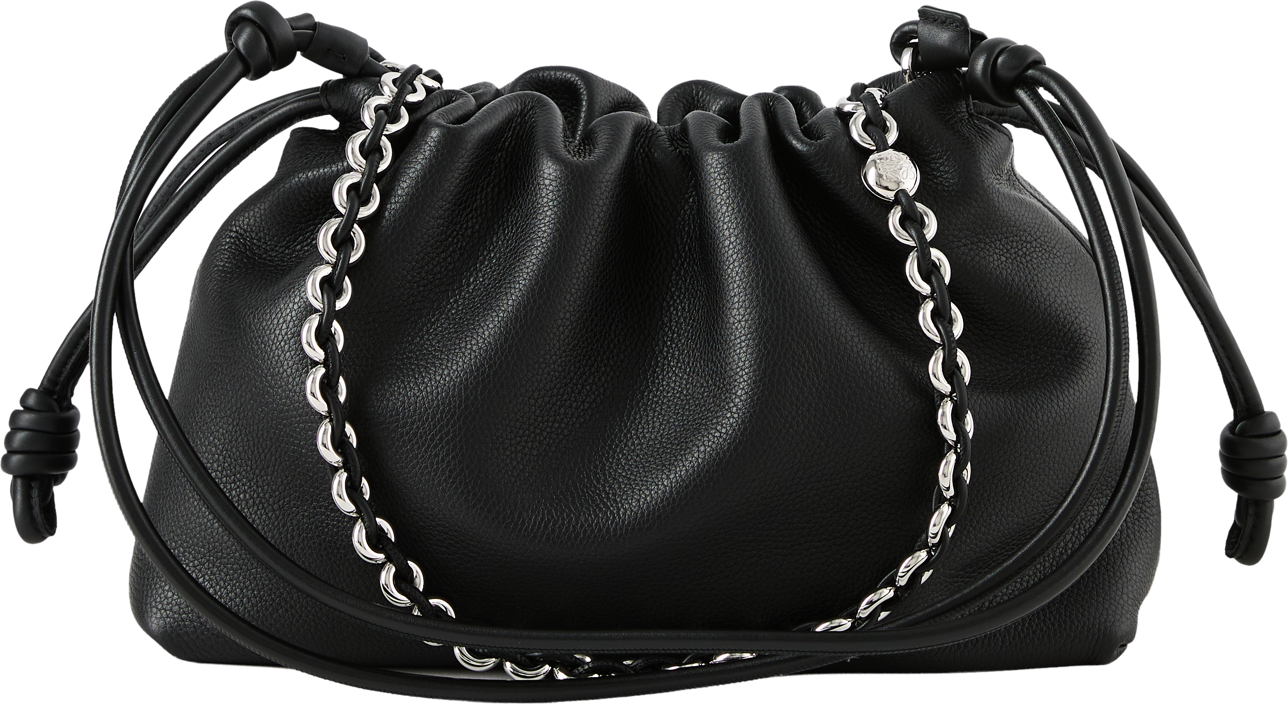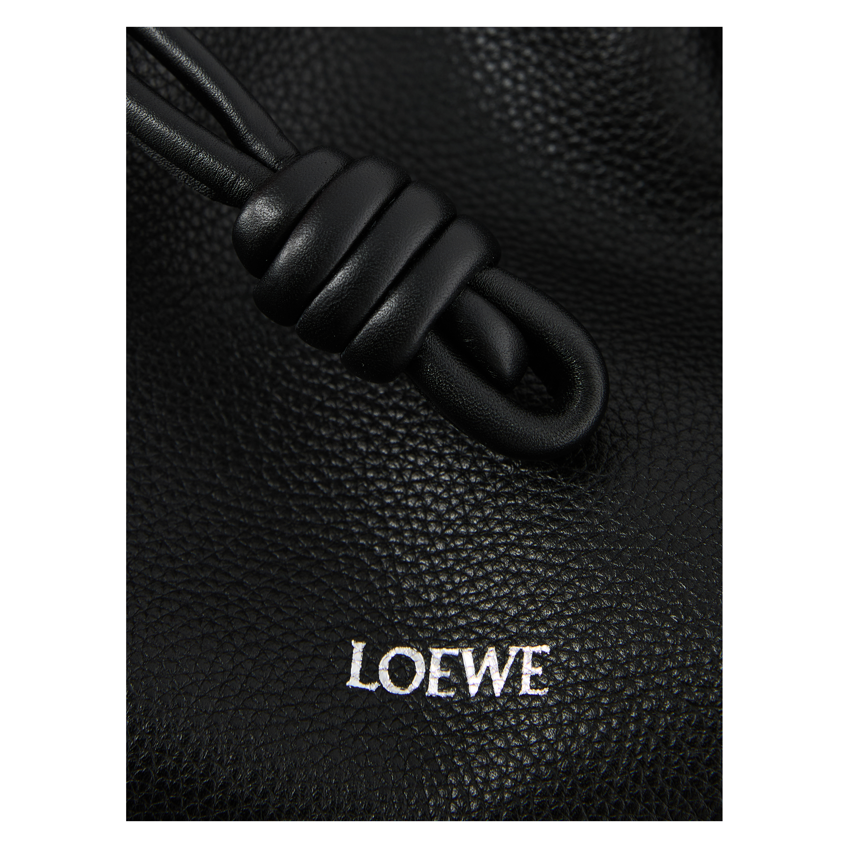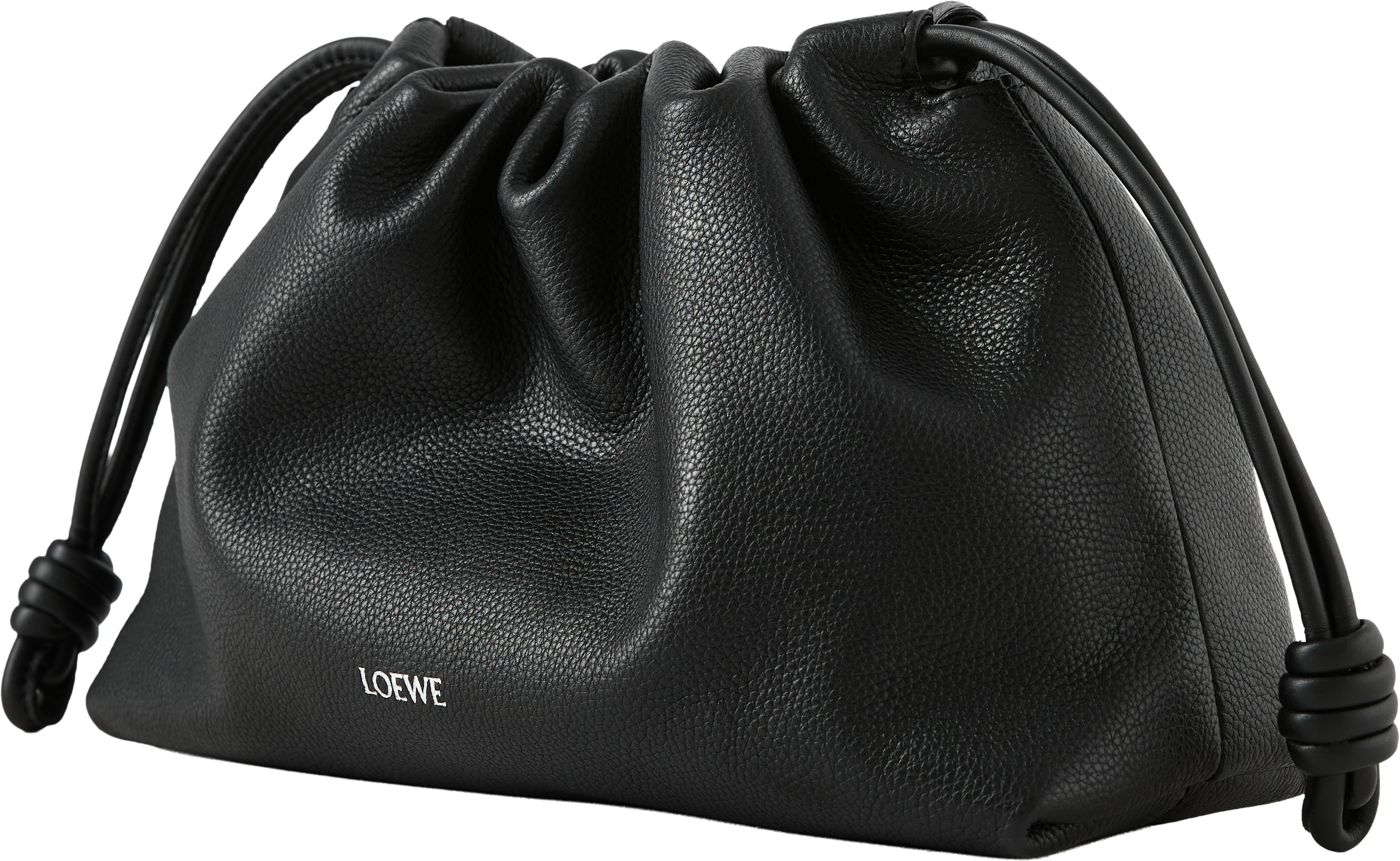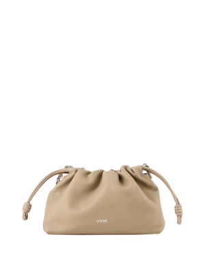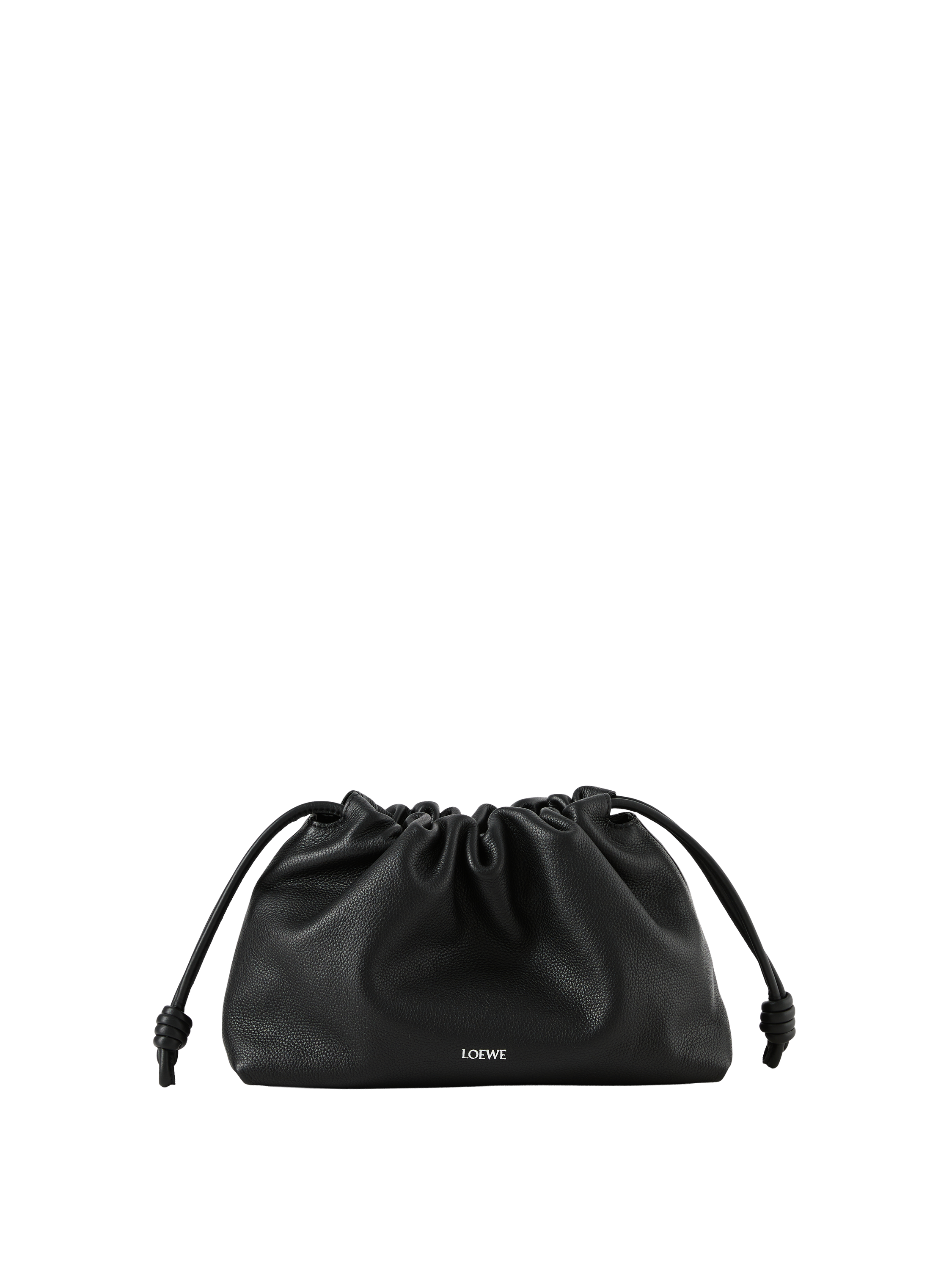 Die Clutch 'Flamenco Medium' in Schwarz von LOEWE wurde aus fein, genarbtem Kalbsleder gefertigt und besticht durch den Tunnelzug mit charakteristischen Knoten. Das geräumige Innenfach und das geschmeidige Material zeichnen das Modell aus. Die Clutch kann mit der Donut-Kette über der Schulter oder mit dem dazugehörigen Lederriemen als Umhängetasche getragen werden.