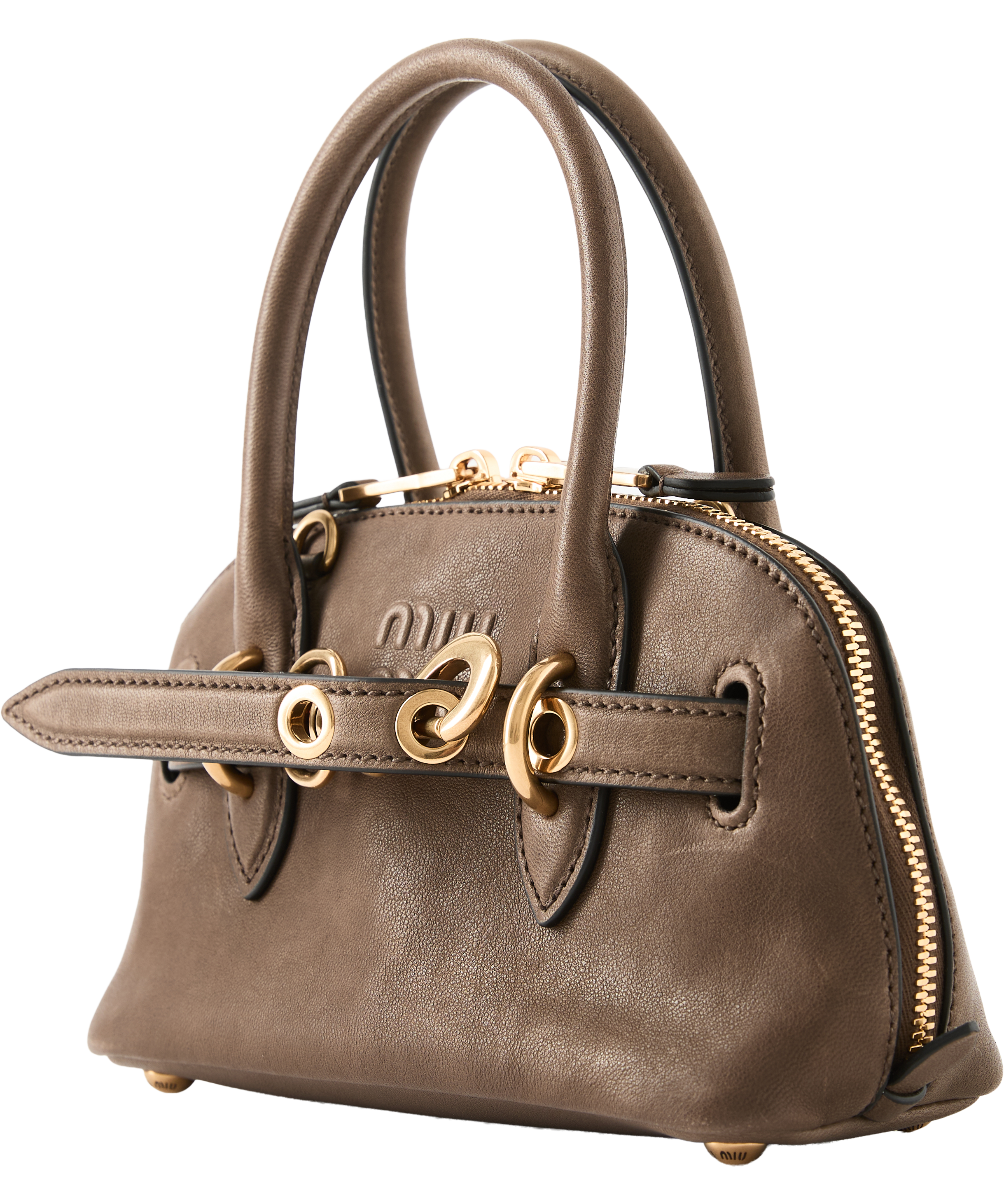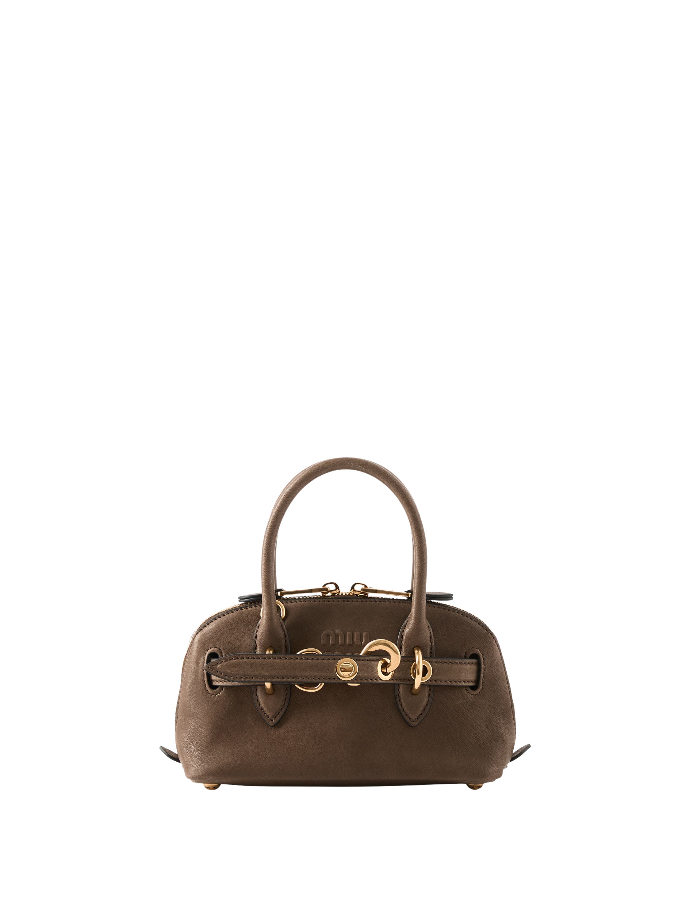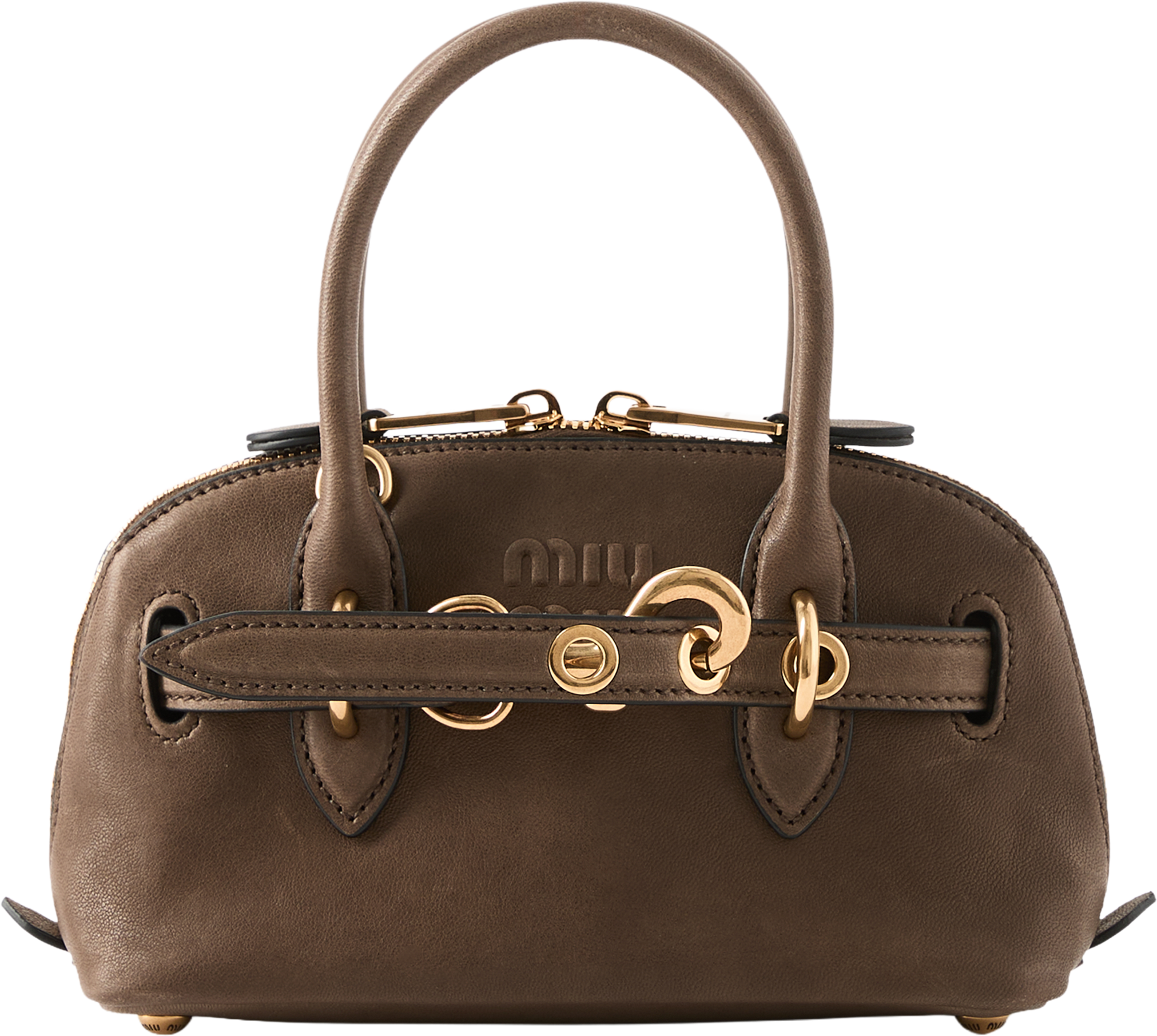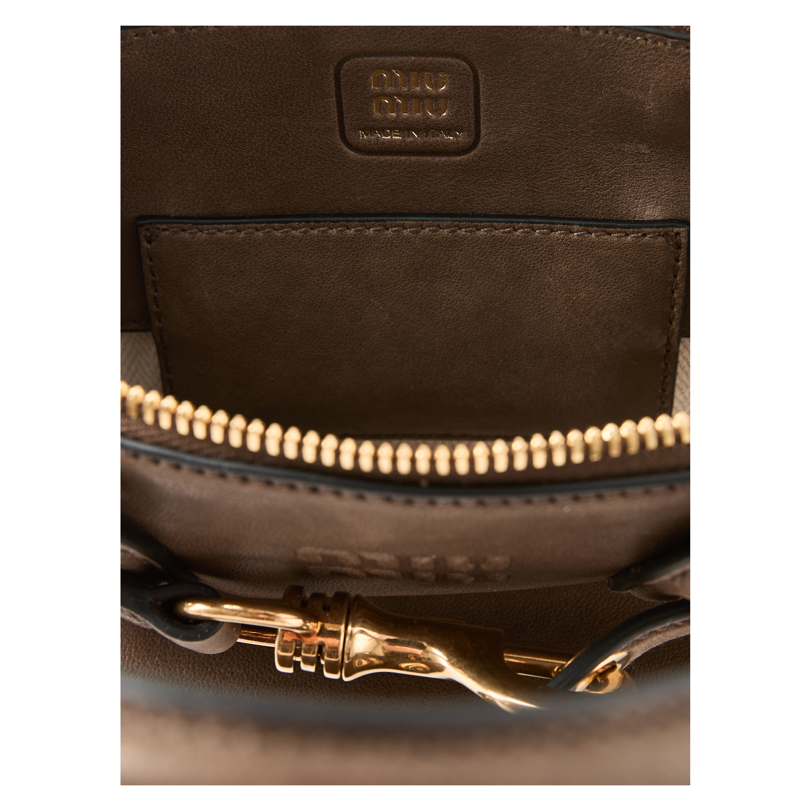 Die Handtasche 'Aventure' in Dunkelbraun von miu miu wurde aus weichem Lammleder gefertigt und besticht durch die goldfarbenen Beschläge in Antik-Optik. Der geprägte Logoschriftzug auf der Vorderseite, der Reißverschluss sowie das Innenleben aus Leinen mit zwei aufgesetzten Taschen zeichnen dieses hochwertige Modell aus.