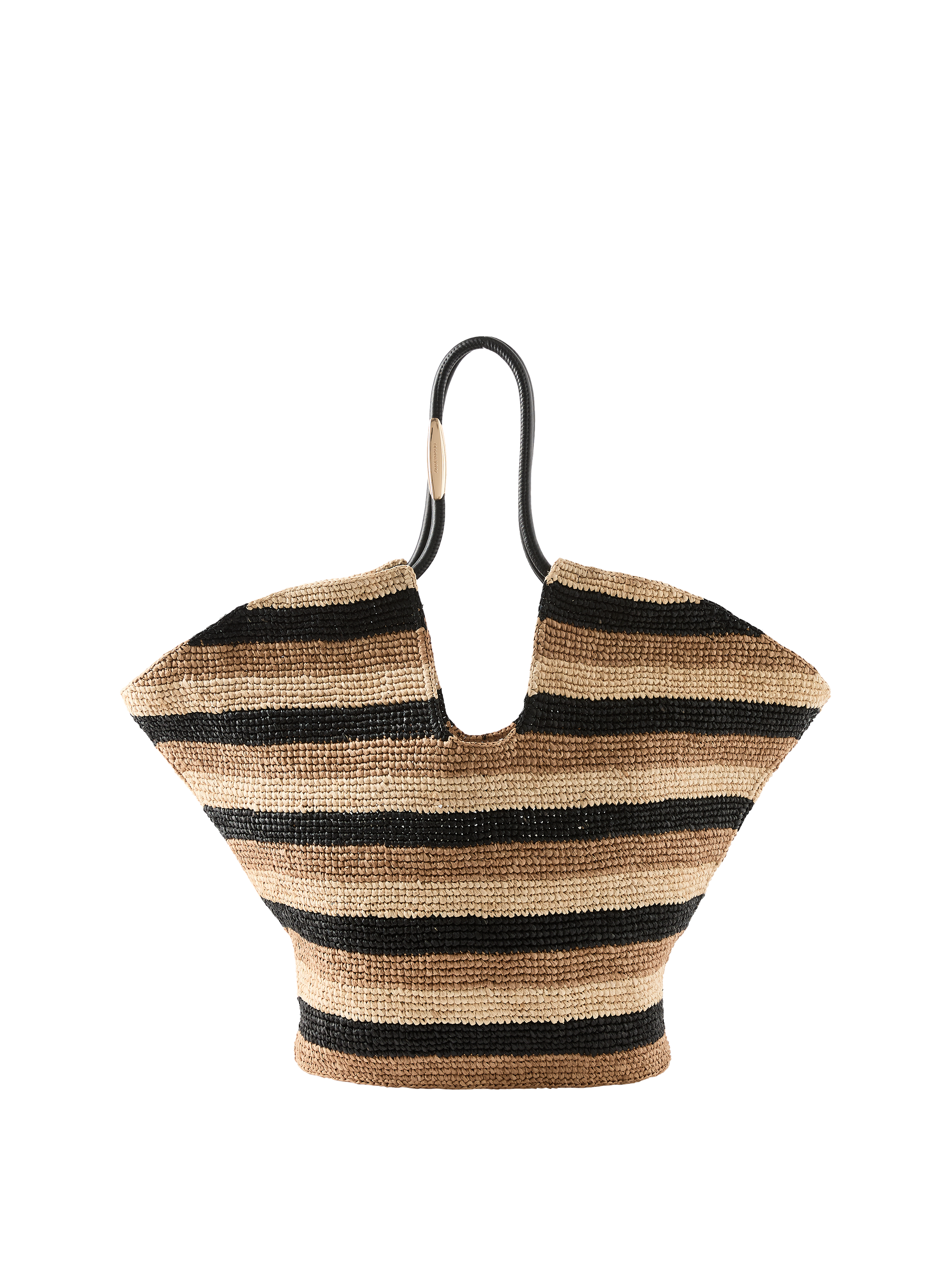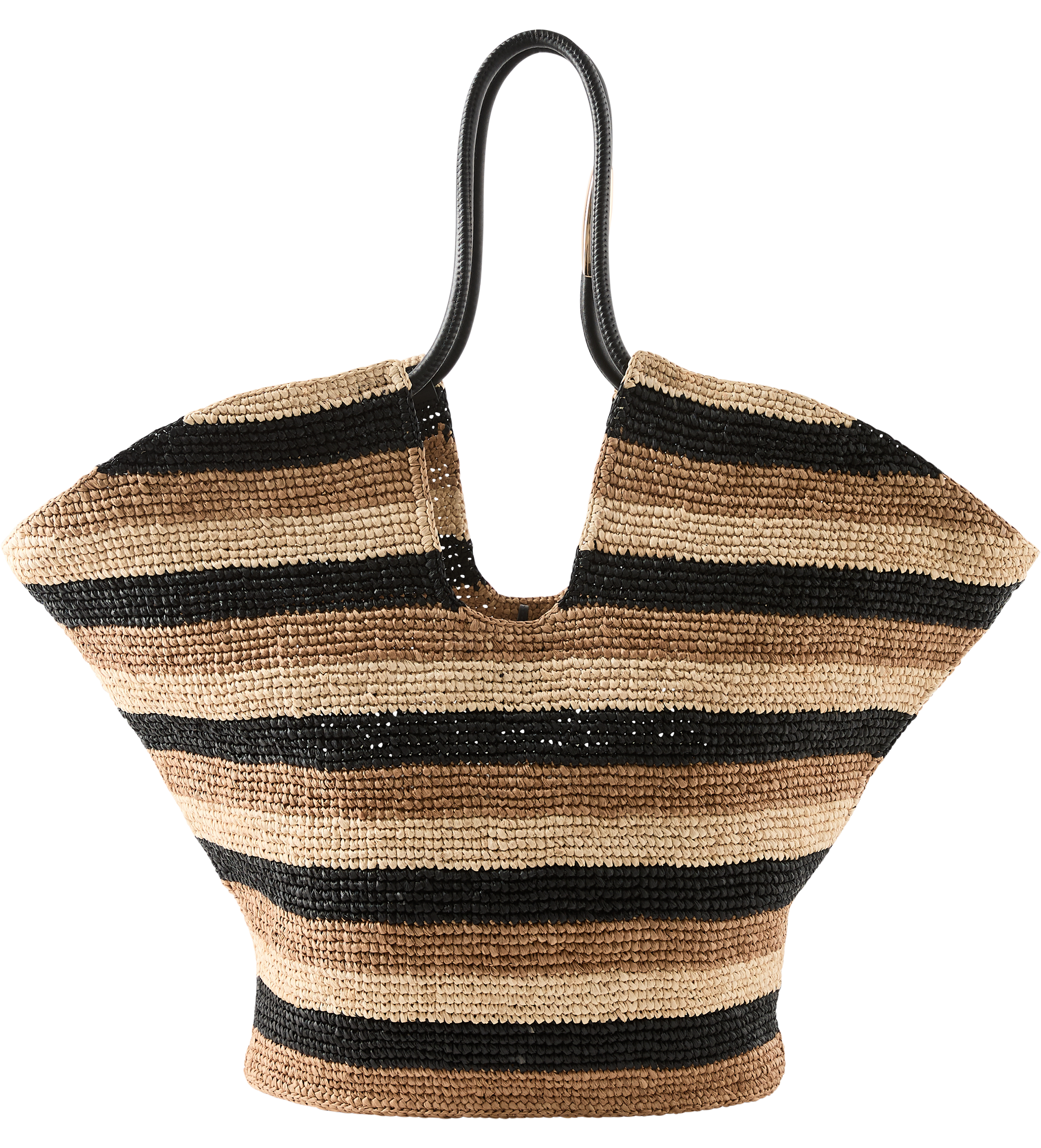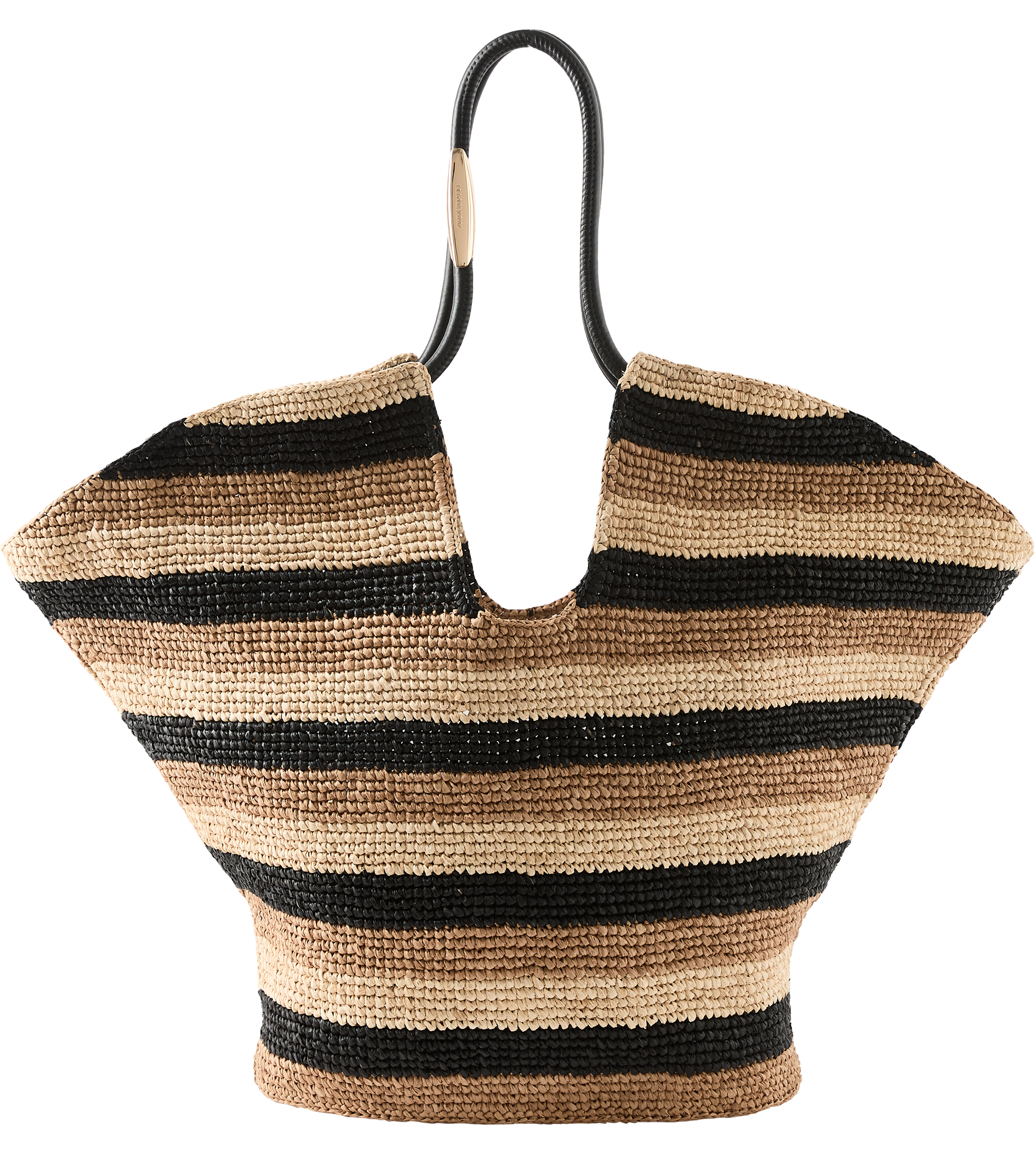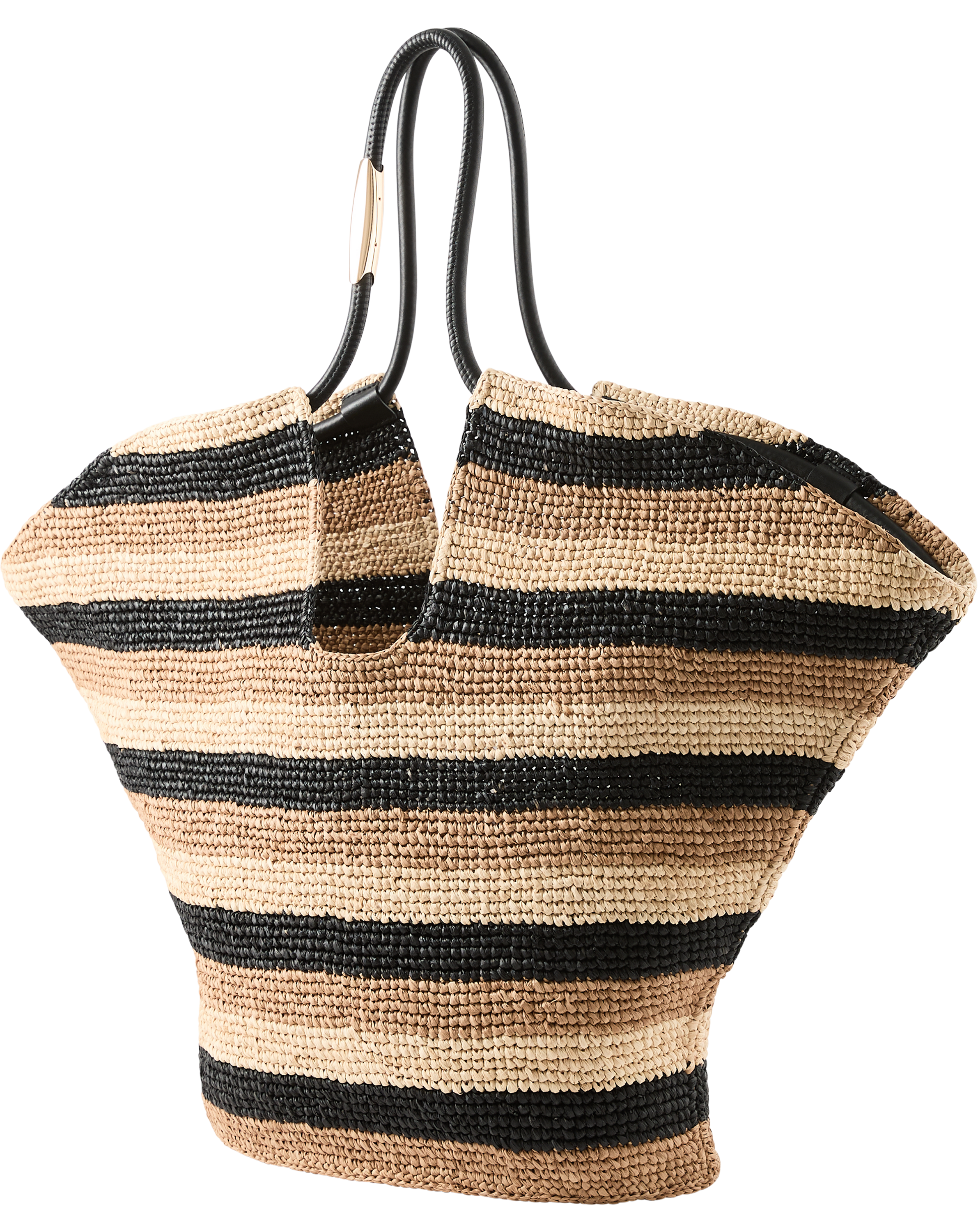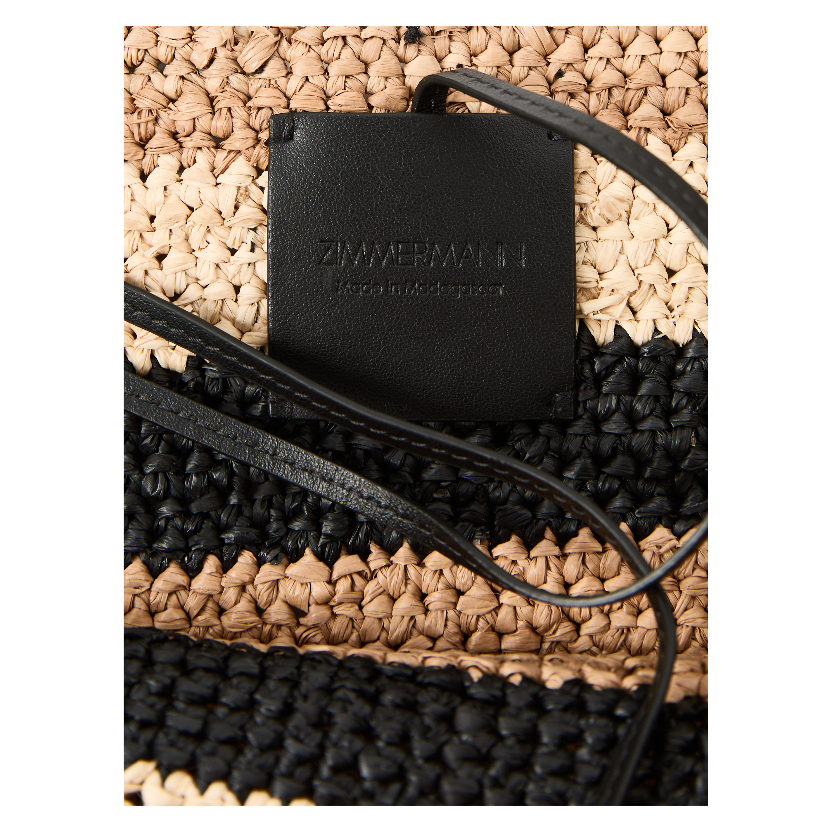 Die Handtasche 'Goldentime Large Tote' von Zimmermann in Beige wurde aus weichem, handgewebtem Bast gefertigt und besticht durch das gehäkelte Streifenmuster. Der Verschluss aus Lederbändern sowie die röhrenförmigen Lederhenkel setzen stilvolle Akzente. Die Tasche kann sowohl als Schulter- als auch als Handtasche getragen werden.