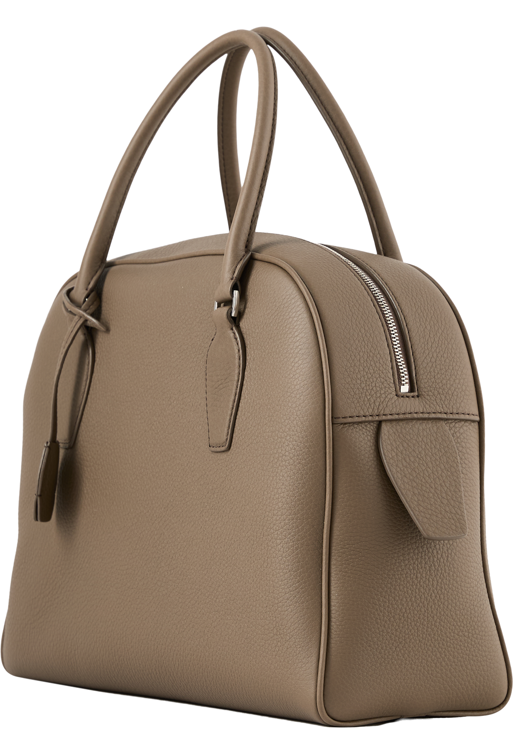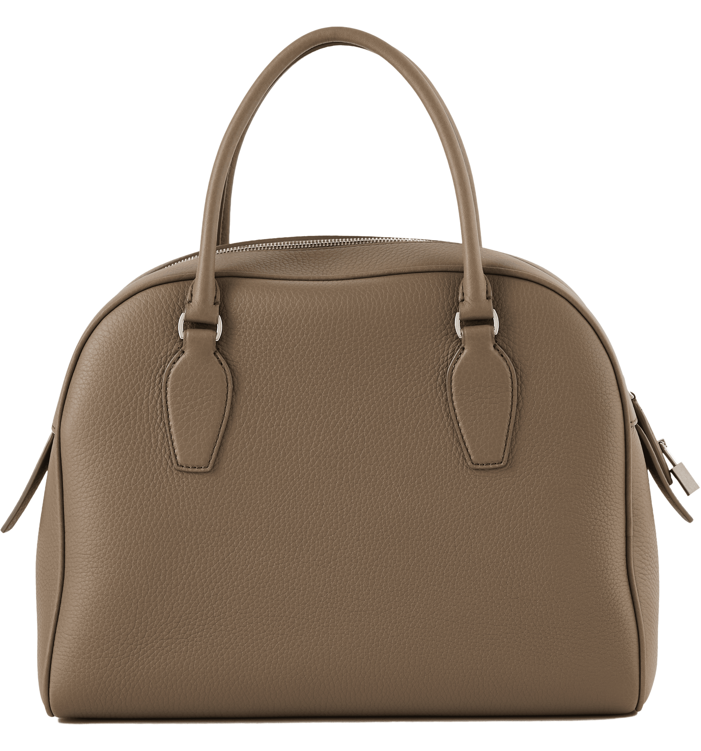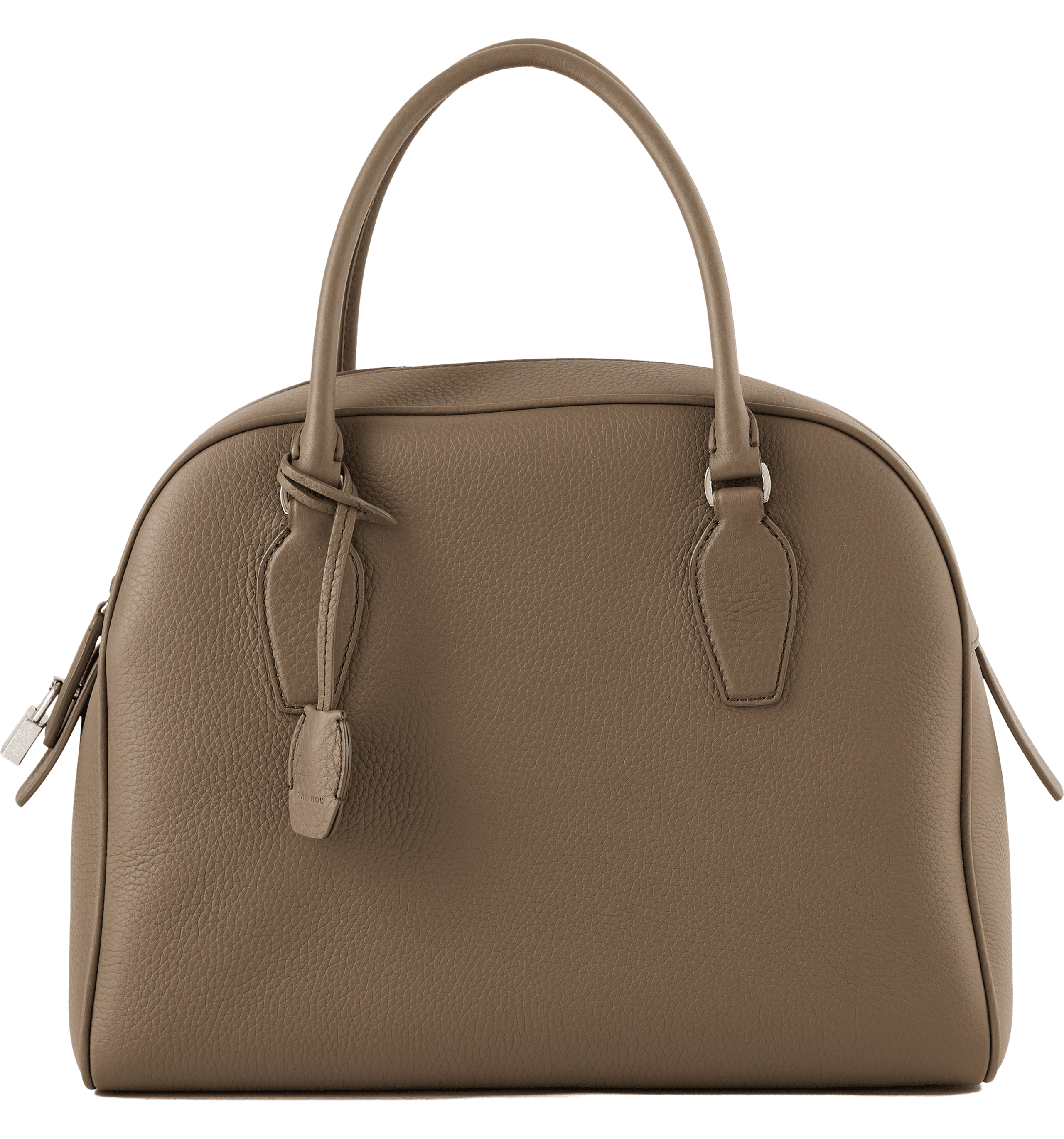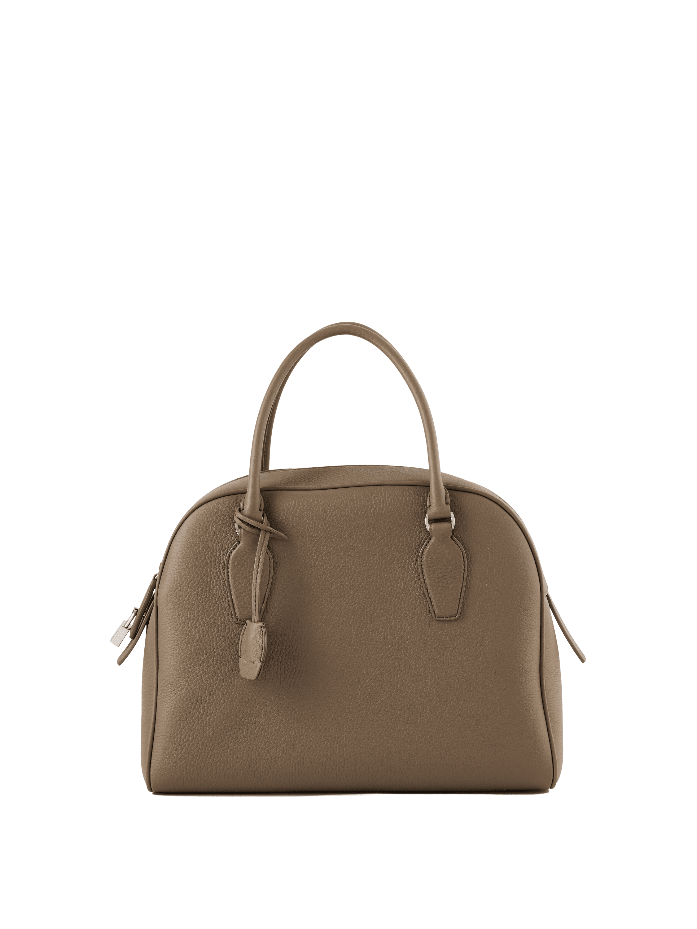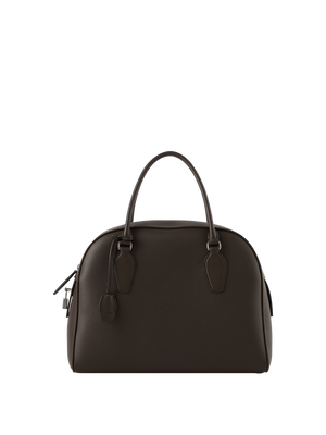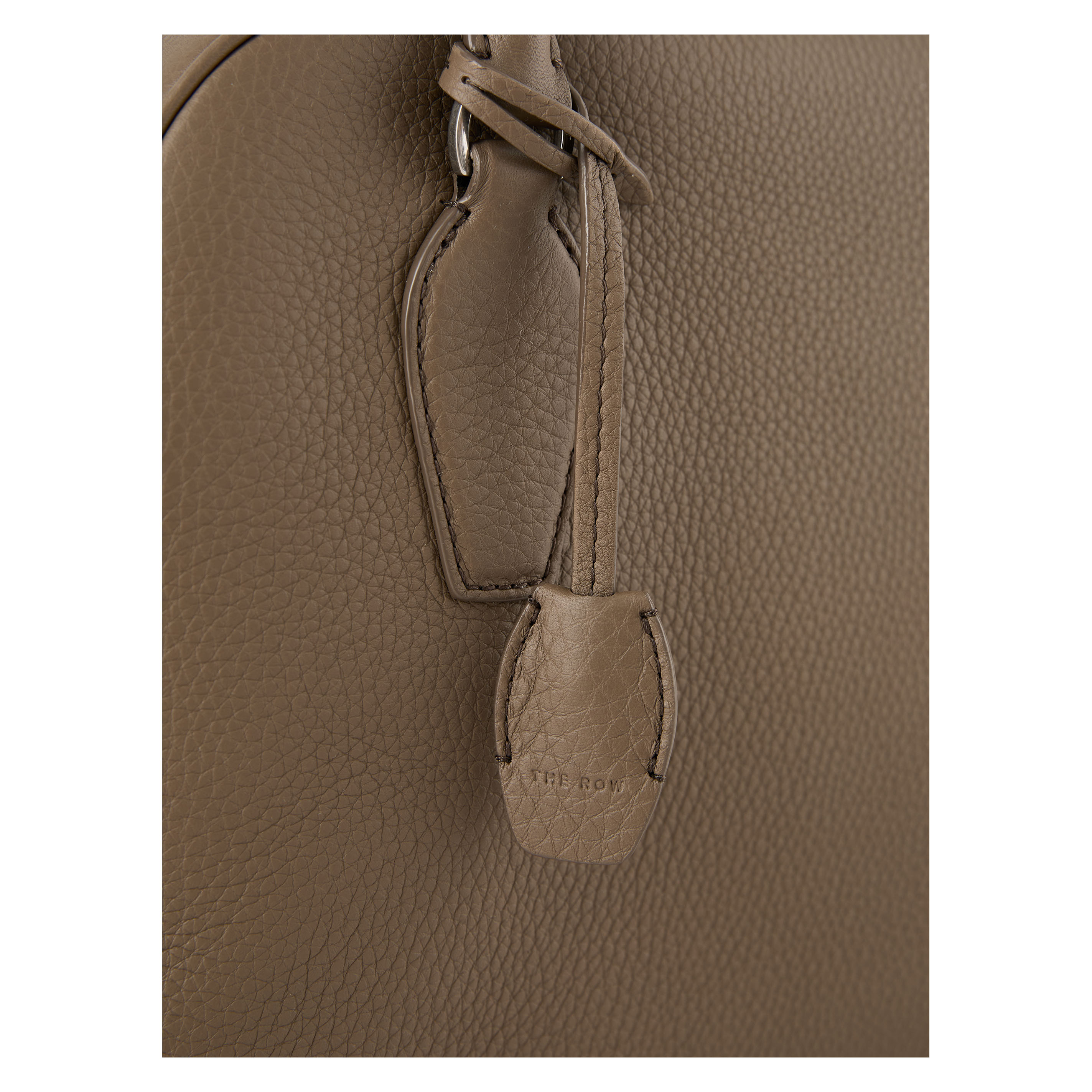 Die Handtasche 'India 12.00' in Rauchgrau von The Row wurde aus genarbtem Kalbsleder gefertigt und besticht durch das Bowlingdesign. Das Modell wird durch die zwei länglichen Tragegriffe, dem seitlichen Vorhängeschloss und die tonalen Absteppungen perfektioniert. Einen harmonischen Schluss schafft das geräumige Innenfach, welches ausreichend Stauraum für alles bietet, was im Alltag benötigt wird.