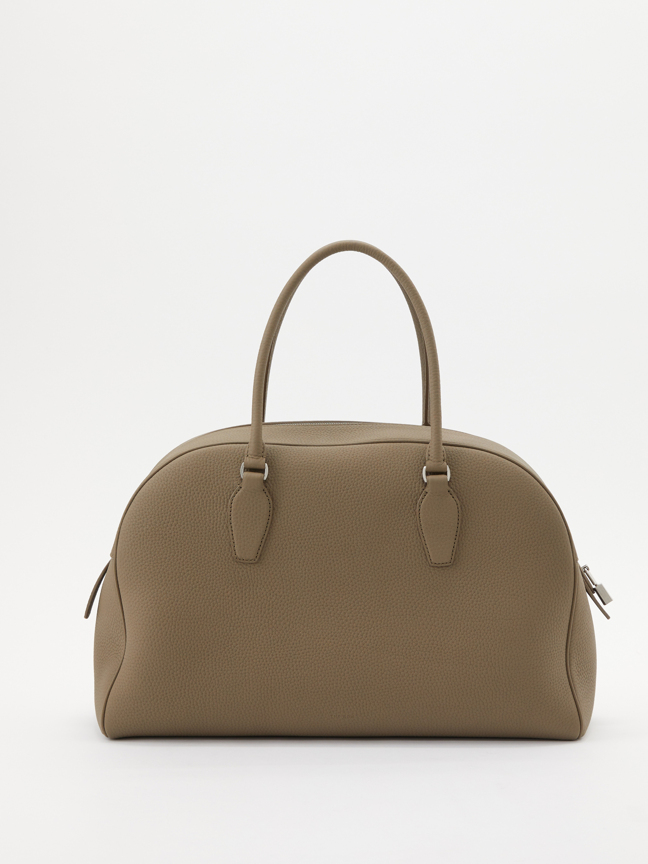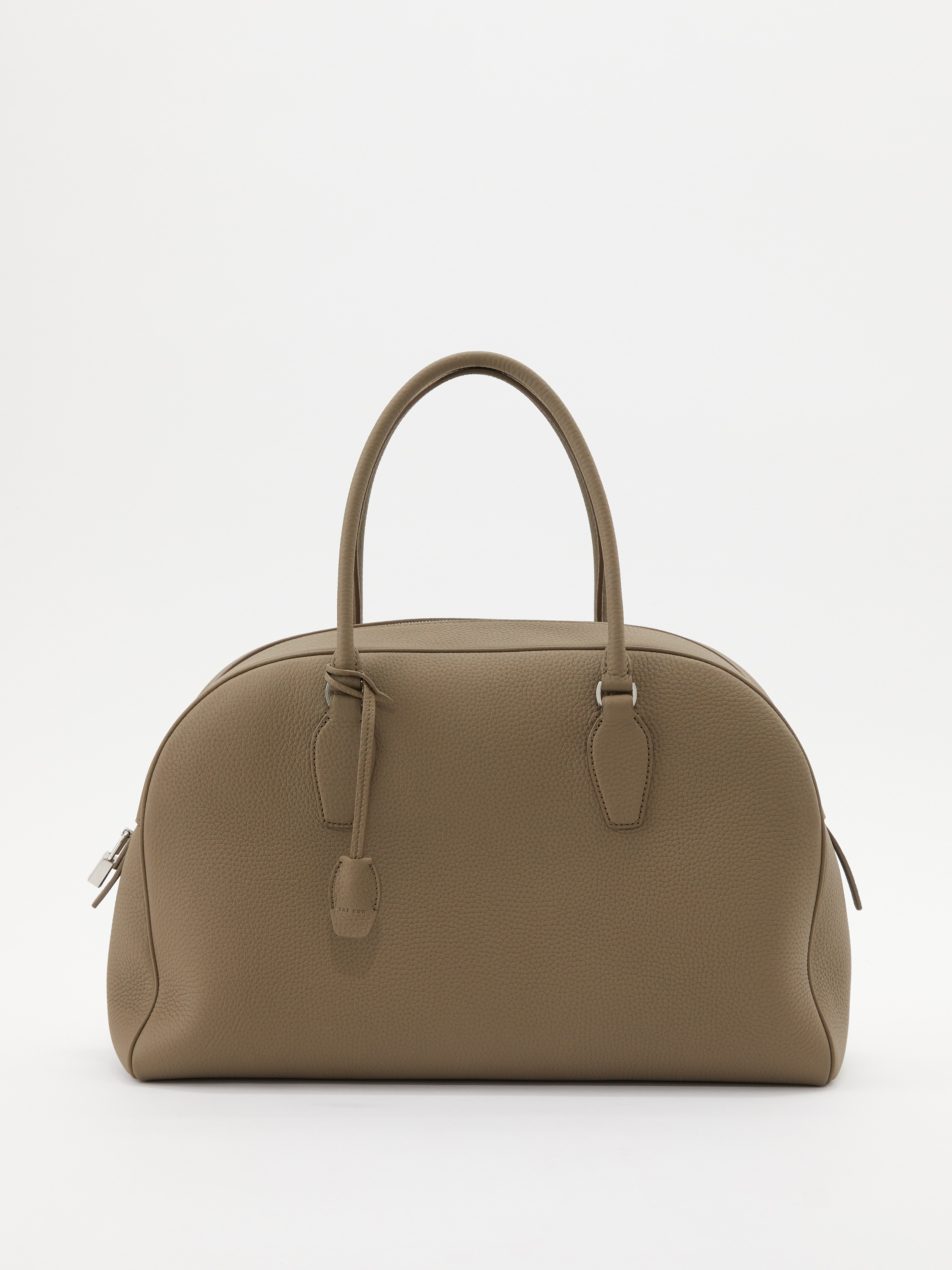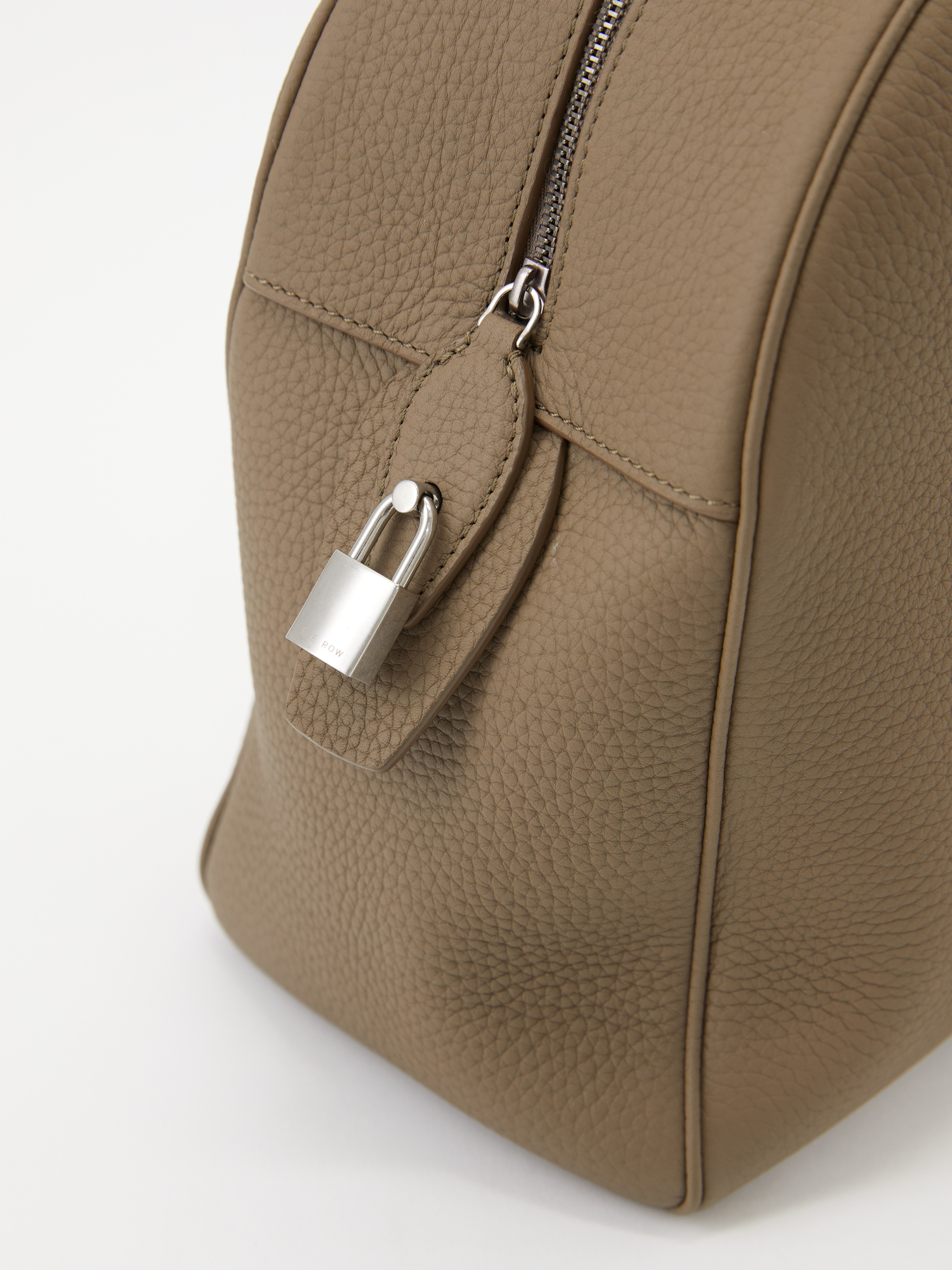 Die Handtasche 'India 15' in Greige von The Row wurde aus genarbtem Leder gefertigt und besticht durch das klassische Design. Der silberfarbene Reißverschluss sowie der Vorhängeschloss vollenden dieses modische Design.
