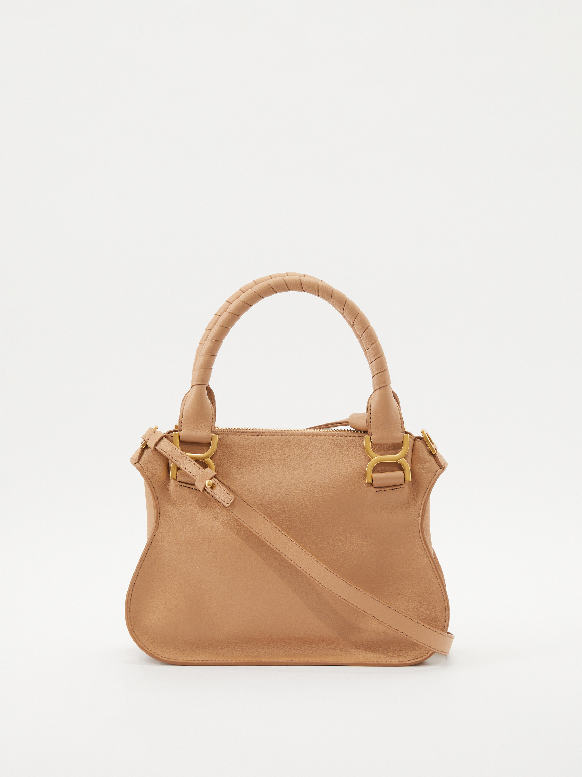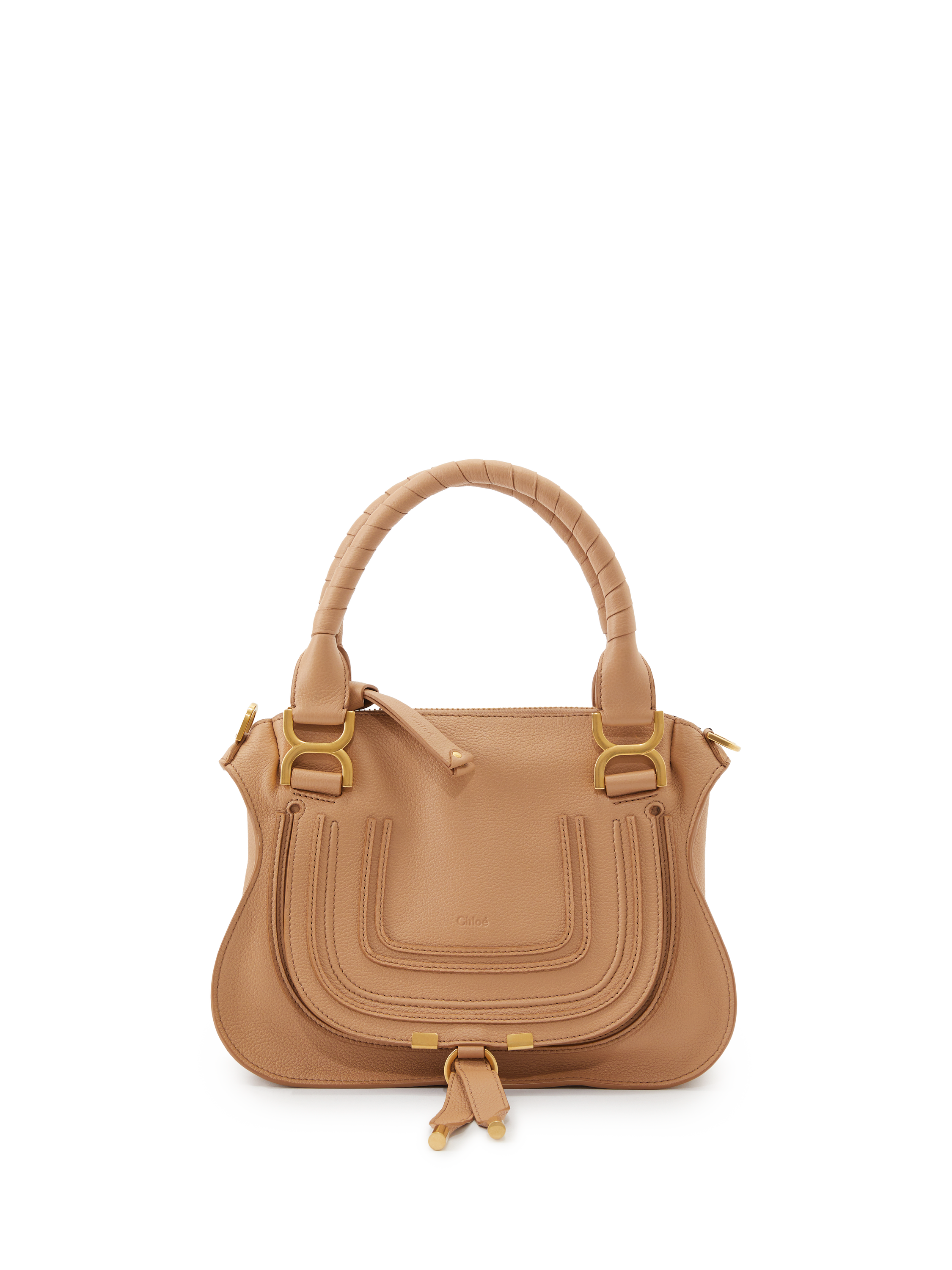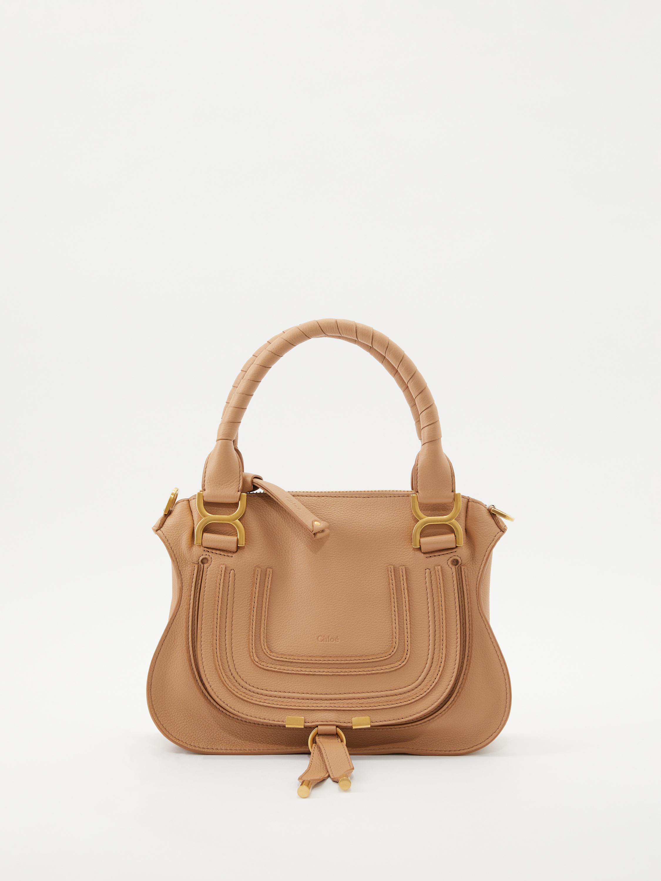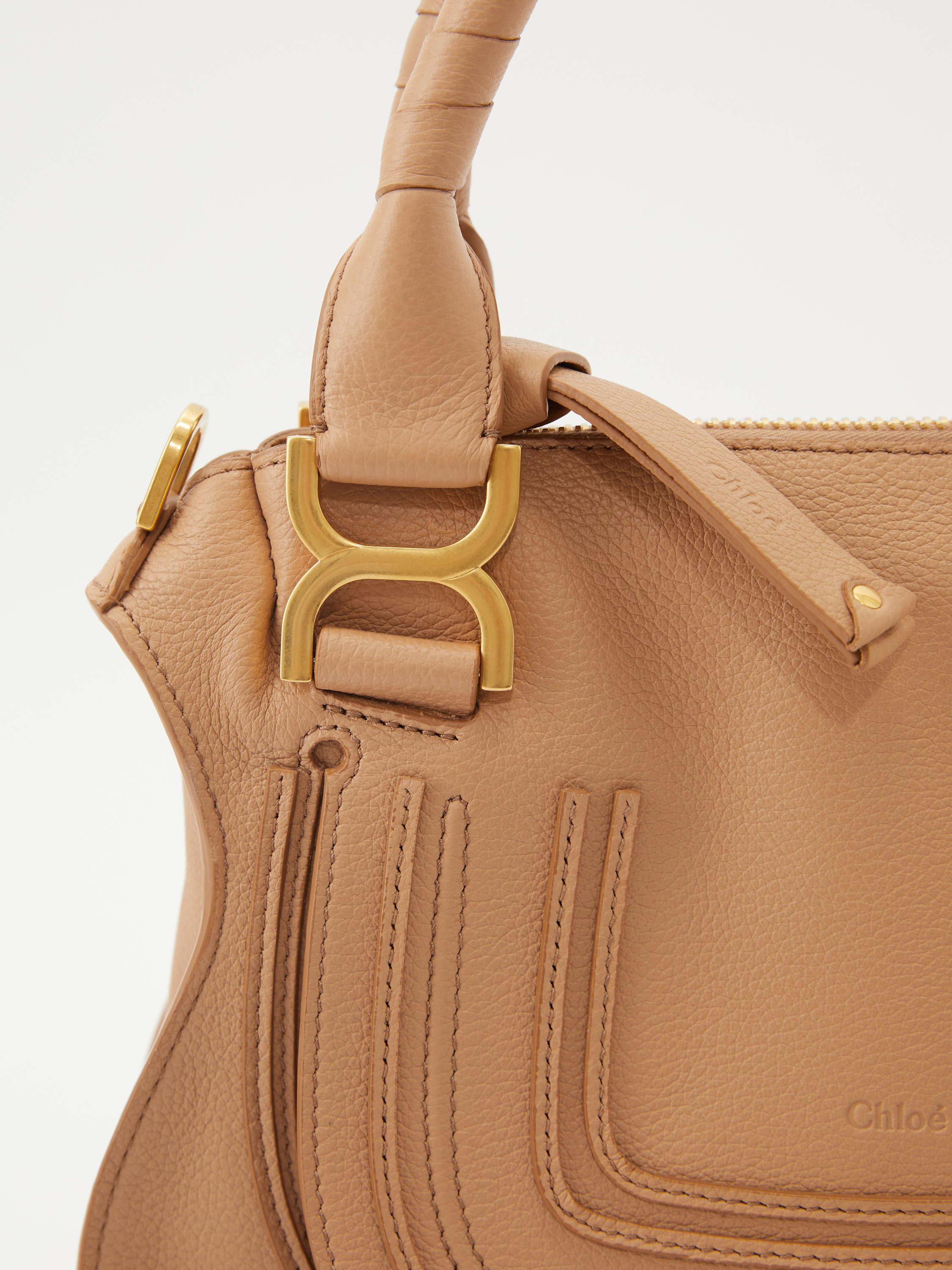 Die Handtasche 'Marcie Small' von Chloé in Light Tan wurde aus genarbten Kalbsleder gefertigt und mit goldener Hardware abgerundet. Der Griff bietet die Tragevariante in der Hand oder über der Schulter. Das geräumige Fach sowie zahlreiche Innenfächer bieten Stauraum für alles, was man im Alltag braucht. Das schlichte Design macht die Tasche zu einem sportlich-eleganten Klassiker.