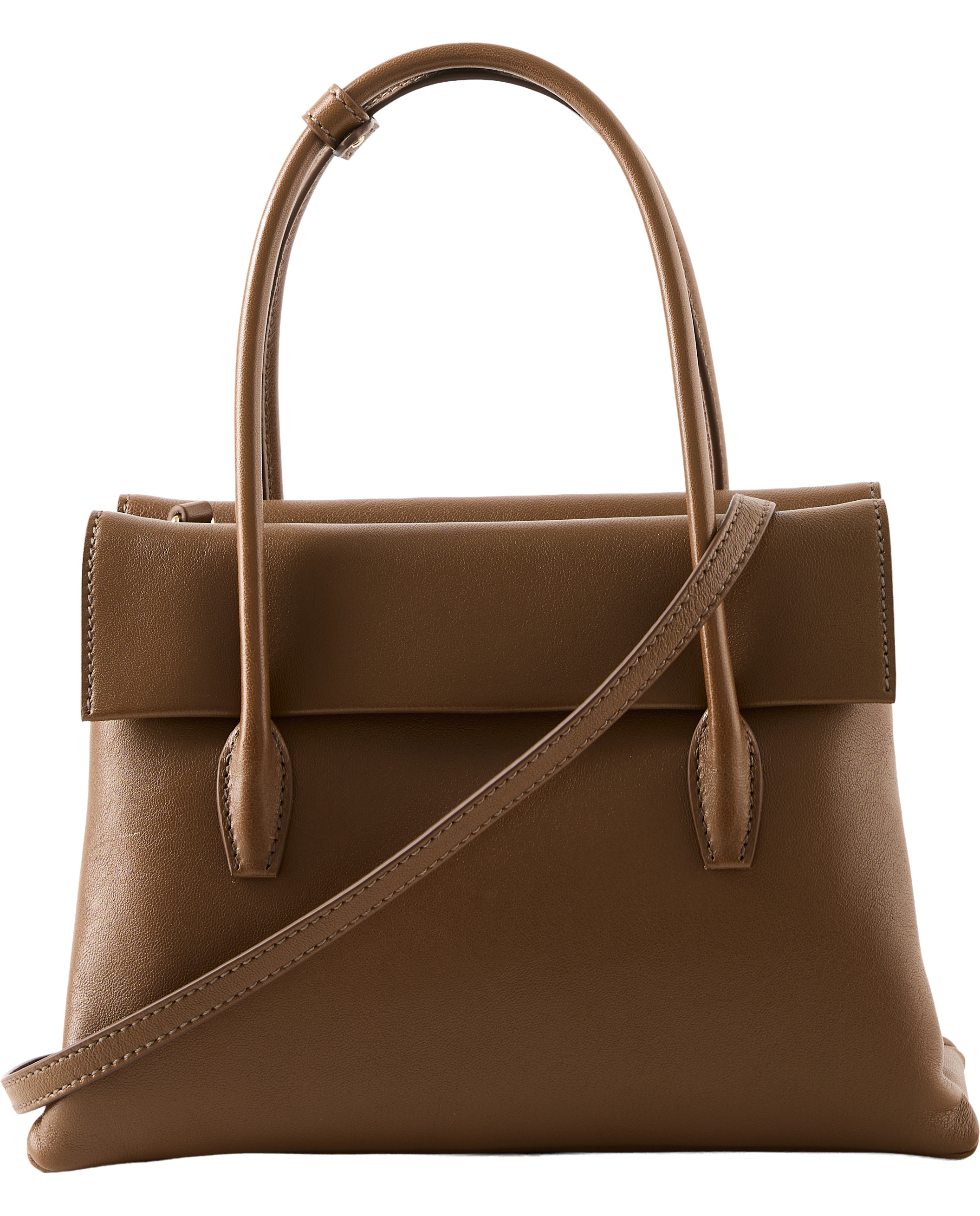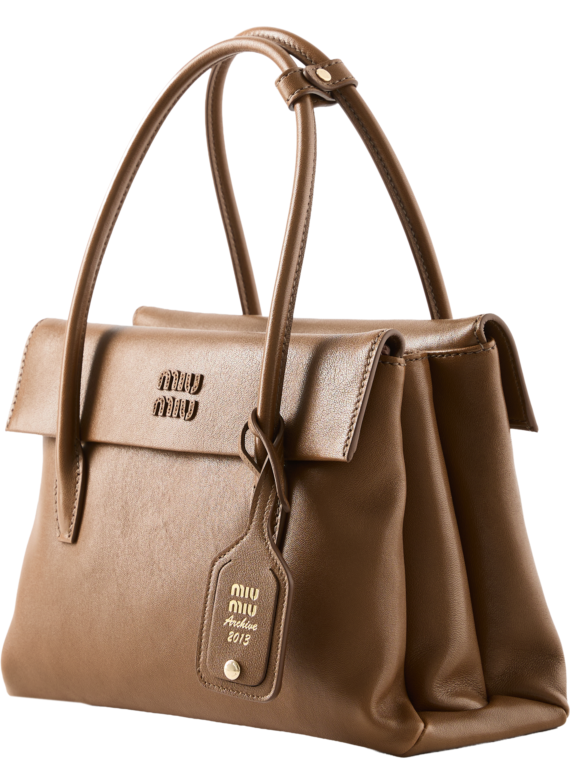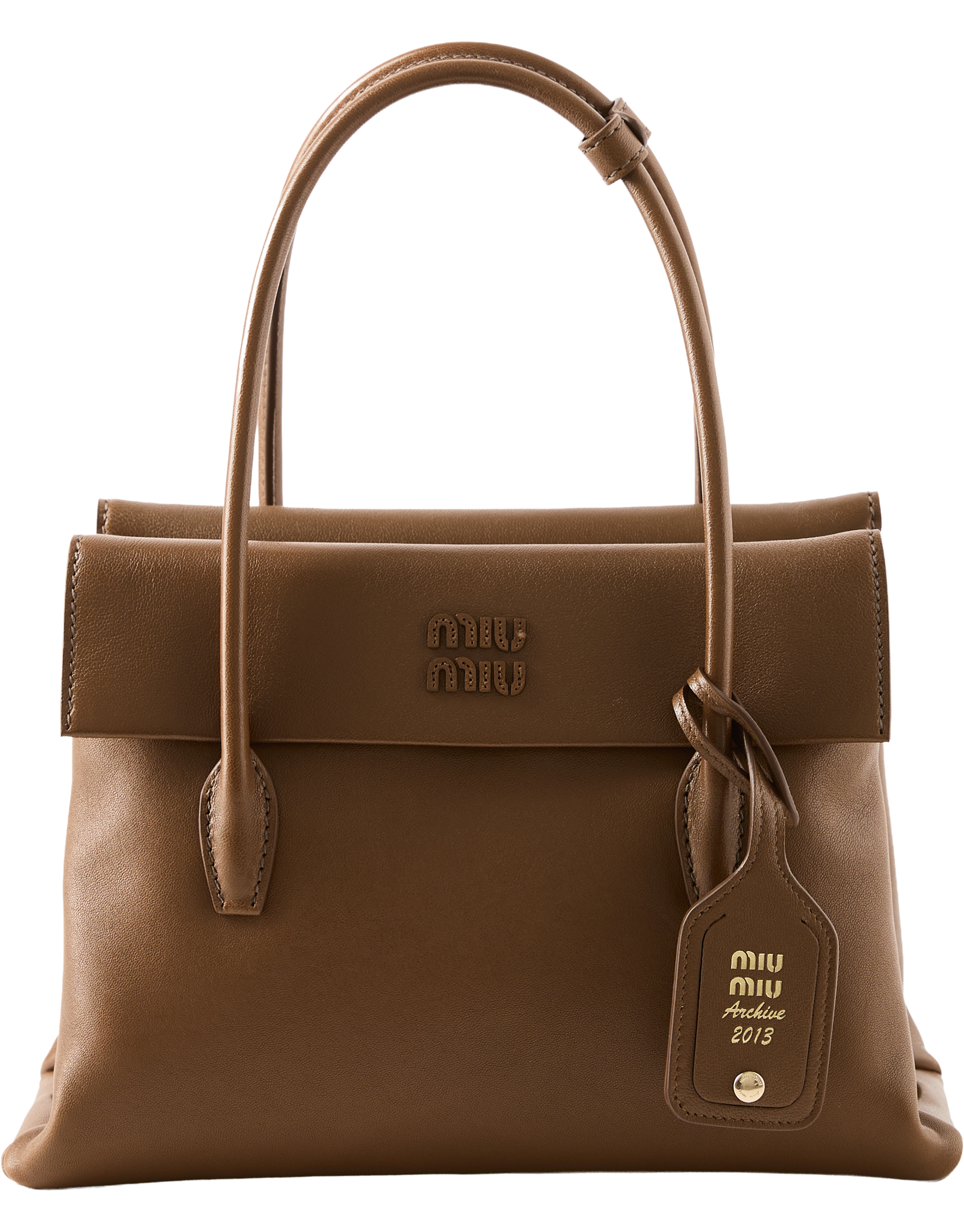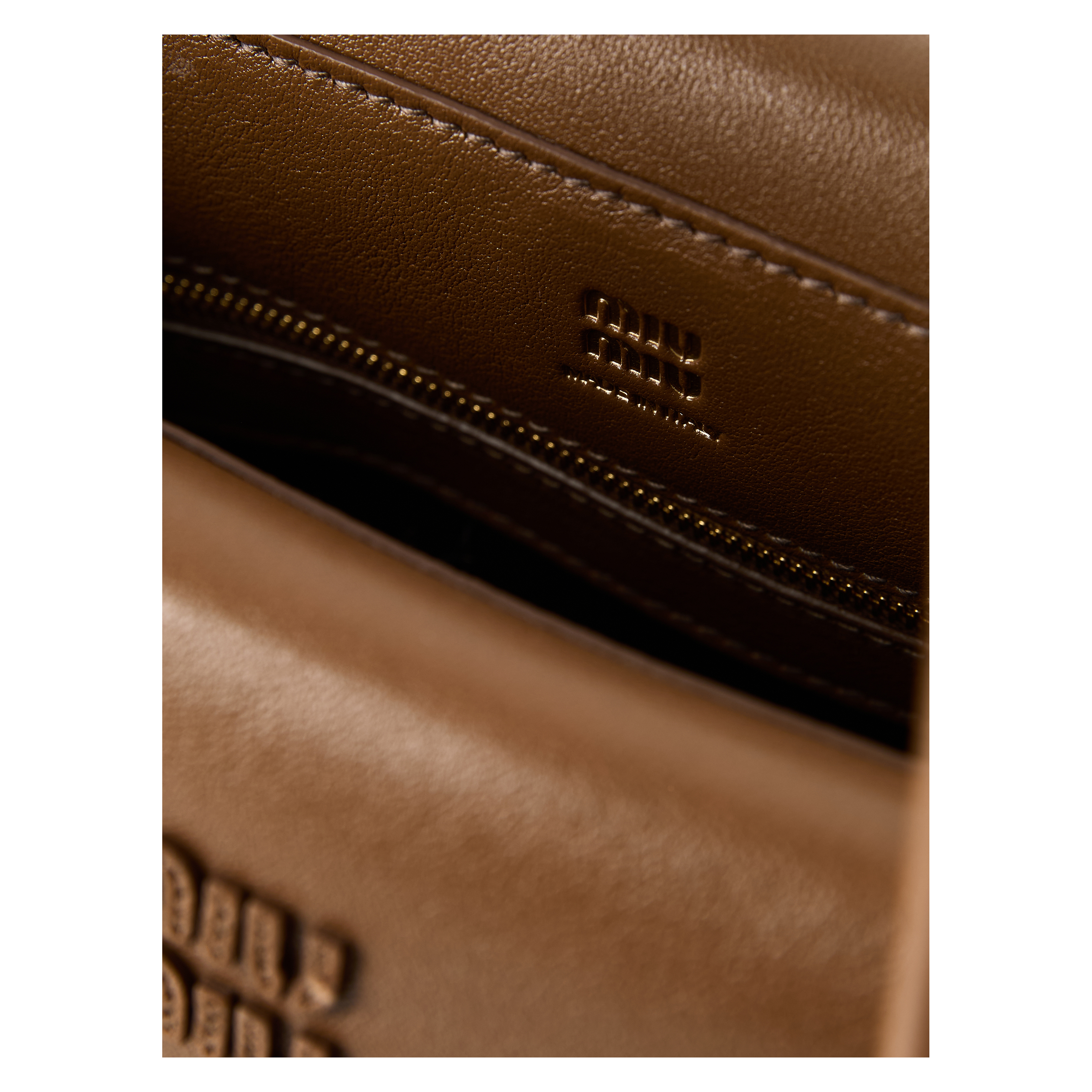 Die Handtasche 'Solitaire' in Braun von miu miu wurde aus leicht glänzendem Nappa-Leder gefertigt und besticht durch klar strukturierte Linien mit zeitloser Eleganz. Ein Logo-Schriftzug aus Leder auf der Klappe setzt einen dezenten Markenakzent. Der abnehmbare Lederanhänger, das Innenfutter aus Baumwollsatin mit Reißverschlusstasche und aufgesetzter Tasche ergänzen das Design funktional. Der verstellbare Ledergriffe sowie ein abnehmbarer Schulterriemen sorgen für flexible Tragemöglichkeiten und runden das Modell stilvoll ab.