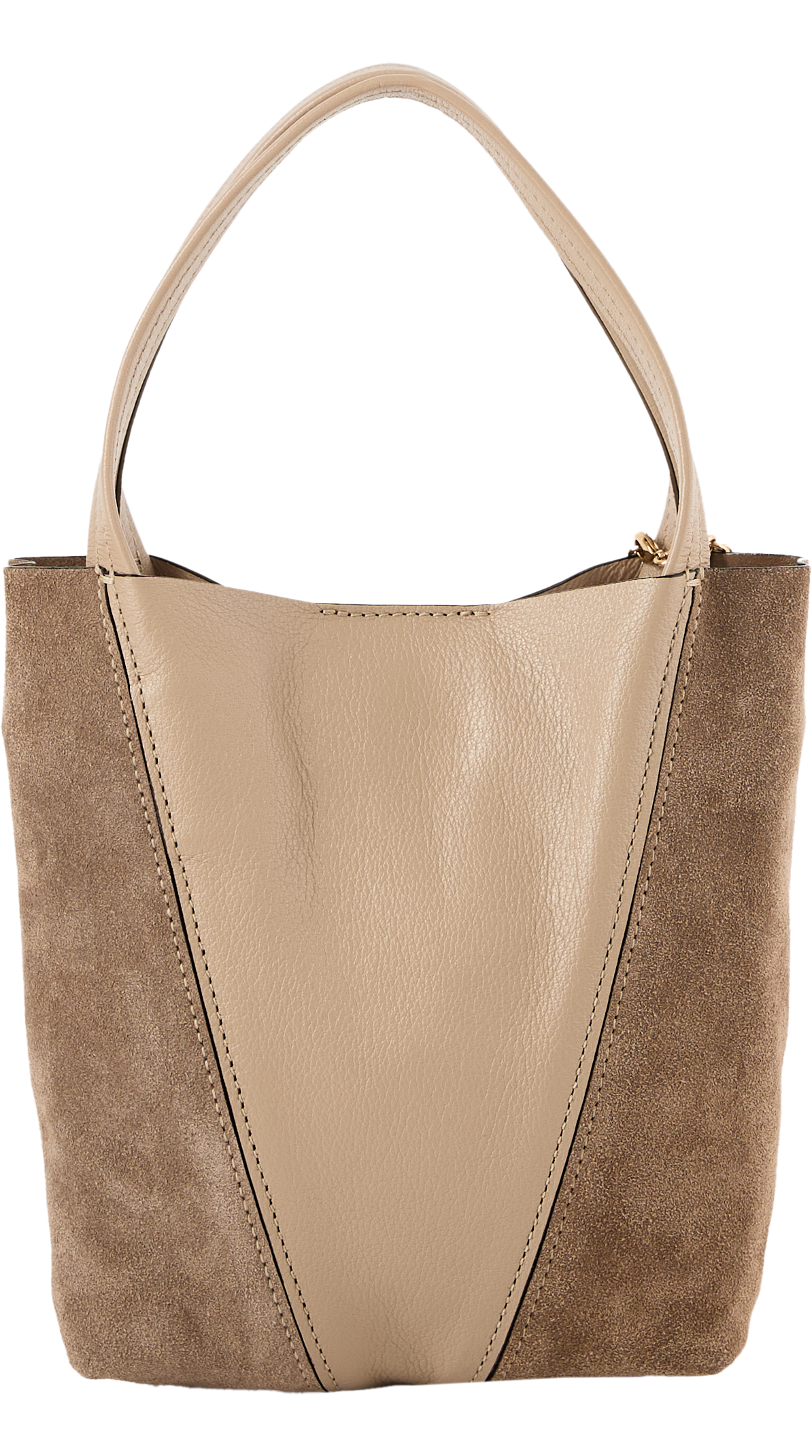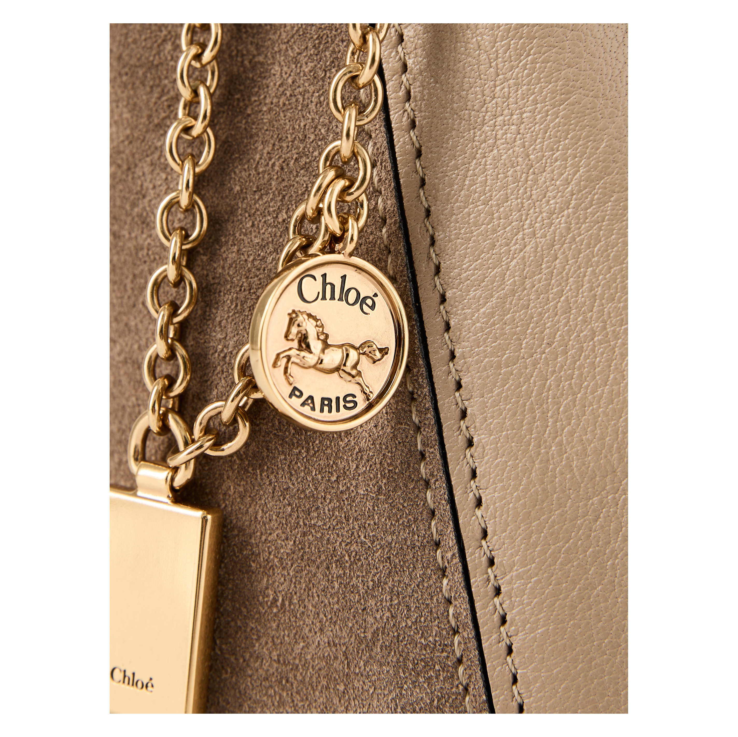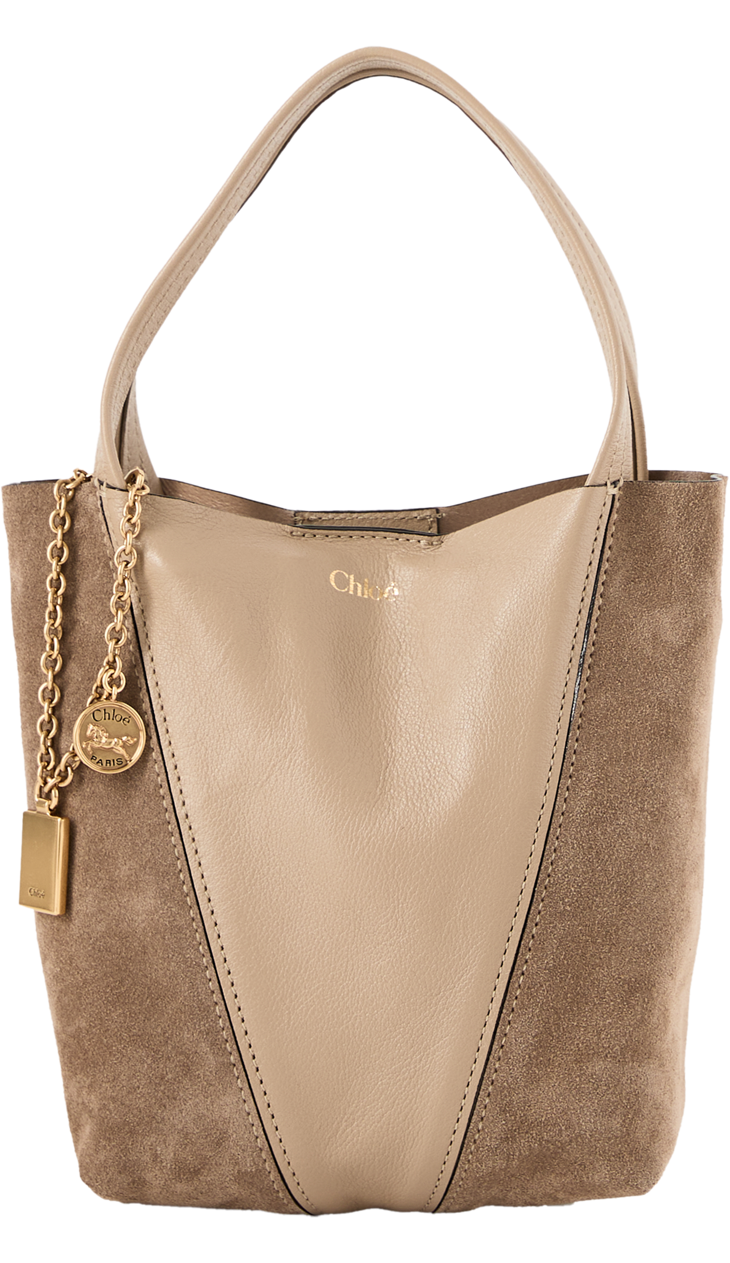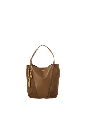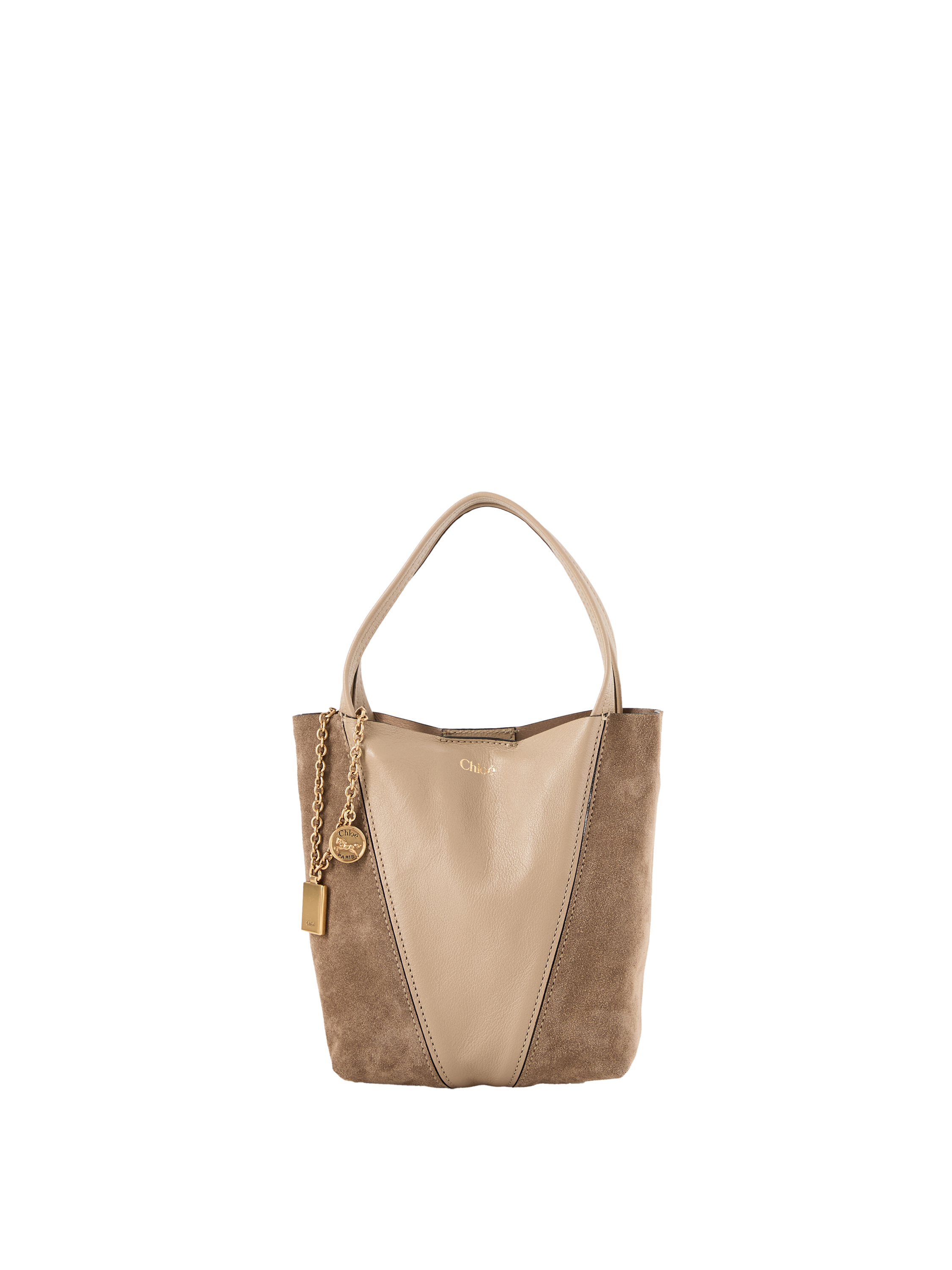 Die Handtasche 'Spin Tote' in Boyish Brown von Chloé wurde aus genarbtem Büffelleder und Kalbswildleder gefertigt und besticht durch die minimalistische Silhouette mit grafischen Linien. Die goldfarbene Hardware und die charakteristischen Chloé- und Horse Medals verleihen dem Modell seine klassische Eleganz. Tragen Sie die Tasche über der Schulter, diagonal über dem Körper oder schieben Sie die Griffe durch den Ring, um sie in der Hand oder am Handgelenk zu tragen.