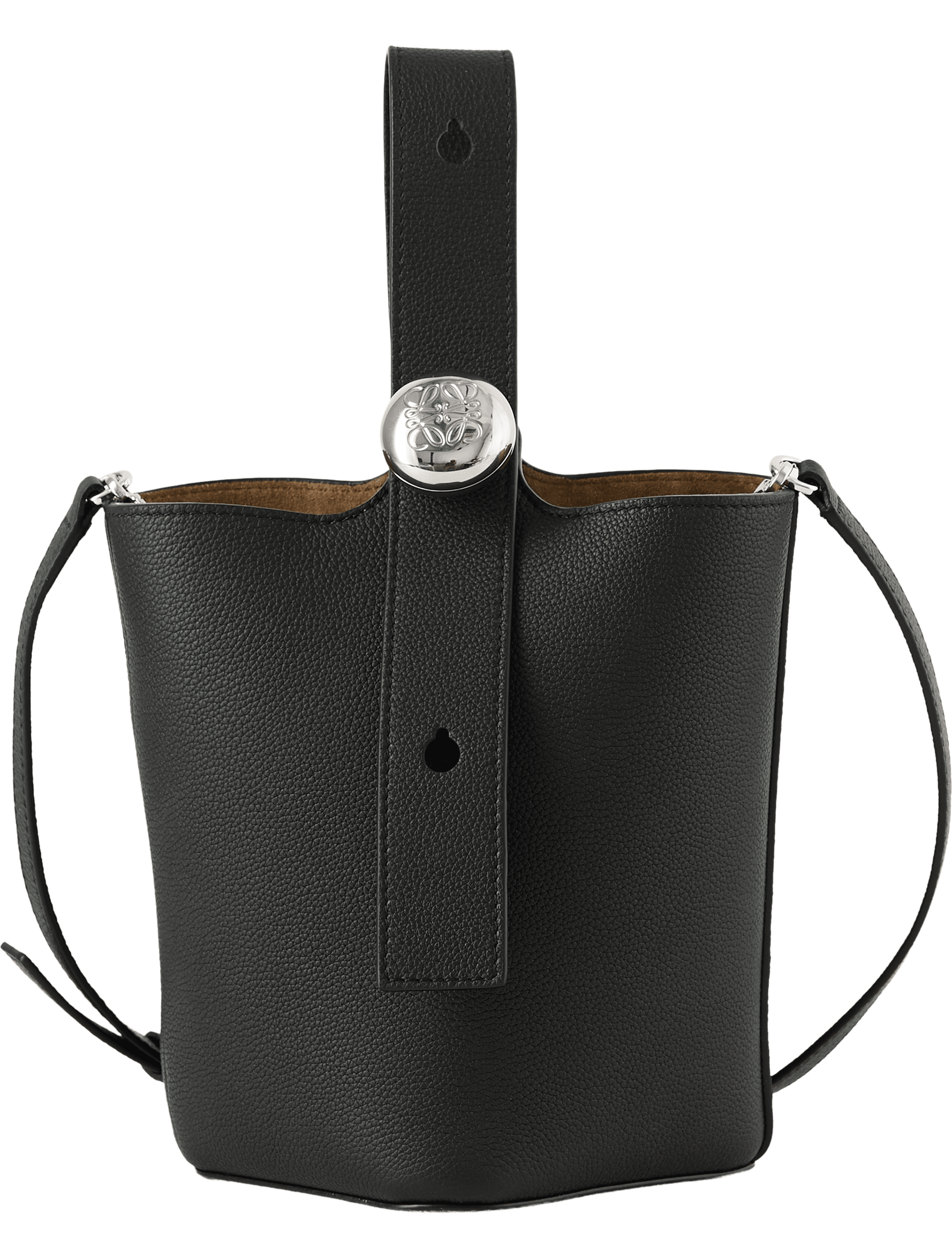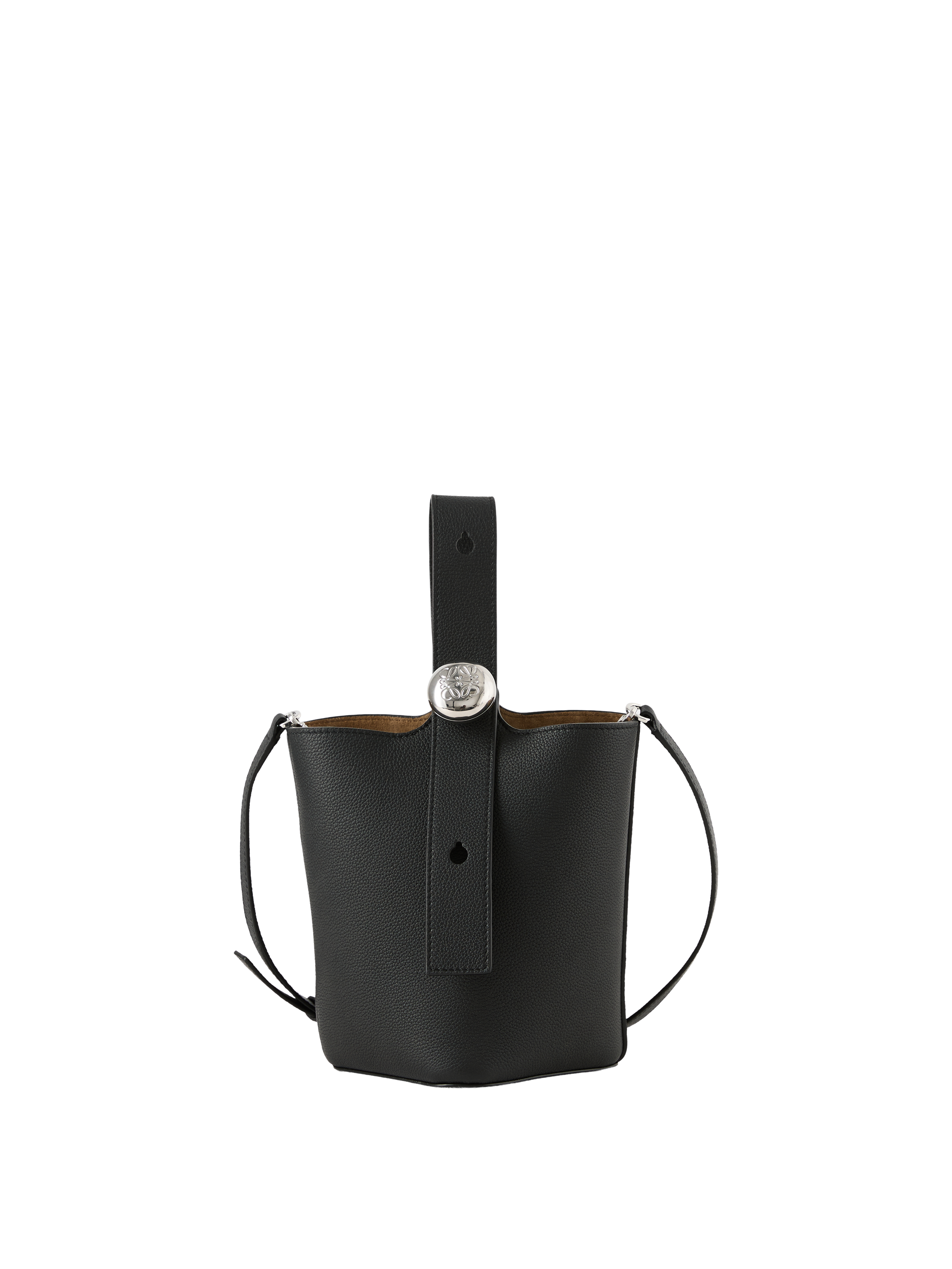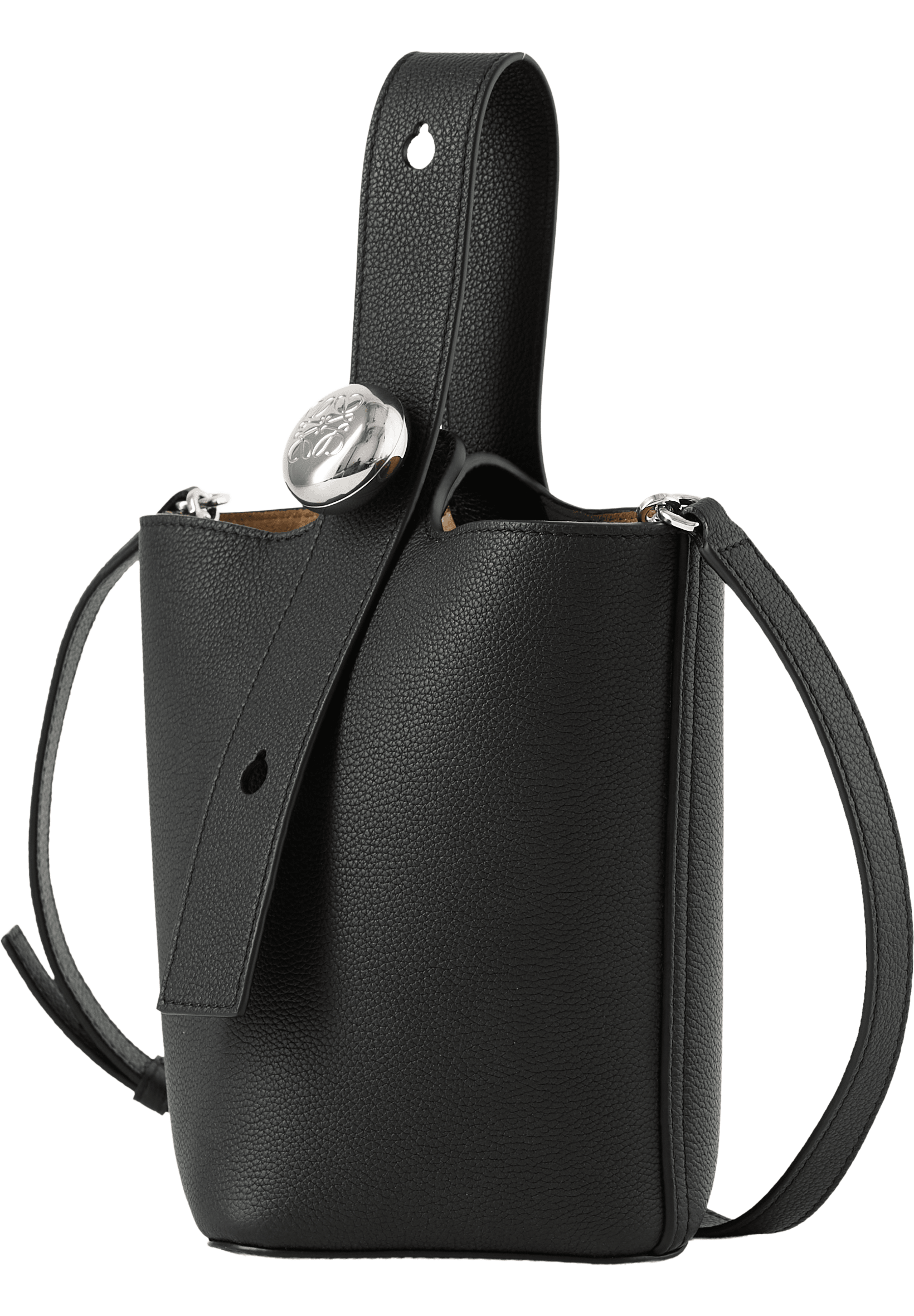 Die Handtasche 'Pebble Bucket Mini' in Schwarz von LOEWE wurde aus glattem Kalbsleder gefertigt und besticht durch einen verstellbaren, übergroßen Pebble-Verschluss. Ein dezenter Magnetverschluss, ein Innenfach mit Wildlederfutter sowie das gravierte Anagramm runden das Design ab. Die Tasche kann wahlweise als Umhängetasche über der Schulter oder in der Hand getragen werden.