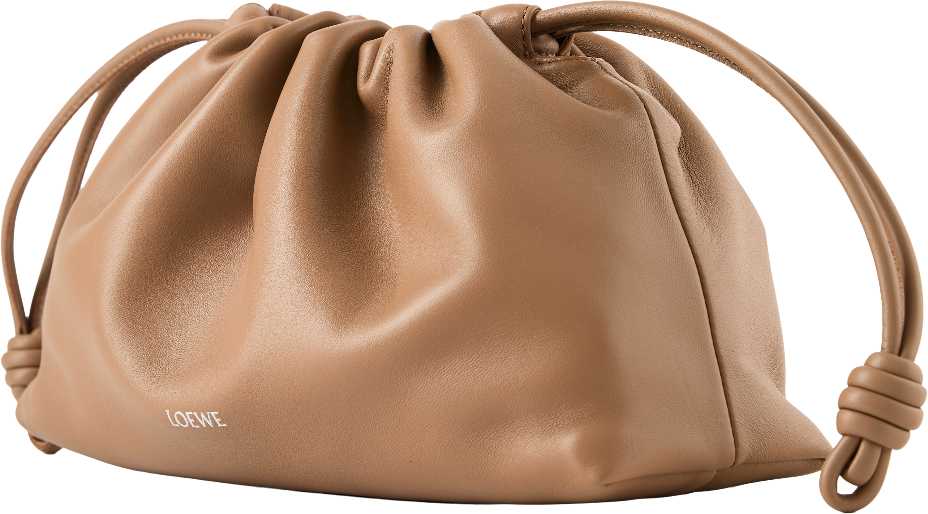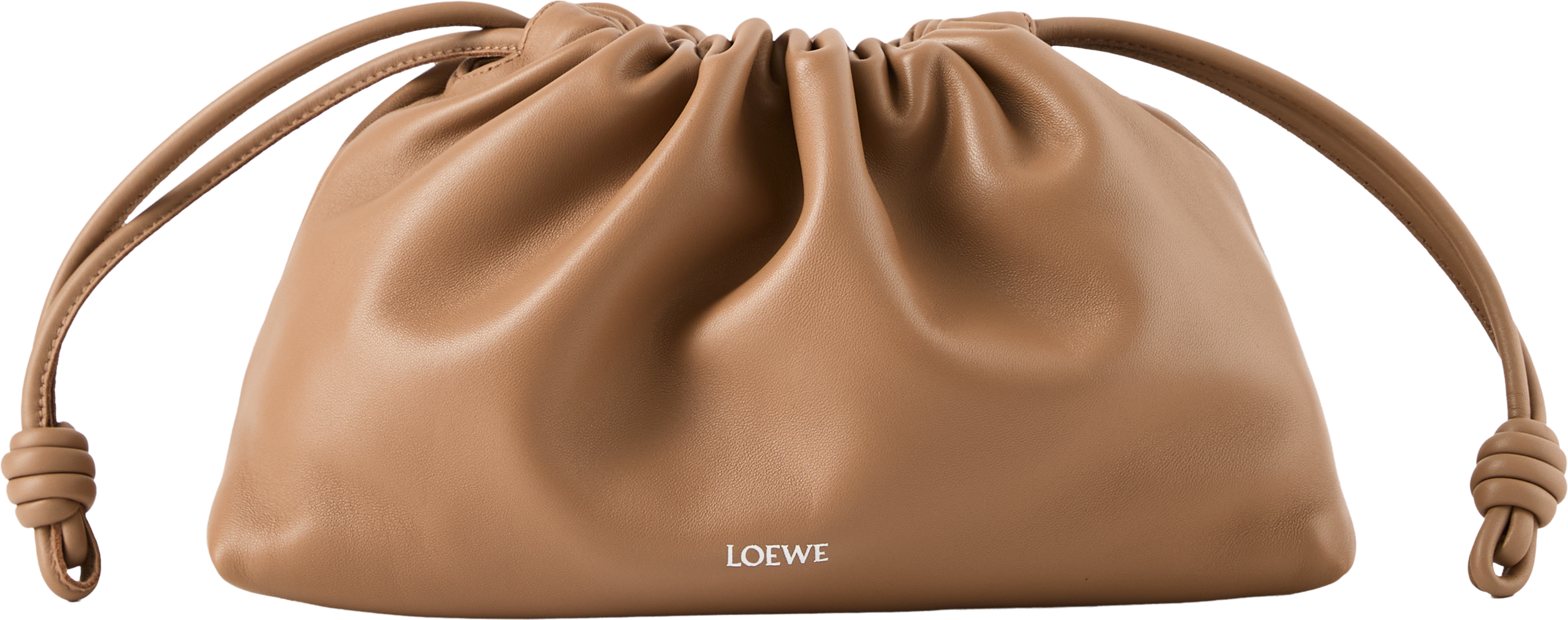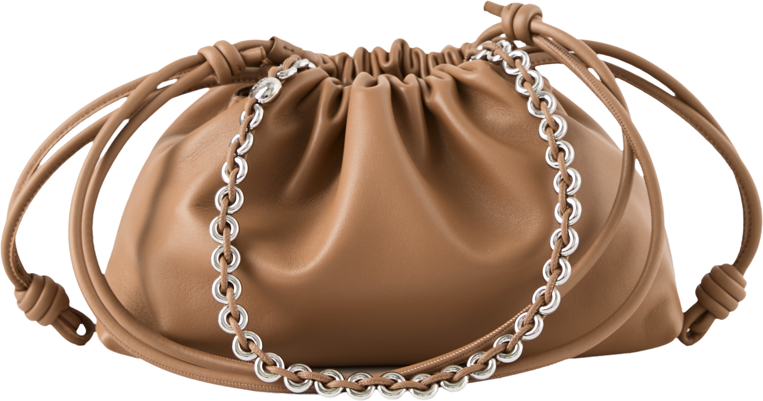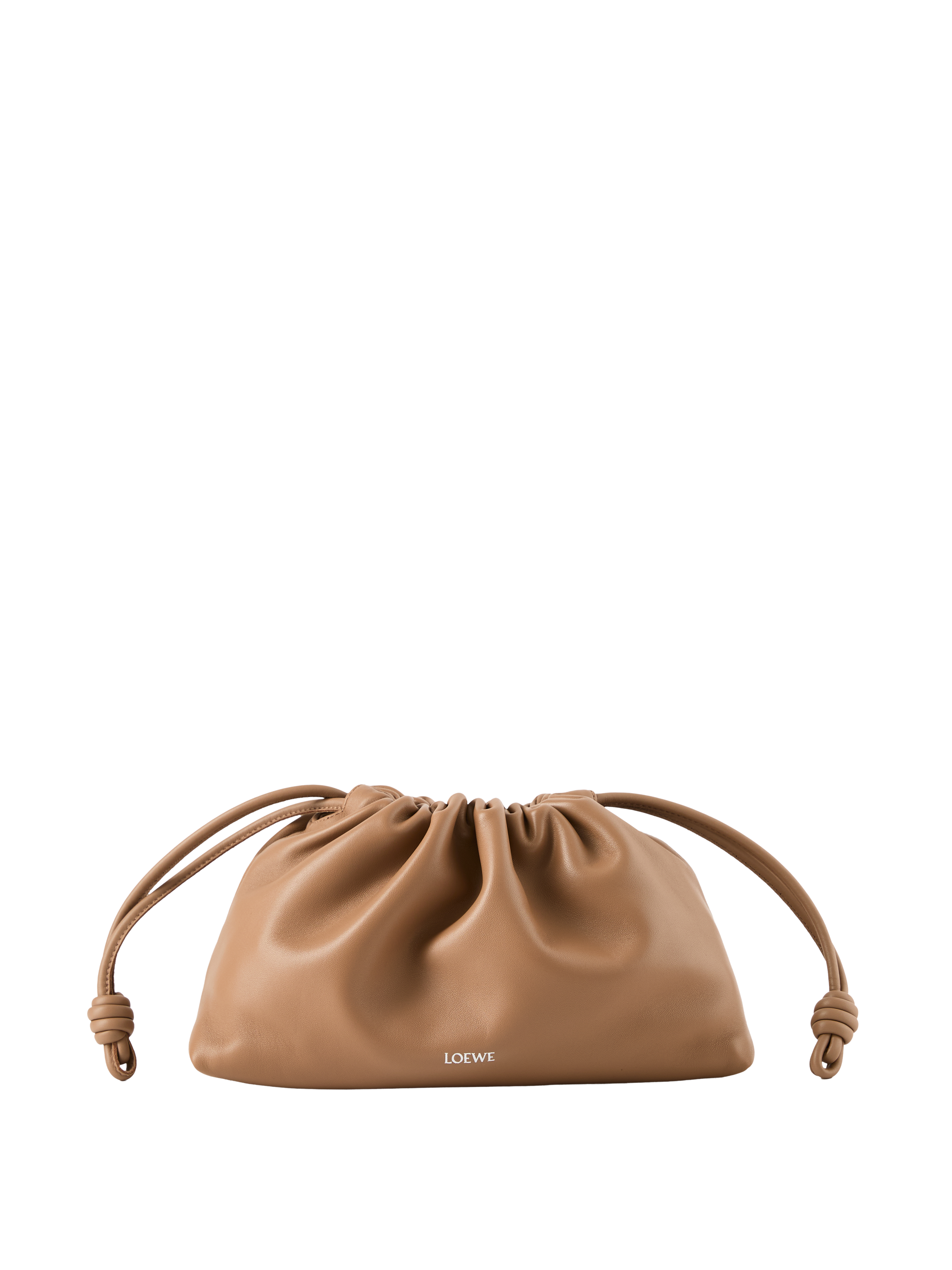 Die Clutch 'Flamenco Medium' in Mocha von LOEWE wurde aus weichem Nappa-Lammleder gefertigt und besticht durch den Tunnelzug mit dem charakteristischen Knoten. Das geräumige Innenfach und das geschmeidige Material zeichnen das Modell aus. Die Clutch kann mit der Donut-Kette über der Schulter oder mit dem dazugehörigen Lederriemen als Umhängetasche getragen werden.