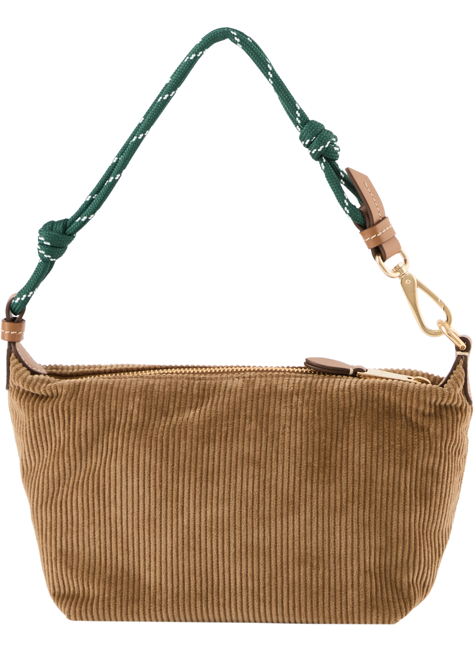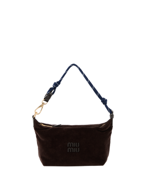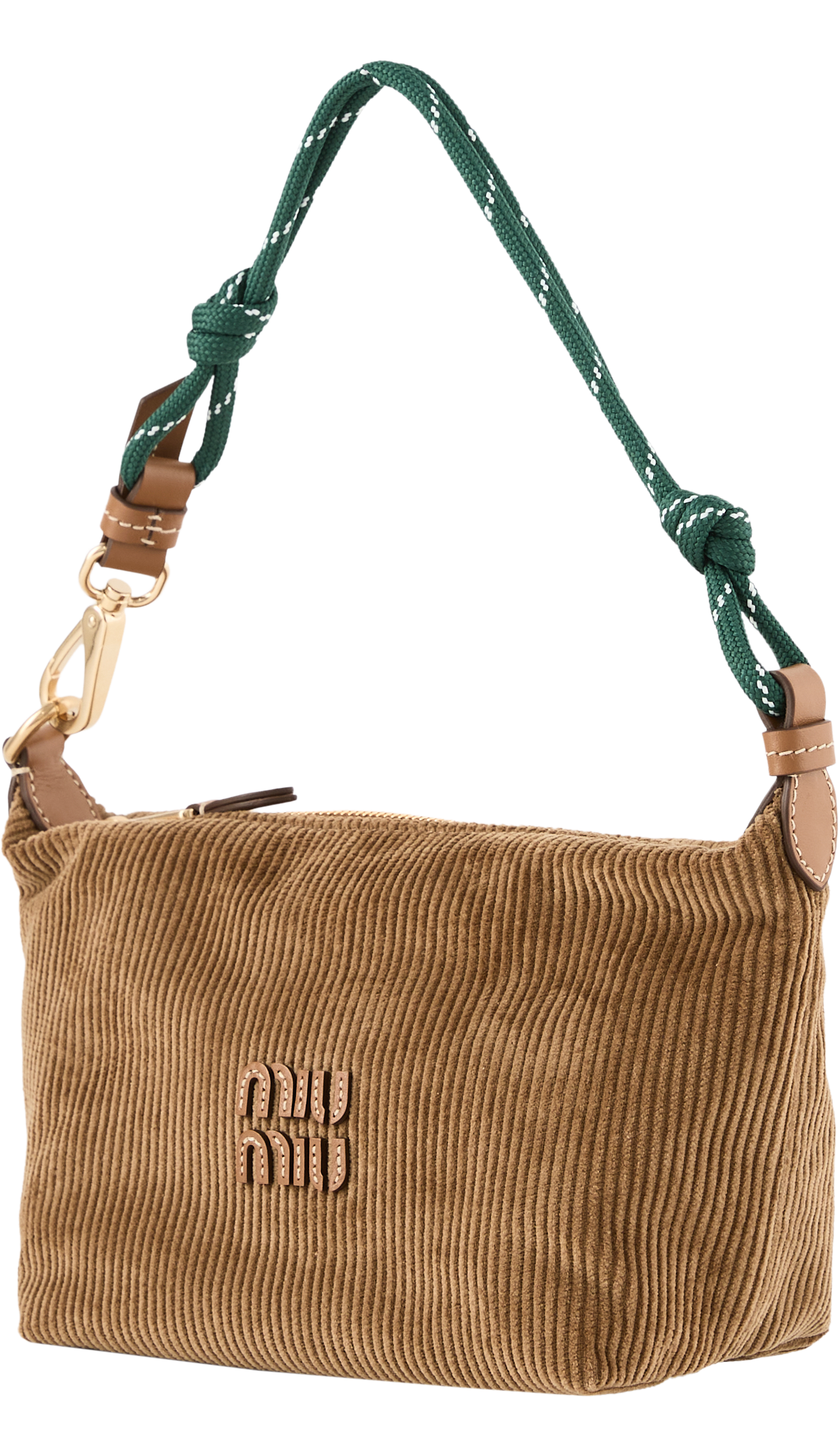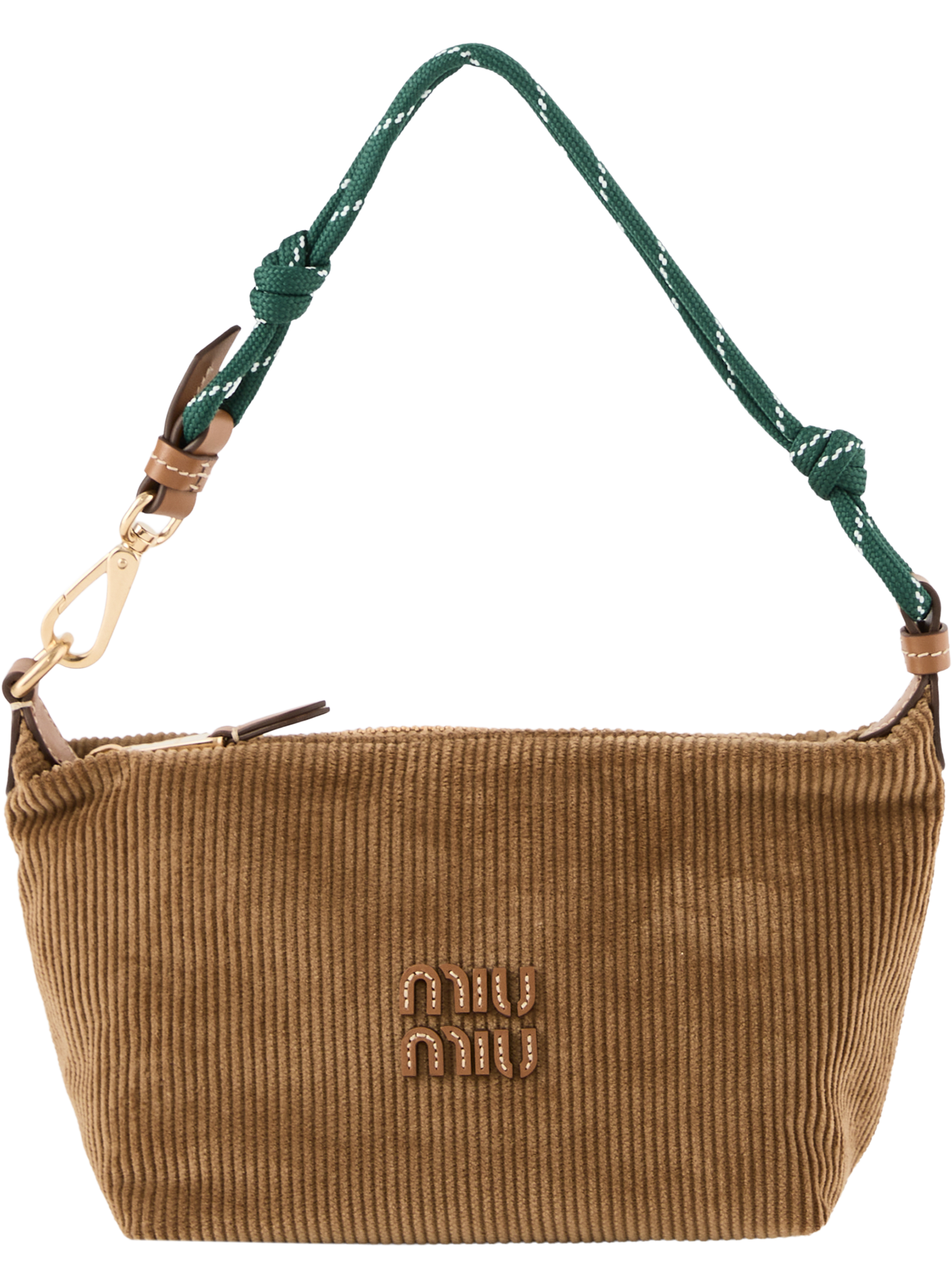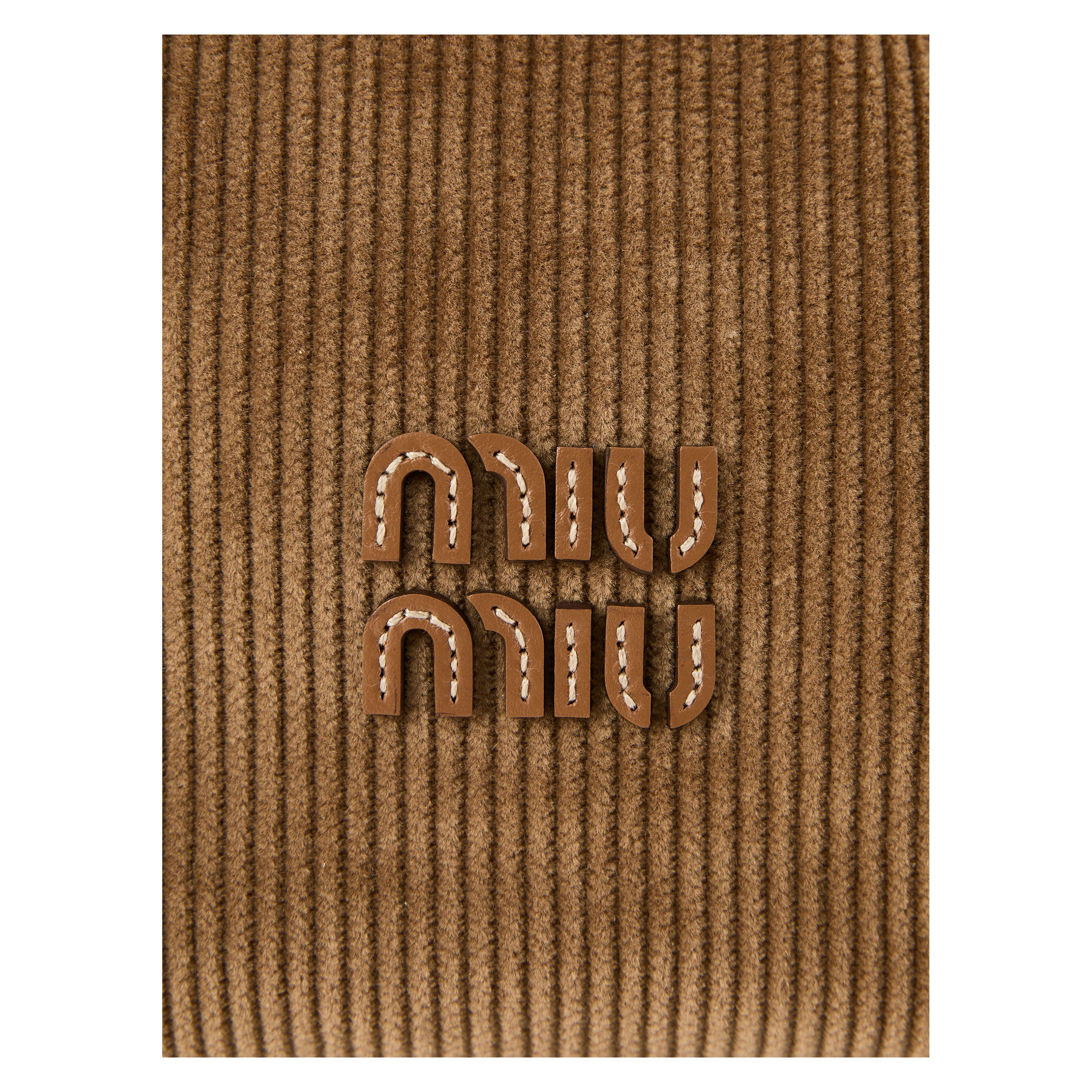 Diese Schultertasche in Cognac von miu miu wurde aus Baumwoll-Cord und Leder gefertigt. Der Reißverschluss, die Handschlaufe mit zweifarbigem Henkel – einem Markenzeichen der italienischen Marke – mit Karabinerhaken sowie der Logo-Schriftzug aus Leder vollenden dieses modische Modell.
