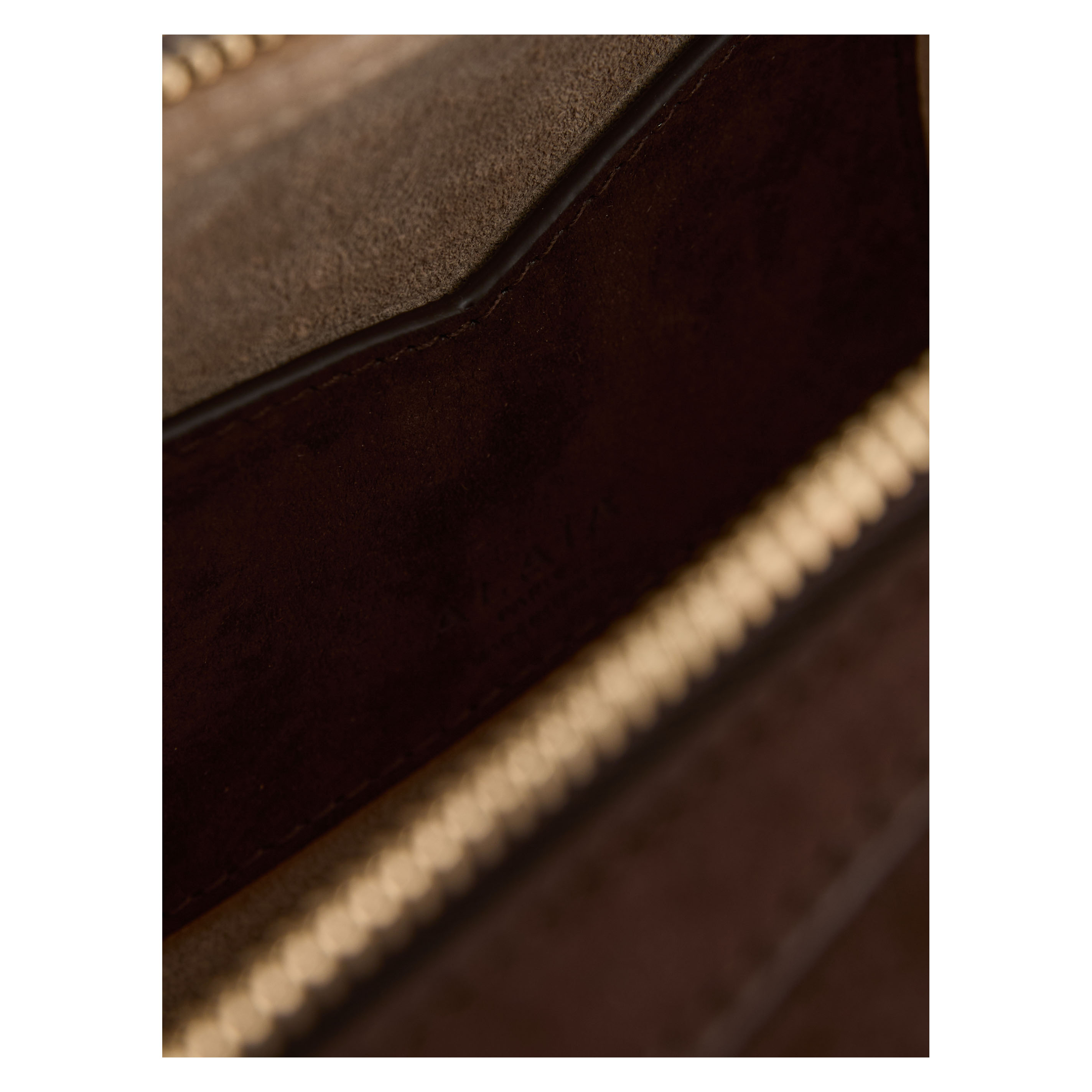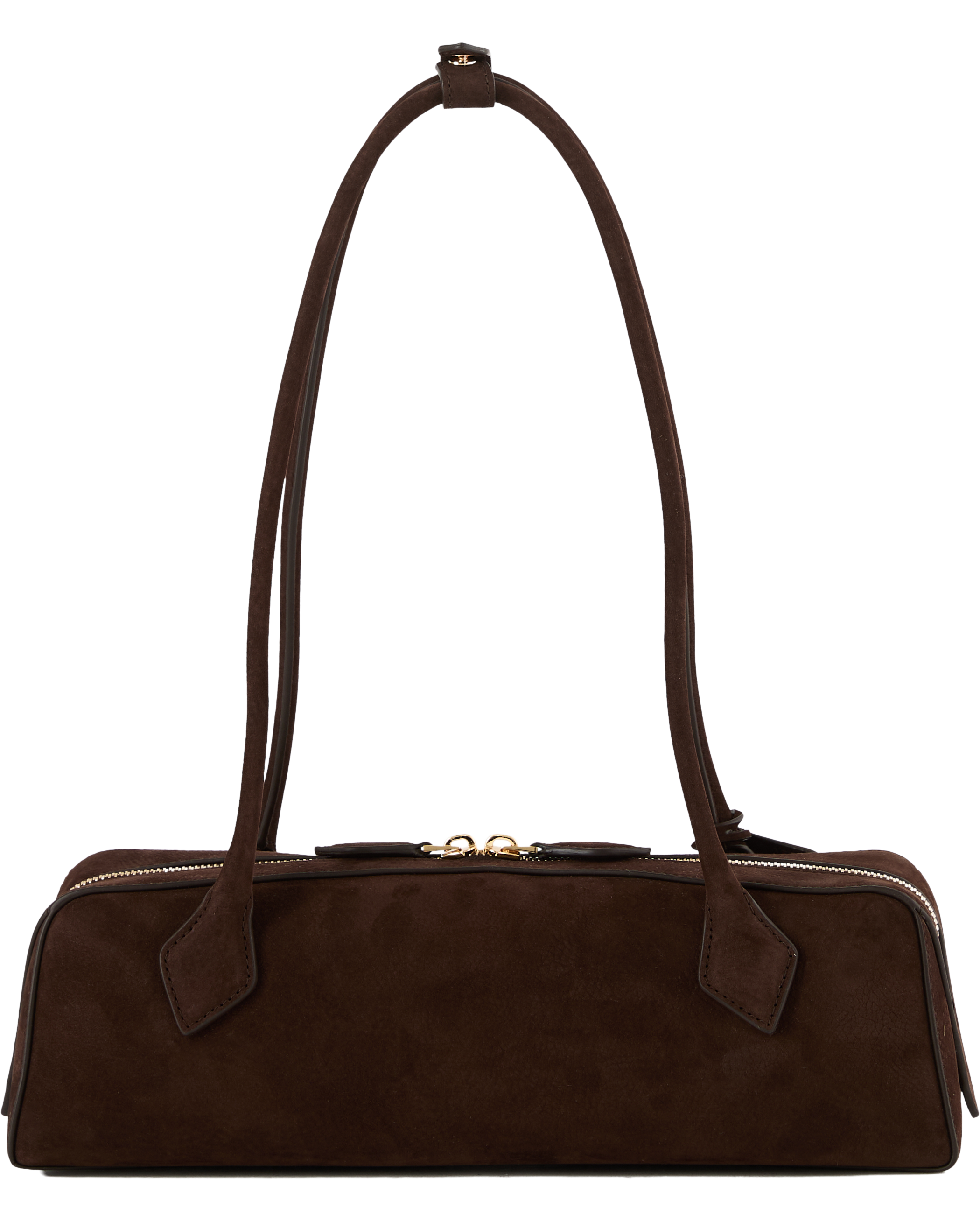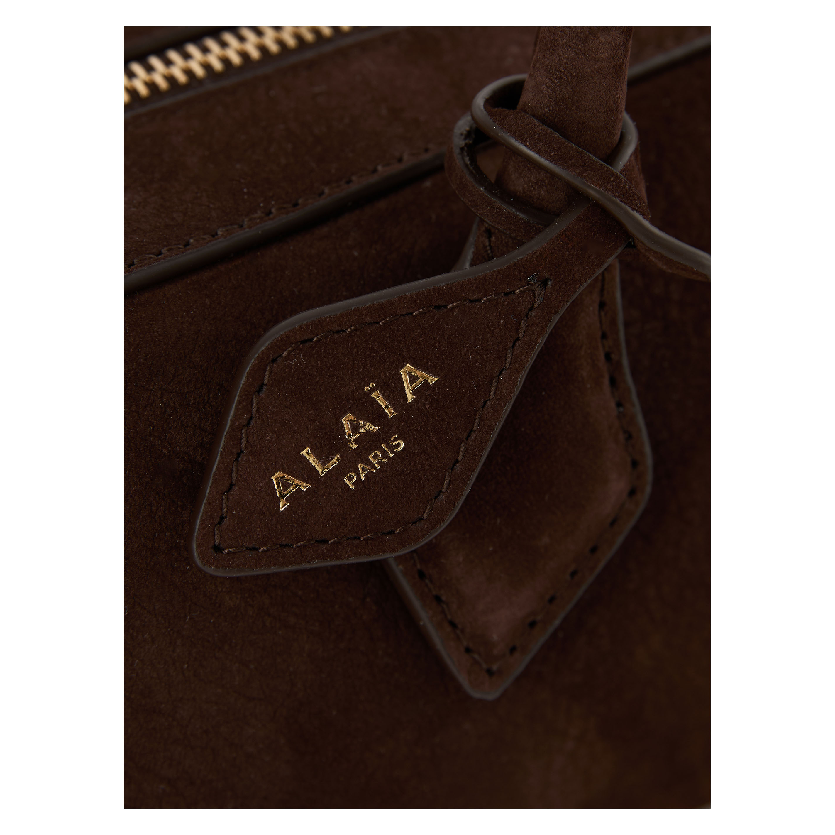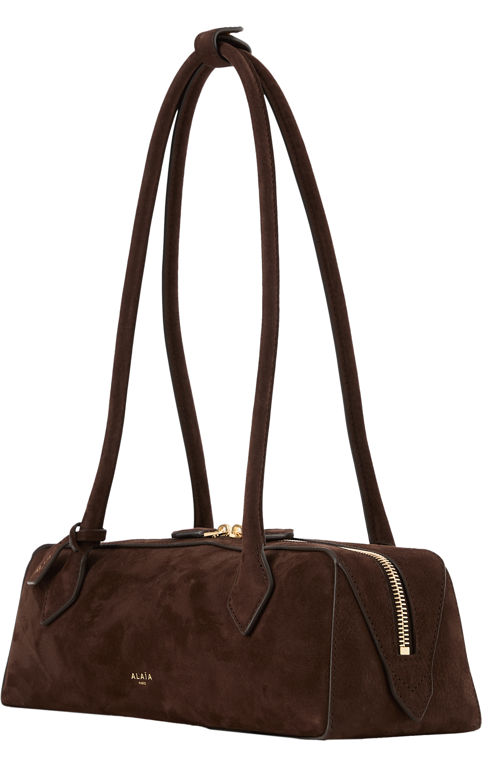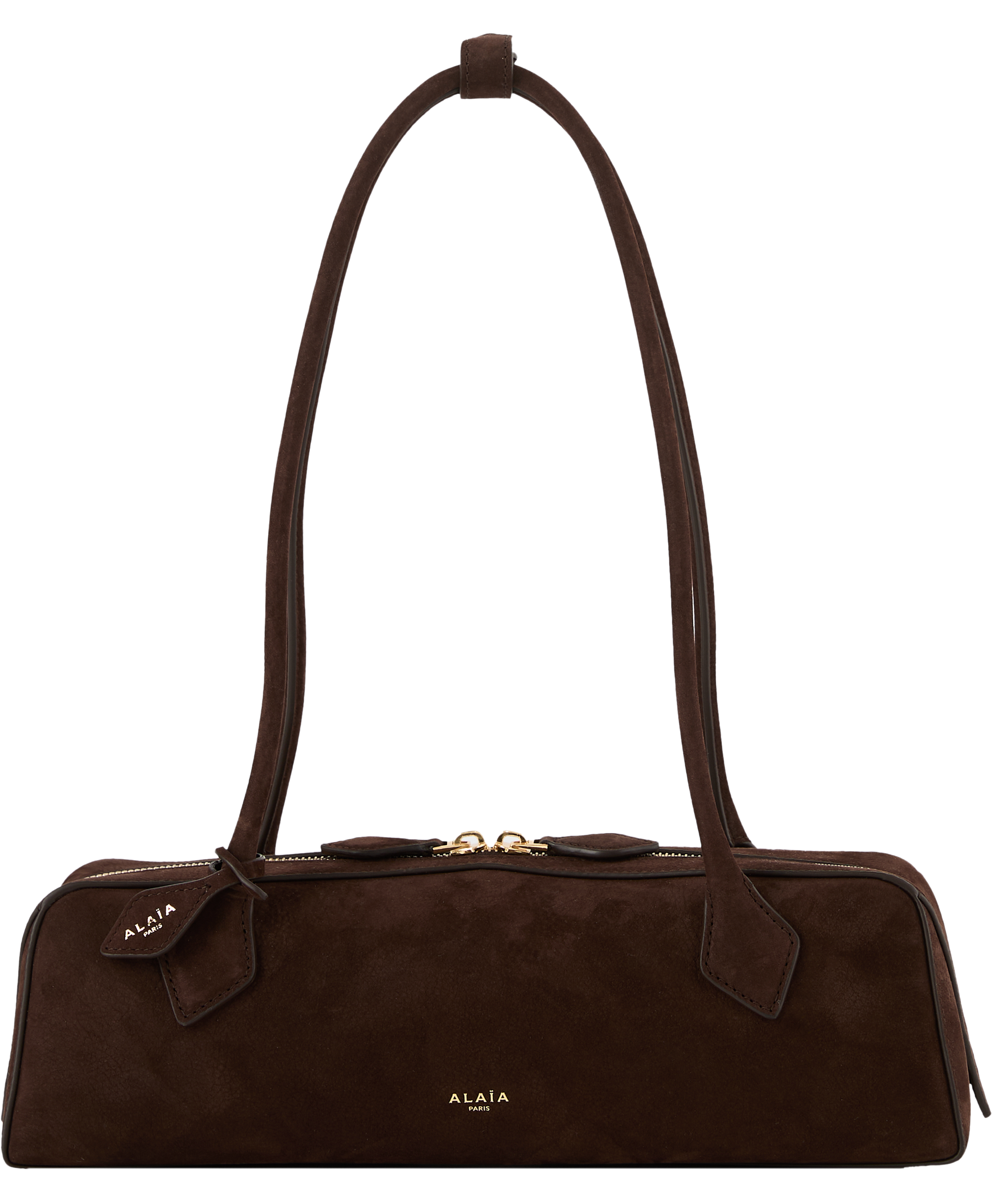Die Schultertasche 'Le Teckel Medium' in Dunkelbraun von Alaïa wurde aus weiches Kalbs-Nubuckleder gefertigt und besticht durch die röhrenförmigen Griffe. Der doppelte Reißverschluss und die längliche Form runden das Modell stilvoll ab.