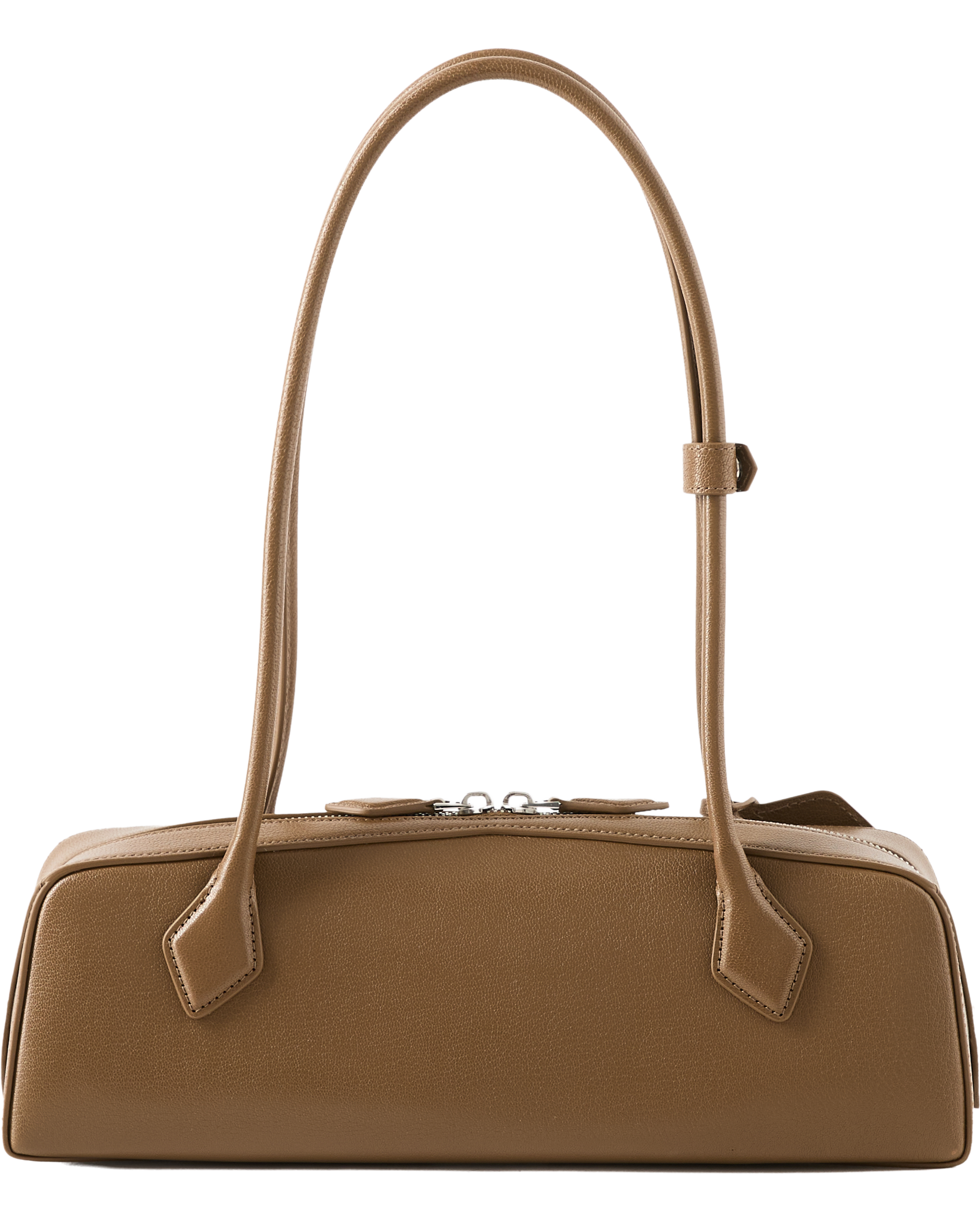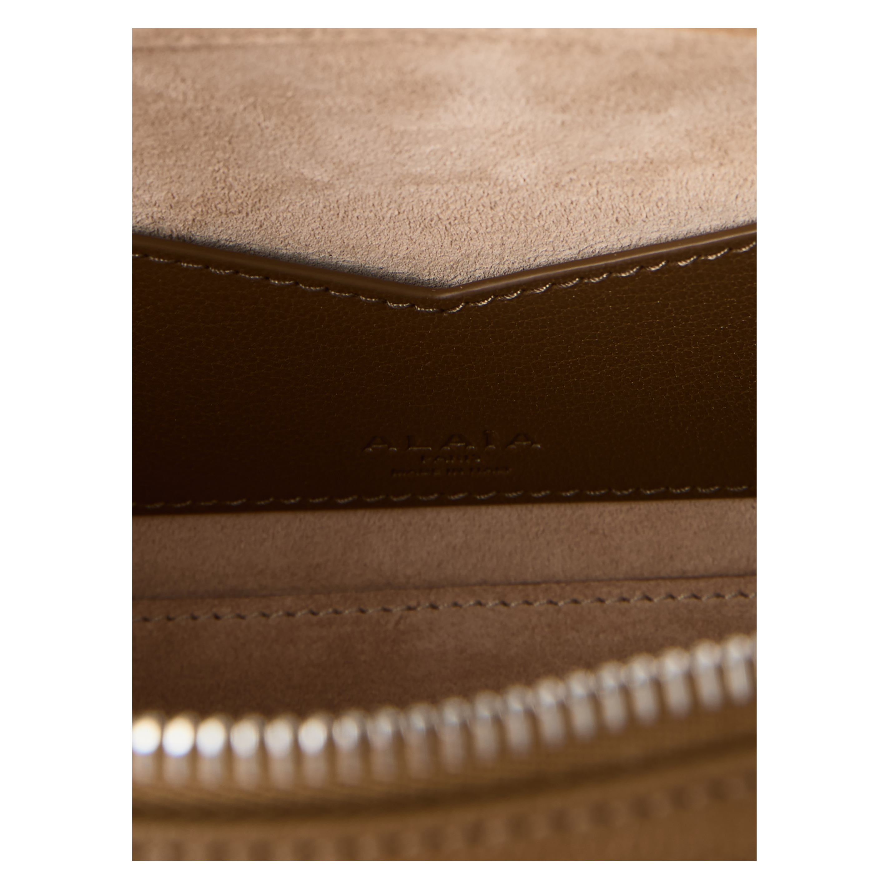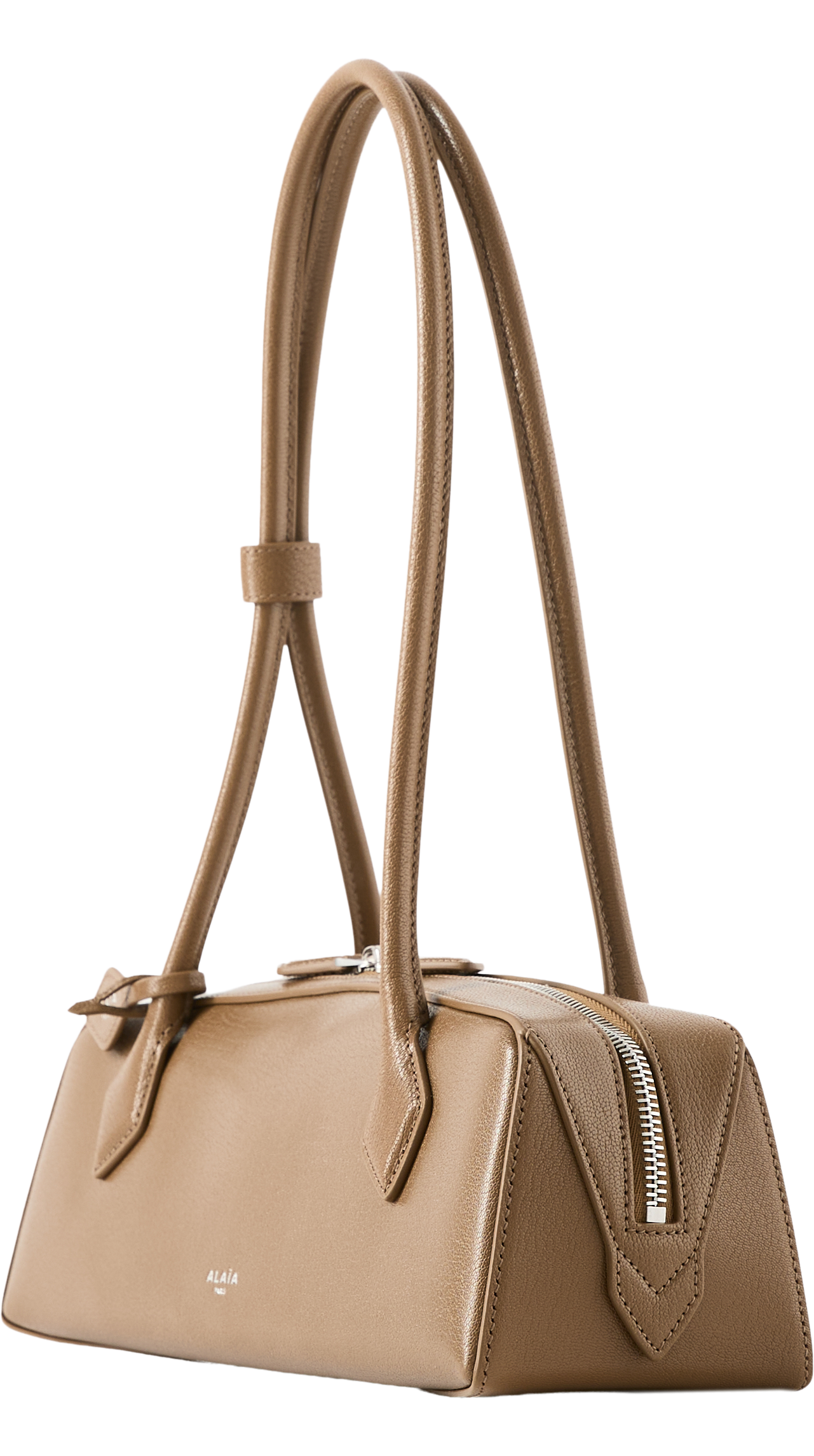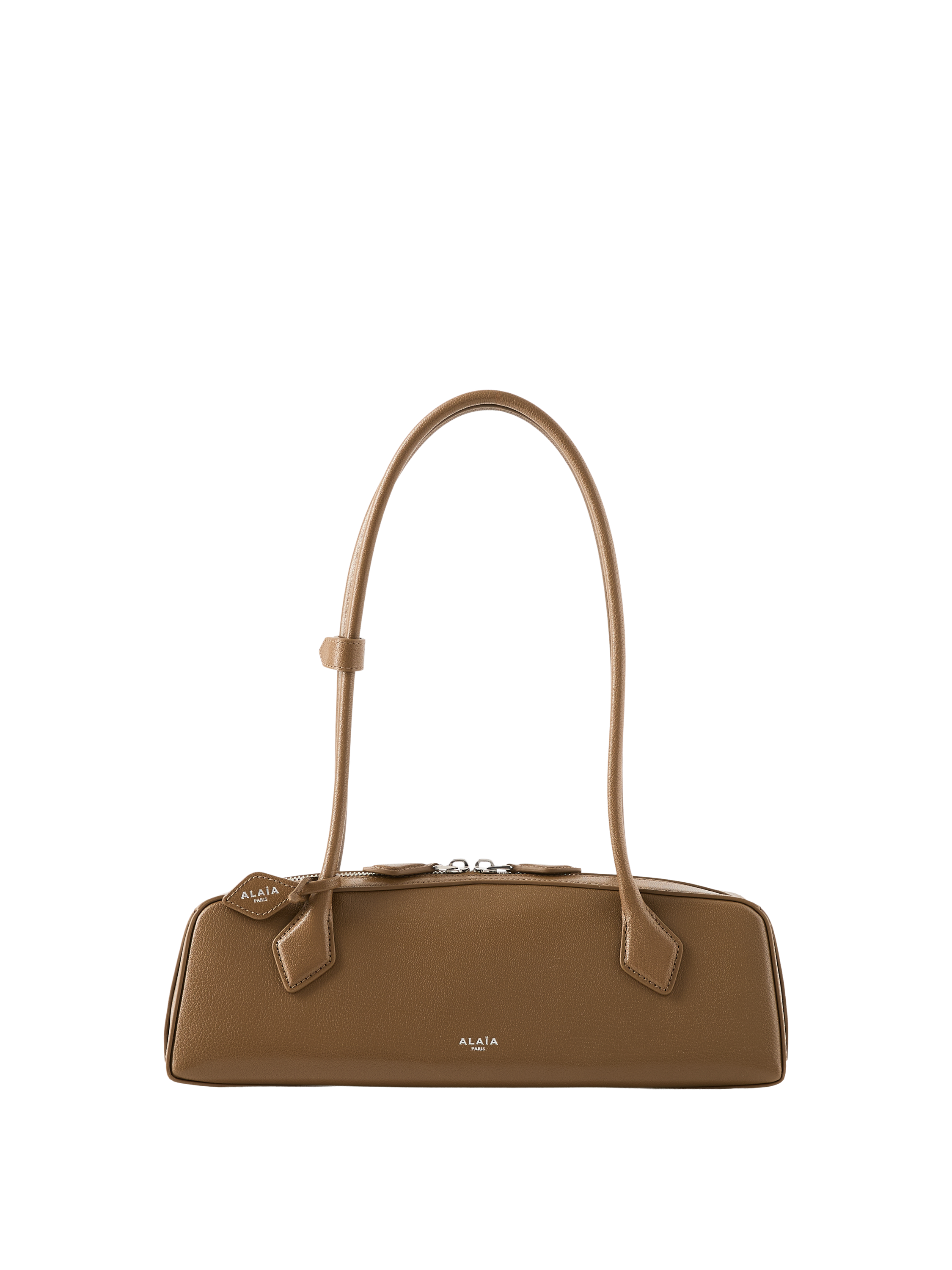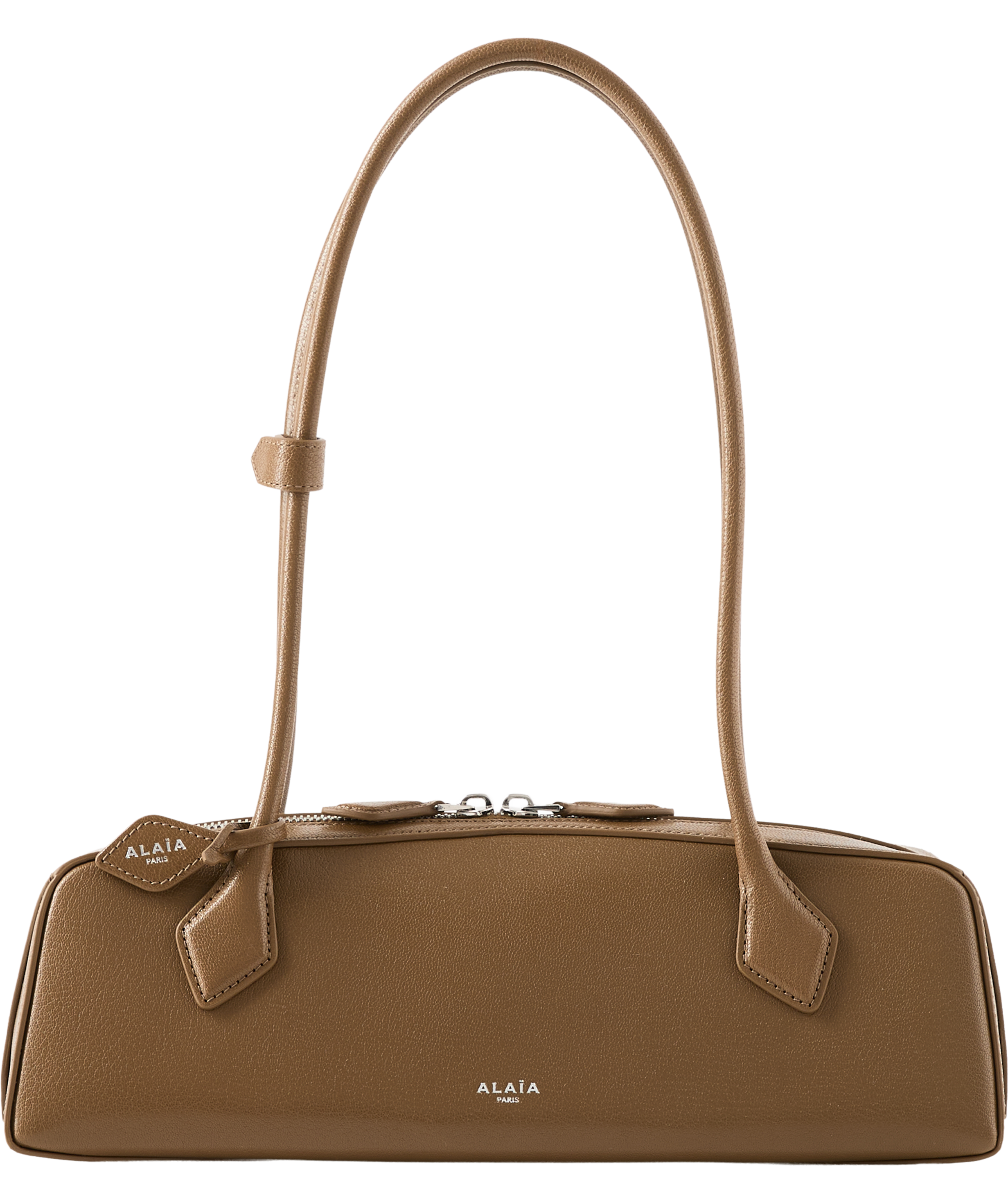 Die Schultertasche 'Le Teckel' in Khaki von Alaïa wurde aus glänzendem Ziegenleder gefertigt und besticht durch die ikonische, längliche Silhouette. Die silberfarbene Hardware und die subtile Logo-Prägung auf der Vorderseite setzen edle Akzente. Die röhrenförmigen, geschwungenen Griffe verleihen dem Modell eine skulpturale Note und unterstreichen das raffinierte Design.