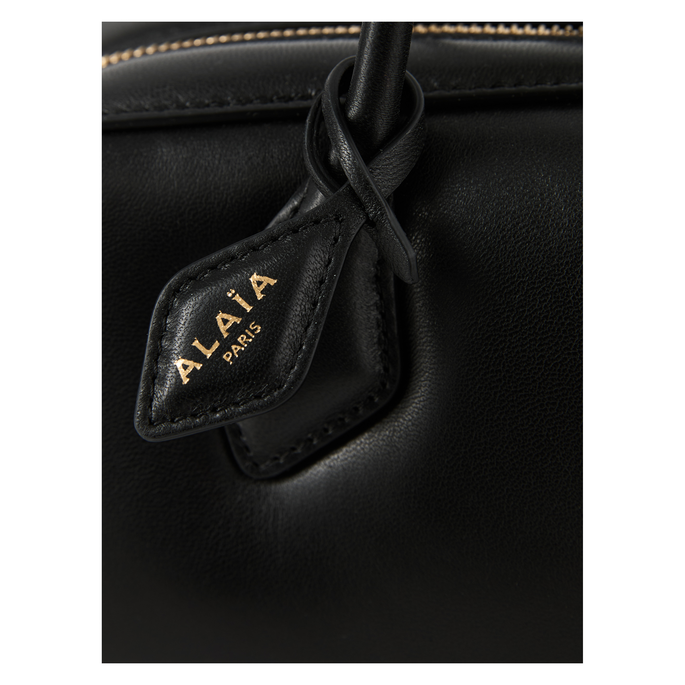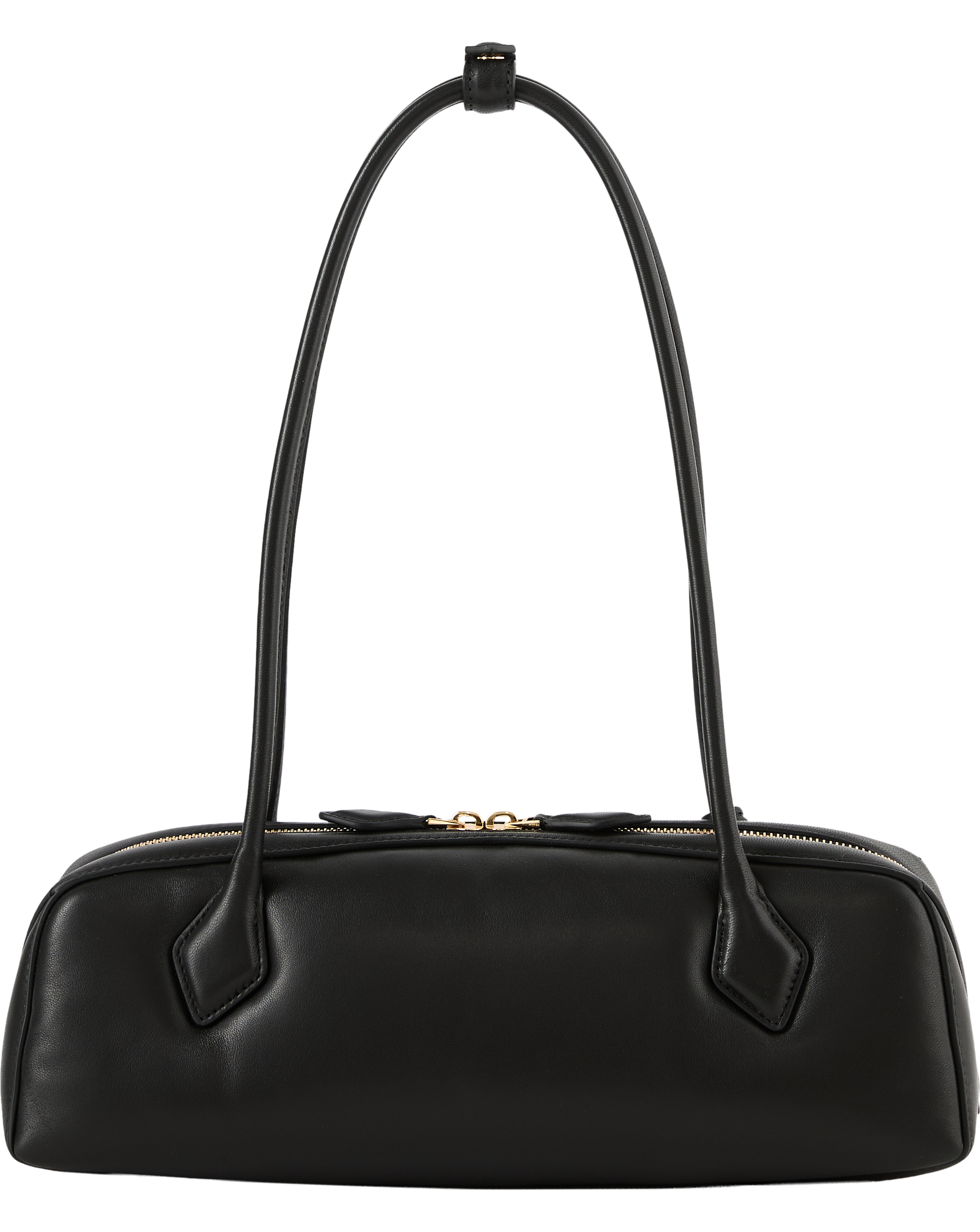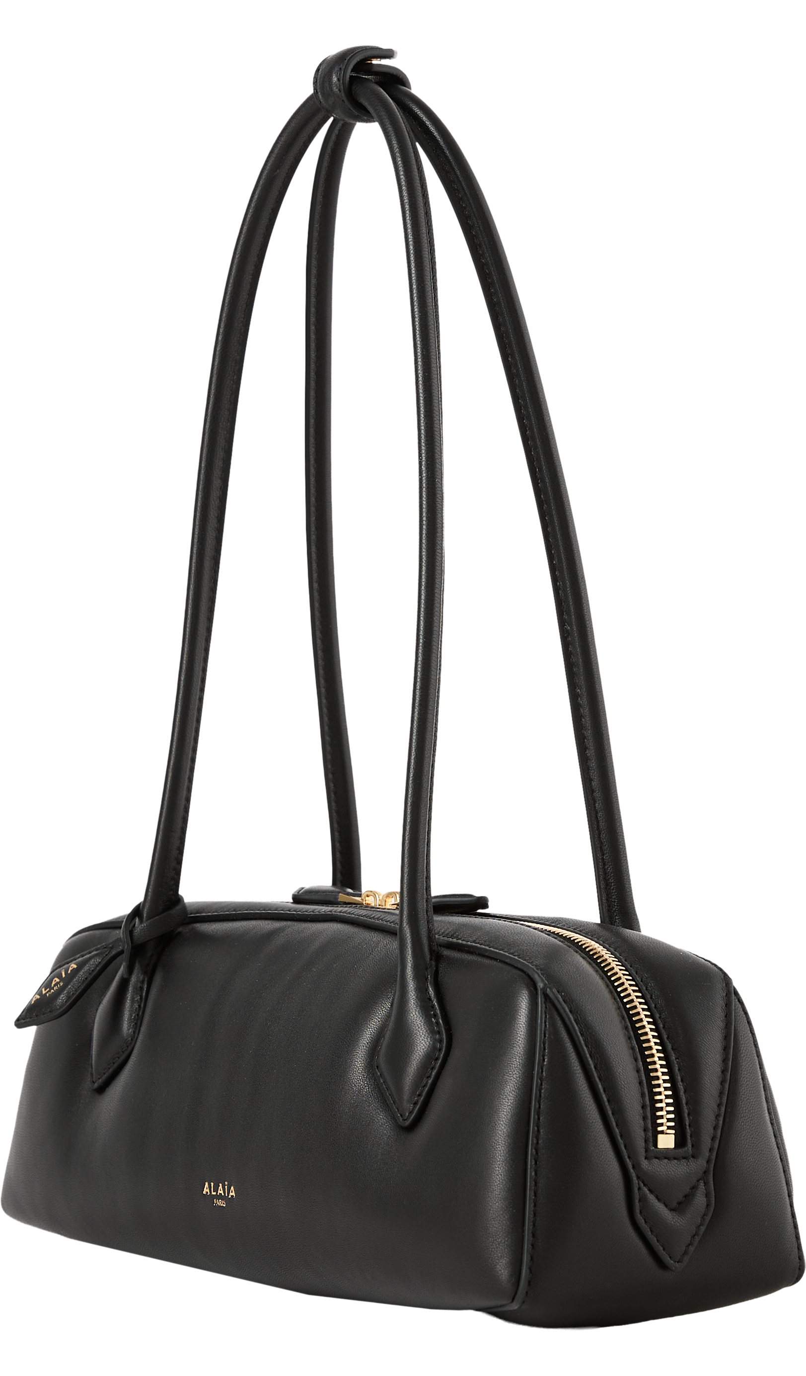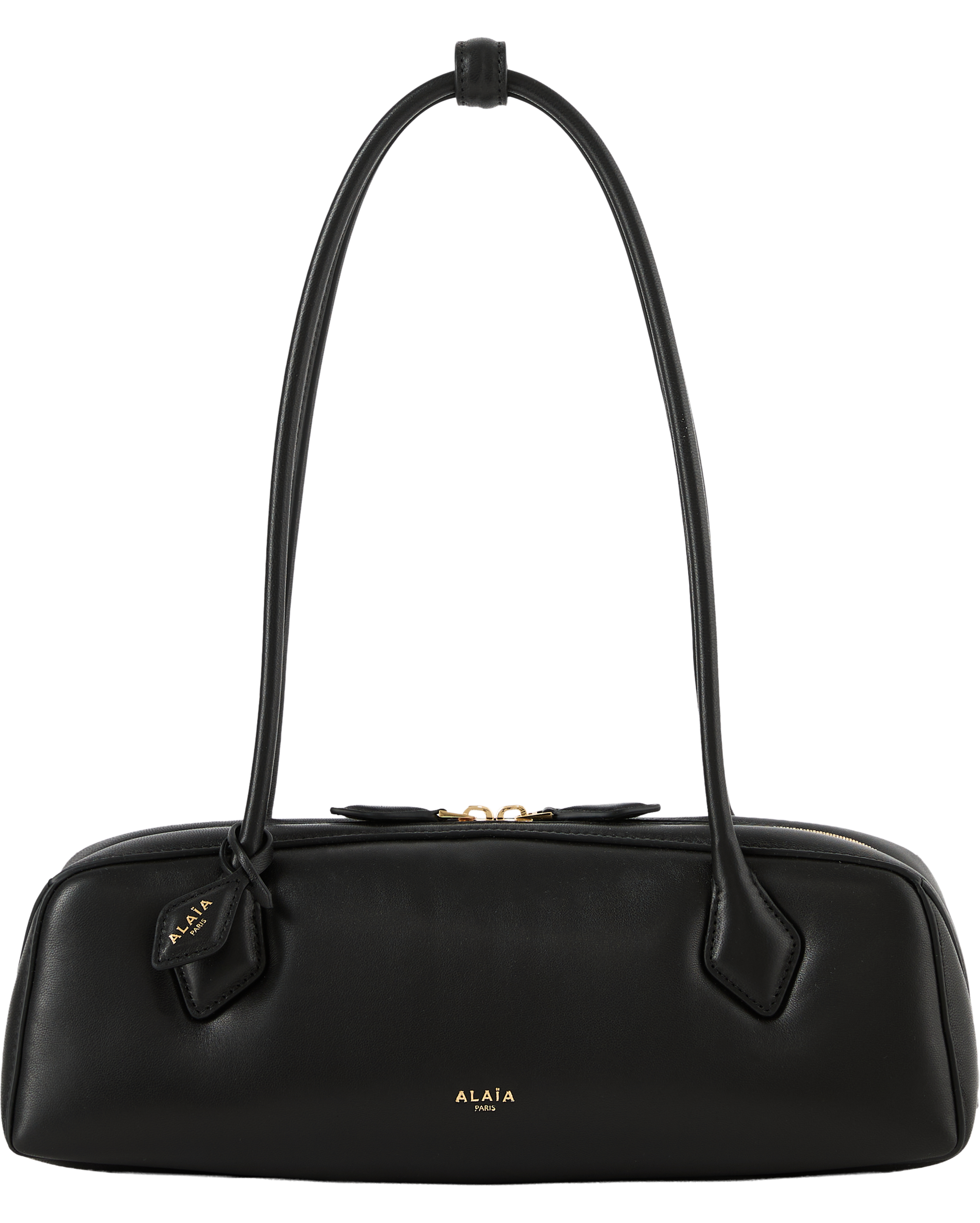 Die Schultertasche 'Le Teckel' in Schwarz von Alaïa wurde aus gepolstertem Lammleder gefertigt und besticht durch die längliche Form. Die röhrenförmige Griffe, der doppelte Reißverschluss und der kleine abnehmbare Spiegel runden das Modell stilvoll ab.