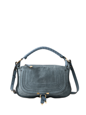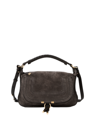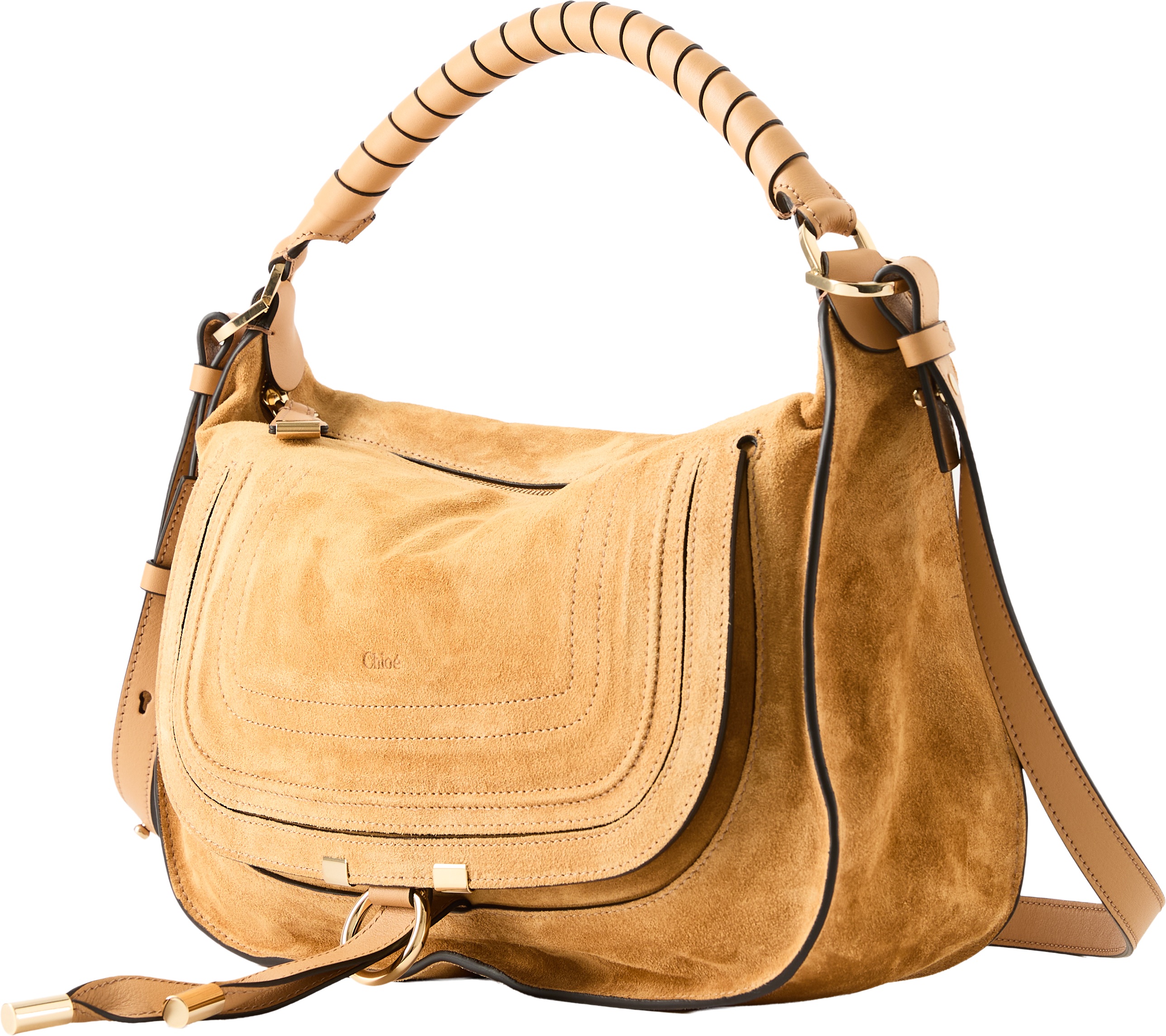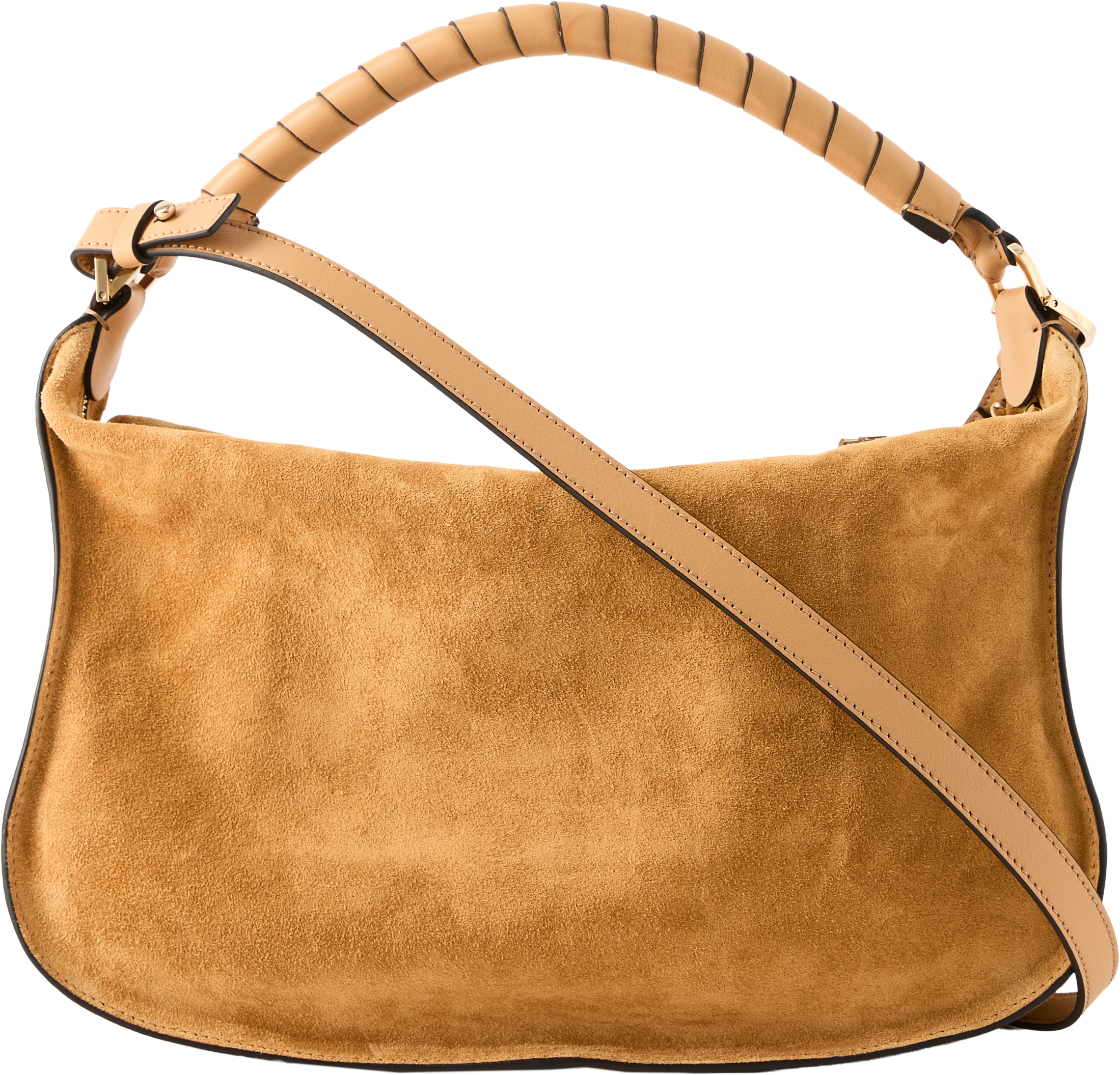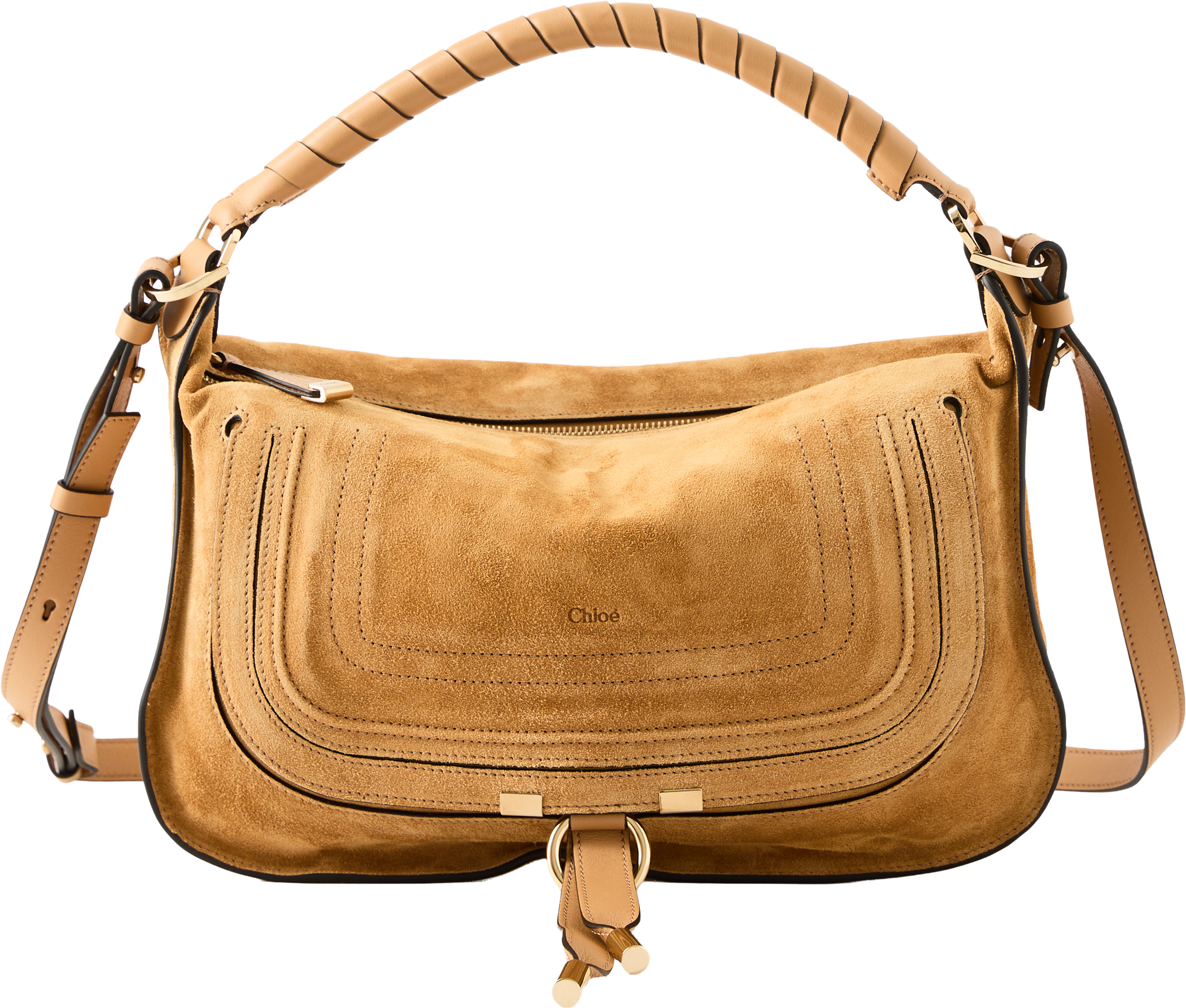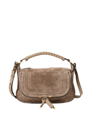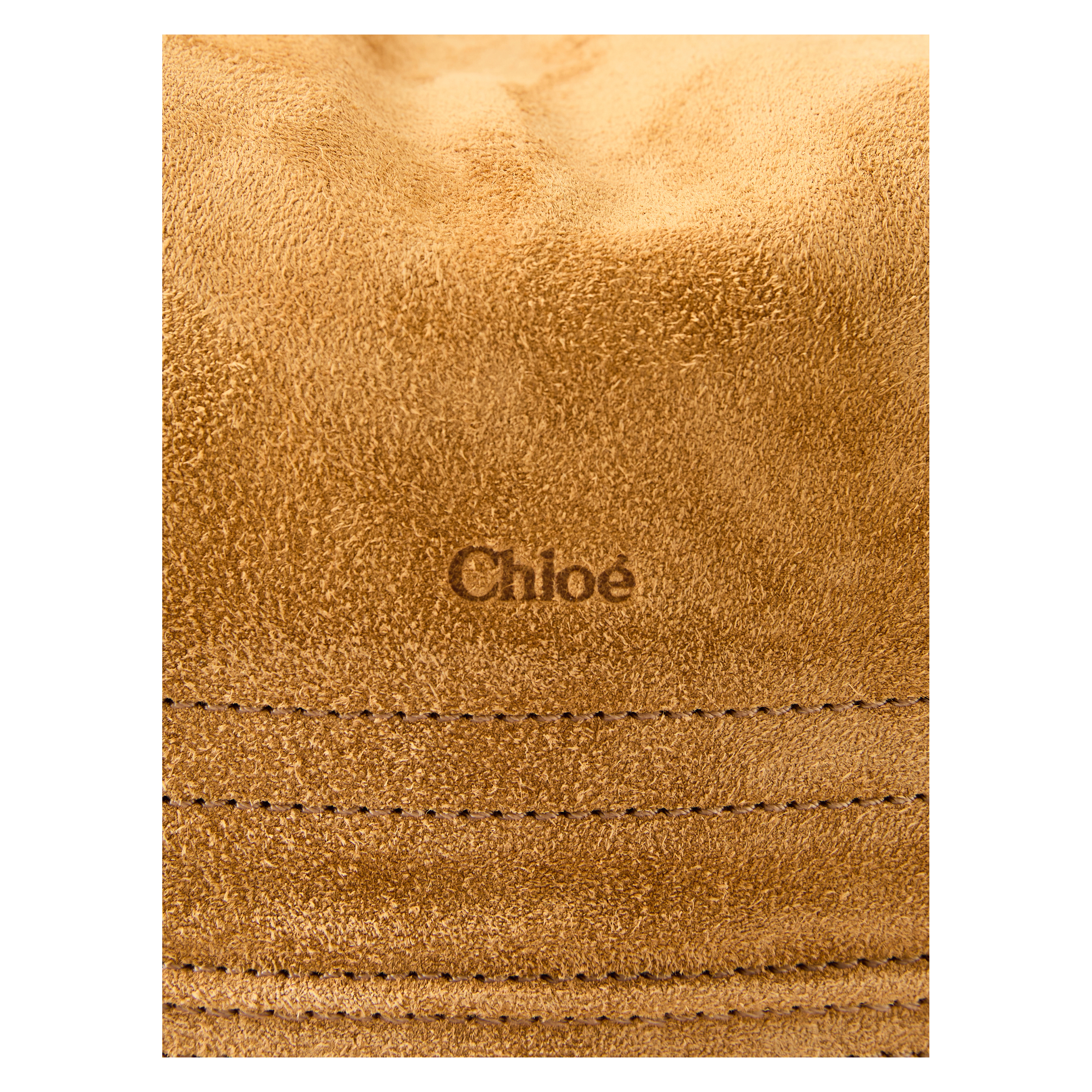 Die Schultertasche 'Marcie Hobo' von Chloé in Whispering Orange wurde aus Kalbswildleder gefertigt und besticht durch die Neuinterpretation der ikonischen Day Bag mit einer lockereren Form. Die Sattelnähte, der einzelne handgewickelte Griff und die goldfarbenen Beschläge machen die Tasche zu einem sportlich-eleganten Klassiker. Die herabhängenden Lederquasten der Linie schließen den Überschlag.