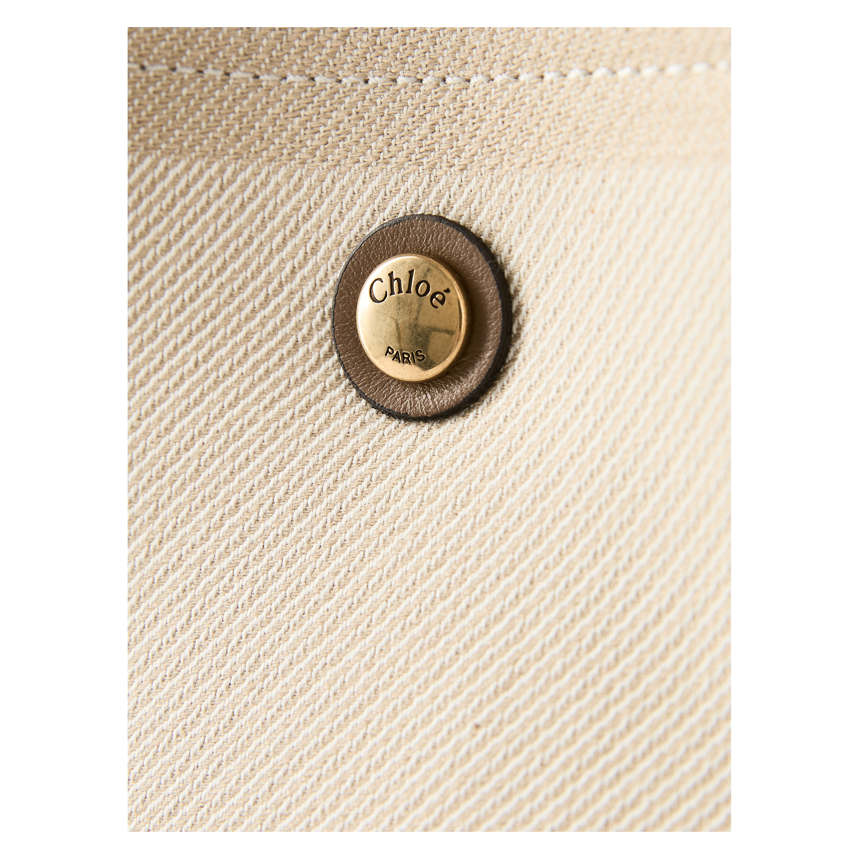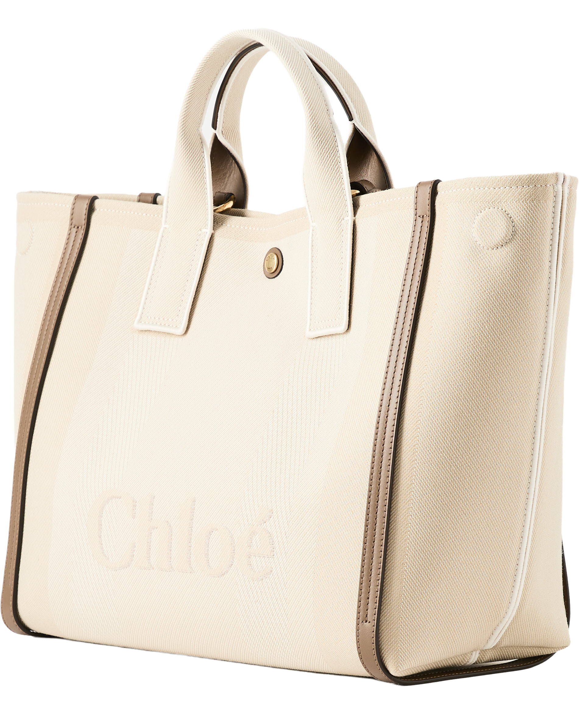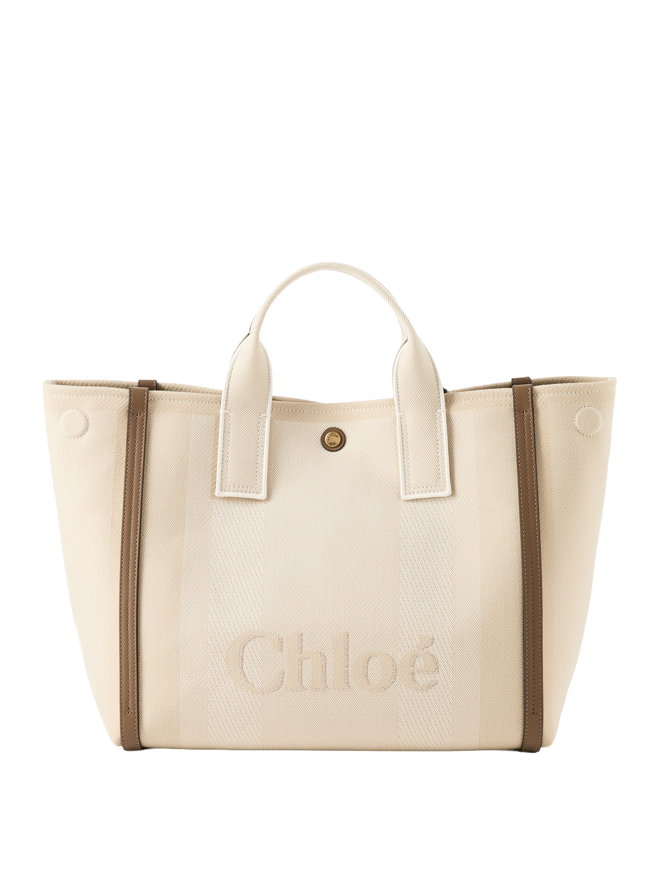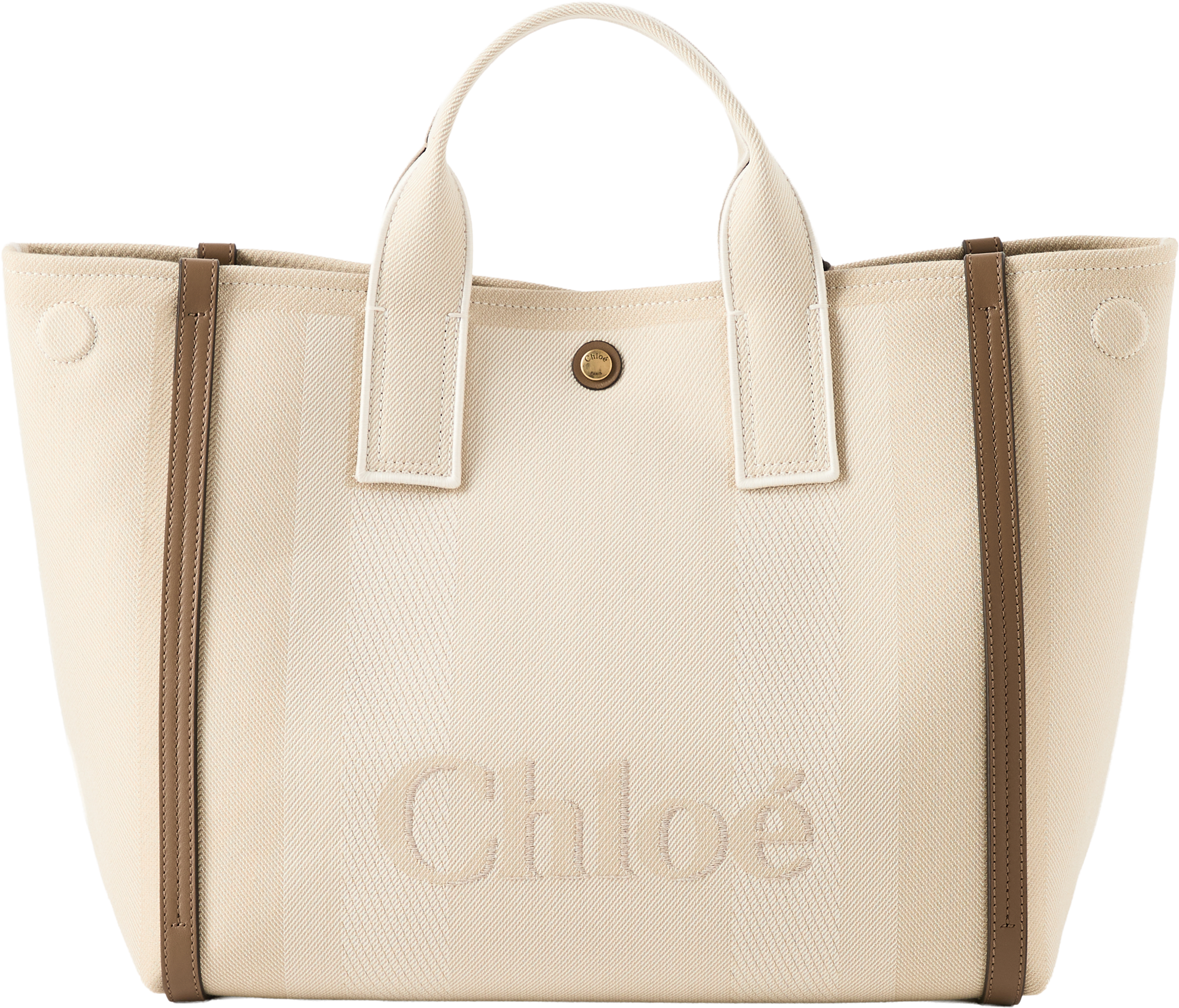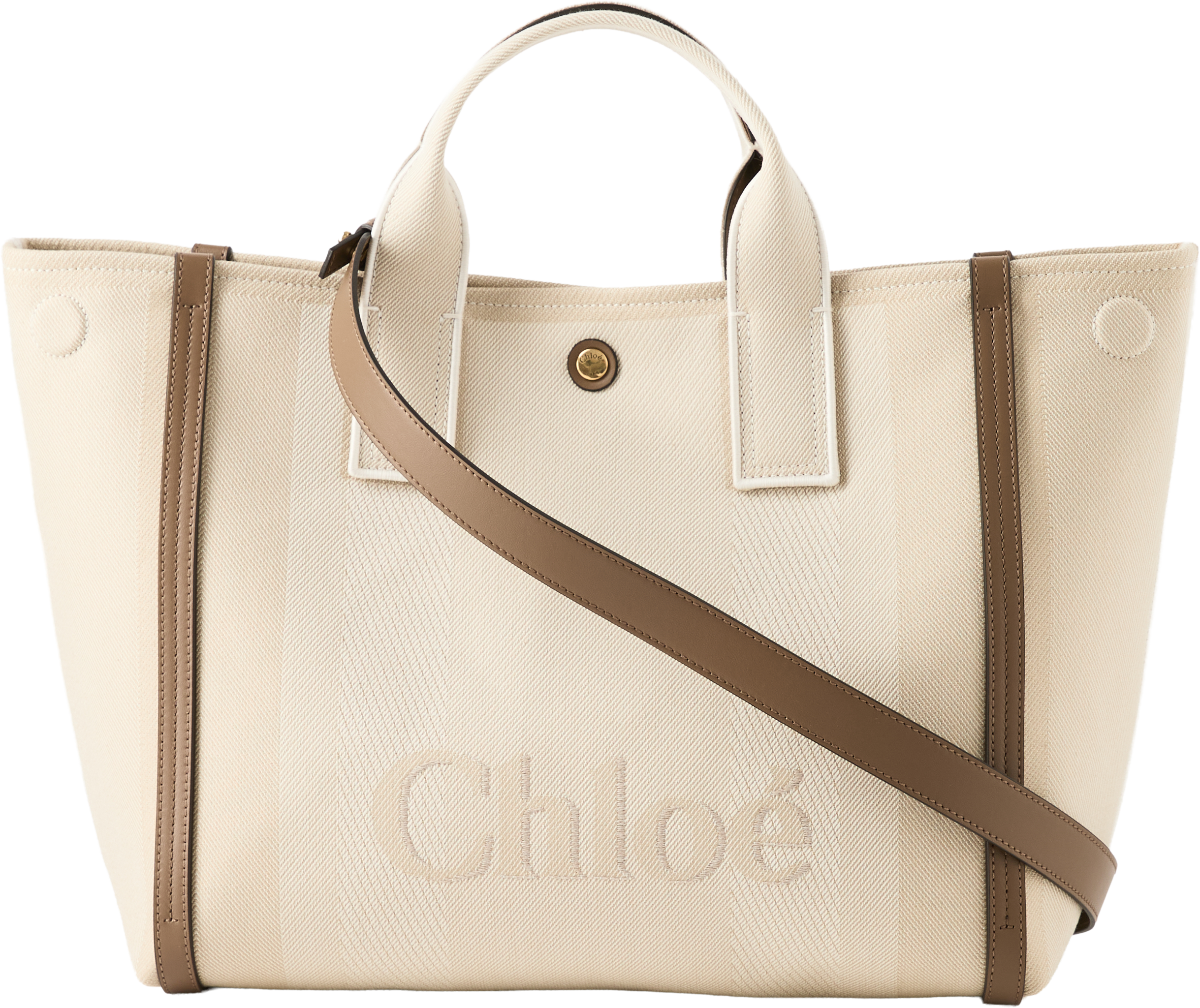 Die Handtasche 'Carry Tote' von Chloé in Vegetal Beige wurde aus gestreiftem Baumwoll-Canvas-Jacquard gefertigt und besticht durch die kontrastierenden vertikalen Lederbänder. Diese Lederbänder und das übergroße Chloé-Logo verleihen der Day Bag ihre strukturierte Silhouette und verwandeln sie in eine runde, kompakte Form. Die Tasche kann an den beiden Henkeln oder am abnehmbaren Riemen getragen werden.