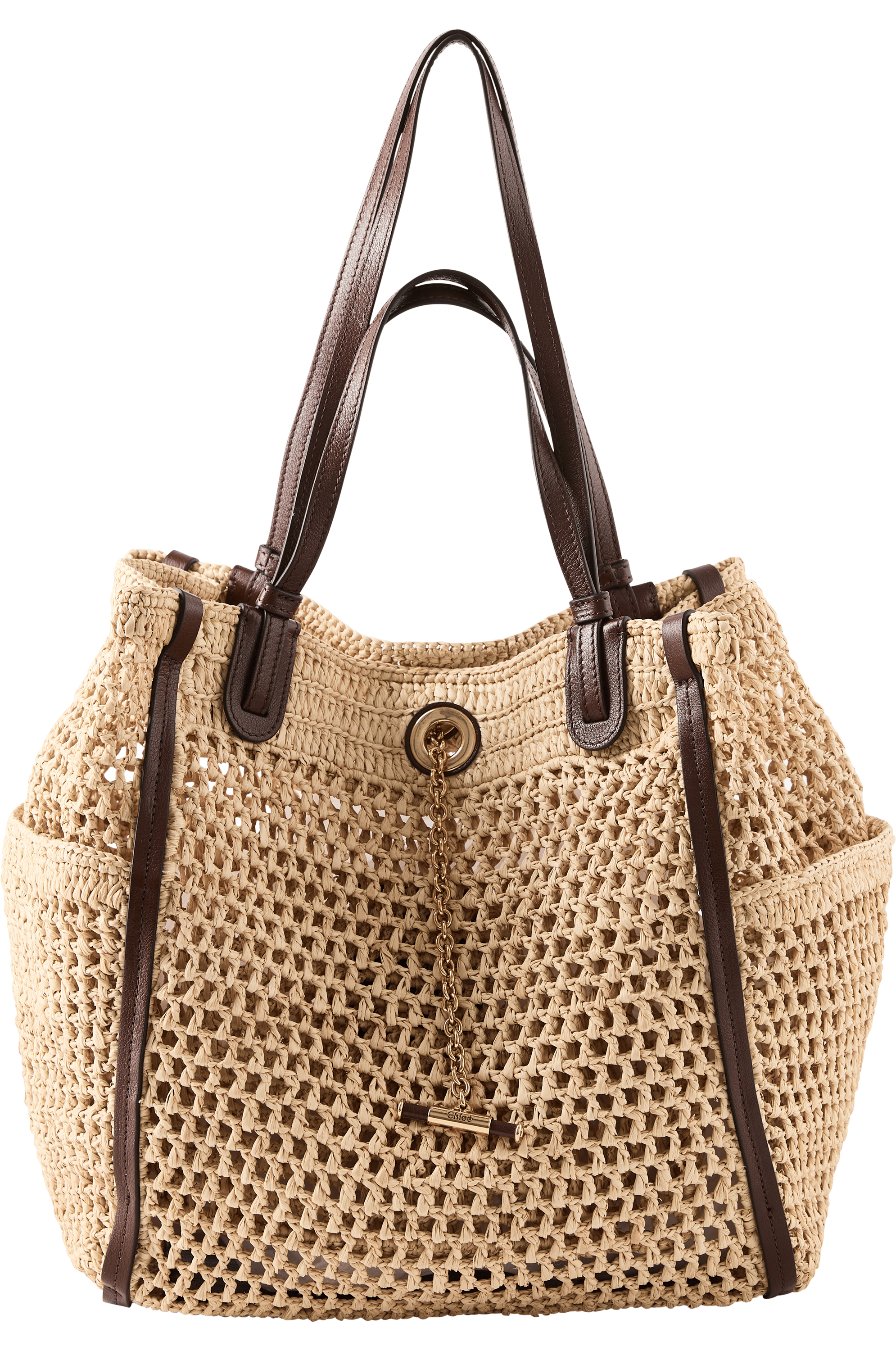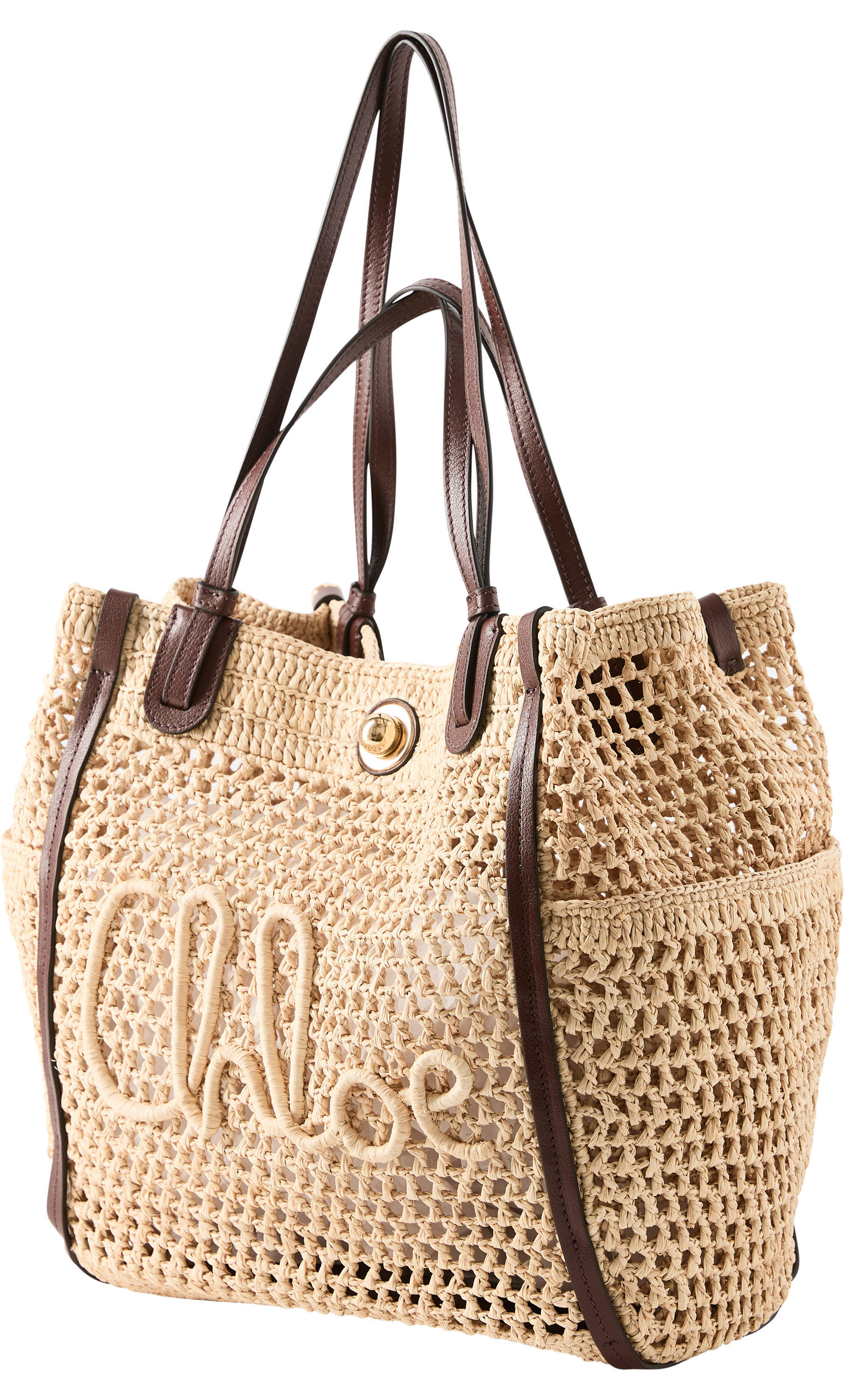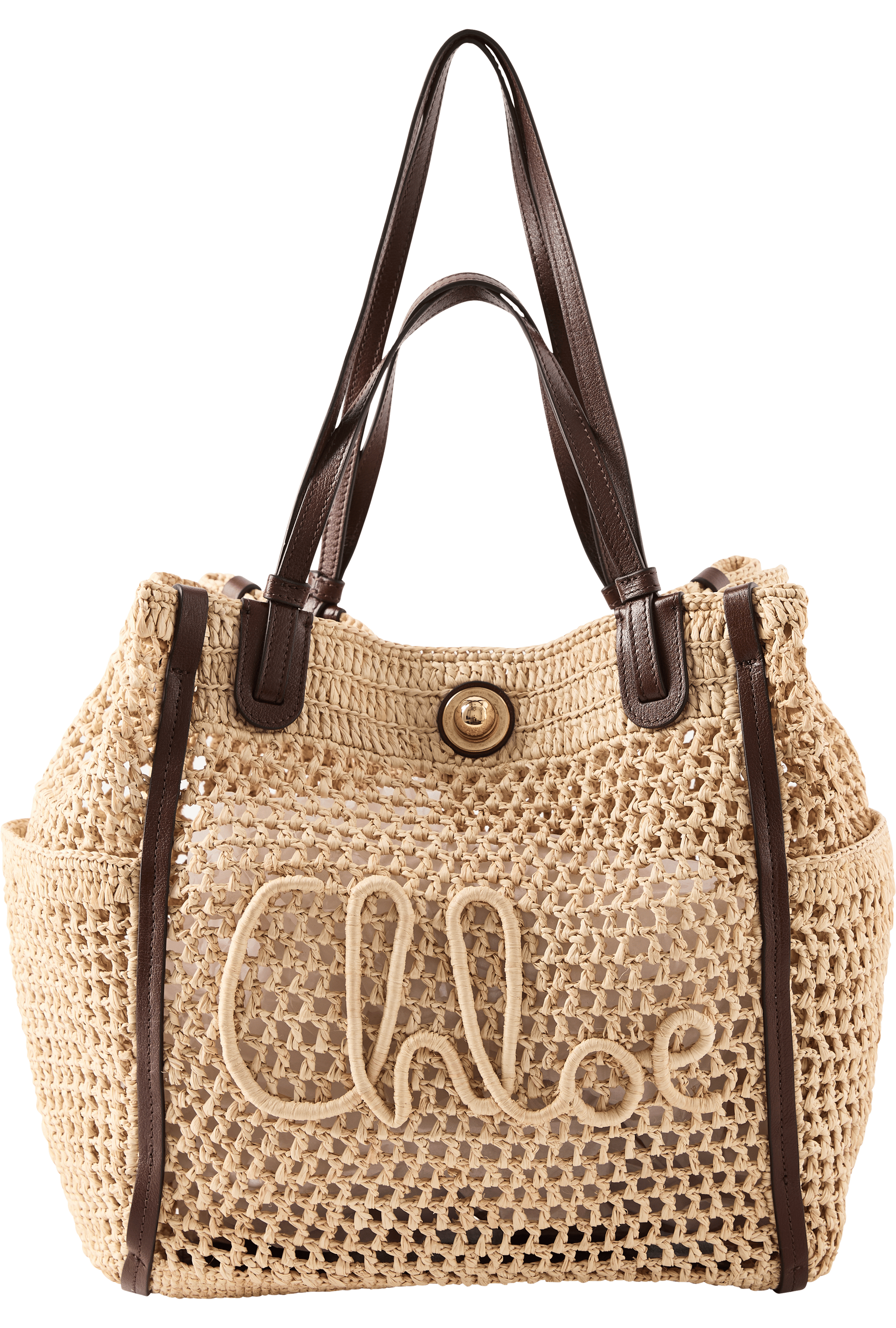 Der Shopper 'Iconic' von Chloé in Hot Sand wurde aus geflochtenen Fasern und Büffelleder gefertigt. Die Vorderseite ist mit einem goldfarbenen Knebelverschluss sowie einem handschriftlichen Logo im Stil der Designtradition von Chloé versehen. Dank der kurzen und langen Riemen kann die Tasche sowohl in der Hand als auch über der Schulter getragen werden.