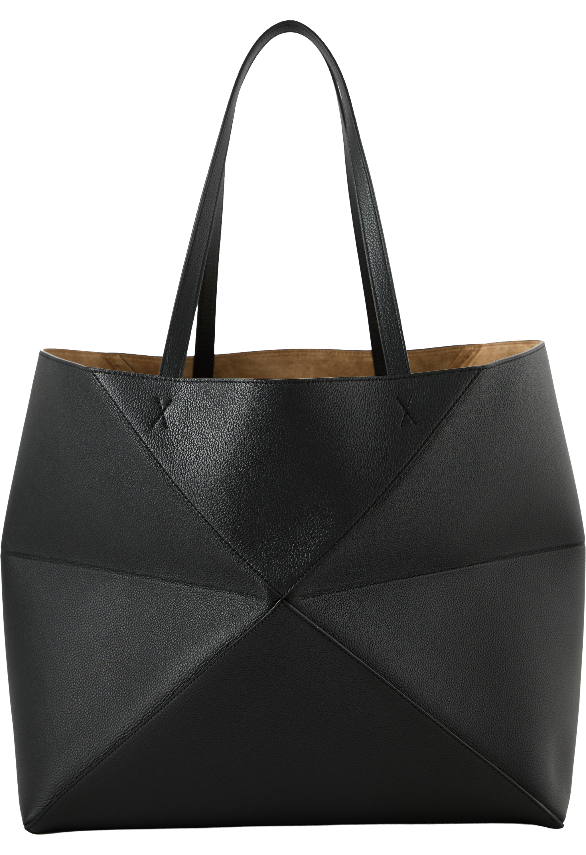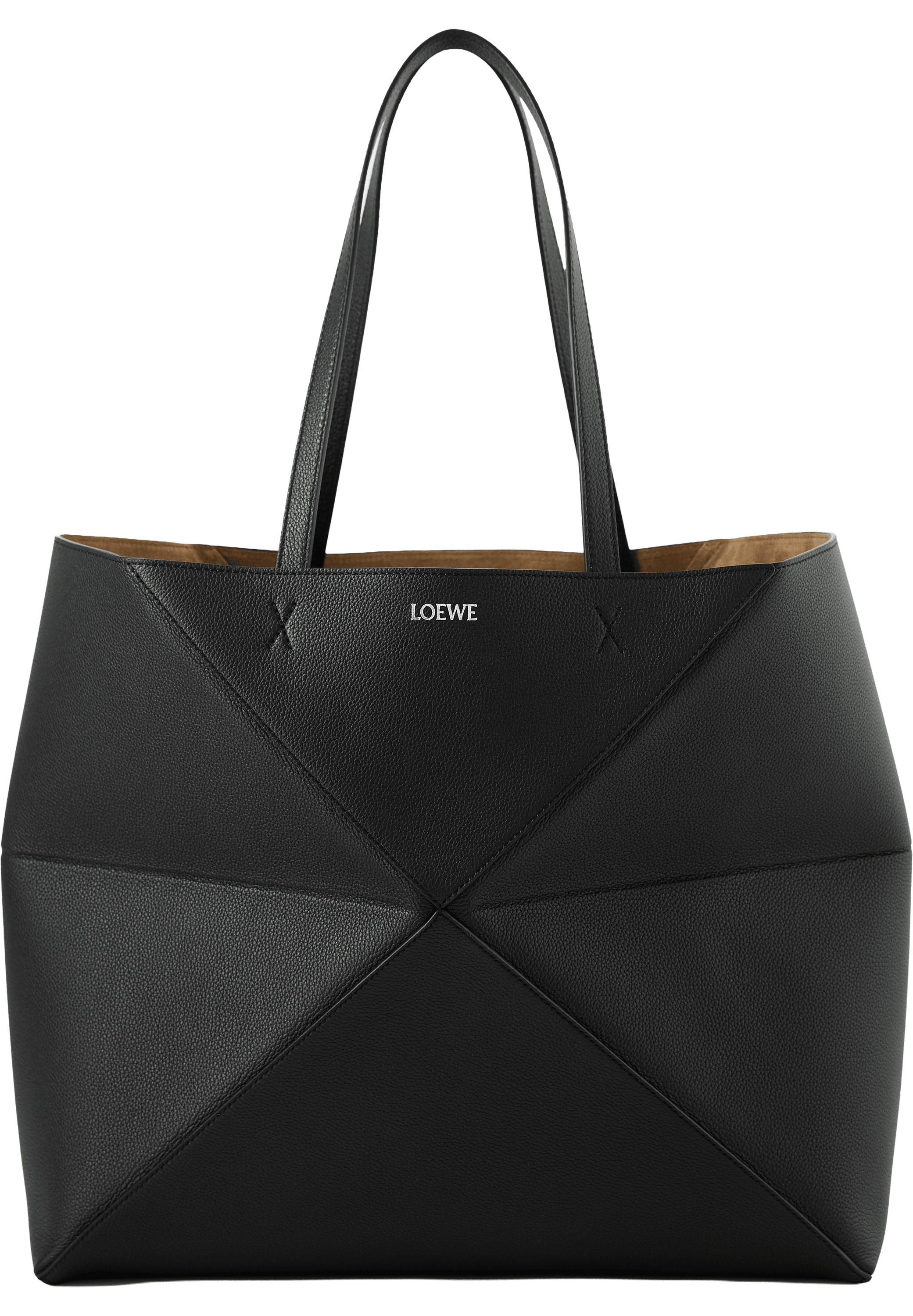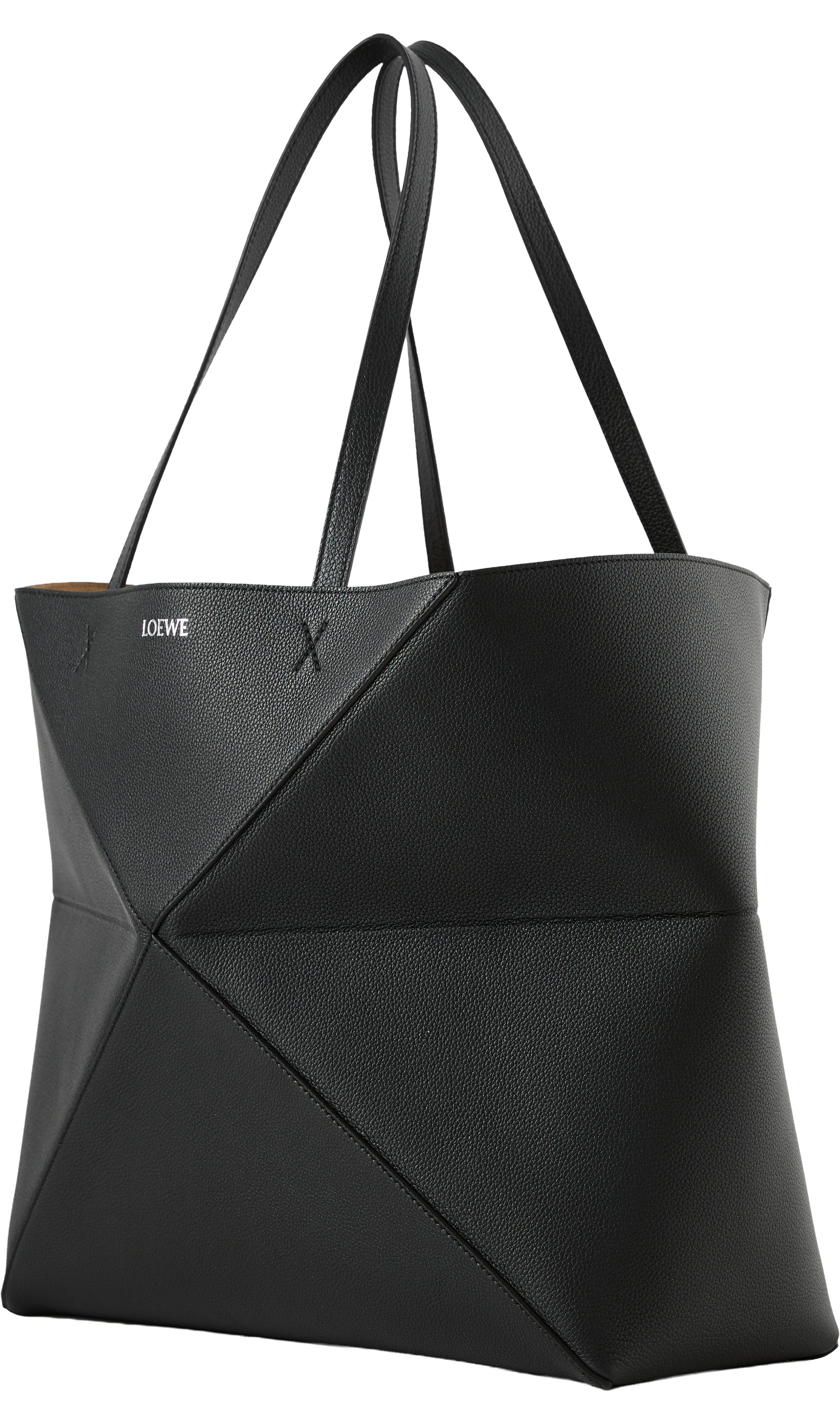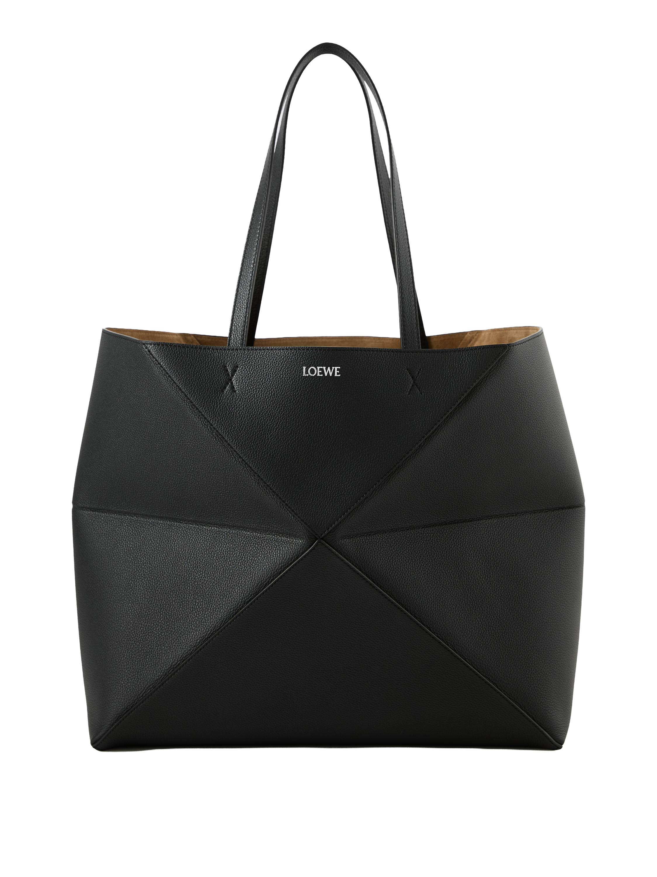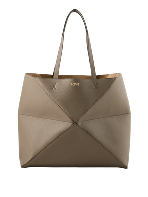 Der Shopper 'Puzzle Fold Horizontal Large' in Schwarz wurde aus genarbtem Kalbsleder gefertigt und besticht durch die leichte, geometrische Struktur. Die große, horizontale Silhouette, die Innentasche aus Veloursleder mit Reißverschluss, das Innenfutter aus Wildleder sowie die goldfarbene LOEWE-Prägung runden das Design ab.