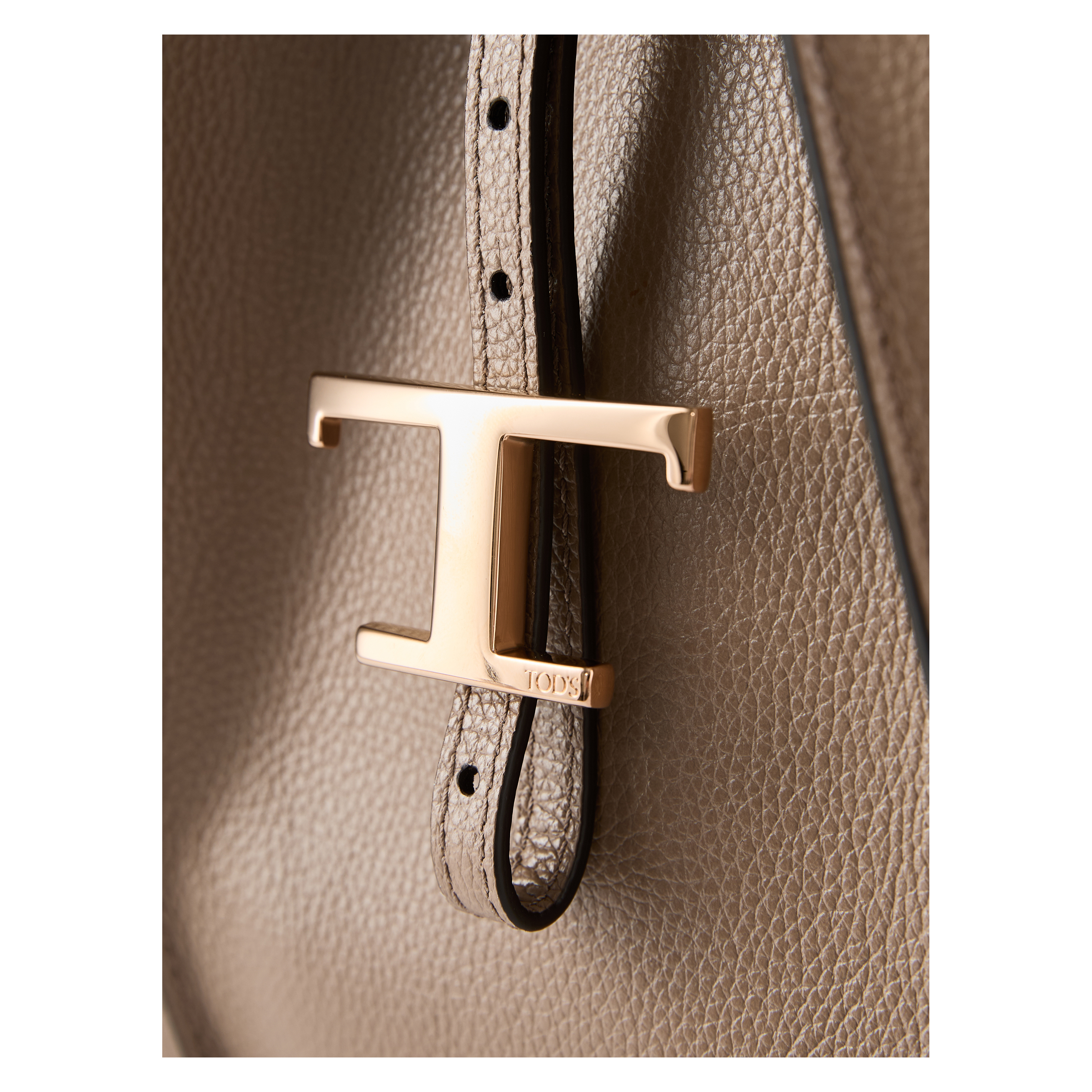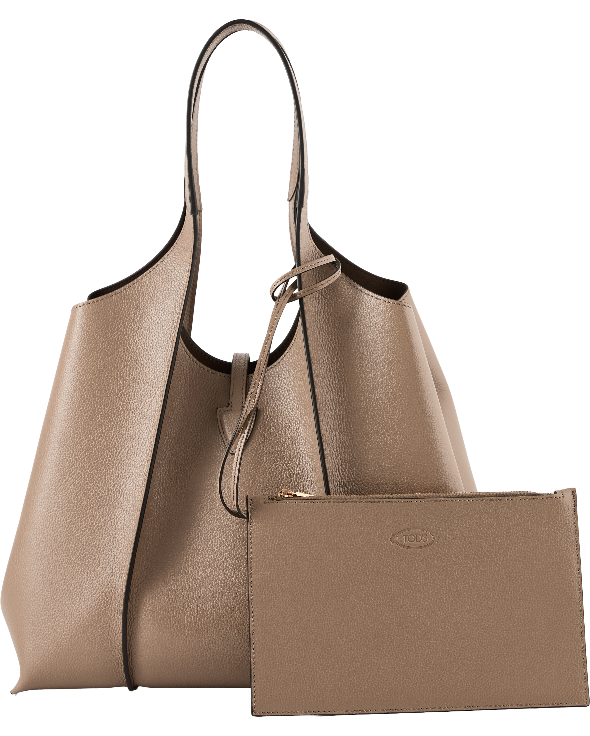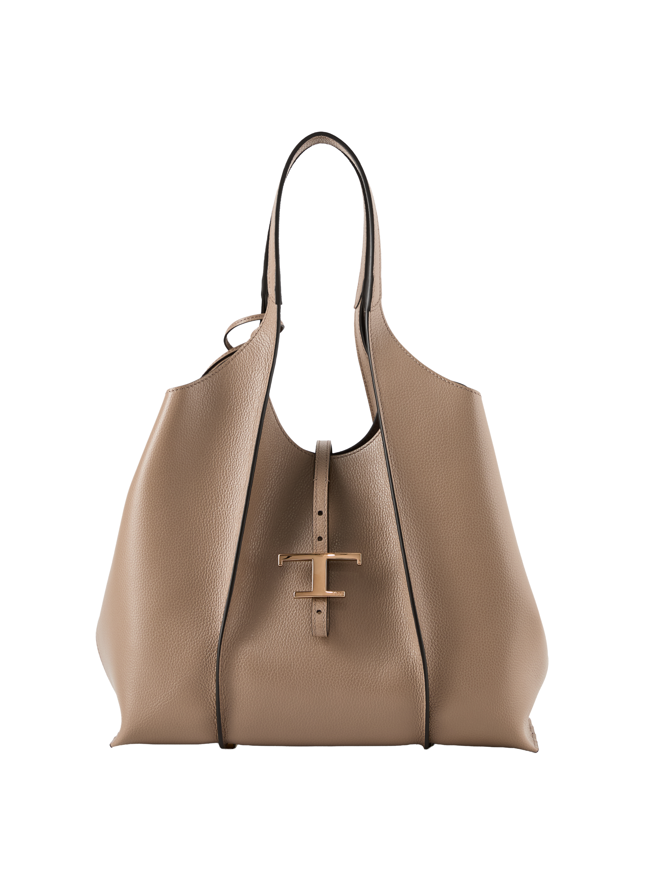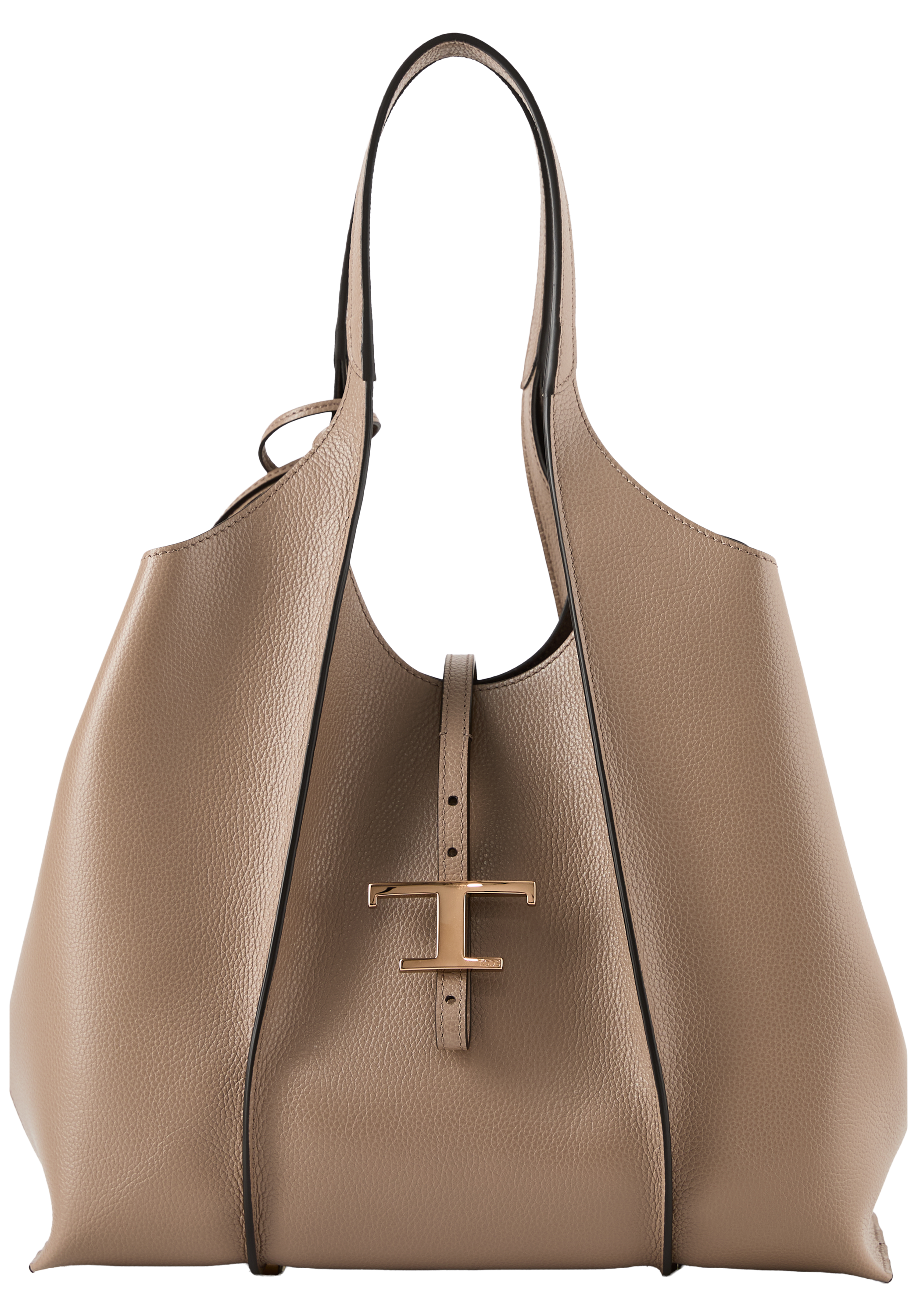 Der Shopper 'T Timeless Medium' in Taupe von TOD'S wurde aus genarbtem Kalbsleder gefertigt und besticht durch die schlichte Linienführung. Der logogeprägte T-Timeless-Anhänger und die eingenähten Falten zeichnen dieses Modell aus.