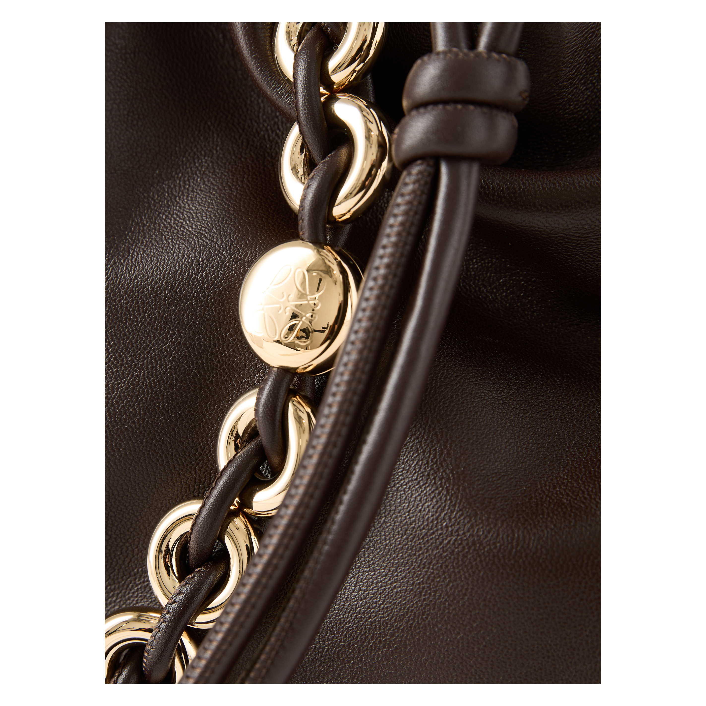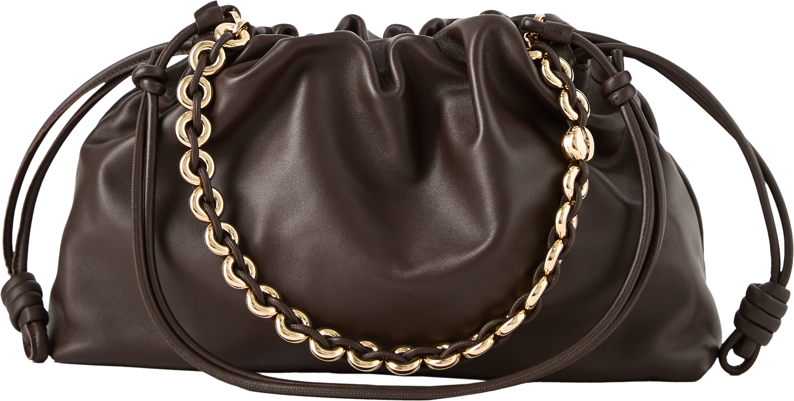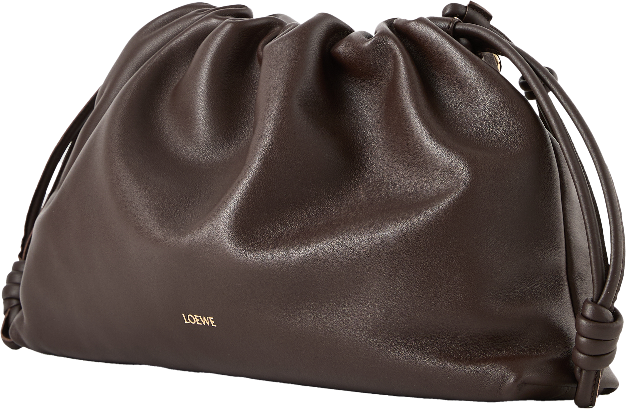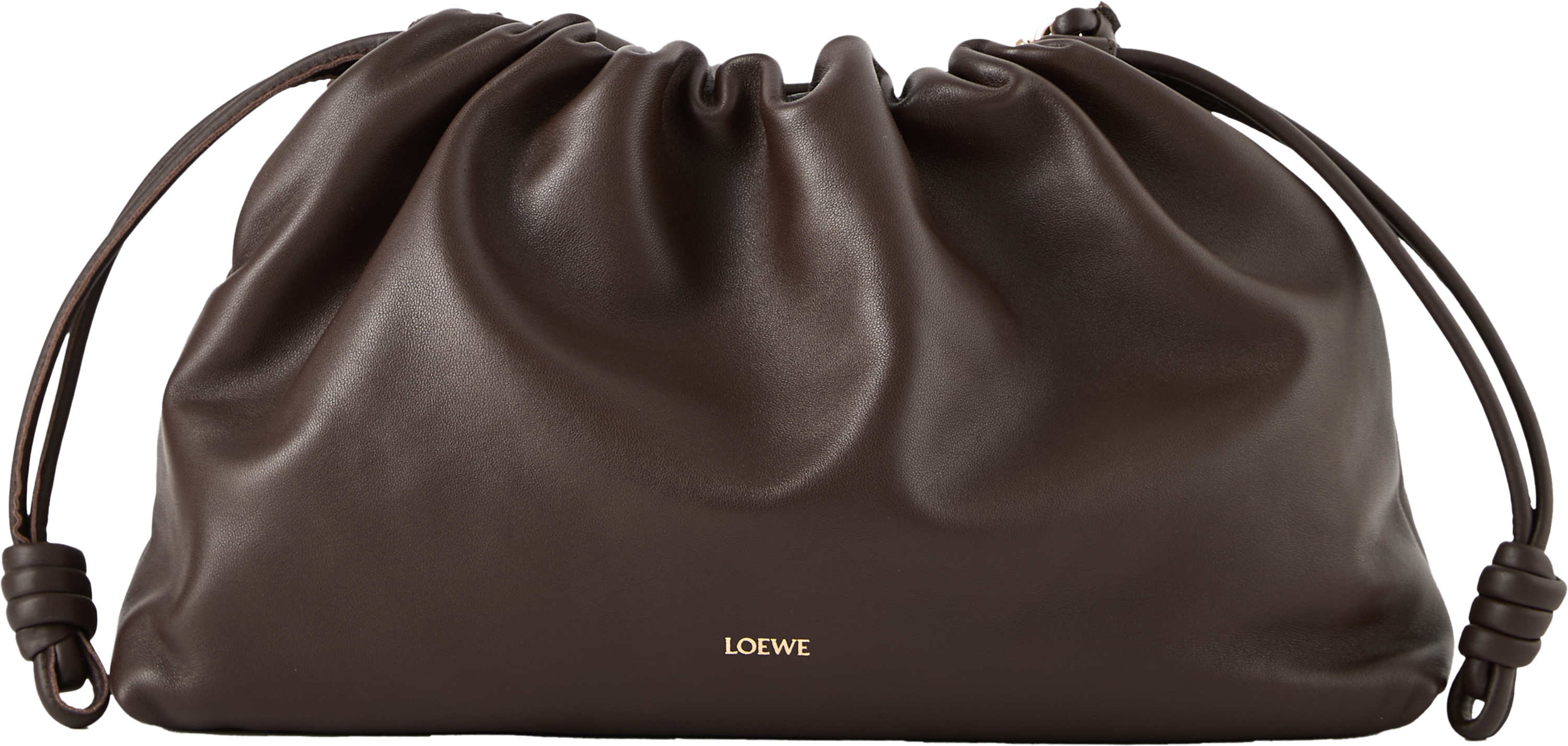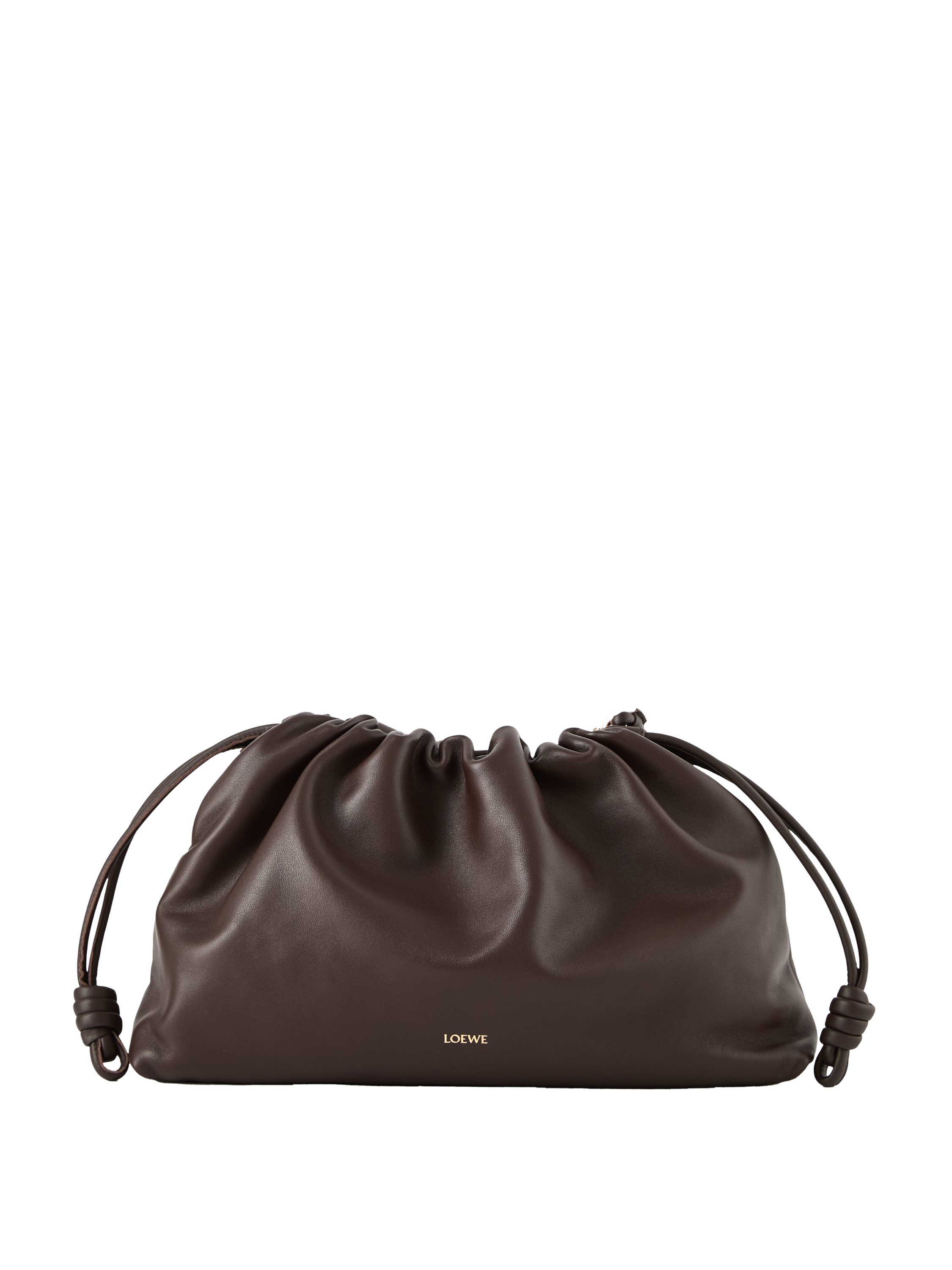 Die Clutch 'Flamenco Large' in Dark Brownie von LOEWE wurde aus samtigem Nappa-Lammleder gefertigt und besticht durch den Tunnelzug mit dem charakteristischen Knoten. Das geräumige Innenfach und das geschmeidige Material zeichnen das Modell aus. Die Clutch kann mit der Donut-Kette über der Schulter oder mit dem dazugehörigen Lederriemen als Umhängetasche getragen werden.