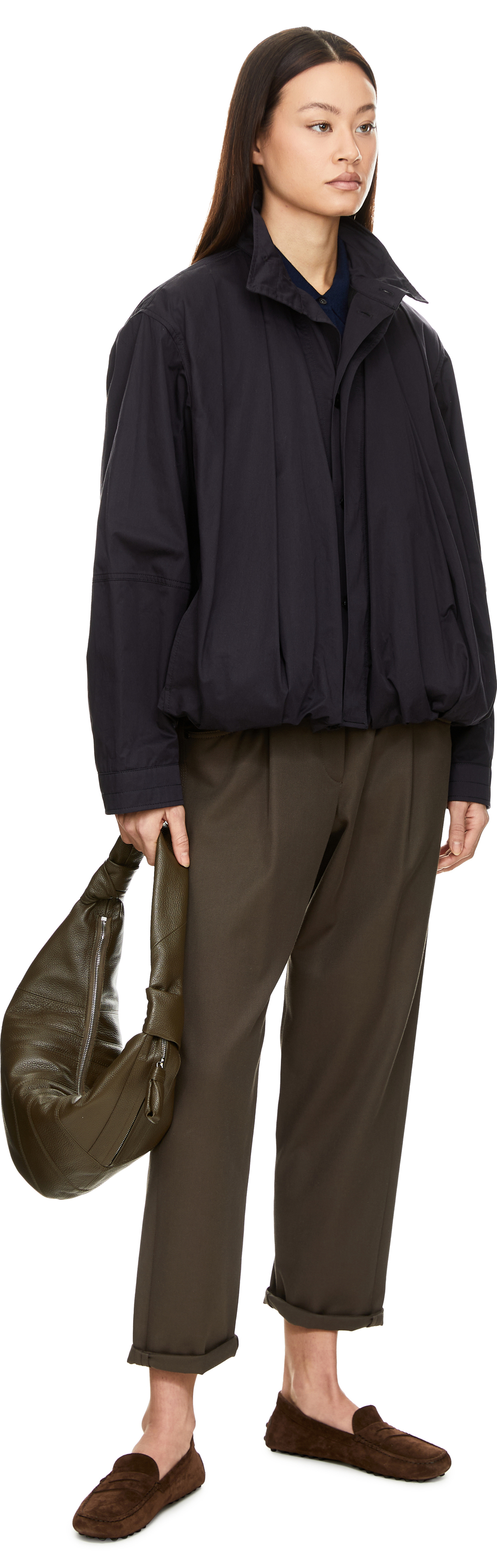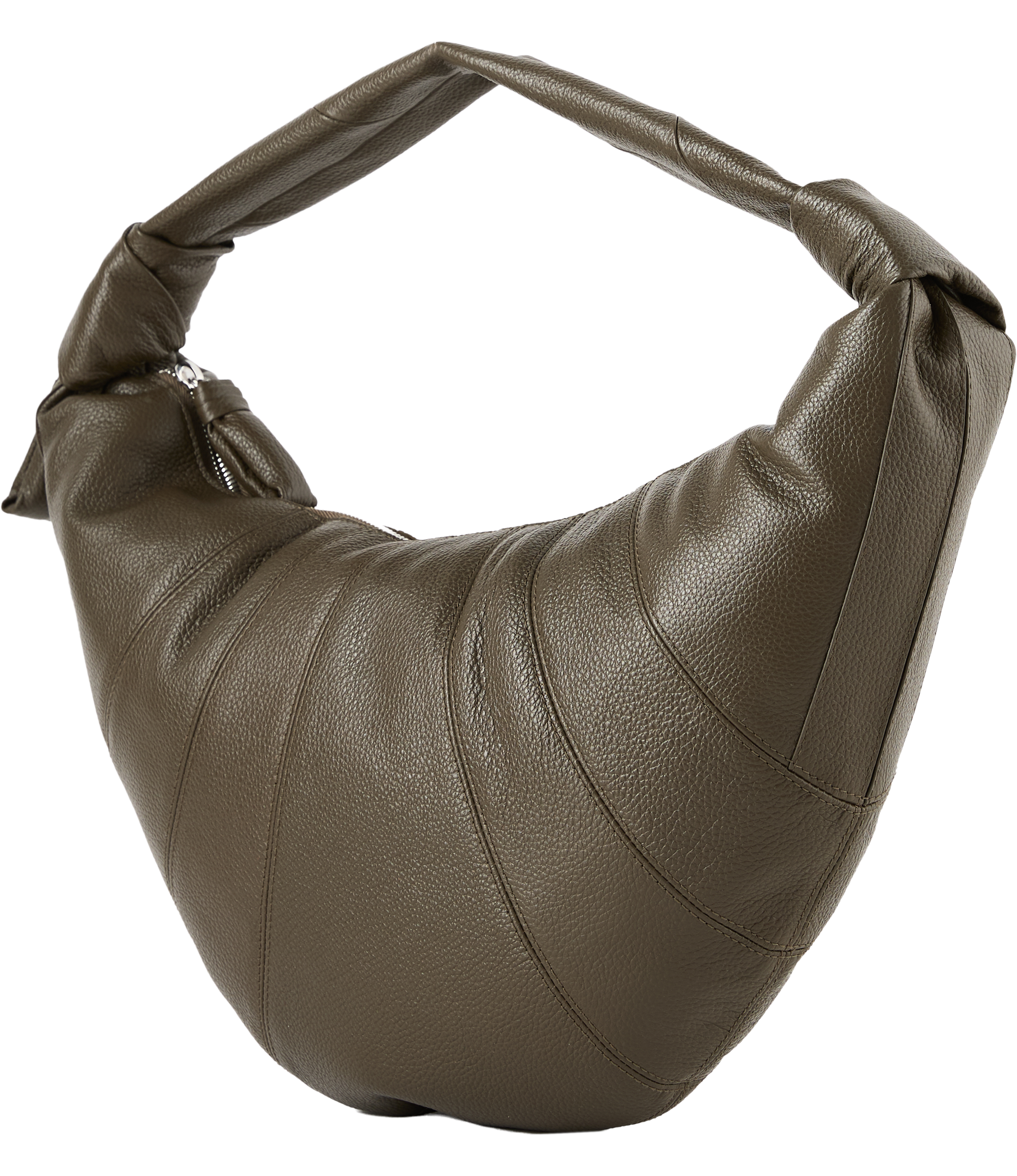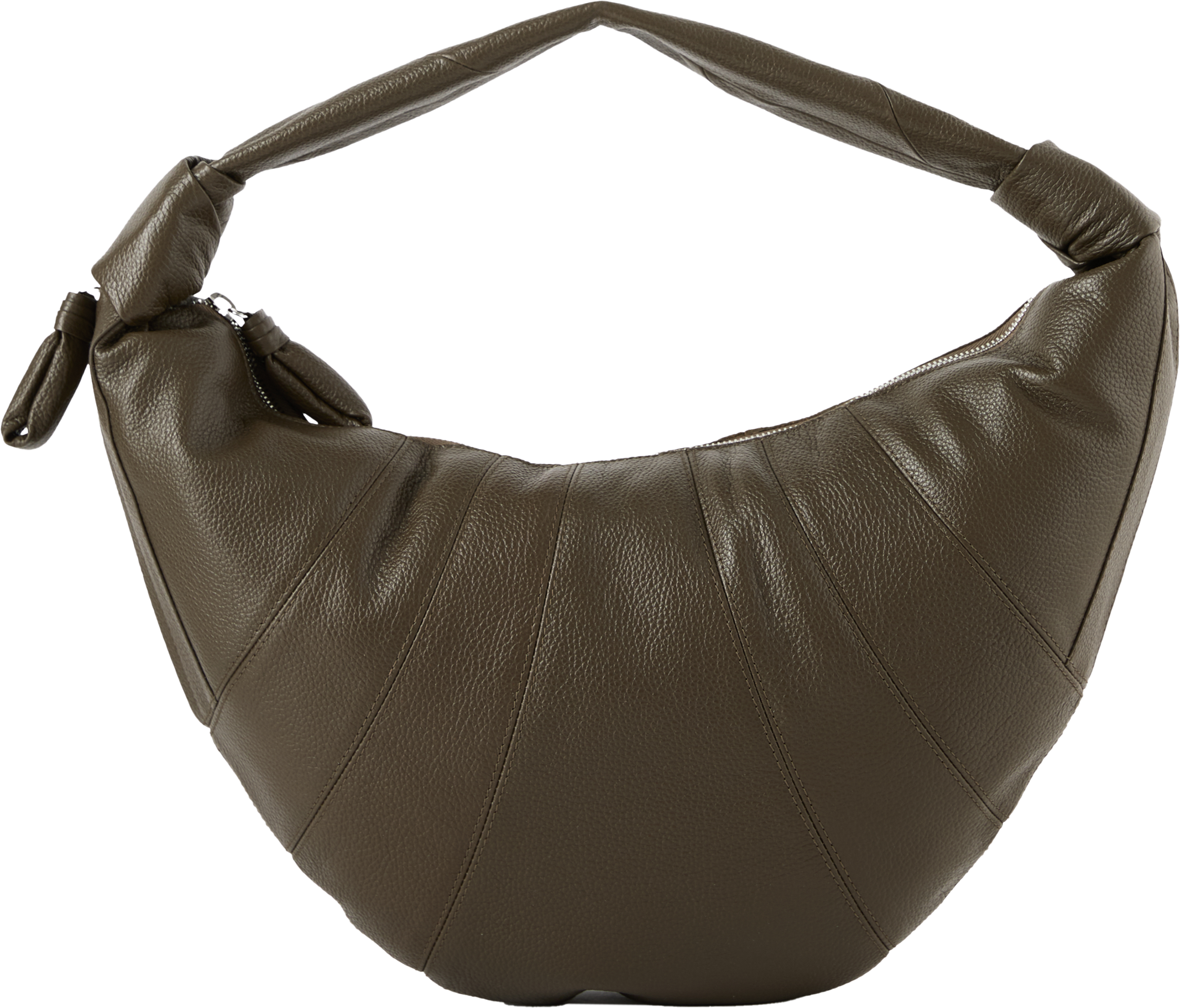 Die Tasche 'Fortune Croissant' in Olive von Lemaire wurde aus genarbtem Rindsleder gefertigt und besticht durch die Halbmond-Silhouette, inspiriert von der kultigen Croissant-Line von Lemaire. Genähte Einsätze und die Knotenverzierung an den Griffen verleihen dem Design eine dekorative Note. Das geräumige Innenfach mit integriertem Kartenfach und die seitliche Reißverschlusstasche mit gesteppter Zuglasche sorgen für praktischen Stauraum. Das Modell lässt sich sowohl in der Hand als auch über der Schulter tragen.