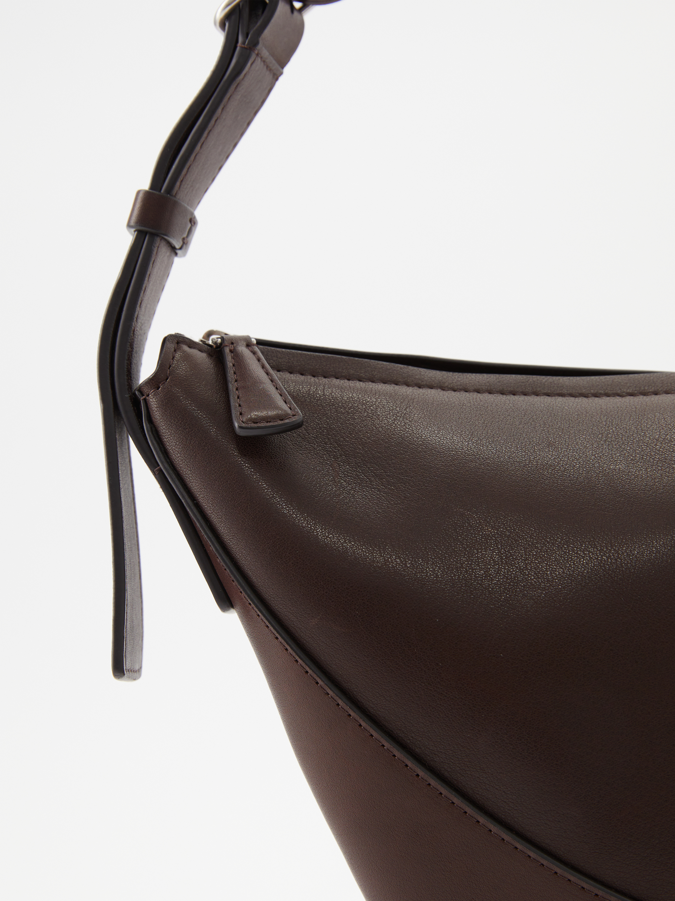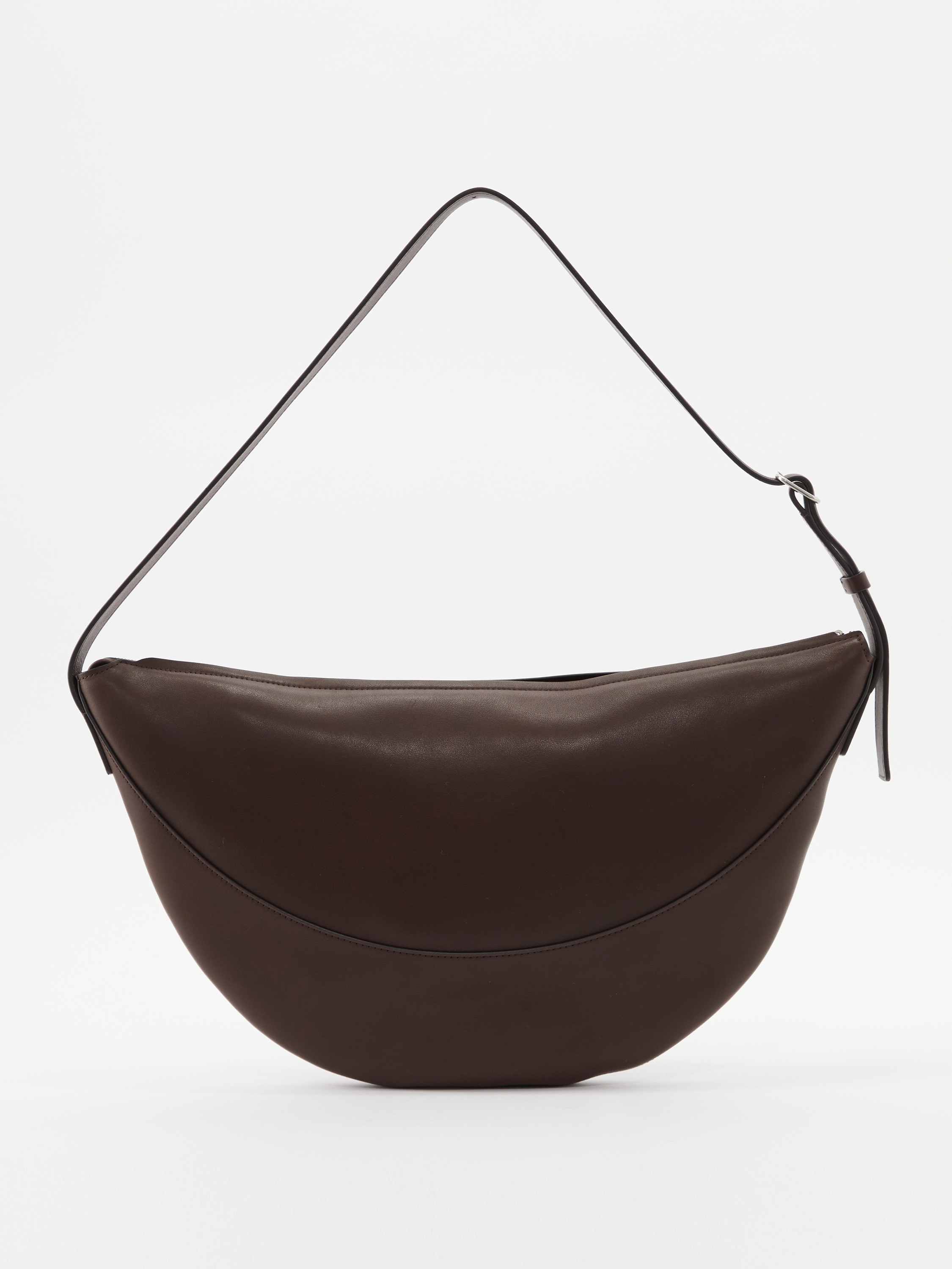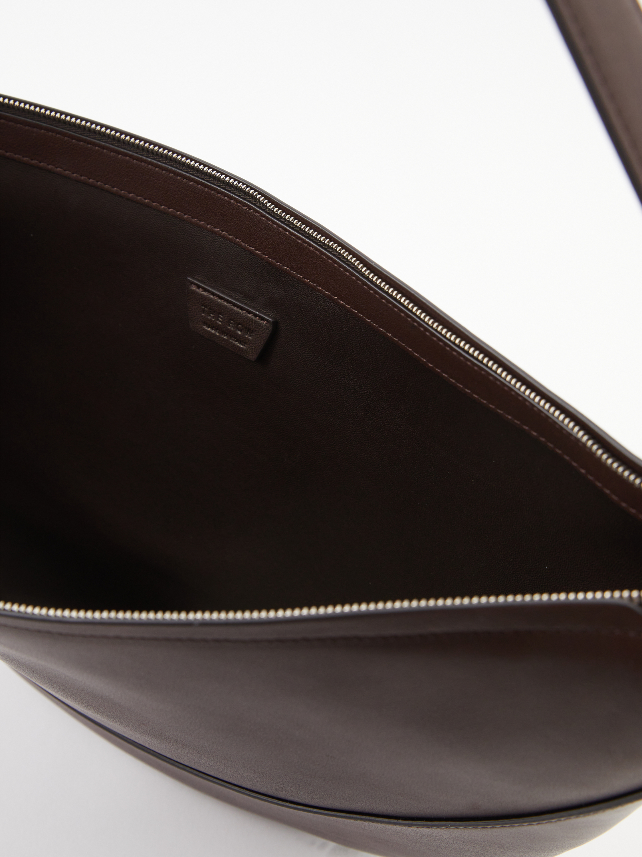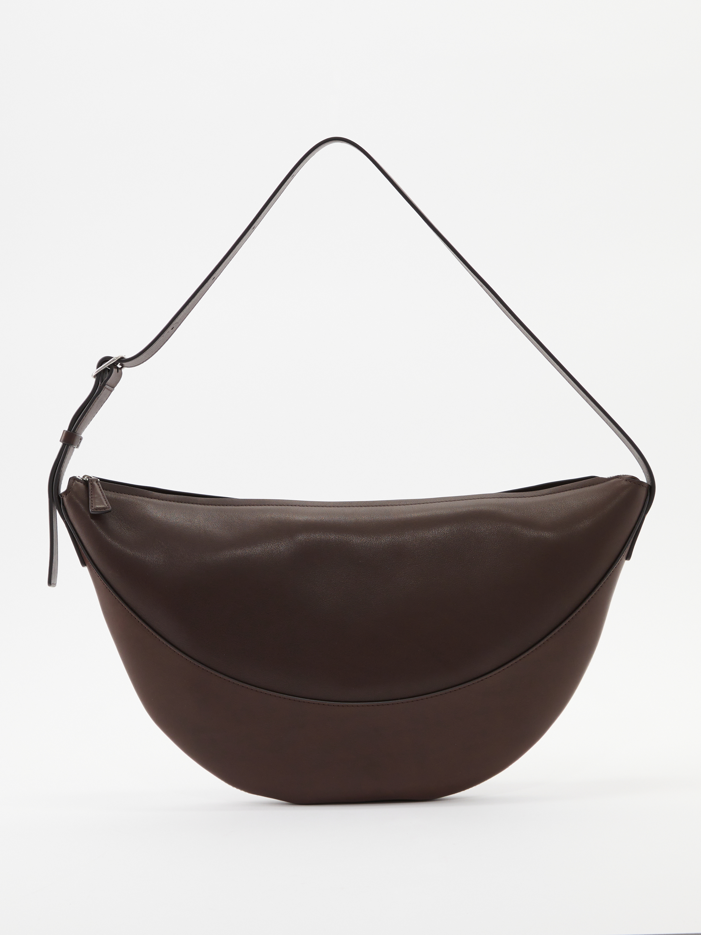 Die Umhängetasche 'Jouve' in Dunkelbraun von The Row wurde aus glattem Nappa-Kalbsleder gefertigt und besticht durch klare Linien, eine halbmondförmige Silhouette und makellose Verarbeitung. Der integrierte Riemen lässt sich verstellen, um die Tasche über der Schulter oder crossbody zu tragen.