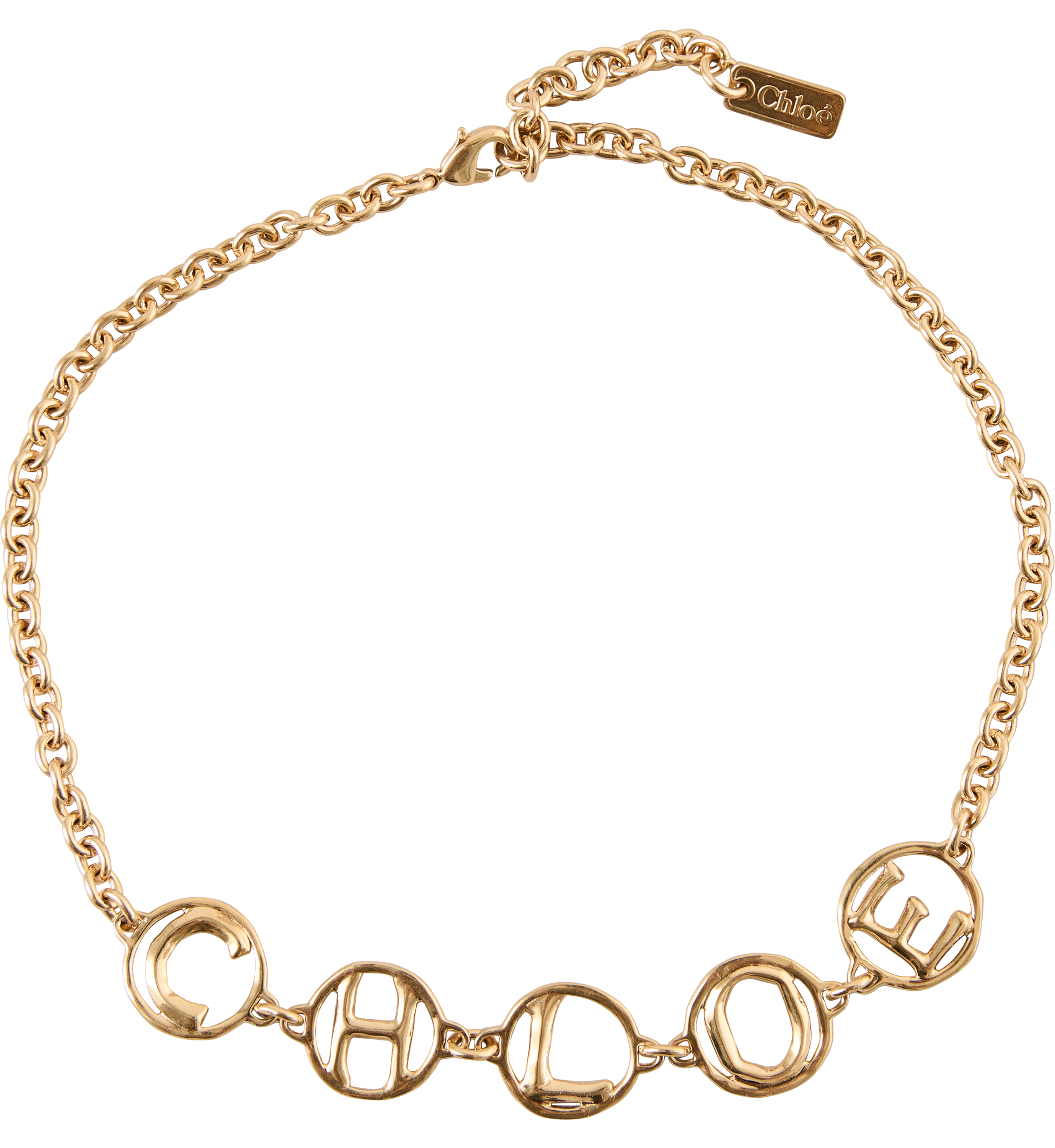 The 'Script Choker' necklace in vintage gold from Chloé is crafted from gold-coloured brass in a vintage style. Circled Chloé letters with a hammered finish and a gold-coloured Chloé logo plaque in soft handwriting complete the creation, which is rounded off by accentuated pendants on the chain.