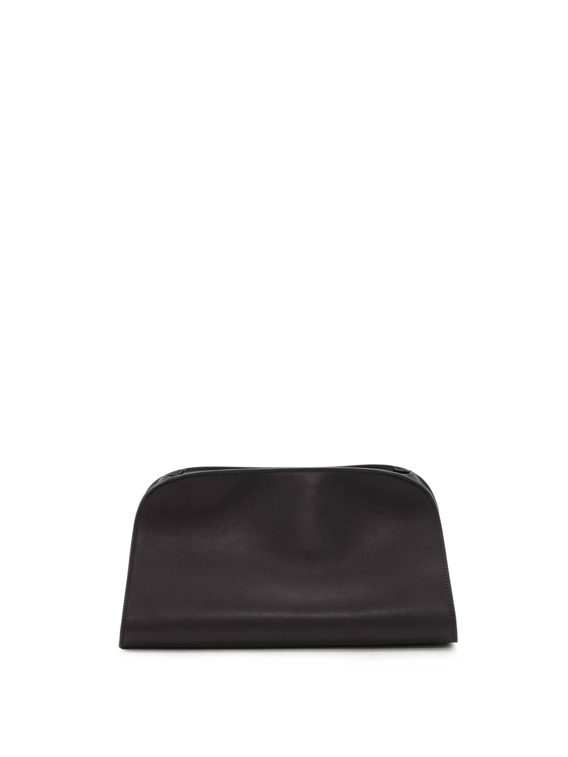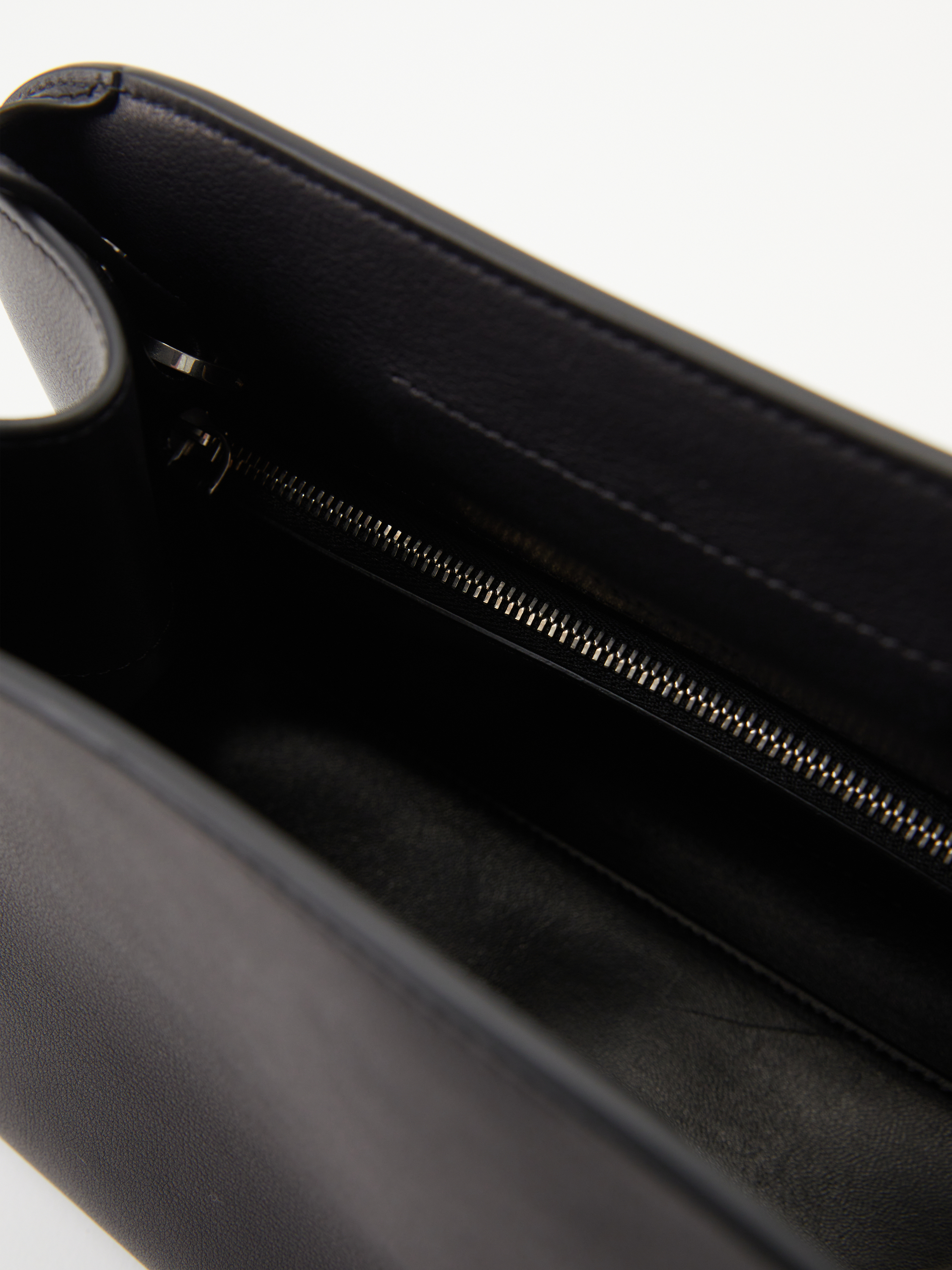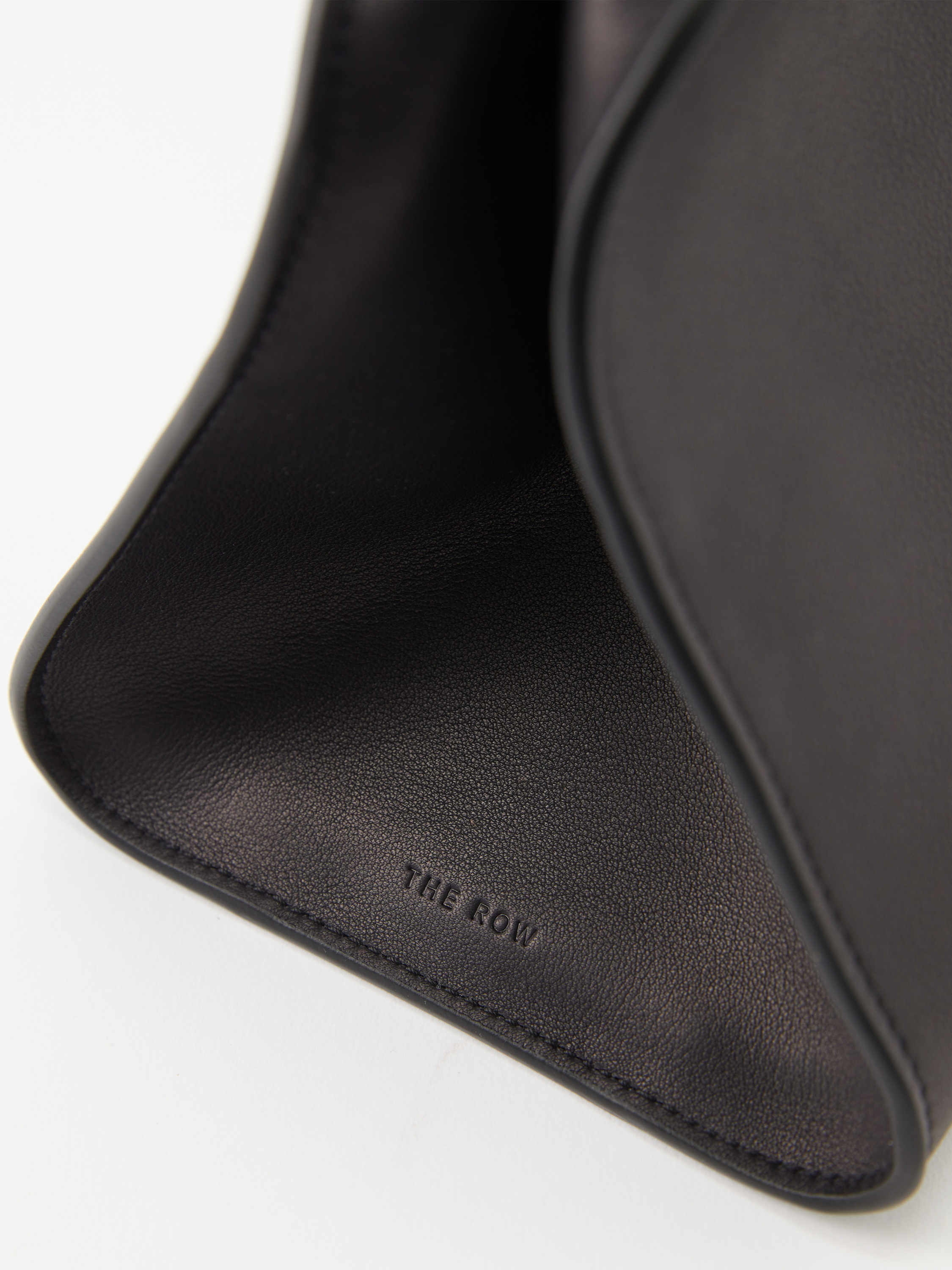 The 'Peggy' clutch in black from The Row is made from polished saddle leather and stands out with its compact silhouette and magnetic fastening. A spacious inner compartment provides plenty of storage space. The slim, detachable shoulder strap allows 'Peggy' to be carried comfortably over the shoulder.