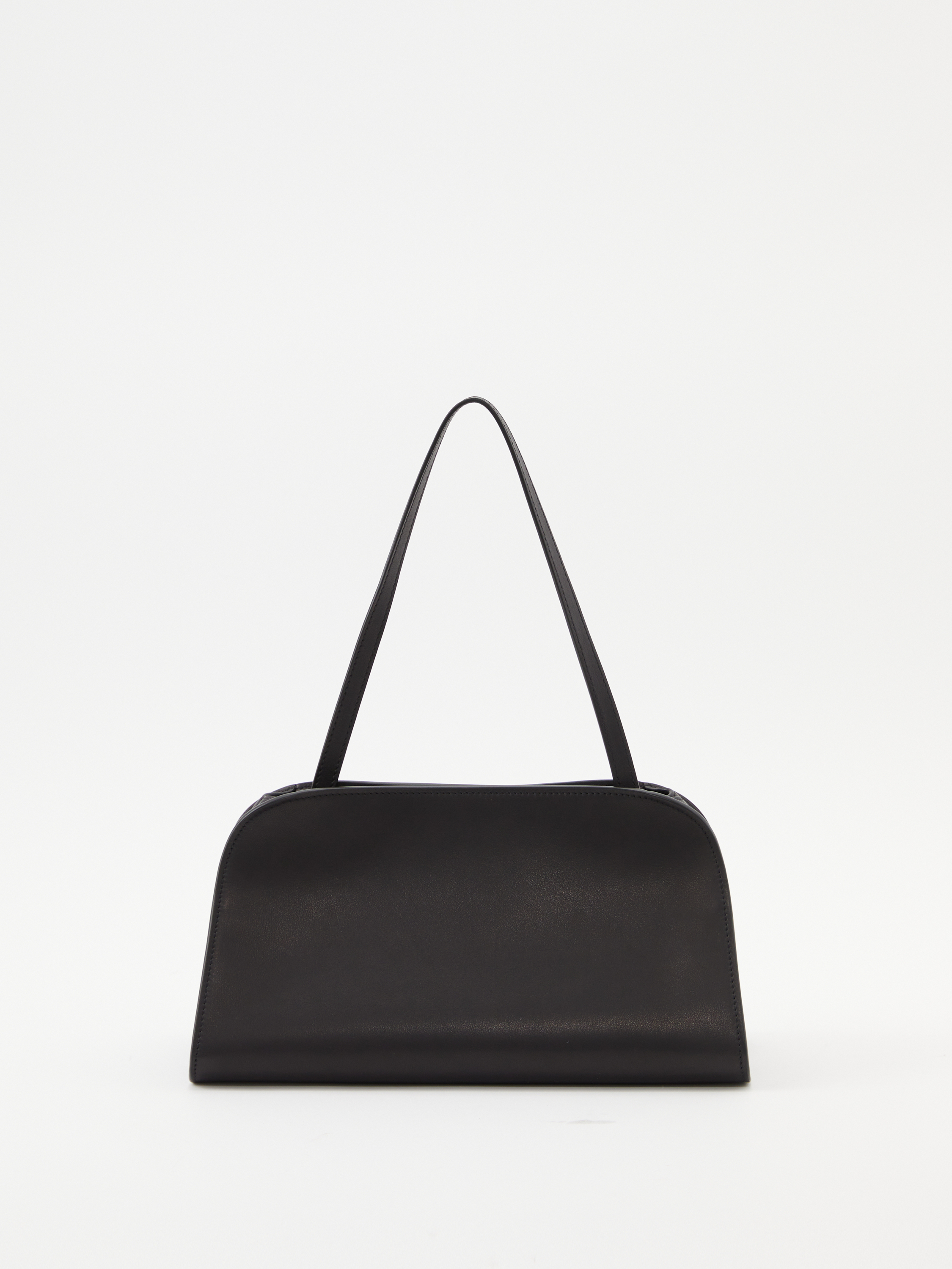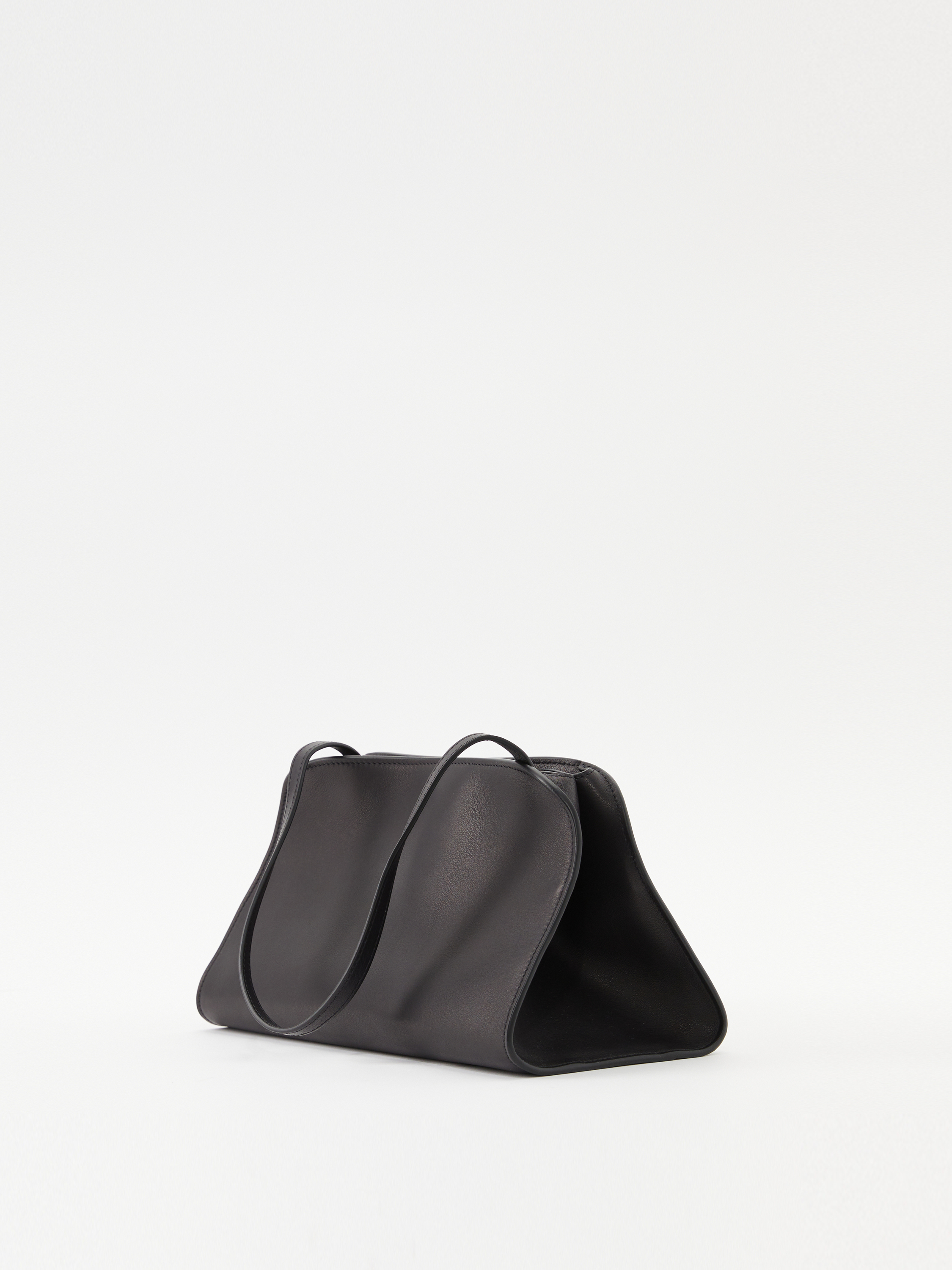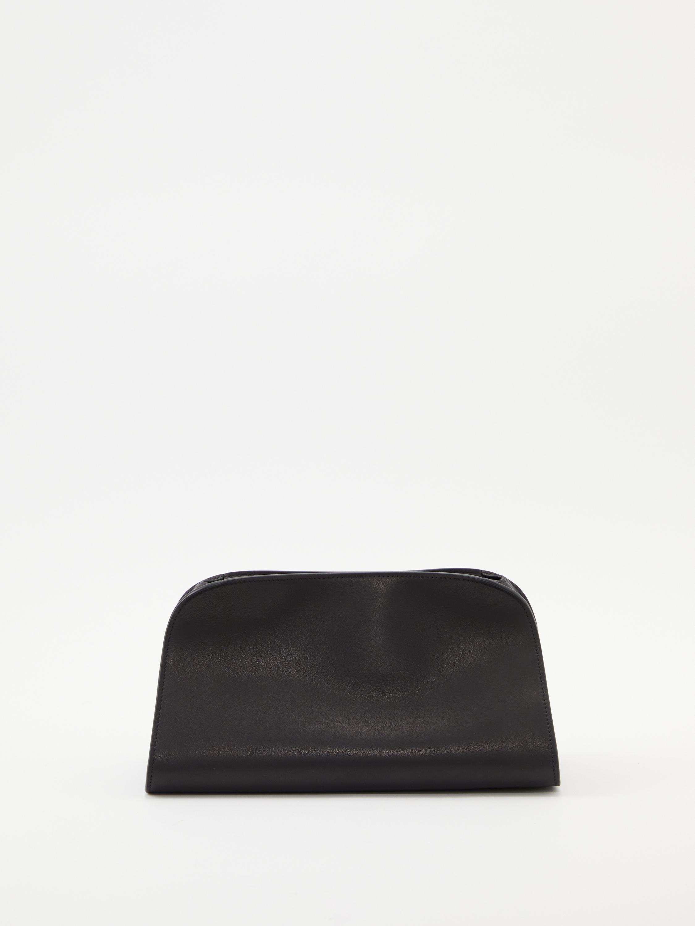 The 'Peggy' clutch in black from The Row is made from polished saddle leather and stands out with its compact silhouette and magnetic fastening. A spacious inner compartment provides plenty of storage space. The slim, detachable shoulder strap allows 'Peggy' to be carried comfortably over the shoulder.