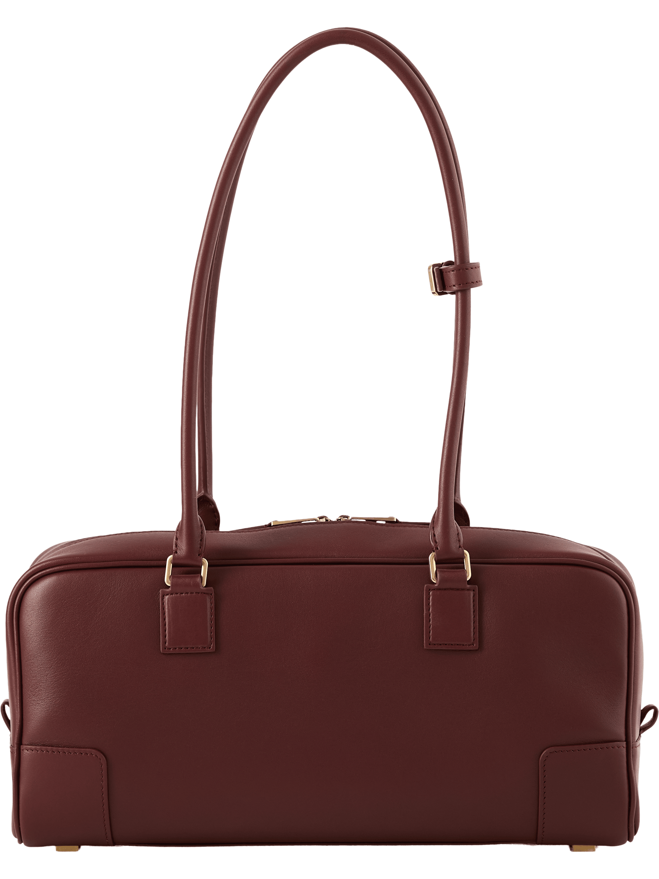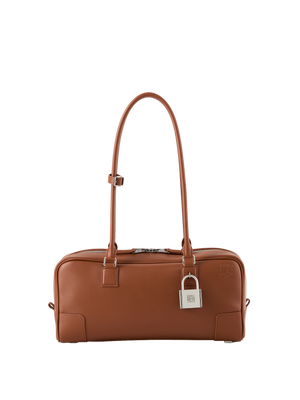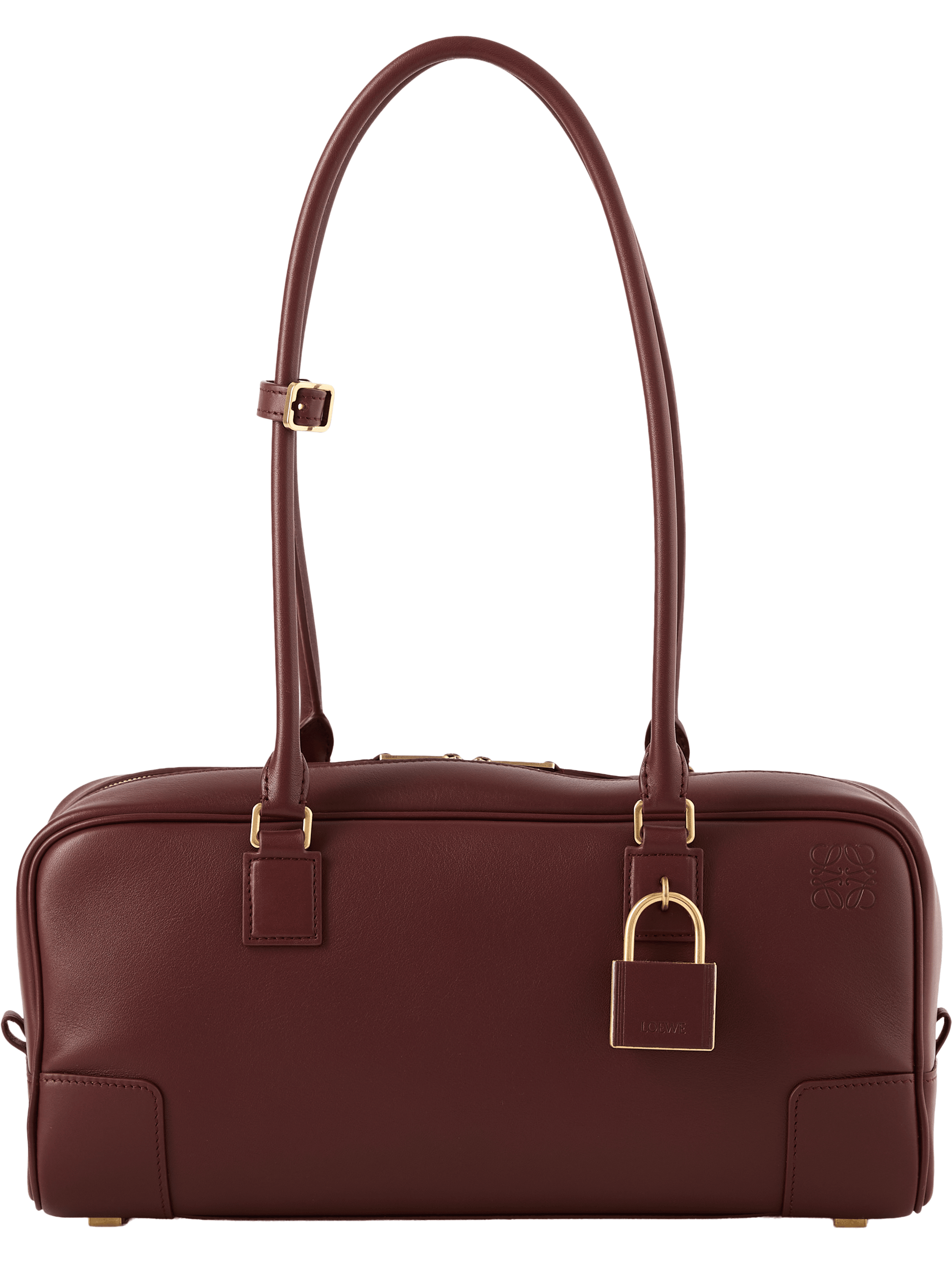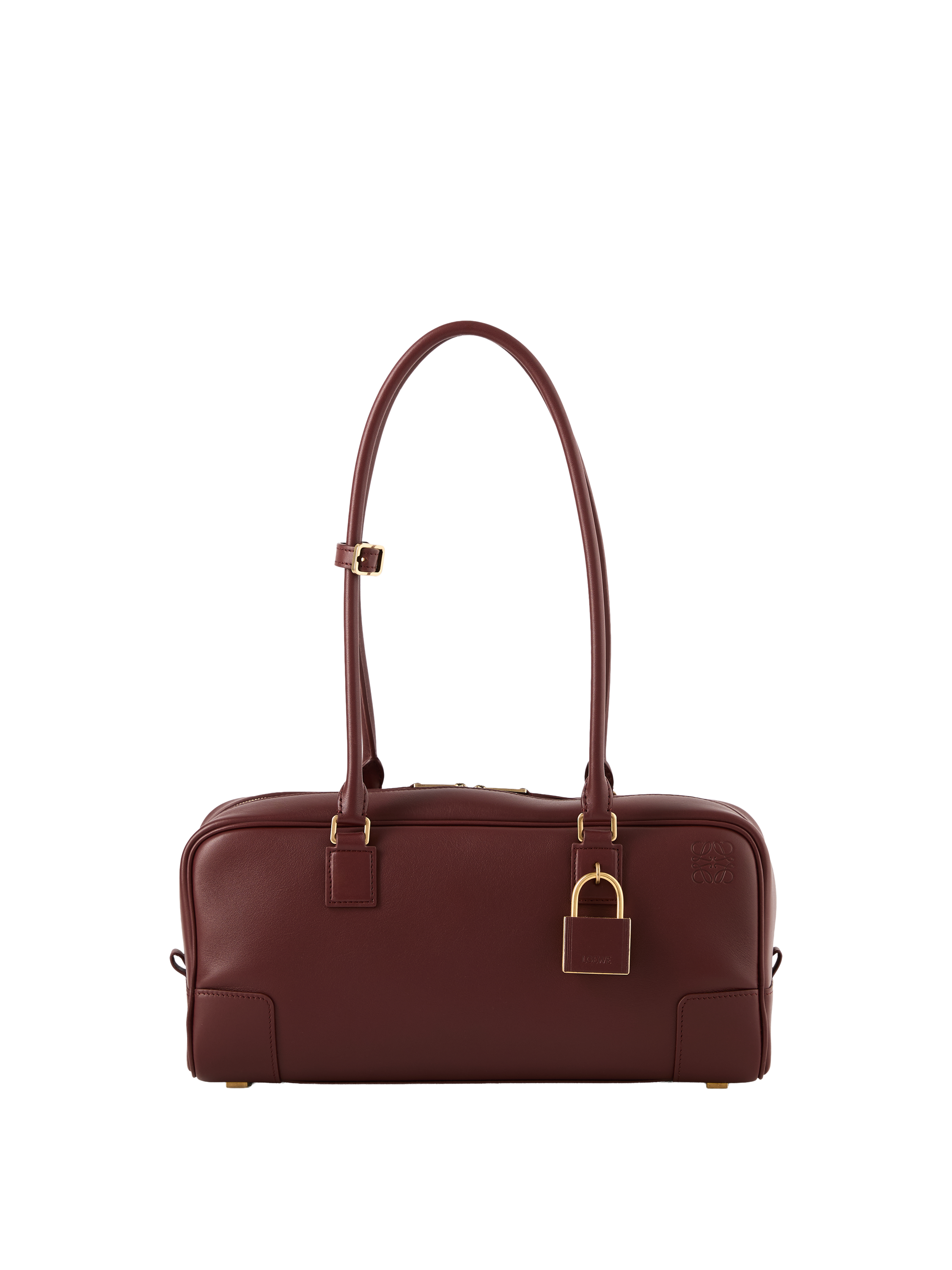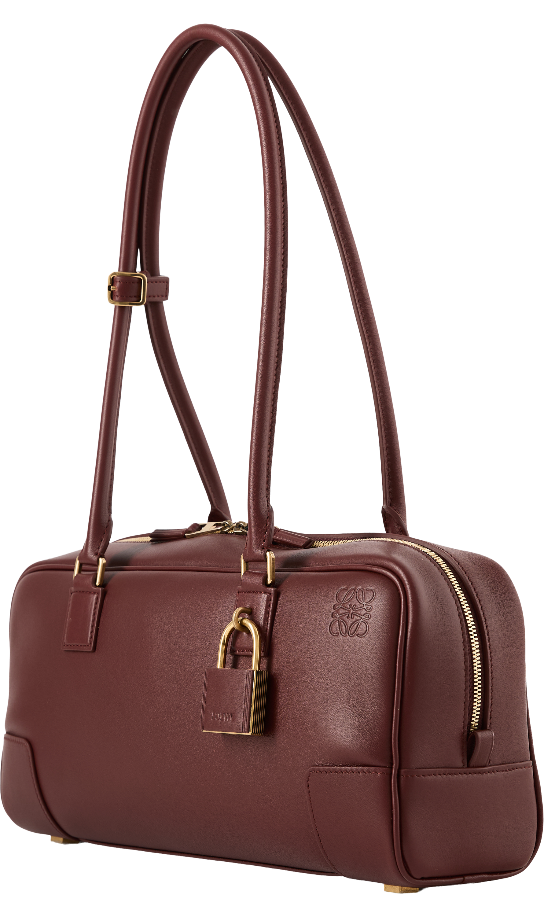 The 'Amazona 31' handbag in mahogany from LOEWE is made from shiny calfskin and impresses with its elongated bowling bag silhouette. The anagram embossing on the front and the characteristic padlock add elegant accents and create a stylish eye-catcher. The design is functionally complemented by the carrying handles, which can be extended with detachable shoulder straps if required.