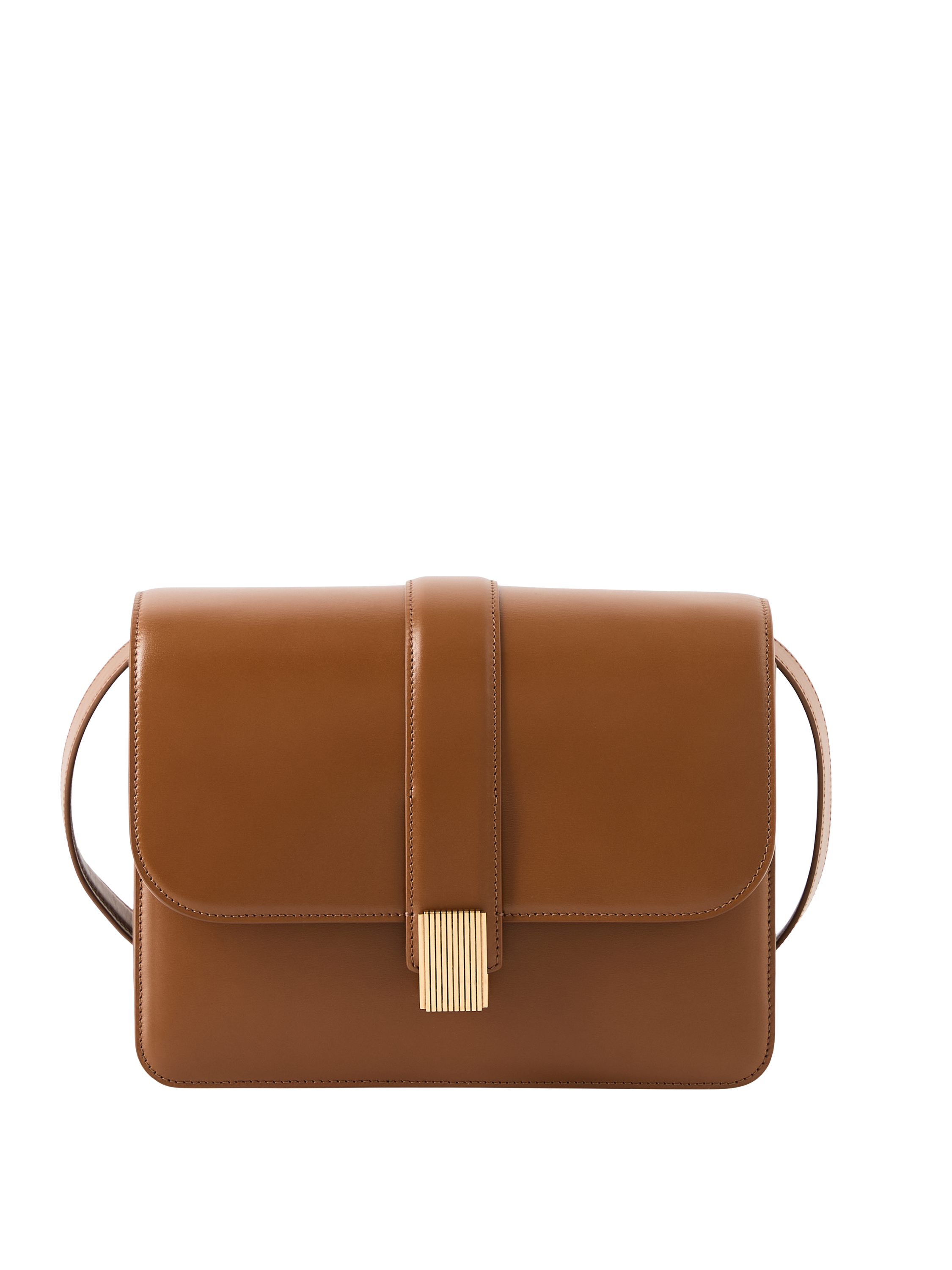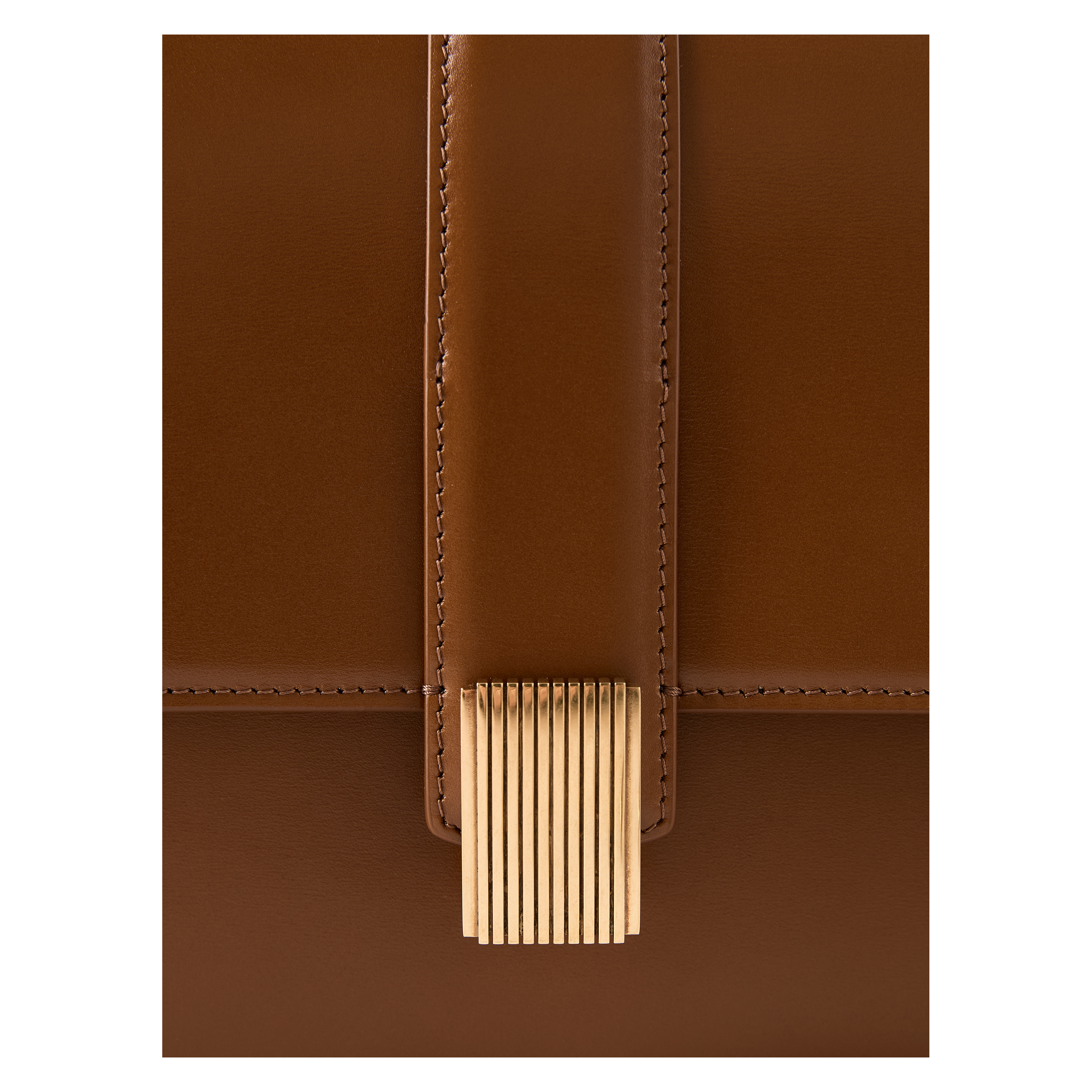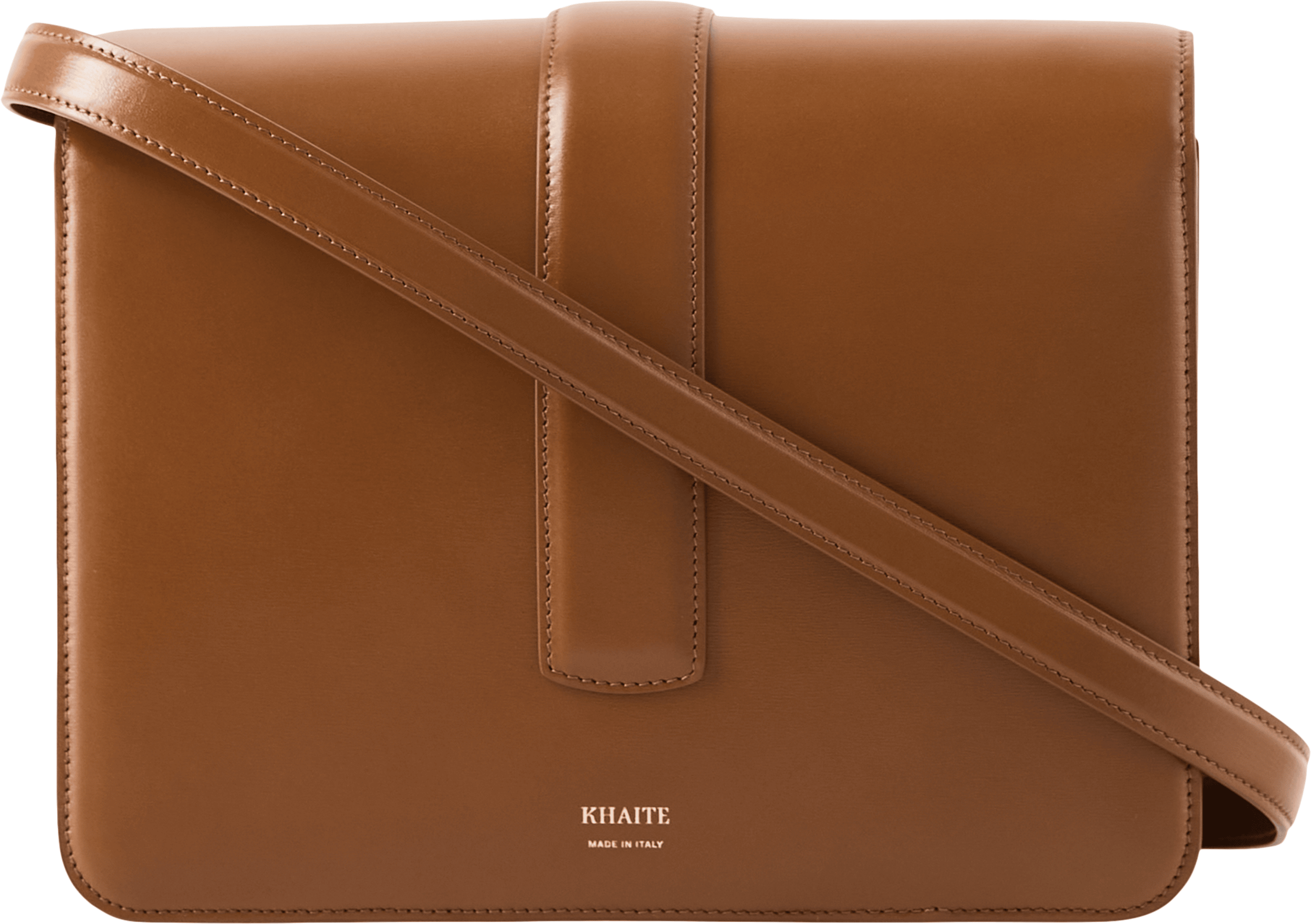 The 'Blake' shoulder bag in brown by Khaite is made from high-quality calfskin and has a captivating box shape. The flap with twist fastening, the three slip pockets and the adjustable and detachable shoulder strap for carrying over the shoulder or across the body round off the design.