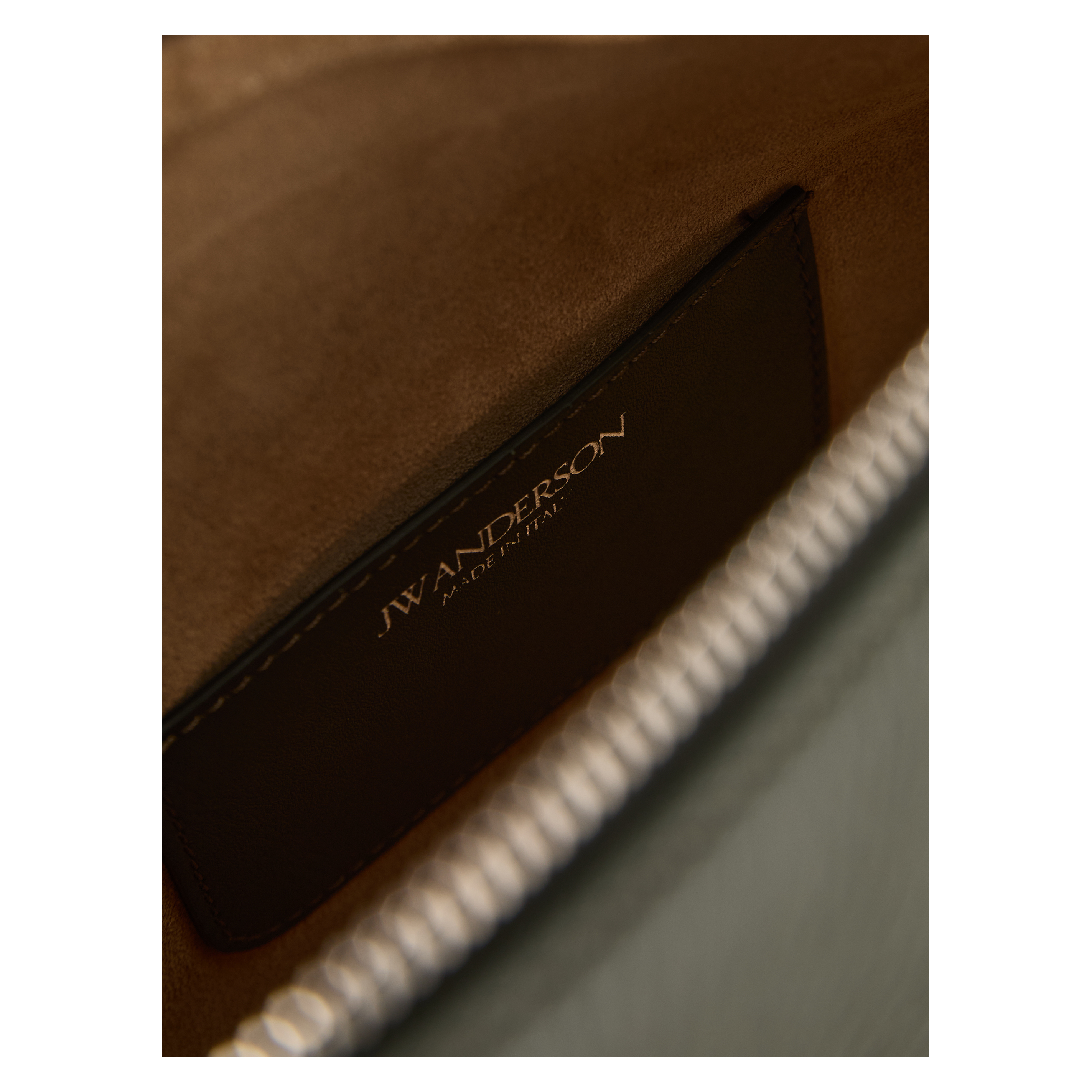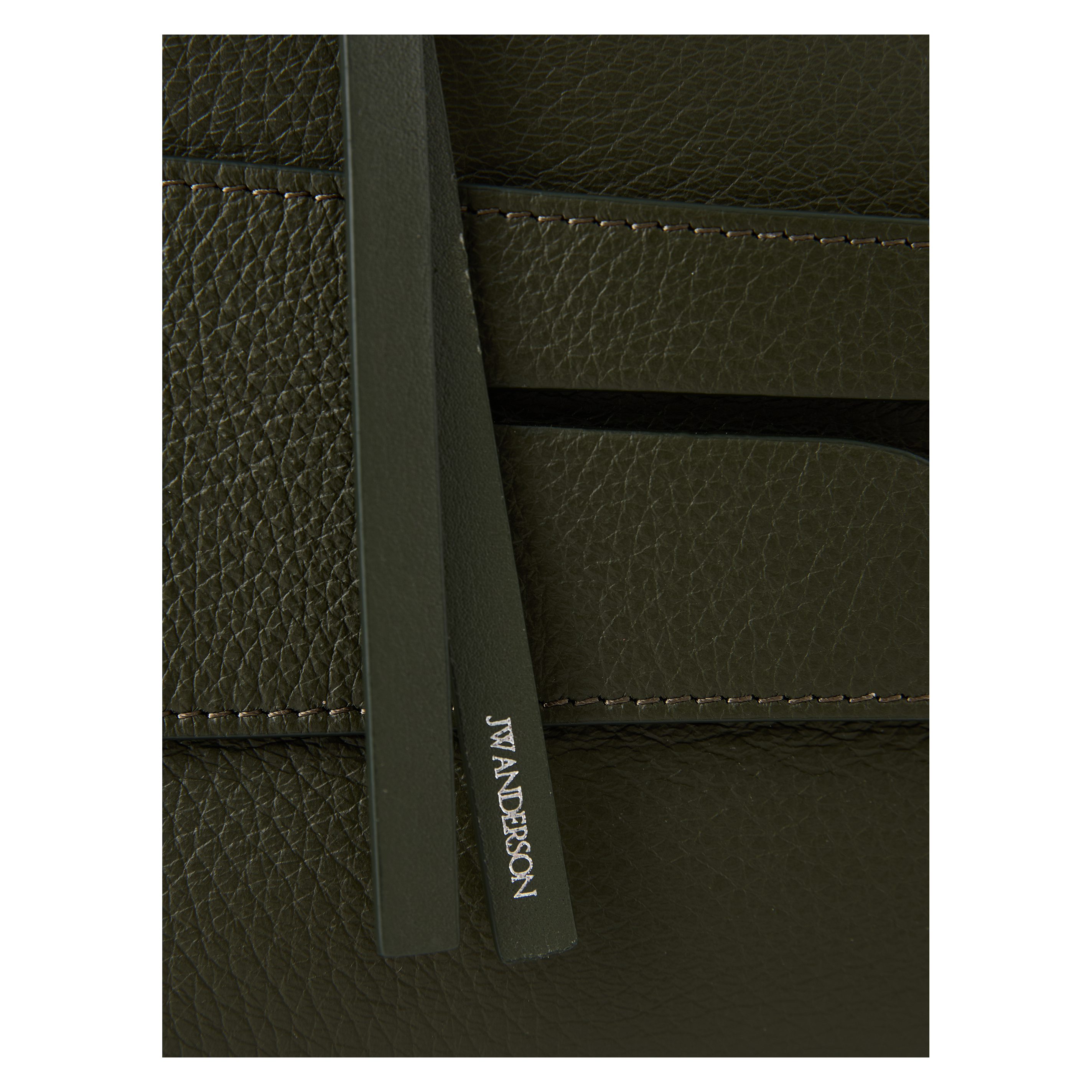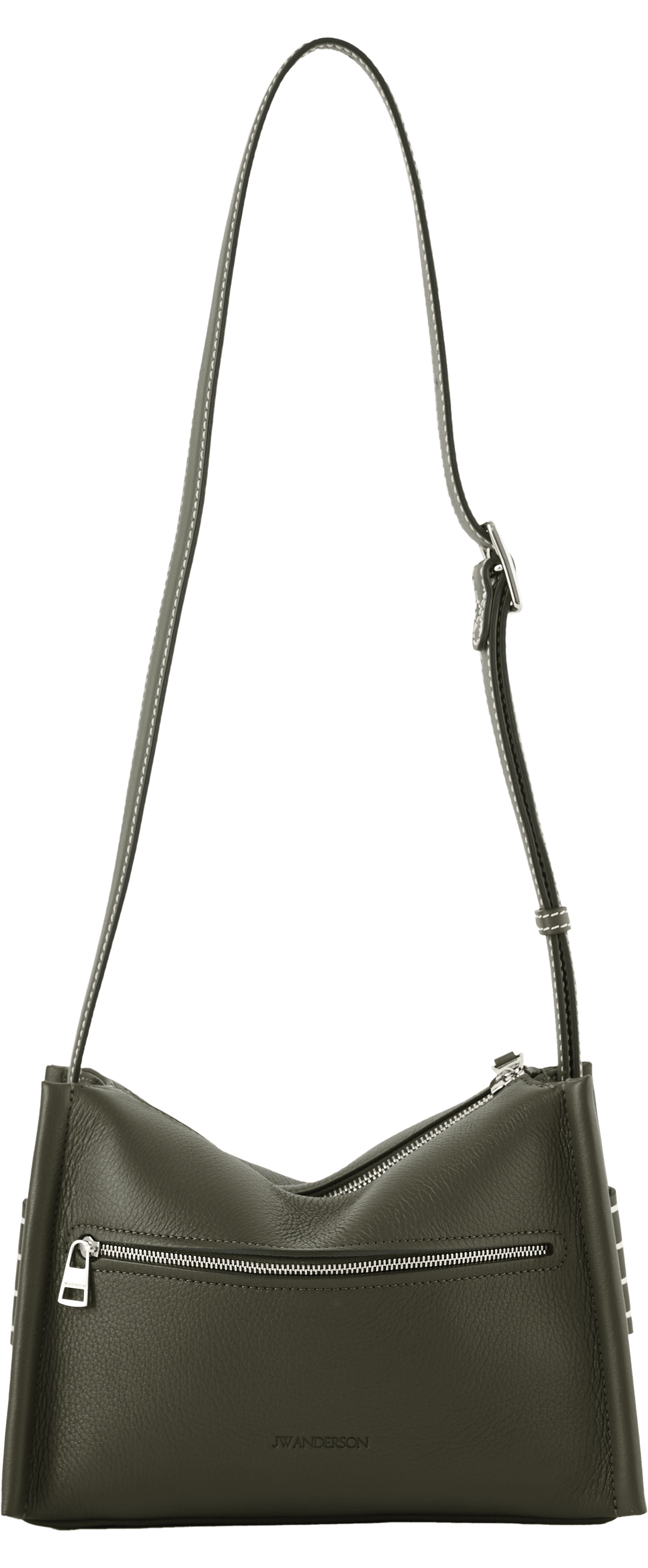 The 'Small Messenger Loafer' shoulder bag in khaki by JW Anderson is made from grained calfskin and stands out with its unique loafer look. The hand-stitched coin pocket and the decorative stitching, which is reminiscent of the welt stitching on a shoe, make the design special. The bag features silver-coloured hardware and a subtle embossed logo on the front.