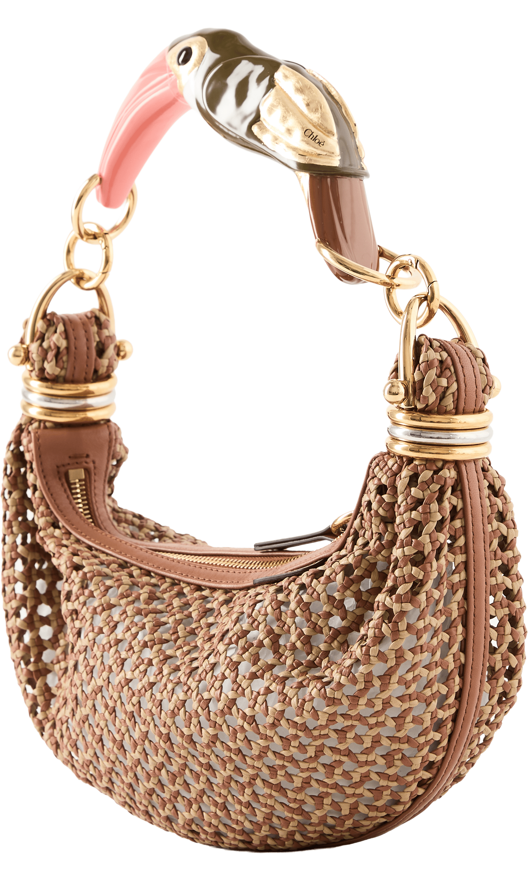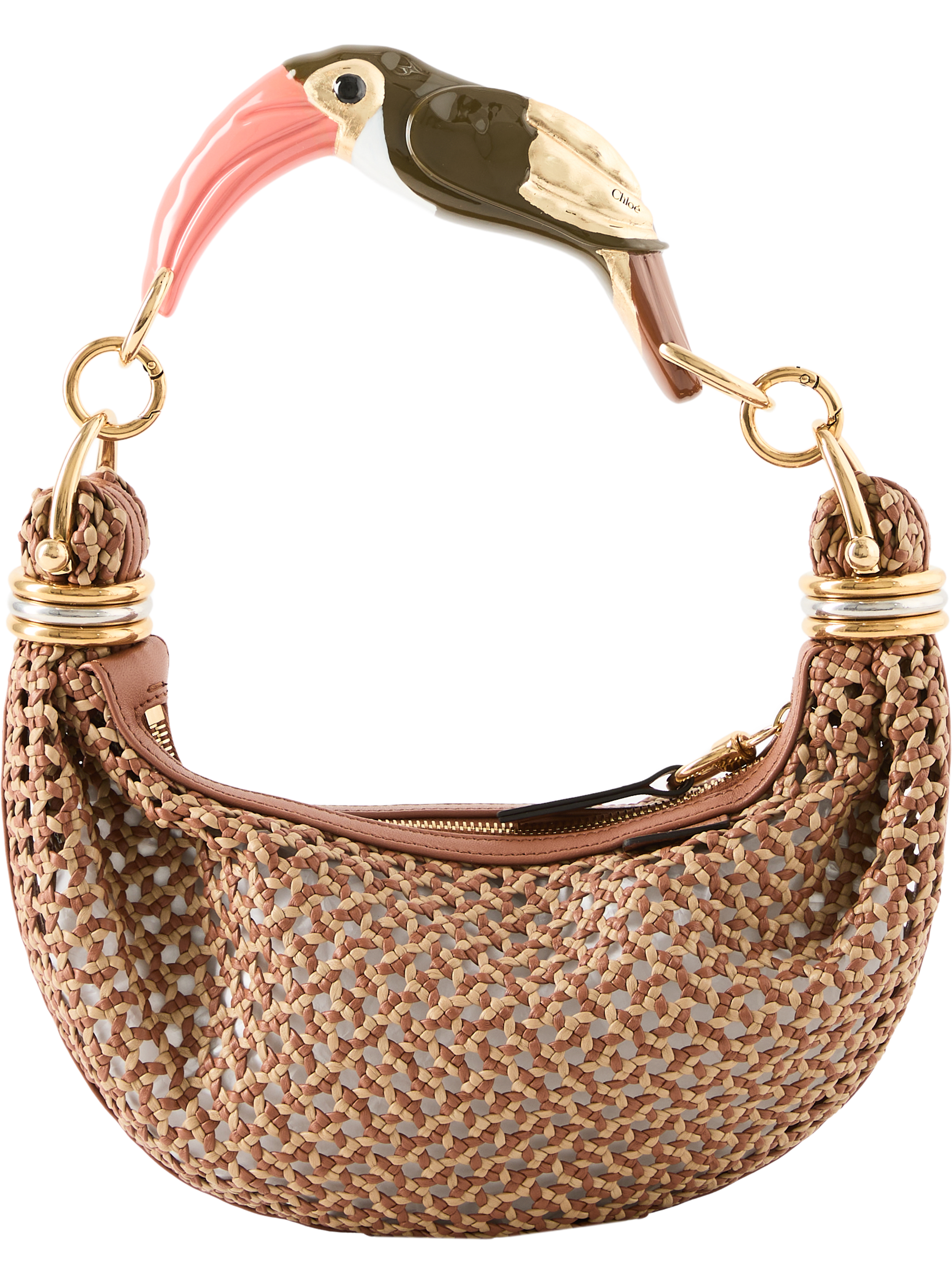 The 'Bracelet' bag in boyish brown by Chloé is made from hand-woven lambskin leather and impresses with its curved silhouette. It takes up to 13 hours to make this model, which impressively emphasises the intricate craftsmanship. Stacked, two-coloured rings and the painted toucan handle with hand-lacquered gold details give the design its characteristic look. The model can be carried by hand or over the shoulder.