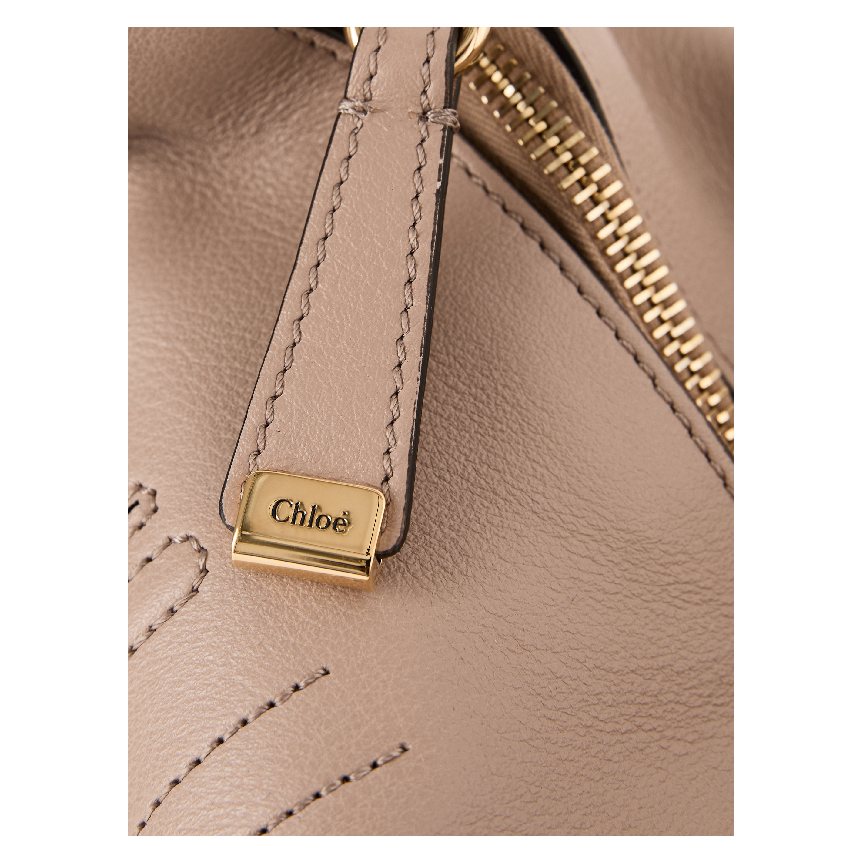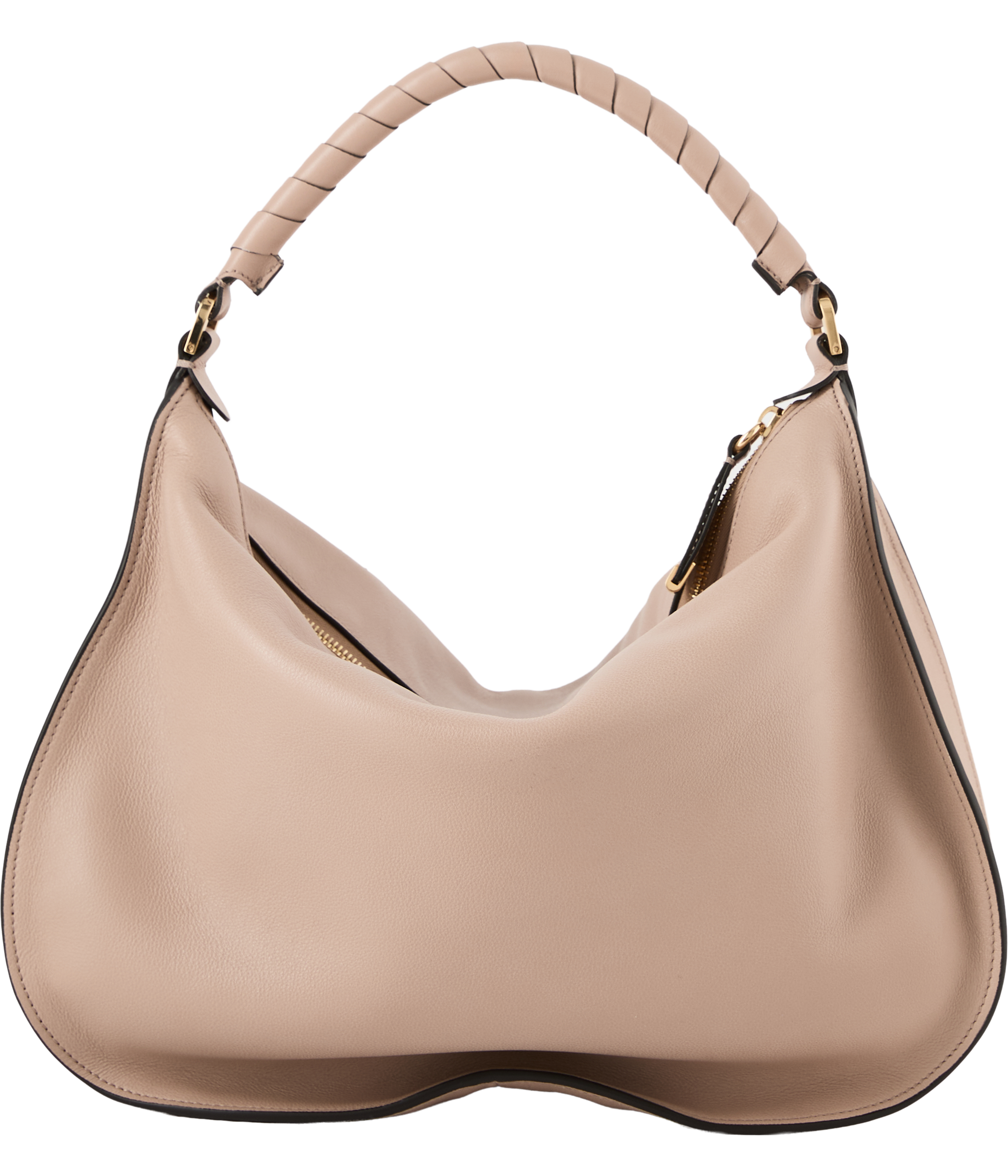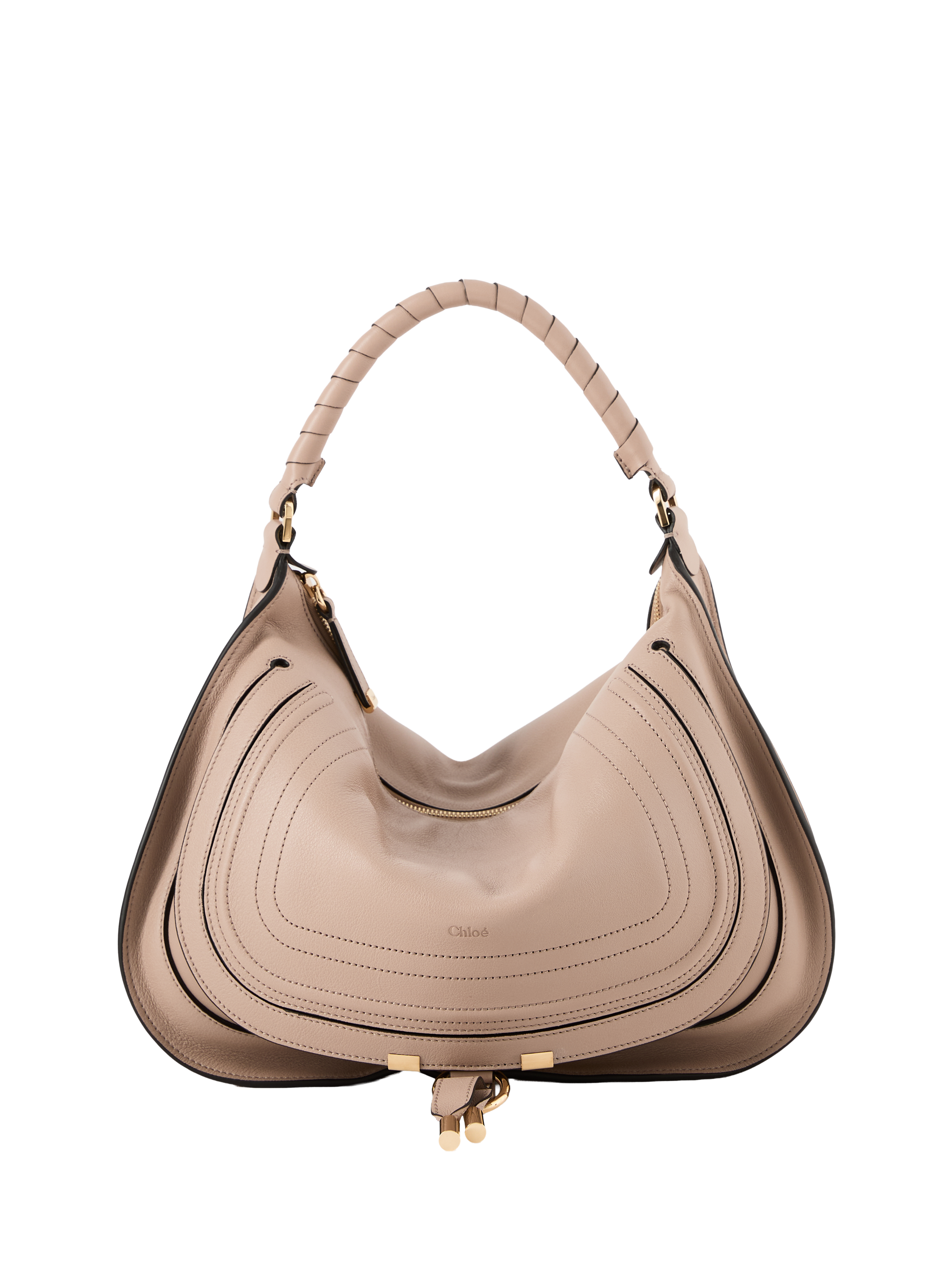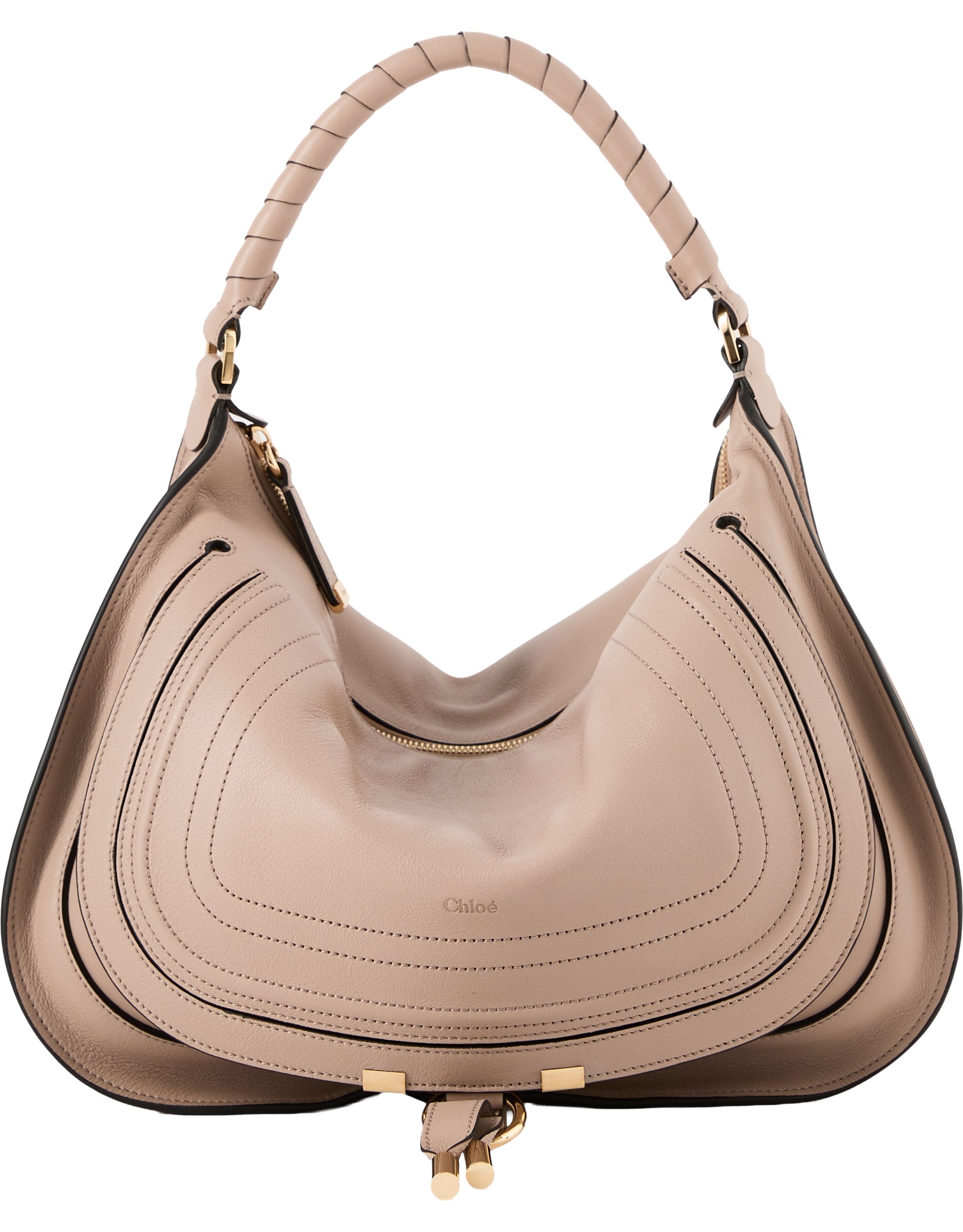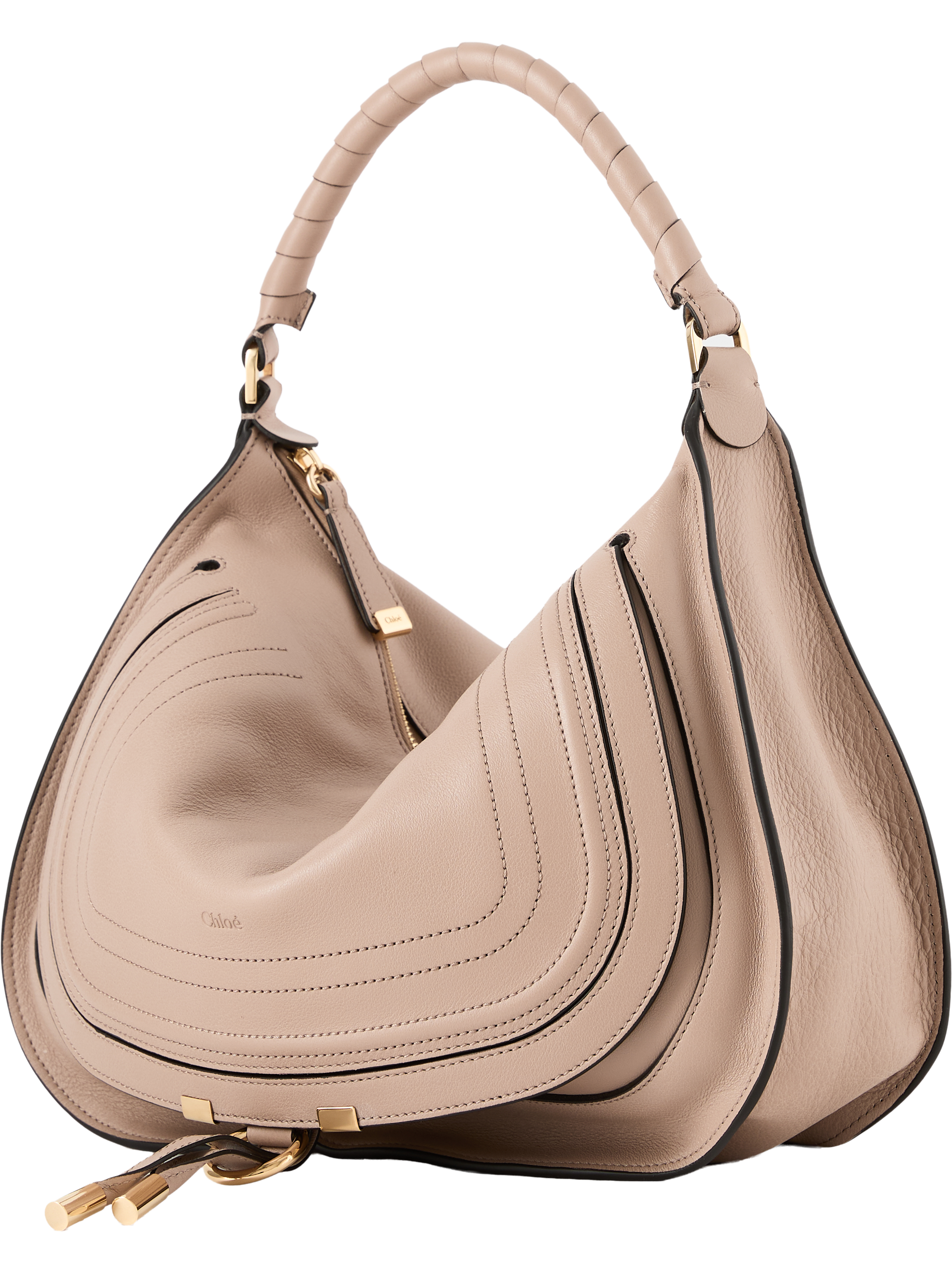 The 'Marcie Hobo' handbag from Chloé in Woodsmoke is made from smooth calfskin and impresses with its reinterpretation of the iconic day bag with a looser shape. The saddle stitching, the single hand-wrapped handle and the gold-coloured hardware make the bag a sporty, elegant classic. The line's hanging leather tassels close the flap.
