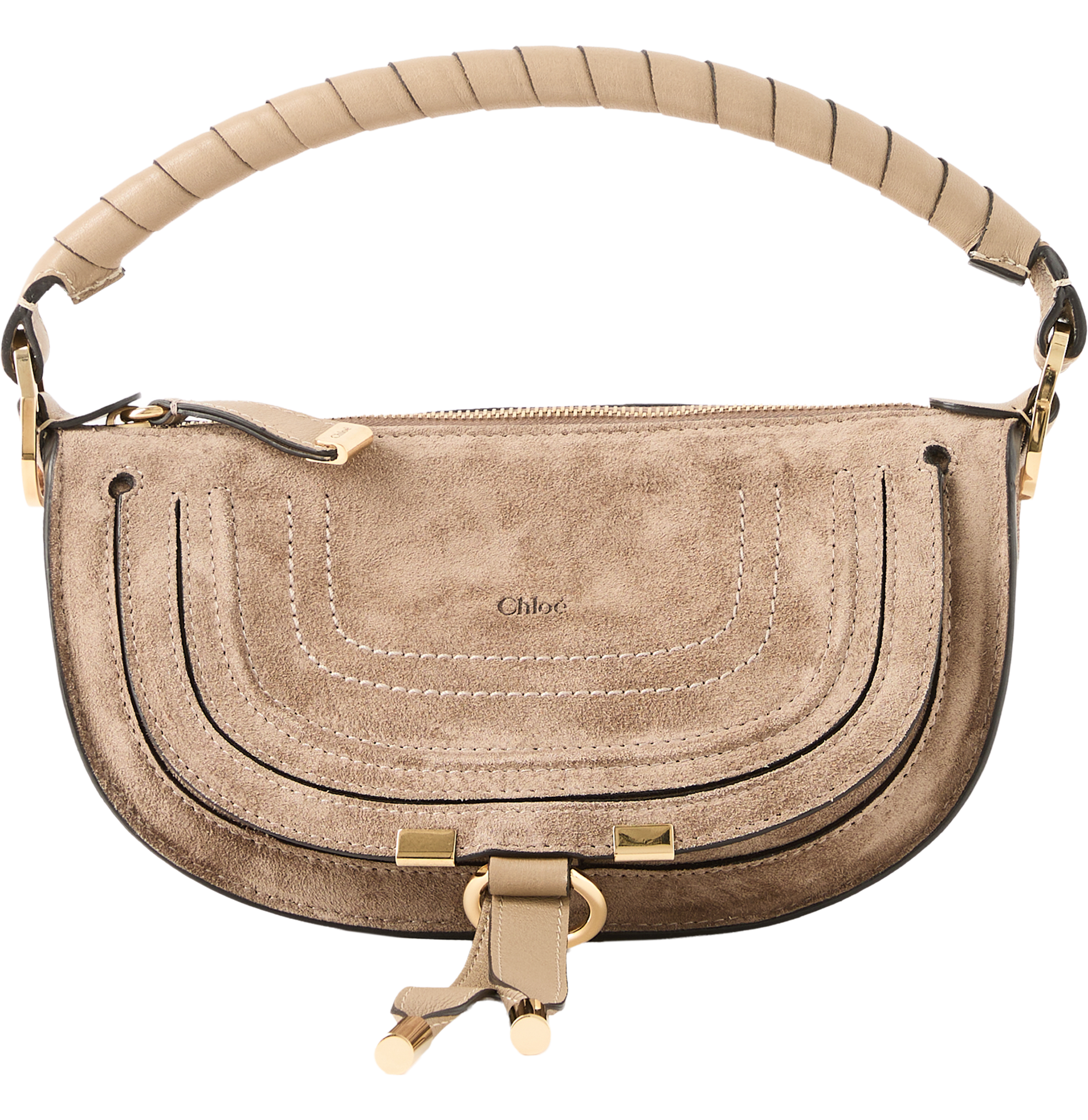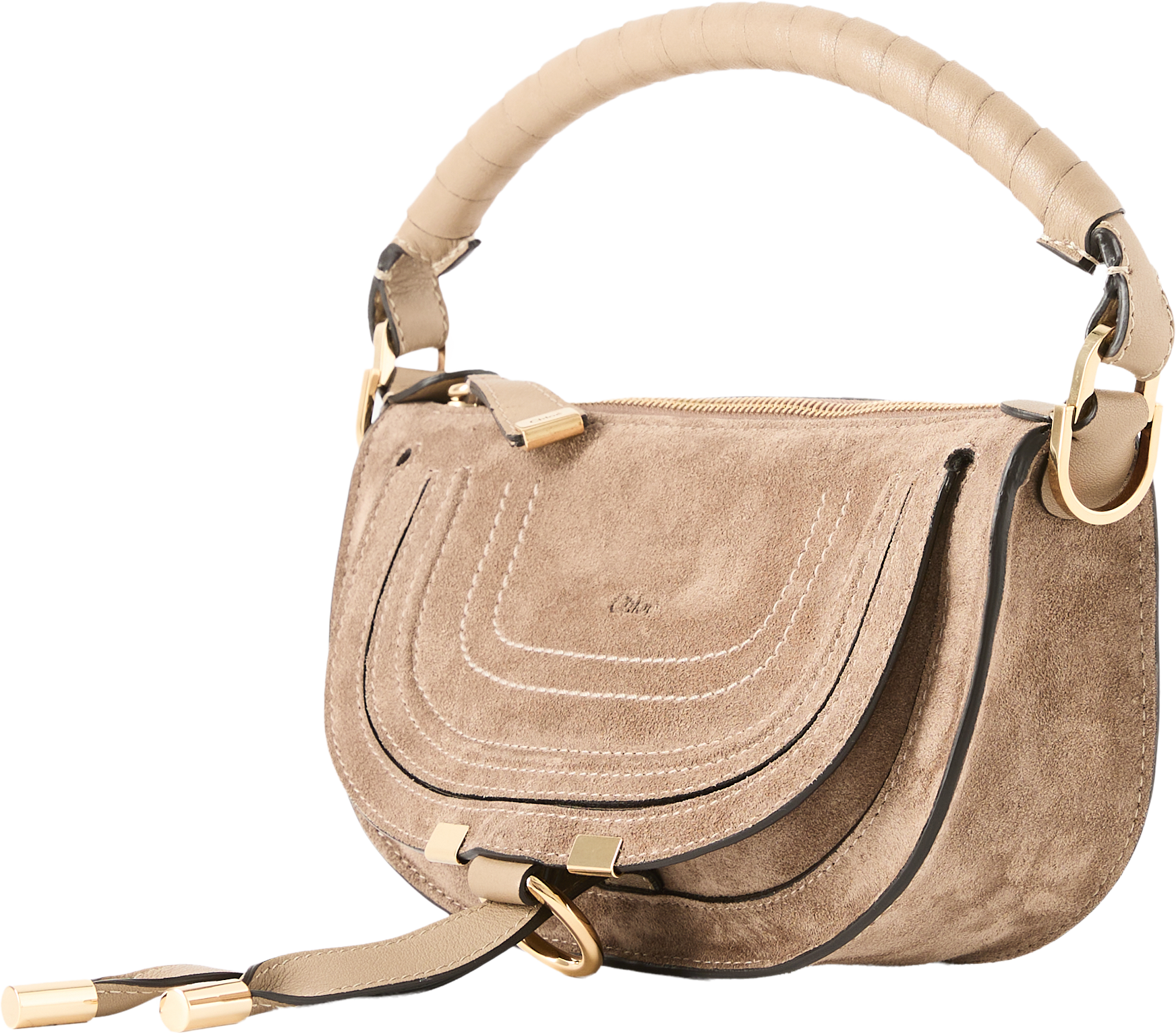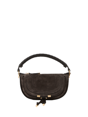 The 'Marcie Mini' shoulder bag from Chloé in Boyish Brown is made from calf suede and stands out with its gold-coloured hardware. The saddle stitching, the single hand-wrapped handle, the gold-coloured hardware and the line's hanging leather tassels close the flap and make the bag a sporty, elegant classic. Carry this leather bag by the handles in your hand, with the strap over your shoulder or diagonally across your body.