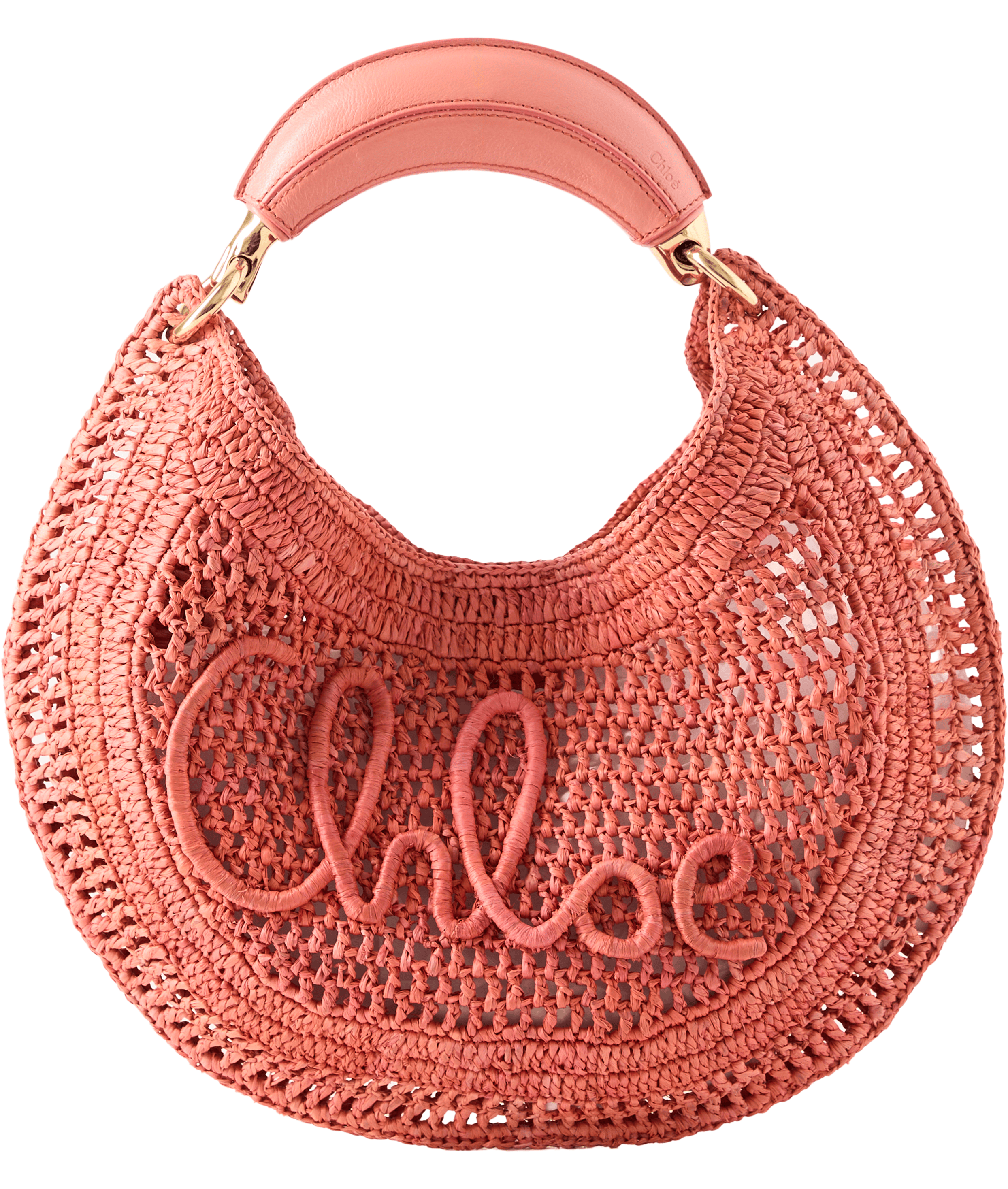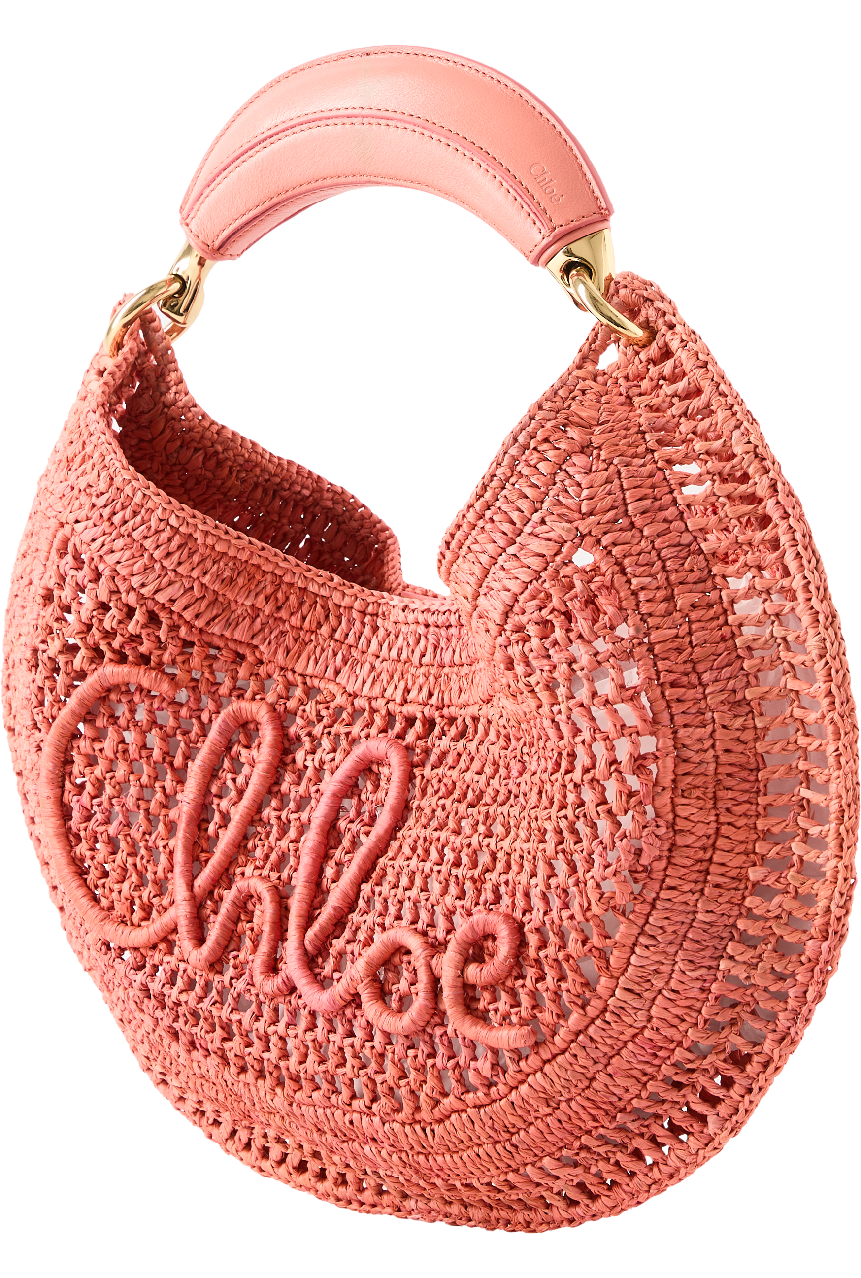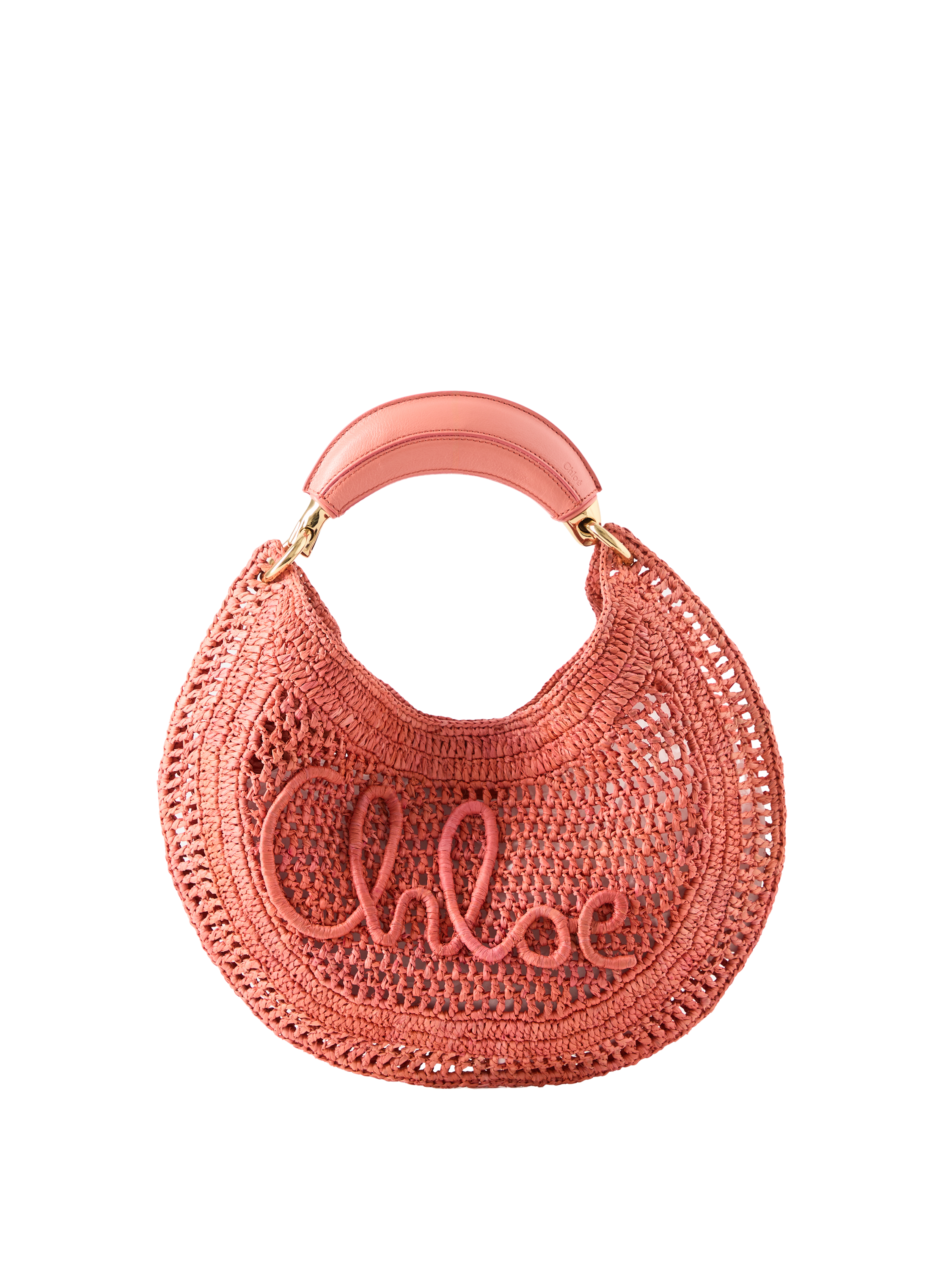 The 'Summer Banana' shoulder bag in camellia coral by Chloé is made from hand-crocheted fibres and buffalo leather and impresses with its curved silhouette. The banana-shaped handle and lettering in the style of Chloé's design tradition elegantly round off the model.