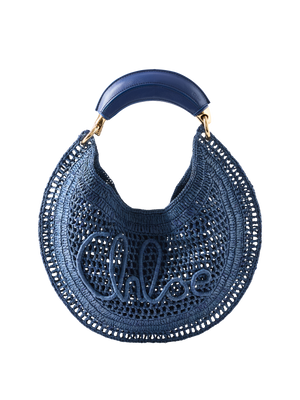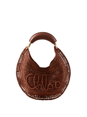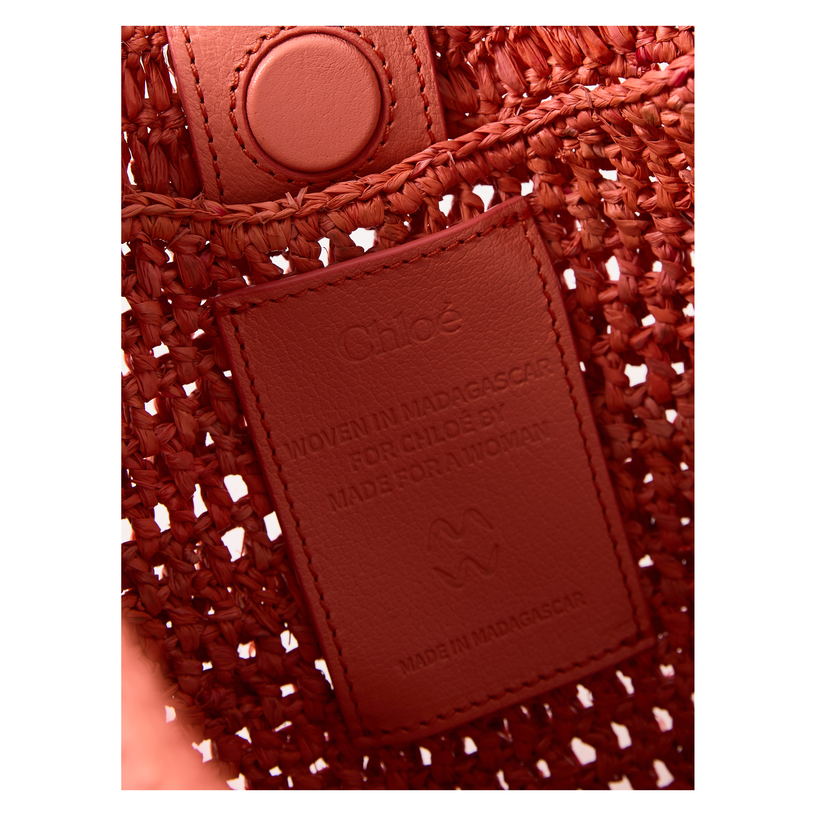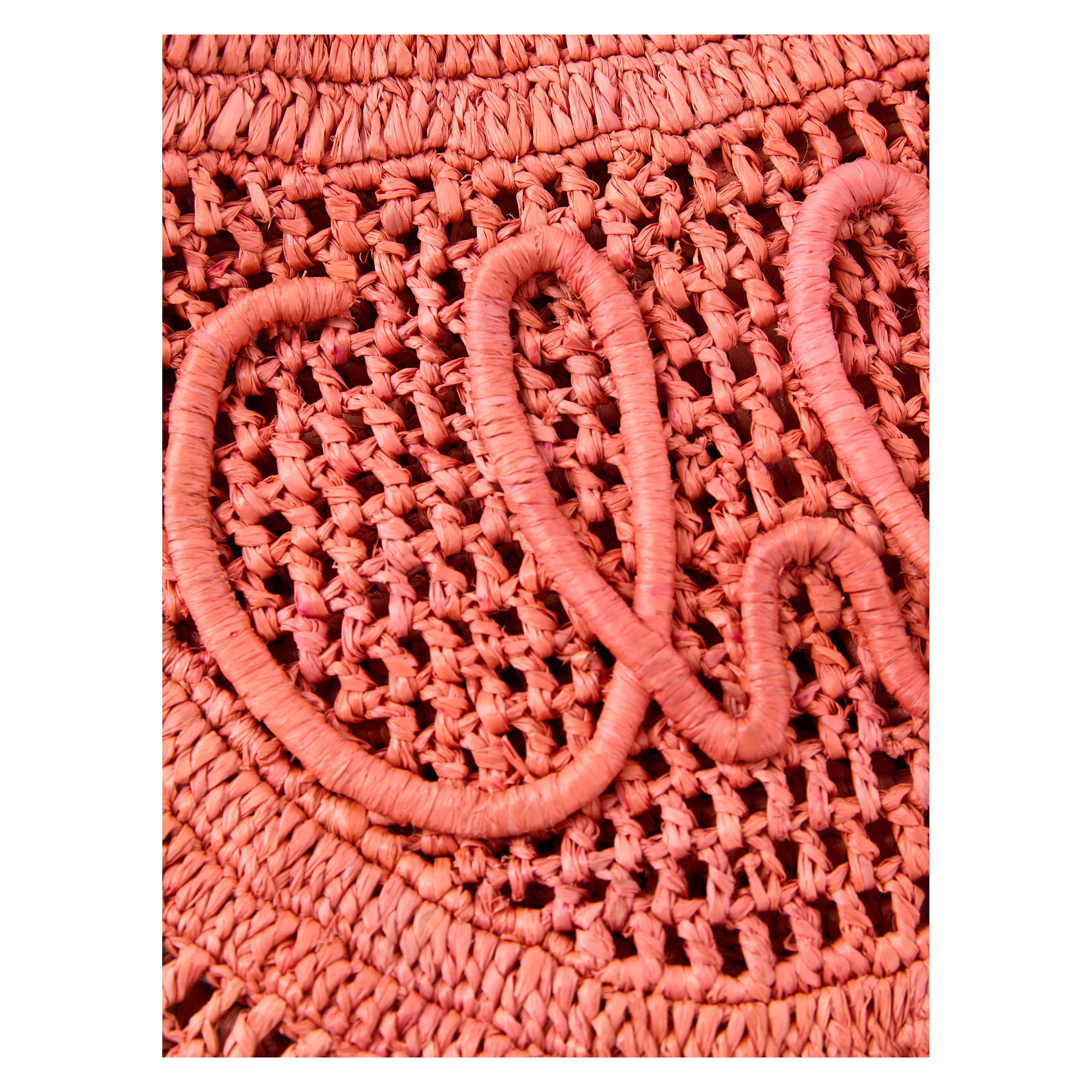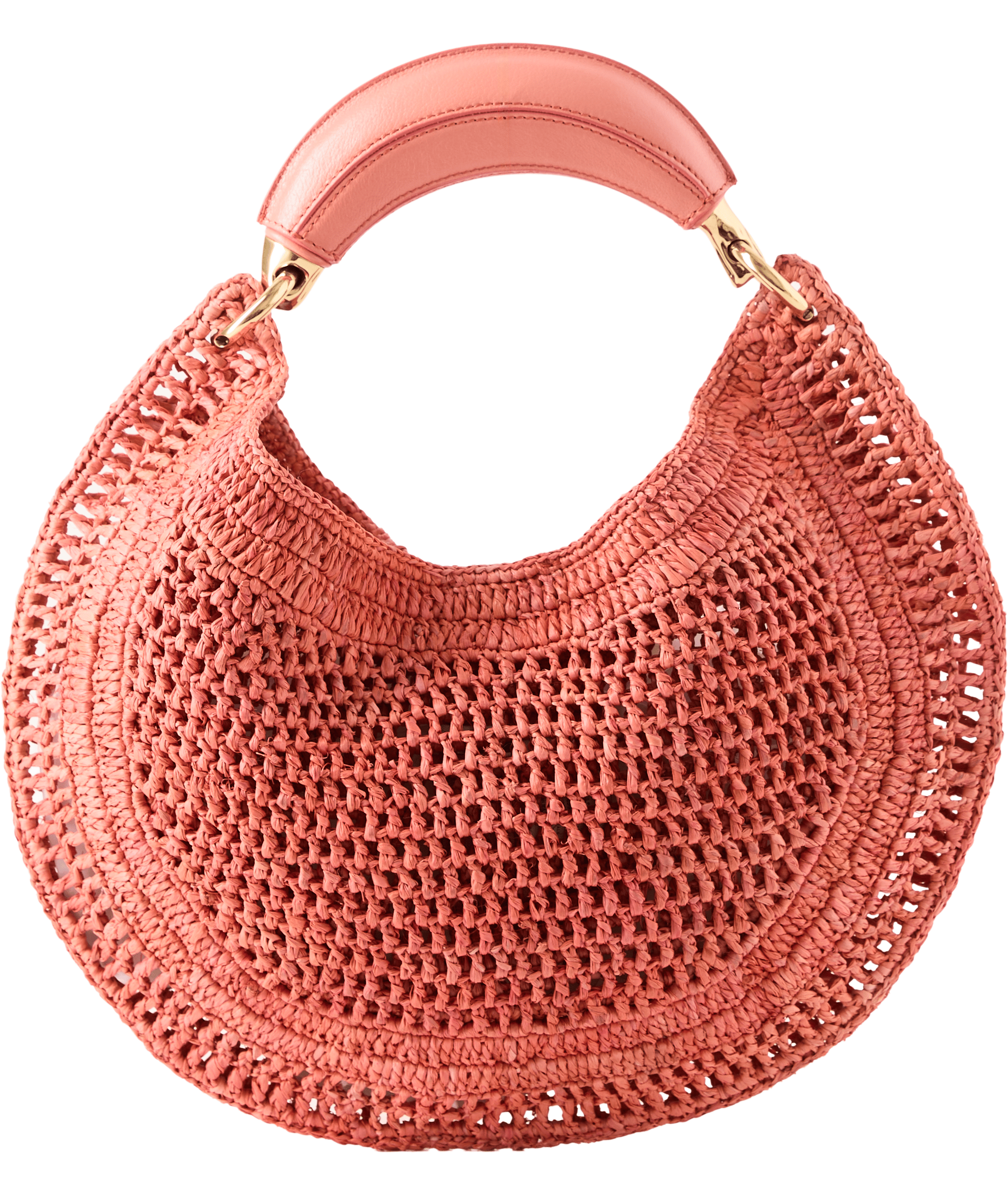 The 'Summer Banana' shoulder bag in camellia coral by Chloé is made from hand-crocheted fibres and buffalo leather and impresses with its curved silhouette. The banana-shaped handle and lettering in the style of Chloé's design tradition elegantly round off the model.