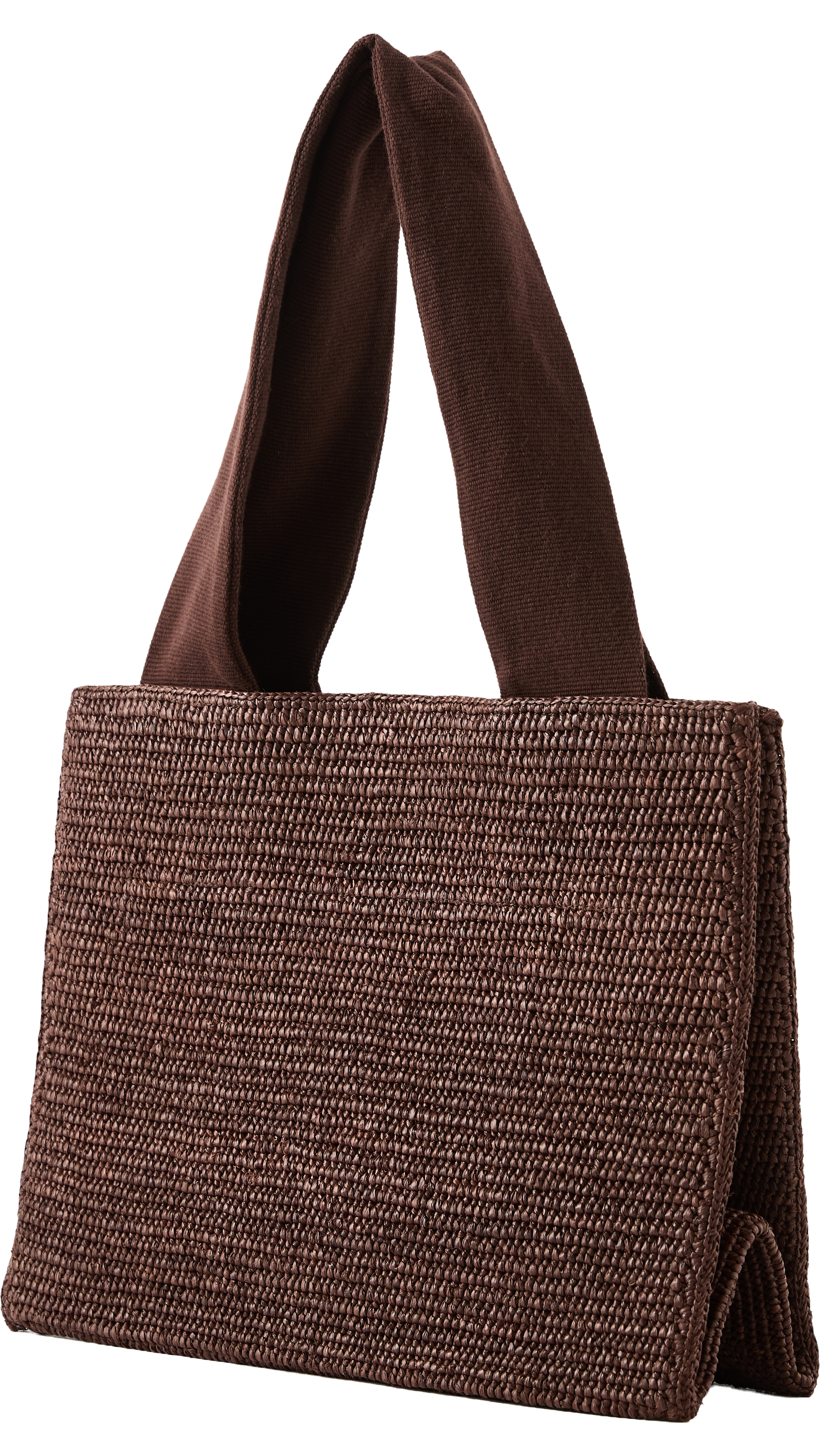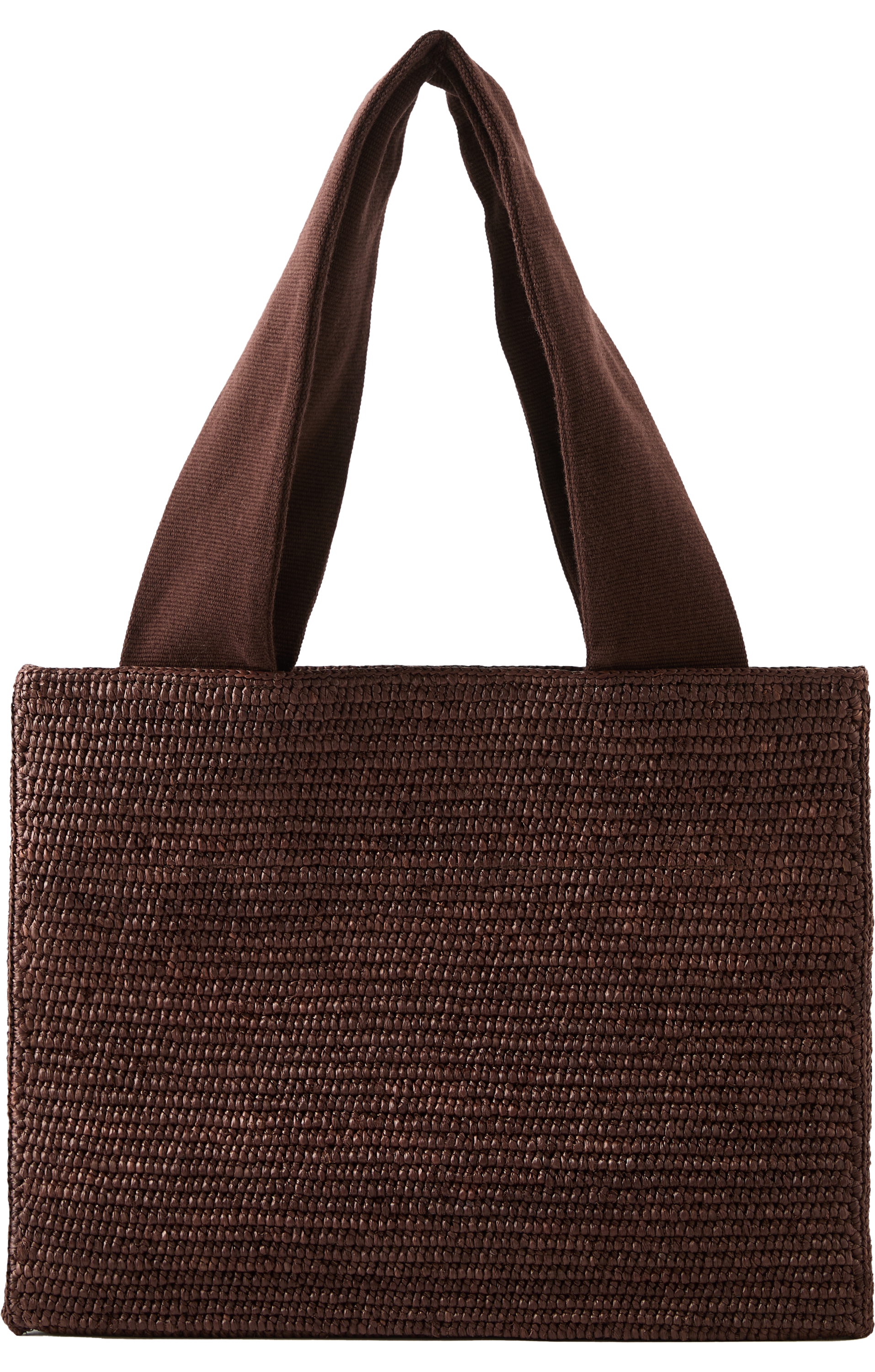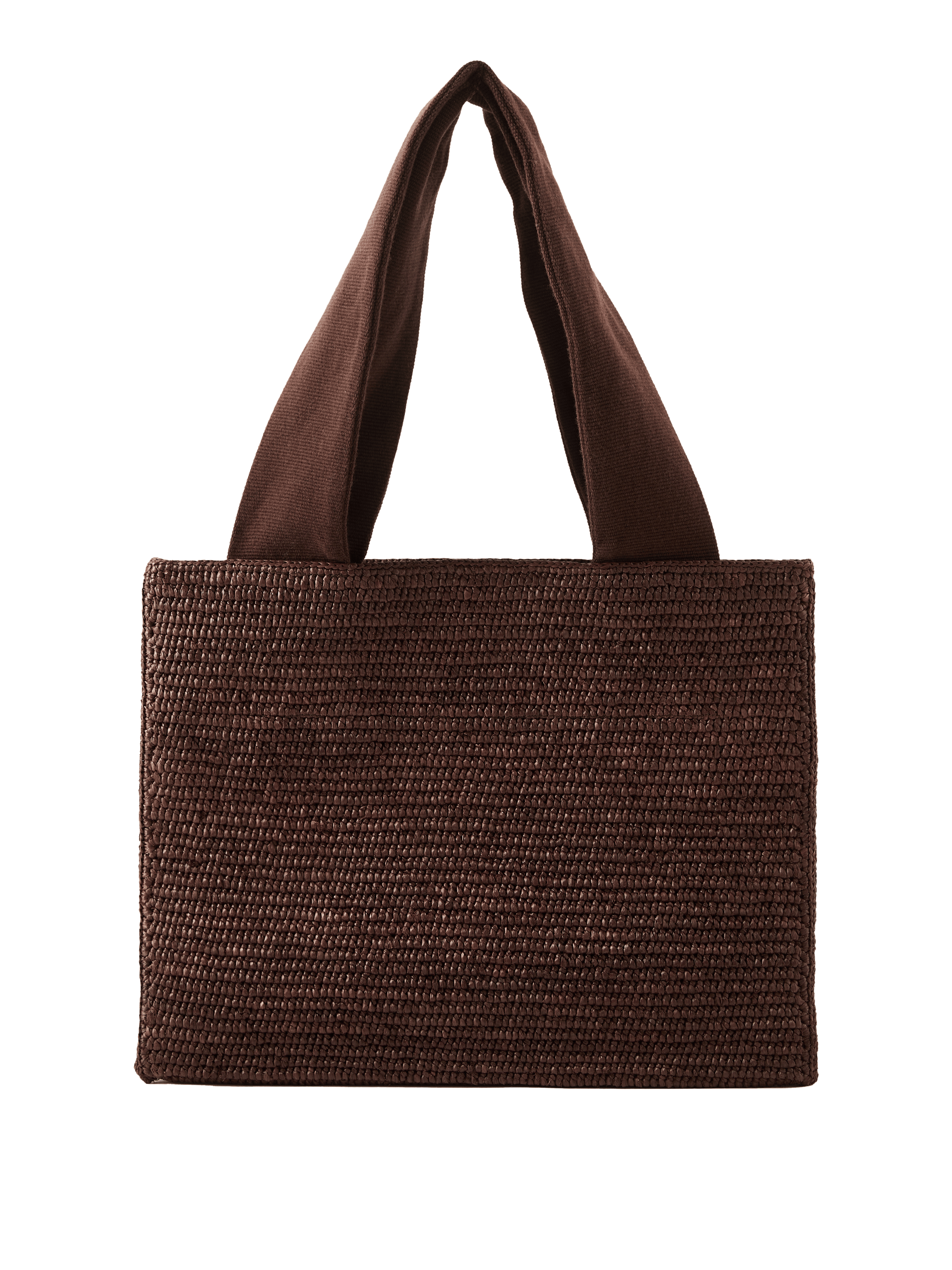 The 'Loretta' shopper in brown by The Row is made from a raffia calfskin blend and stands out with its handmade, rectangular shape. The folded construction made from natural raffia, the wide ribbon handles and the open top characterise the design. The crocheted finish by artisans gives the model a natural texture and ensures durability, while the clear silhouette exudes minimalist charm.
