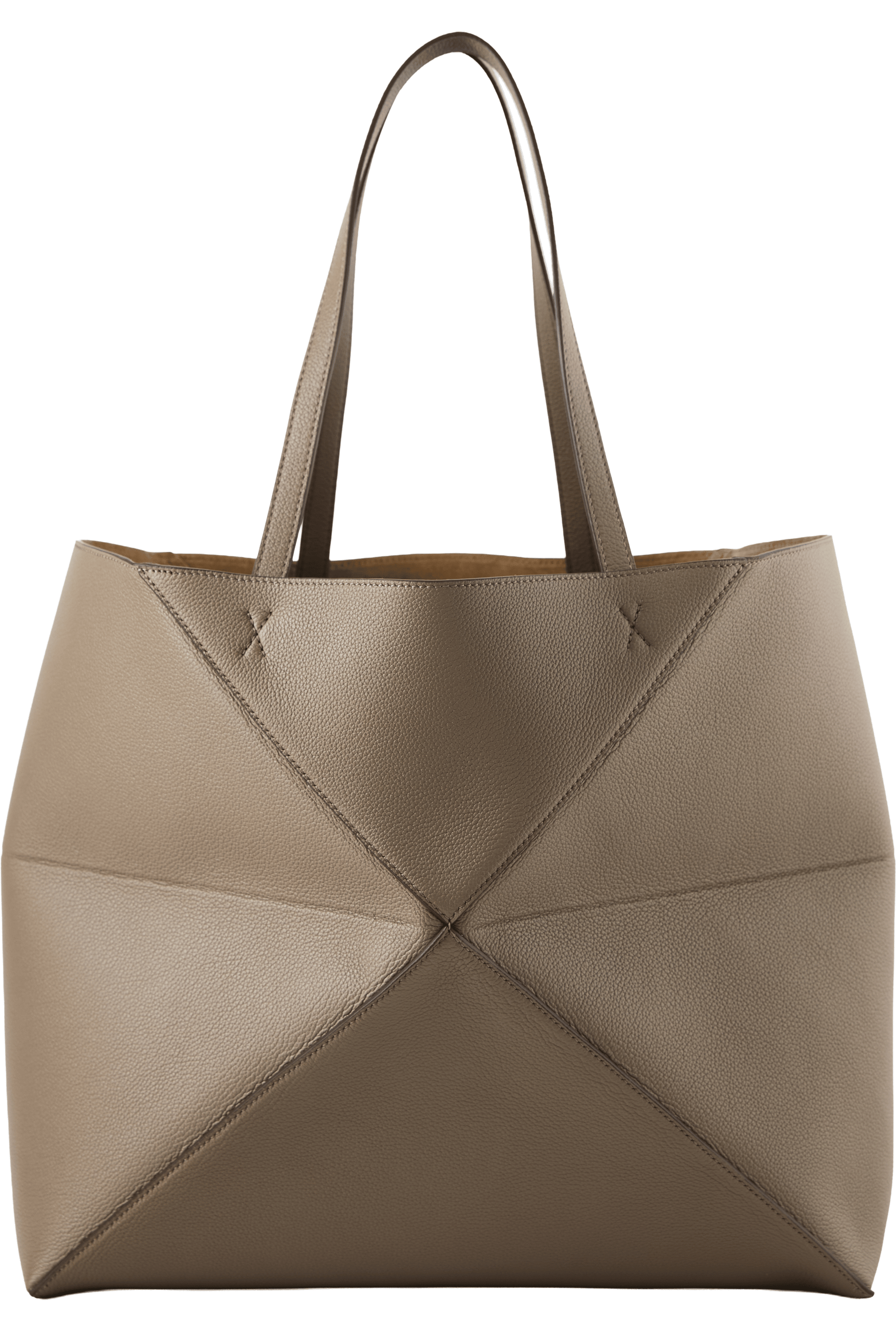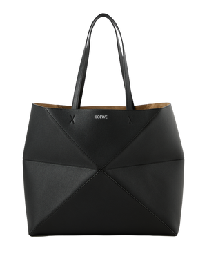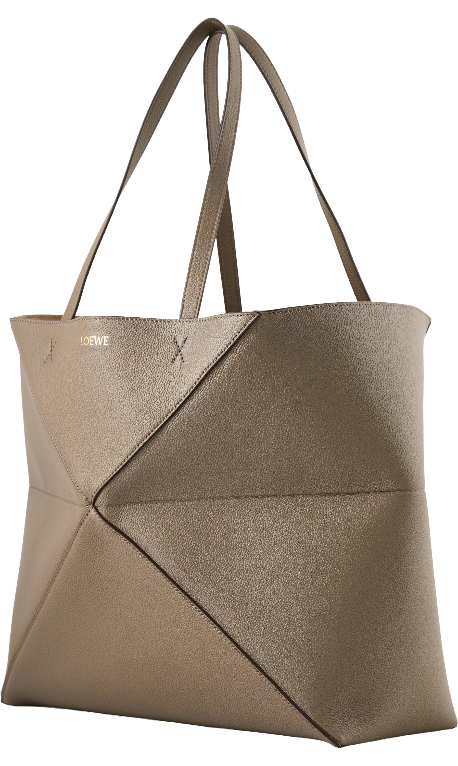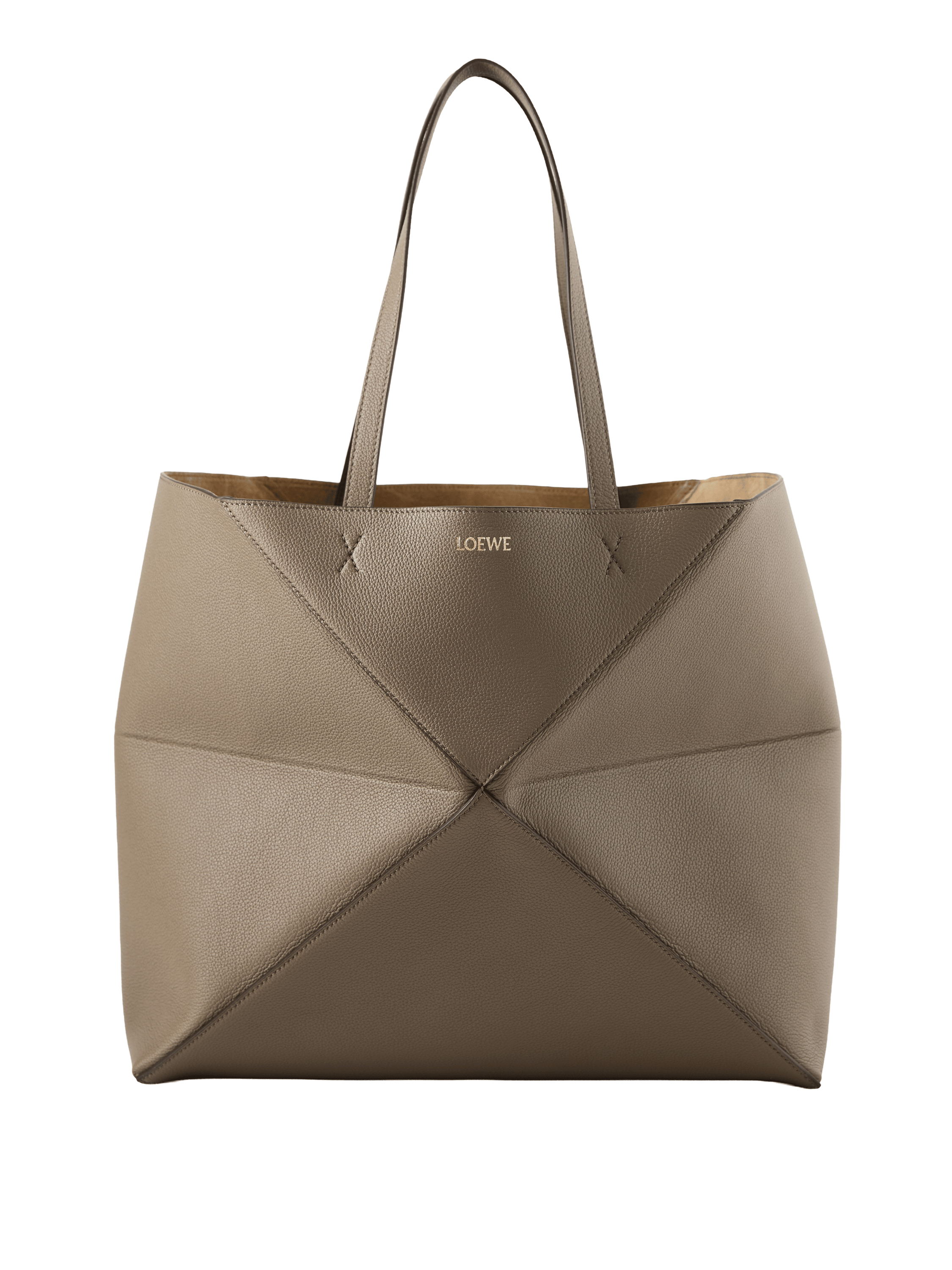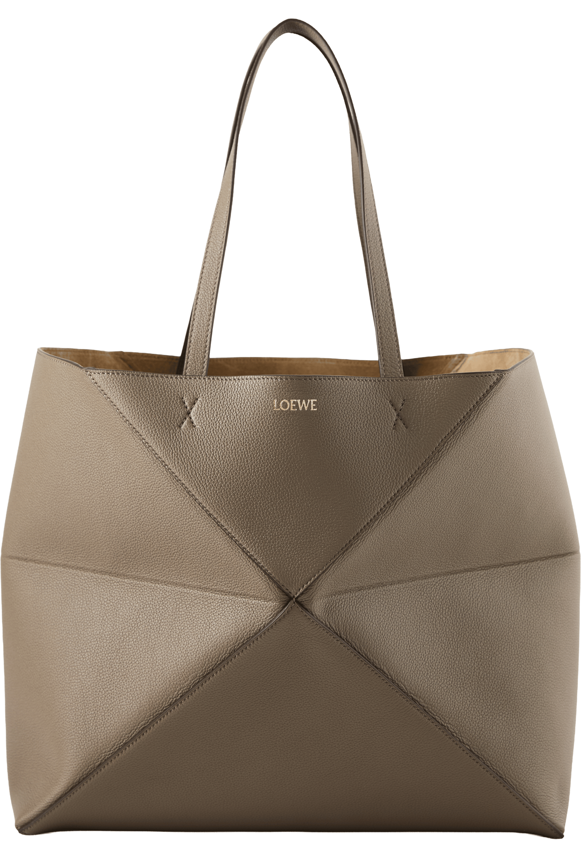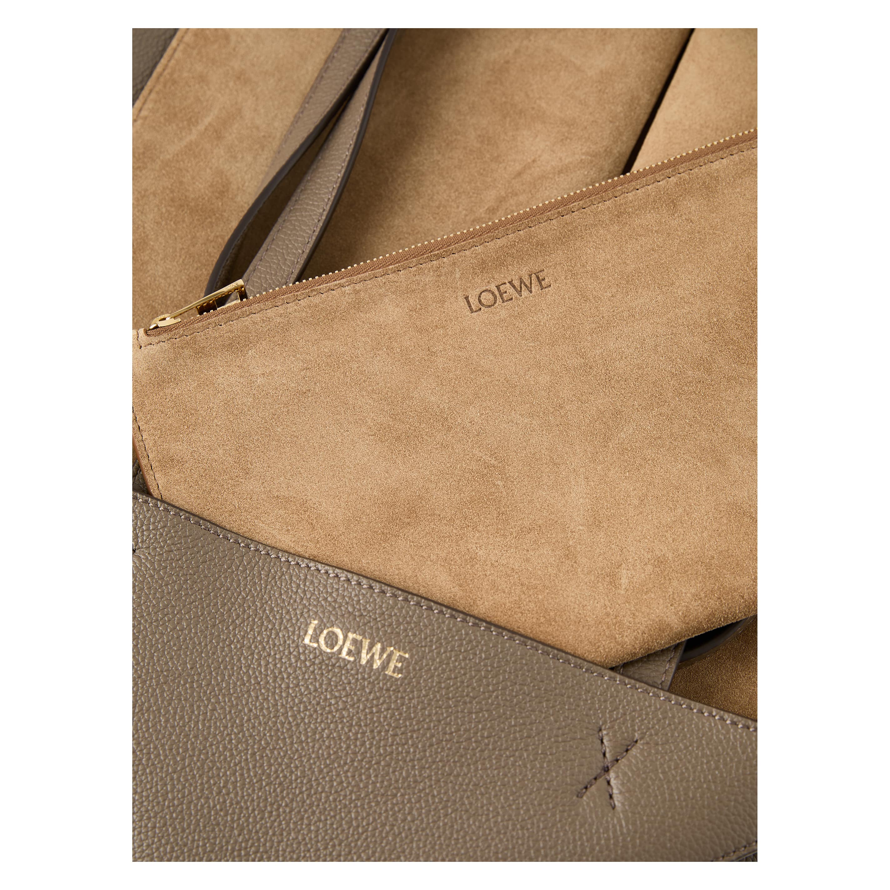 The 'Puzzle Fold Horizontal Large' shopper in taupe is made from grained calfskin and impresses with its light, geometric structure. The large, horizontal silhouette, the inner suede pocket with zip, the suede lining and the gold-coloured LOEWE embossing round off the design.