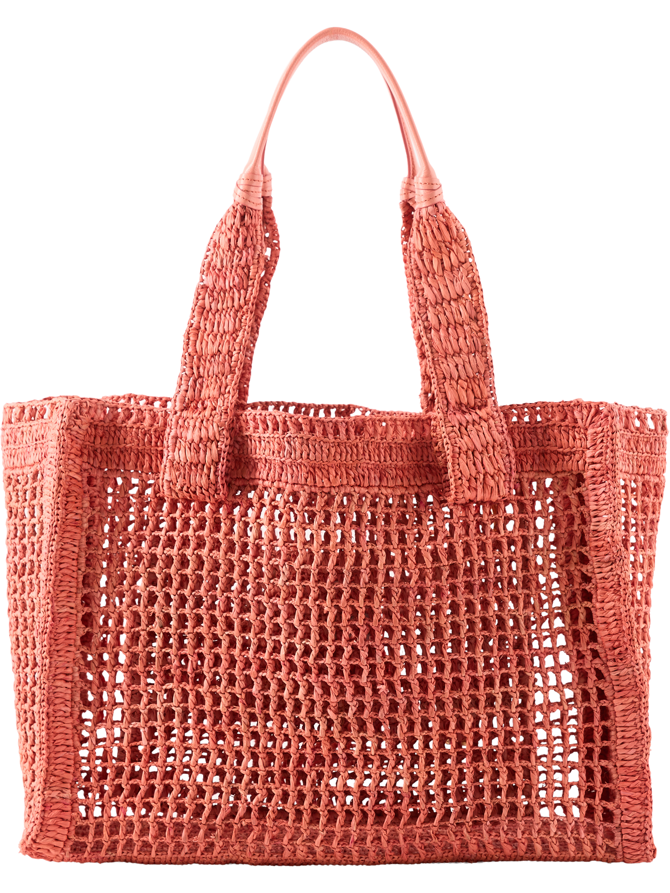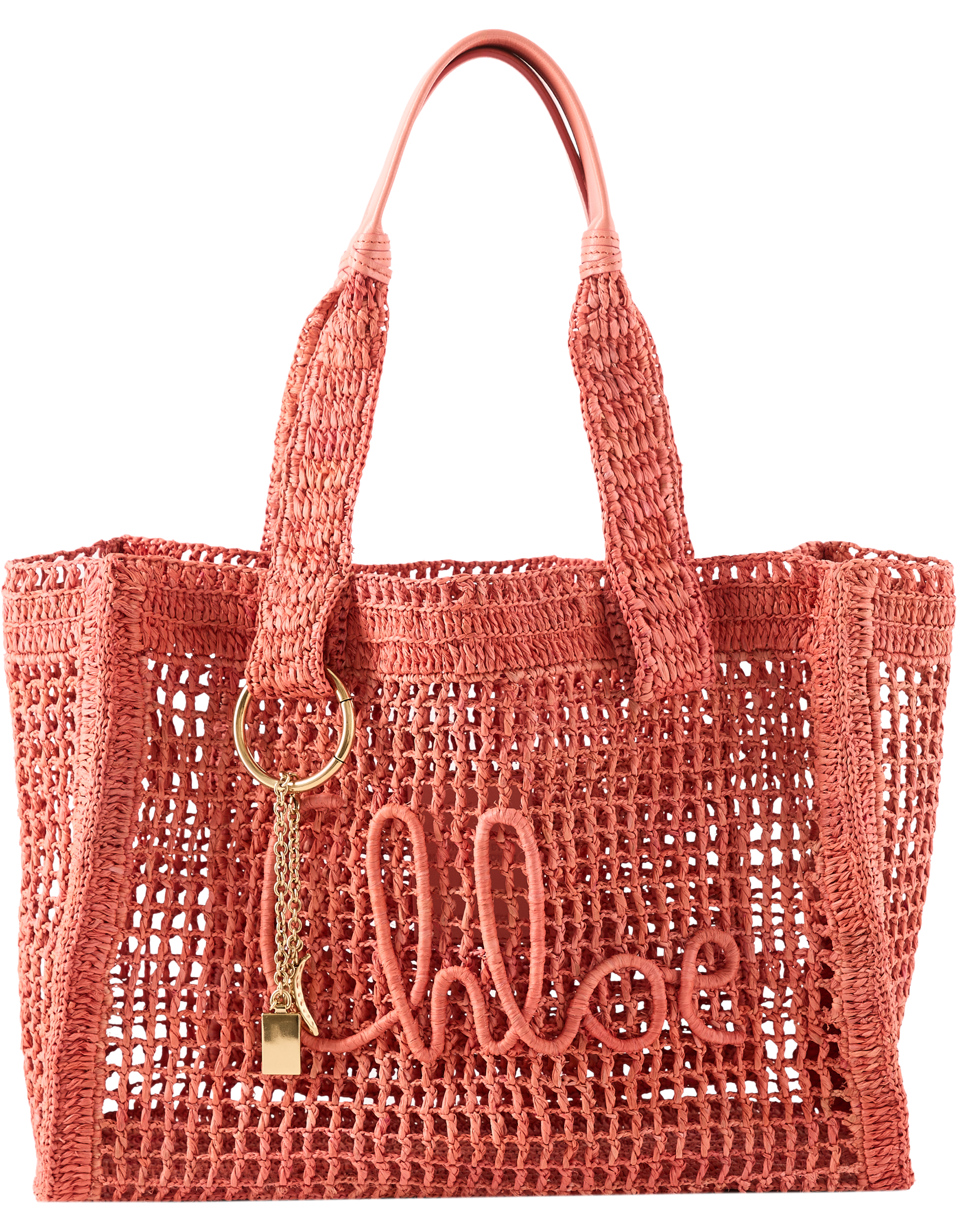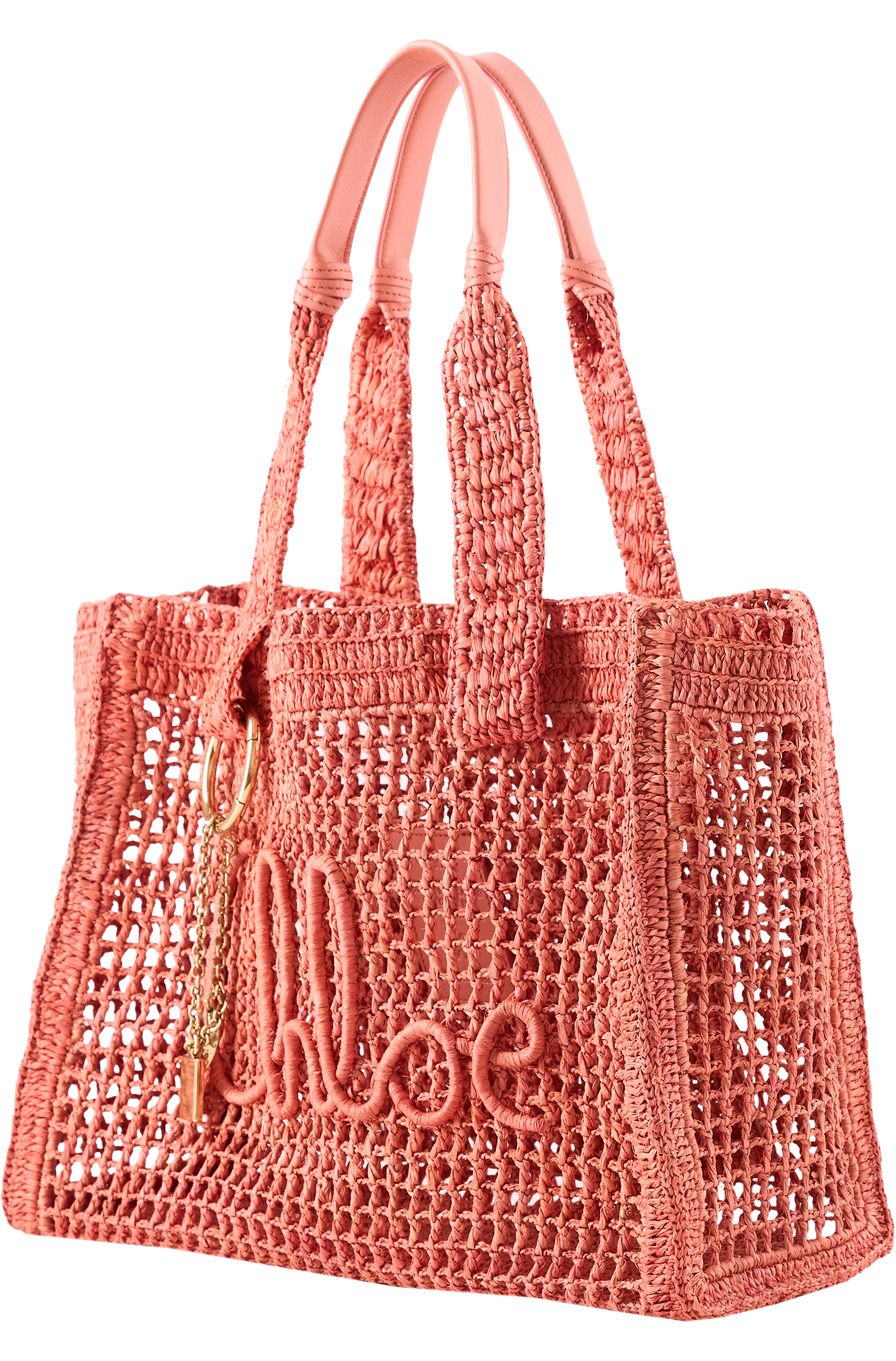 The 'Summer Banana East-West' shopper from Chloé in camellia coral is made from hand-crocheted, braided raffia and buffalo leather and stands out with its rectangular shape. The front is adorned with handwritten lettering inspired by Chloé's heritage. A dangling chain with pendant completes this spacious tote bag.