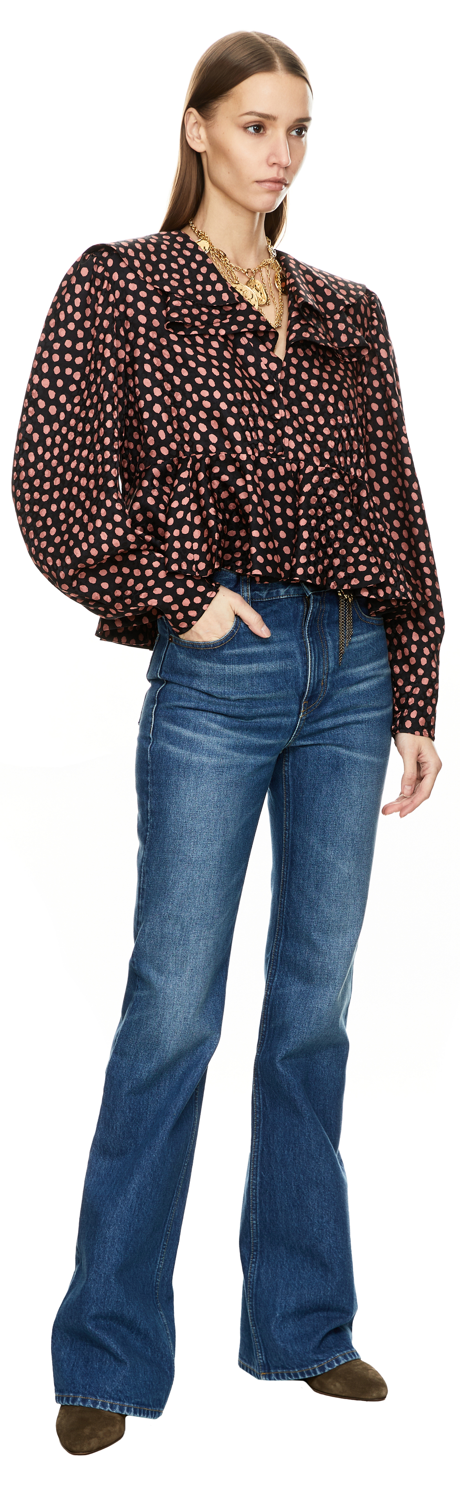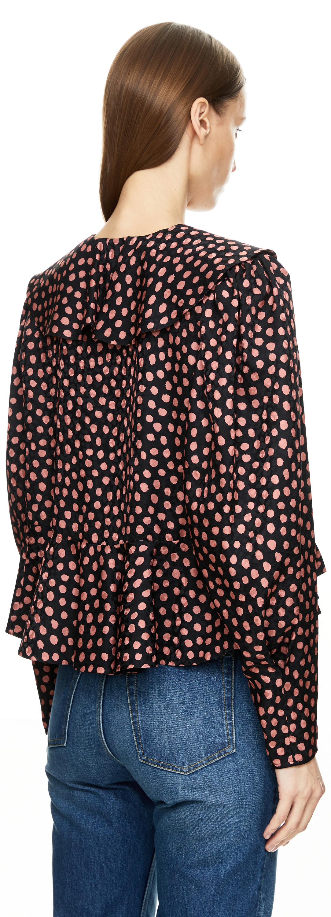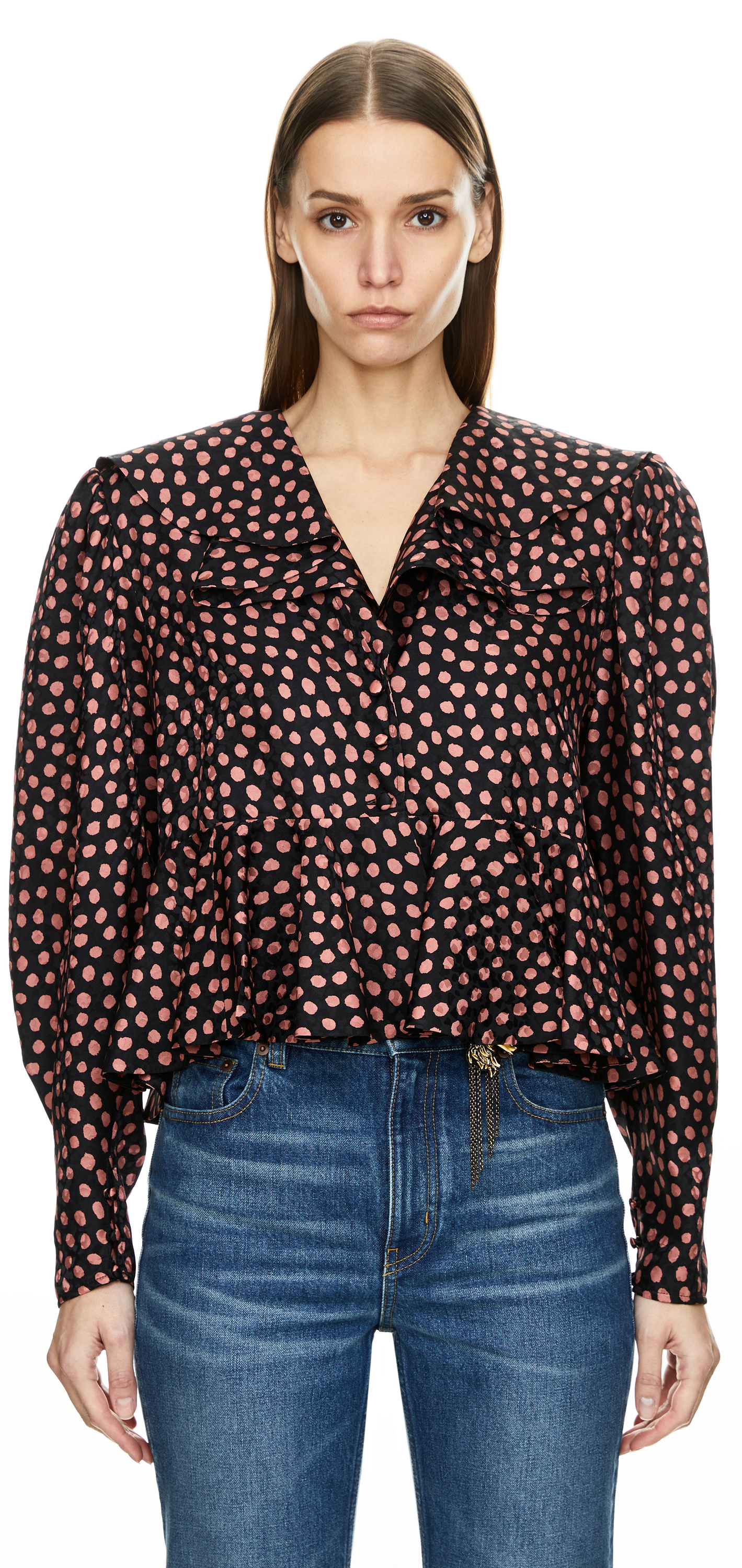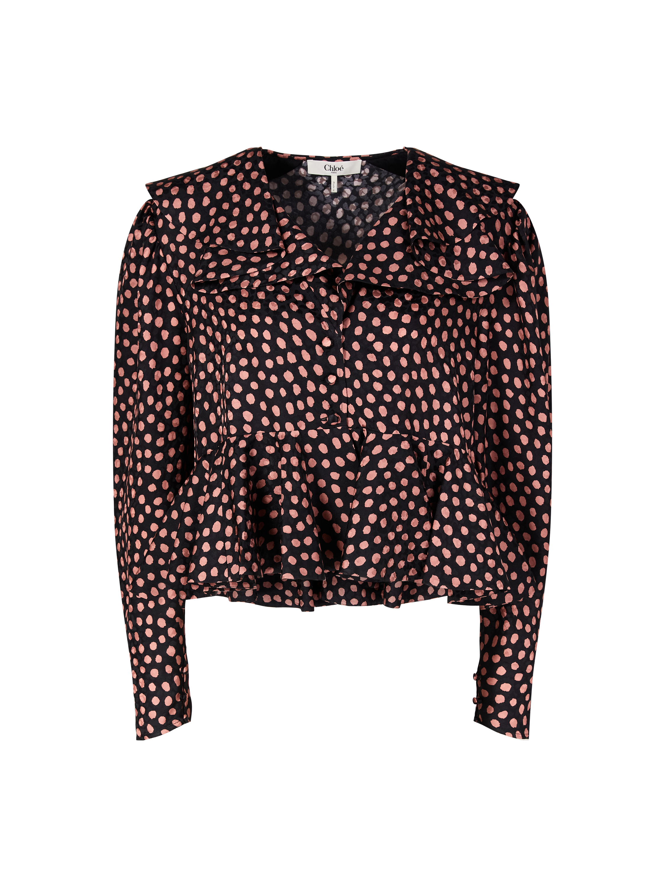 This black blouse by Chloé is made from silk jacquard and features a cropped fit. The V-neckline, polka dot print, maxi collar and fabric-covered buttons emphasise the feminine look.