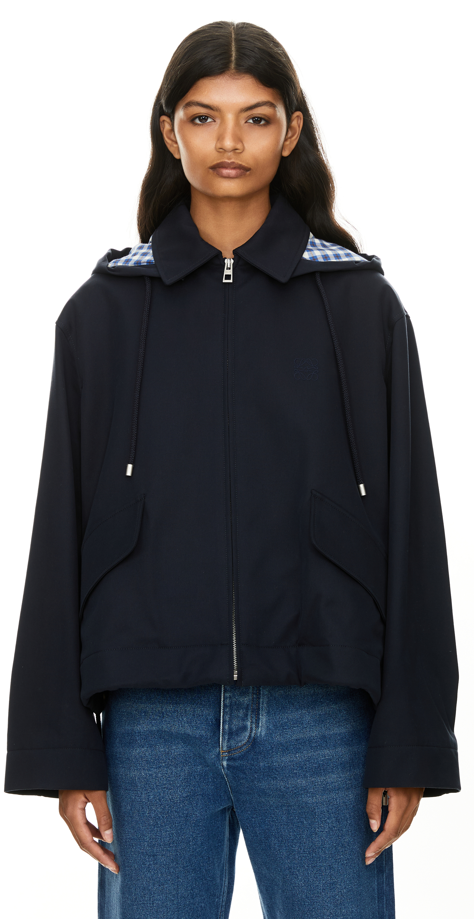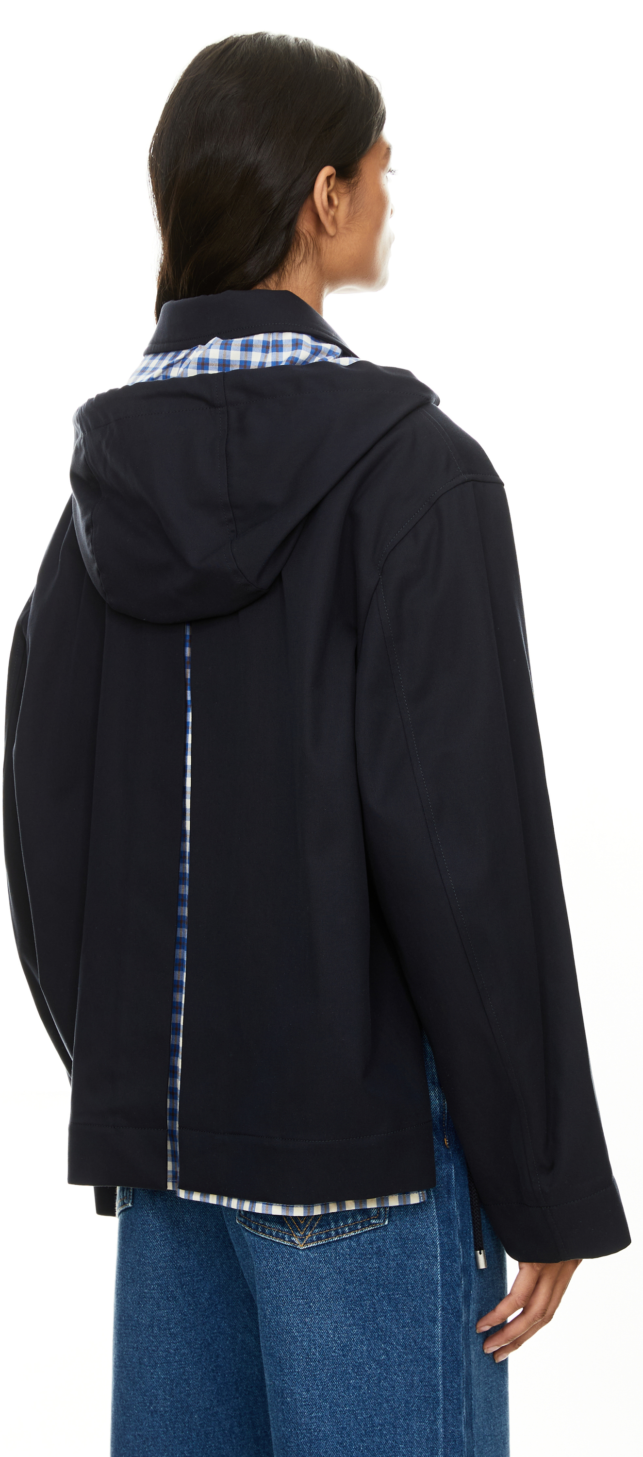 This navy blue parka from LOEWE is made from cotton silk gabardine and impresses with its relaxed fit. The detachable hood, split back section with contrasting checked lining, front zip and gathered front hem with drawstring round off the design harmoniously.