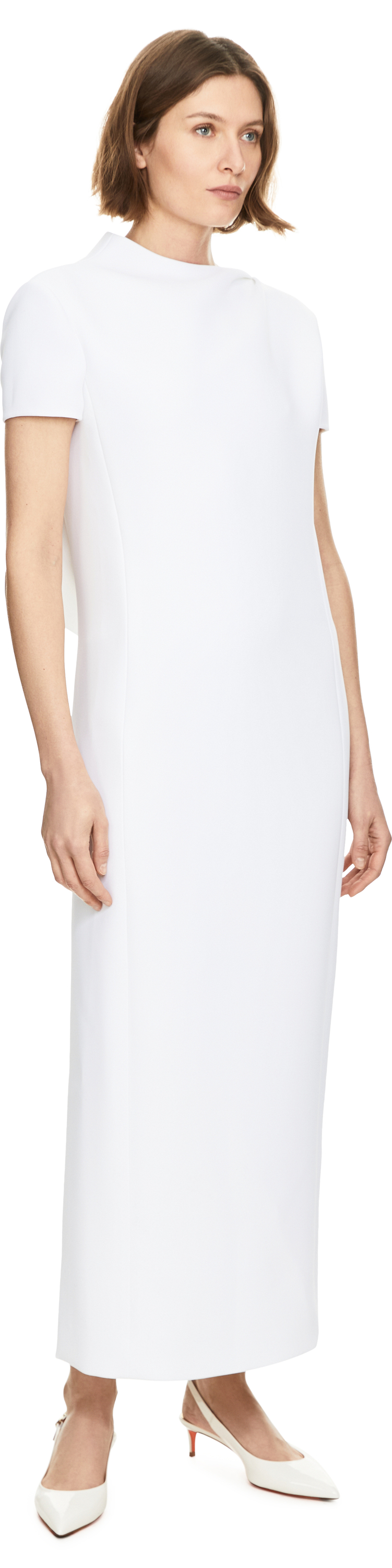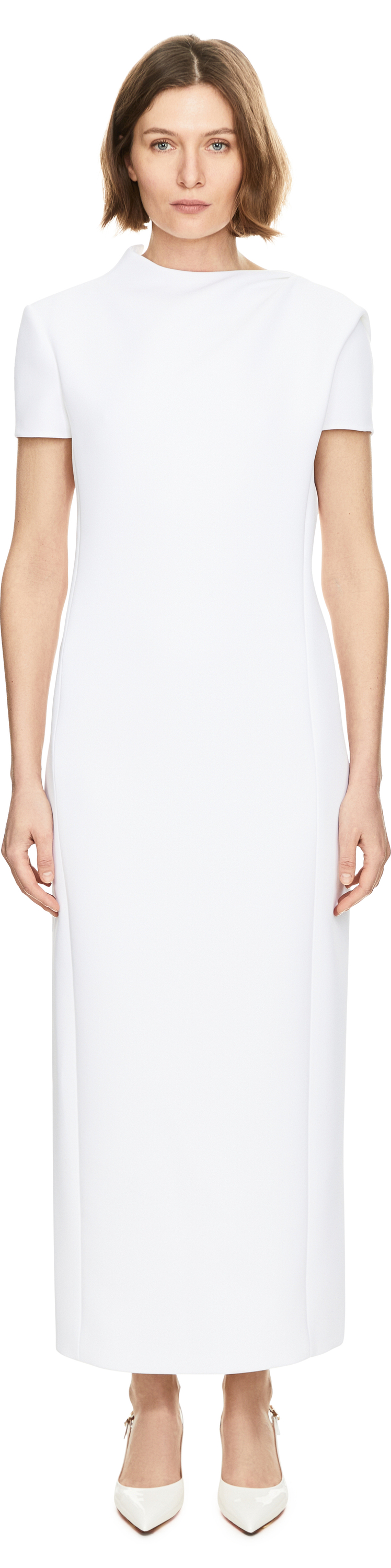 The 'Iryl' dress in white by Khaite is made from crepe and boasts a clear, architectural silhouette. The gently curved side inserts shape the line of the design, while the asymmetric back neckline adds an exciting accent. The midi length and short sleeves emphasise the sophisticated simplicity and give the style a timelessly elegant look.